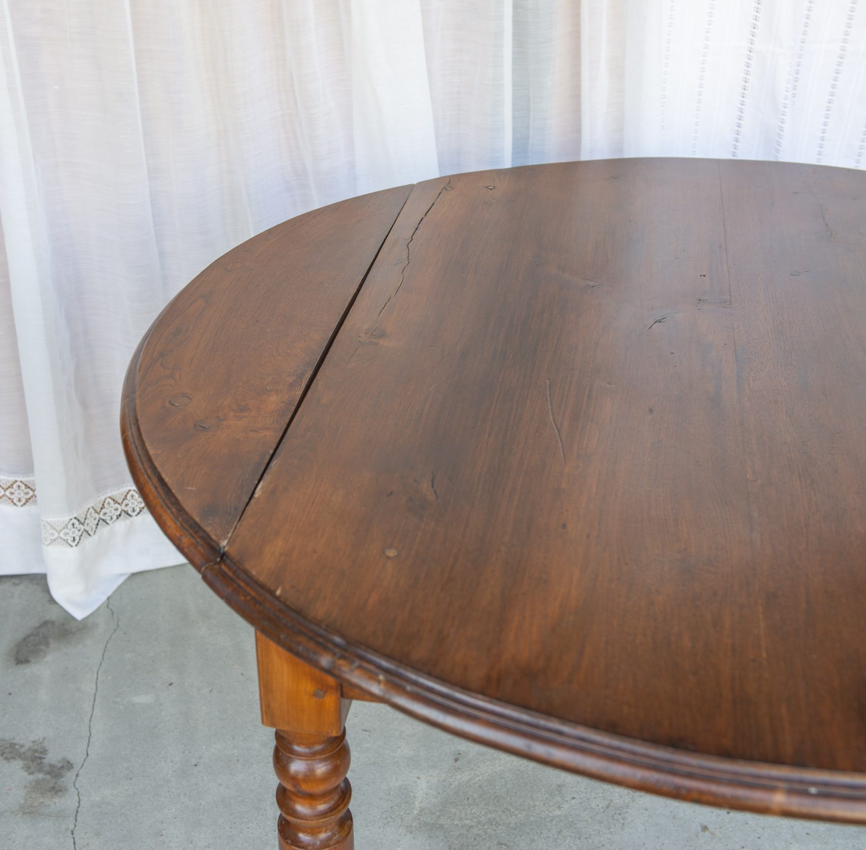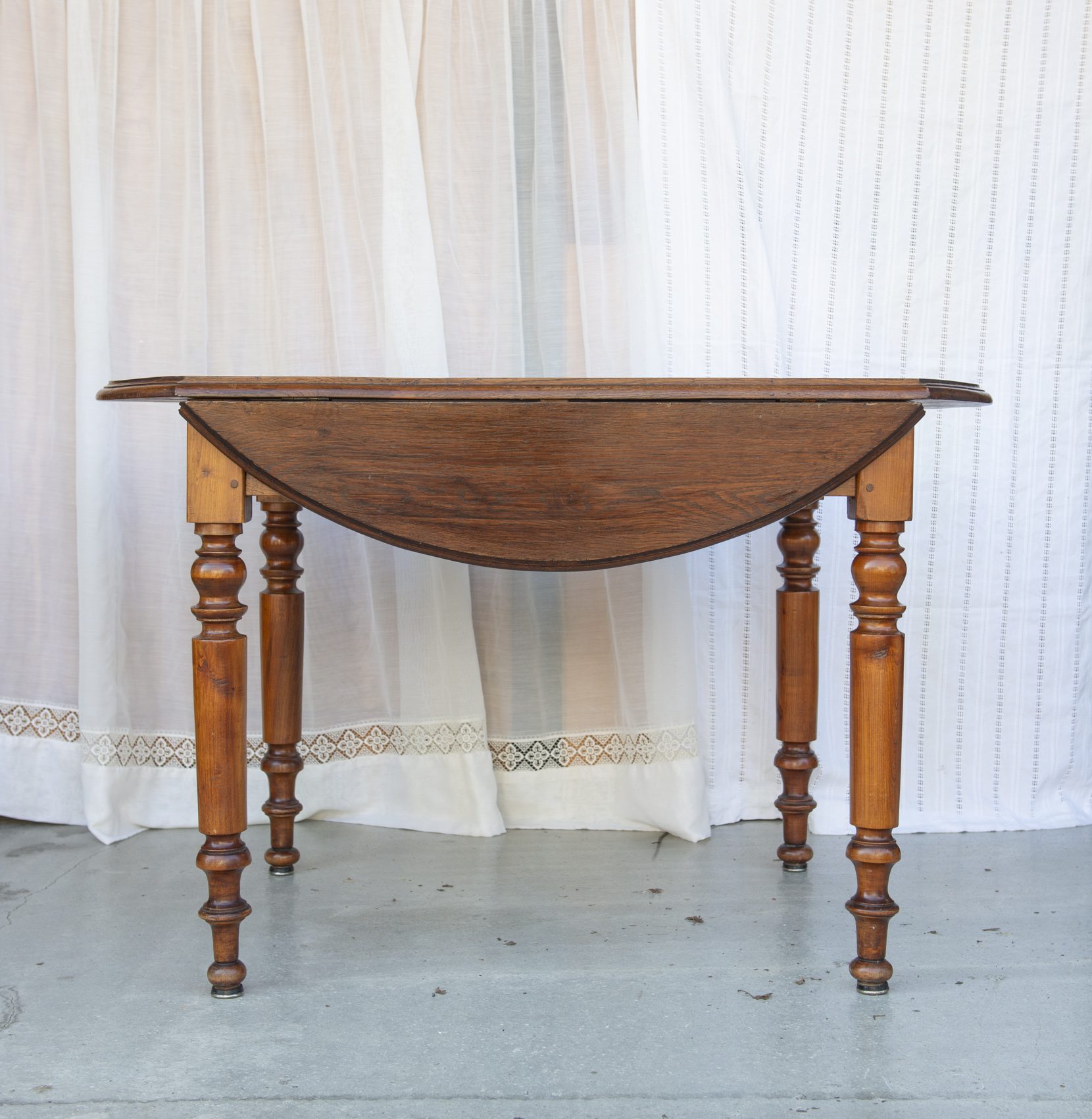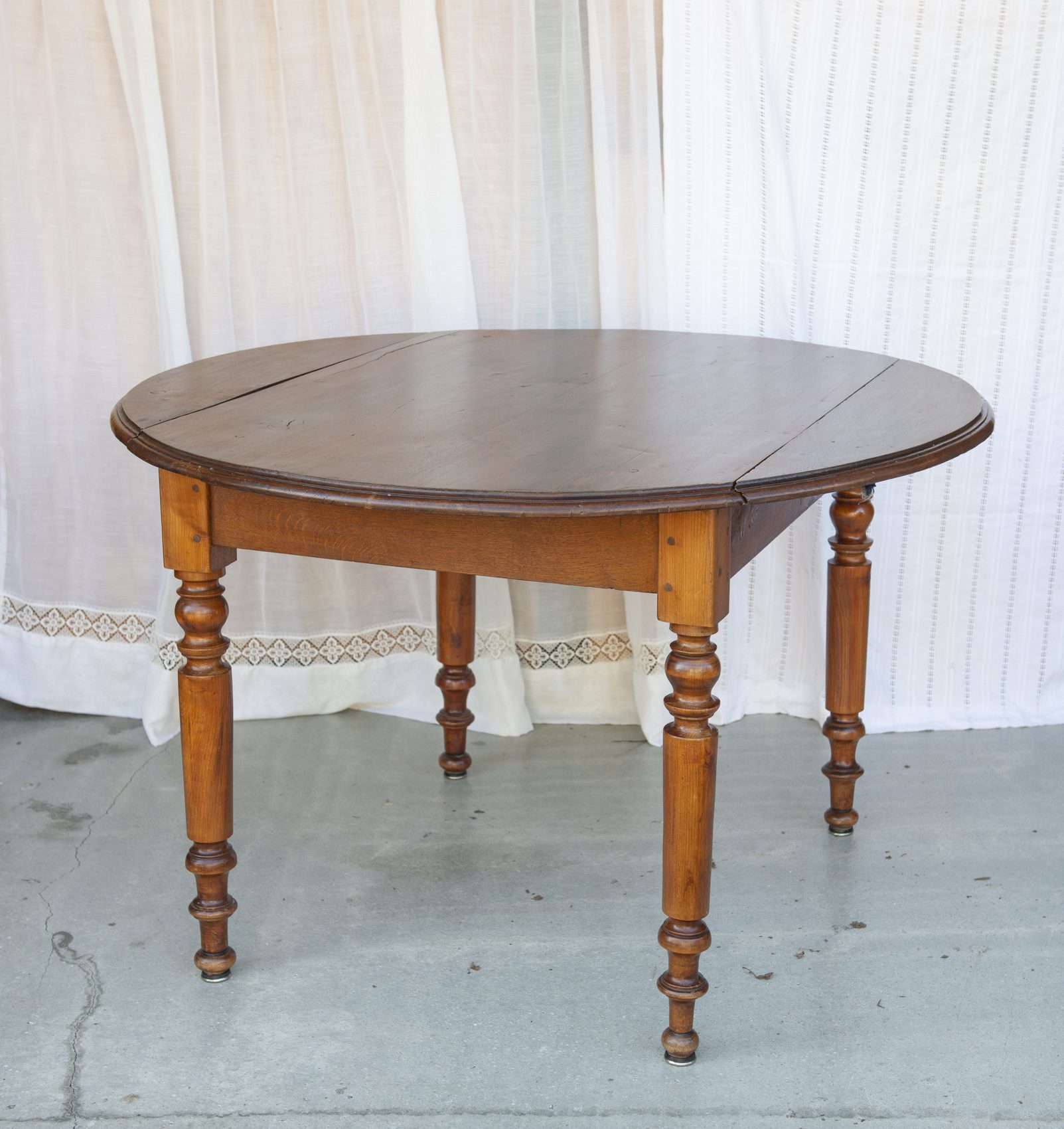 Produit venduTable ronde en bois, pliable des deux côtés.