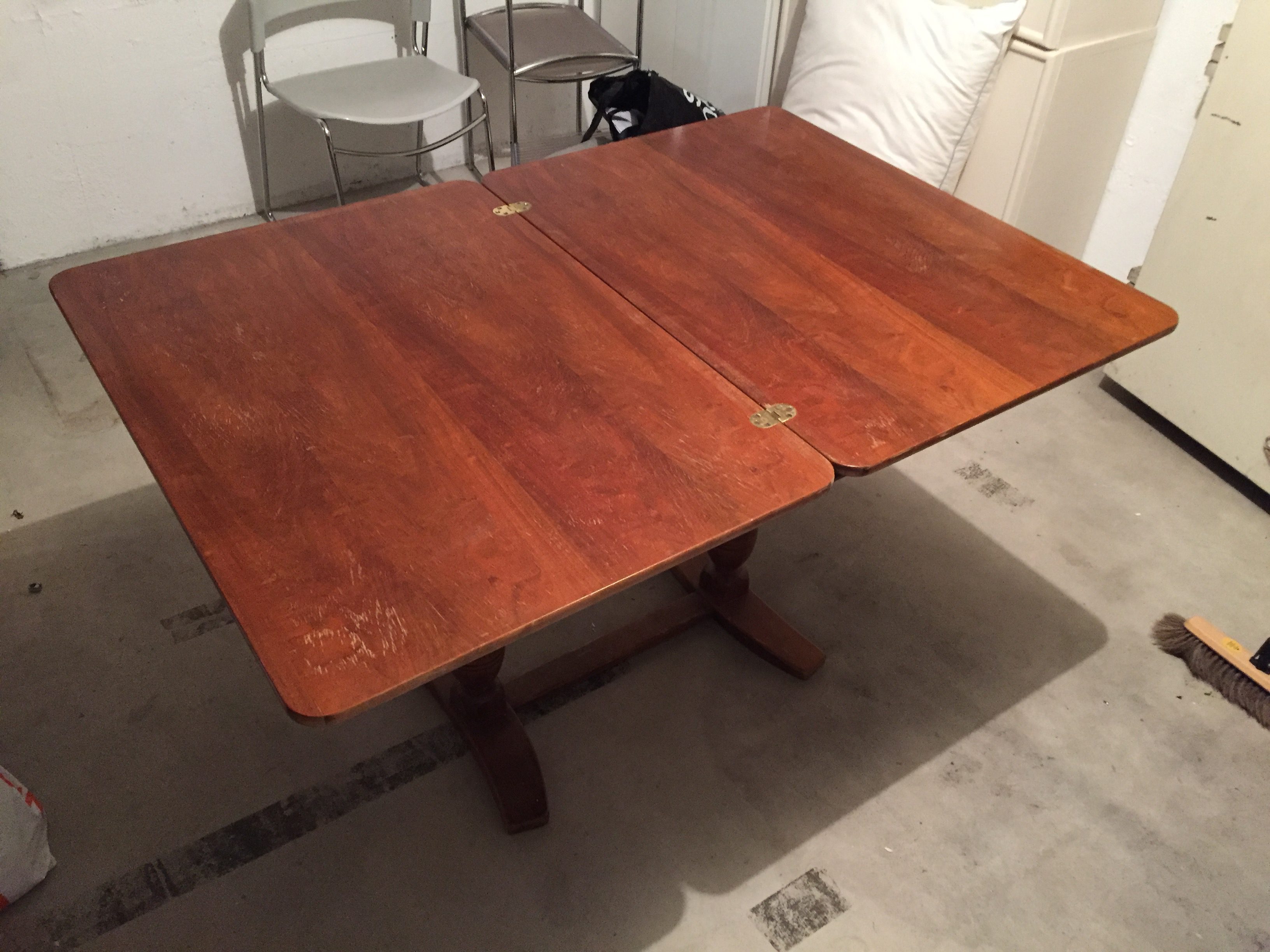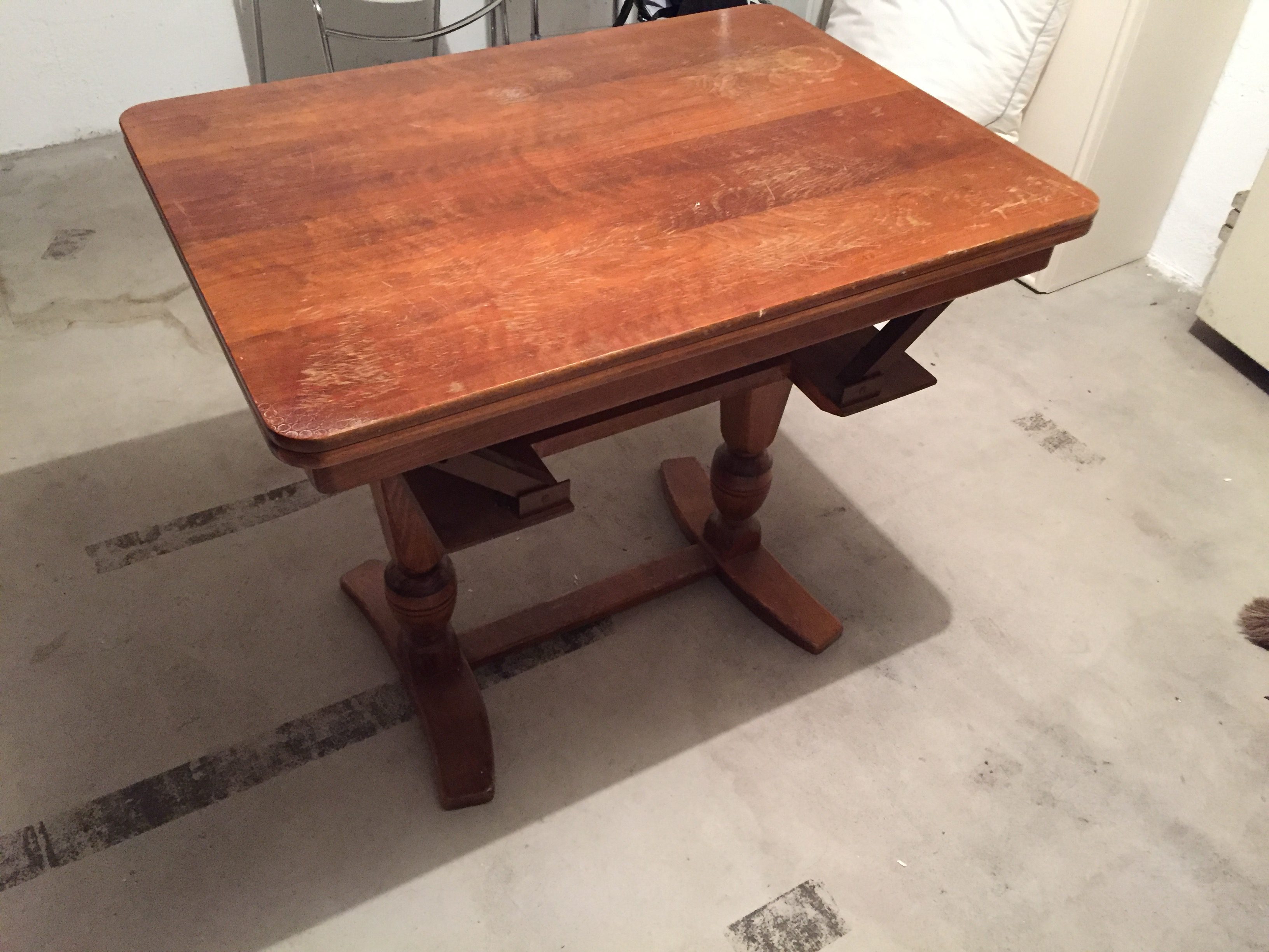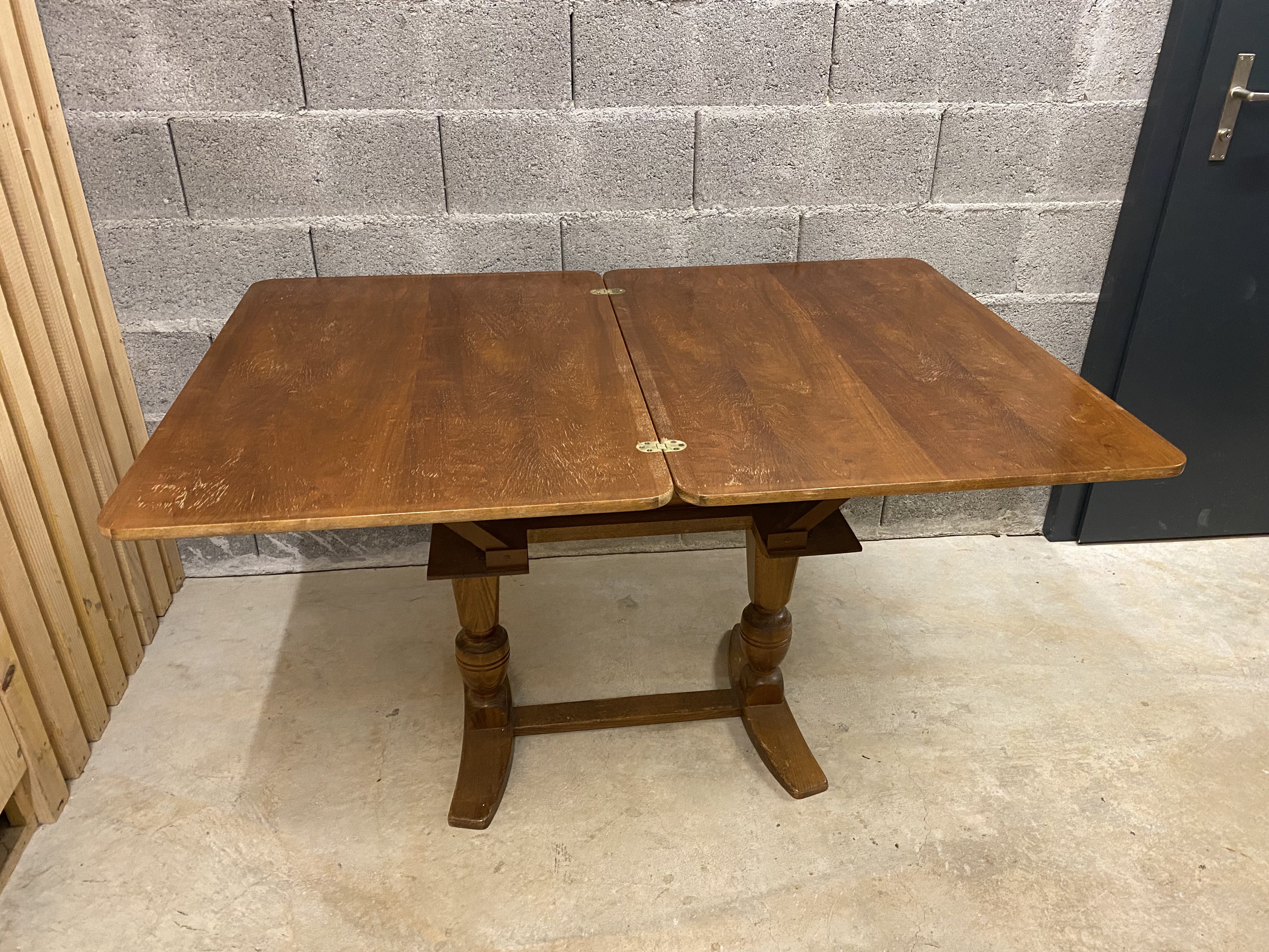 Produit venduTable vintage en bois massif. Un petit bijou de créativité. Le plateau est réglable à la fois en hauteur et en largeur par un système breveté de charnières, de pivots et de ressorts. Parfaitement fonctionnelle. Petites dimensions: L90 x l65 x h64cm. Grandes dimensions: L130 x l90 x H76 cm. Le plateau comporte quelques traces d’usures, mais un coup de ponçage et de vernis lui redonneraient une nouvelle jeunesse bien méritée. Retrait si possible. Livraison à discuter.