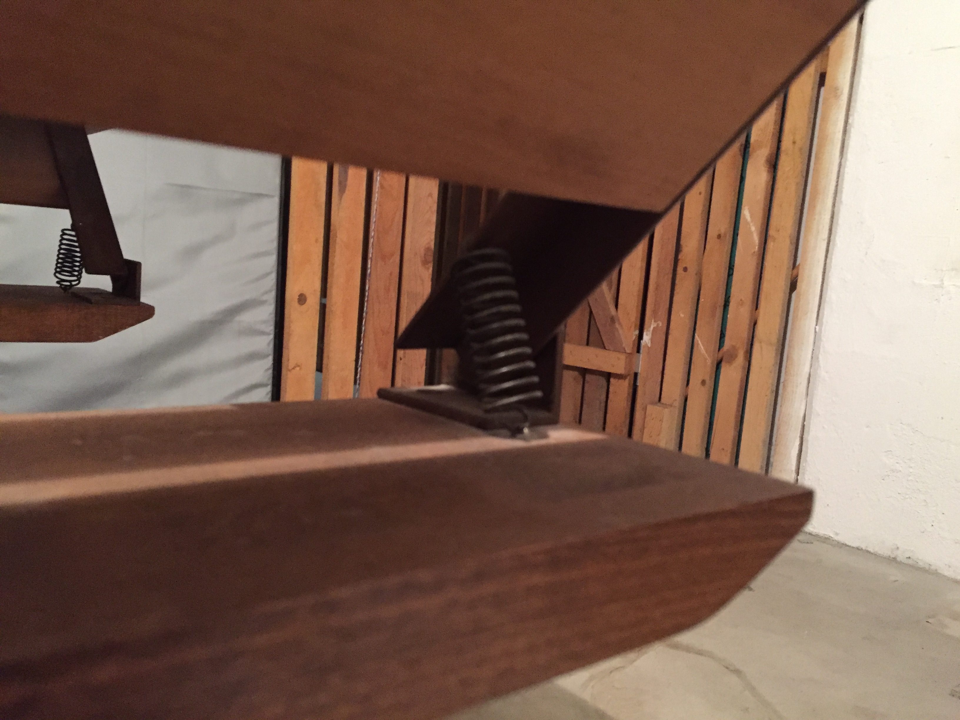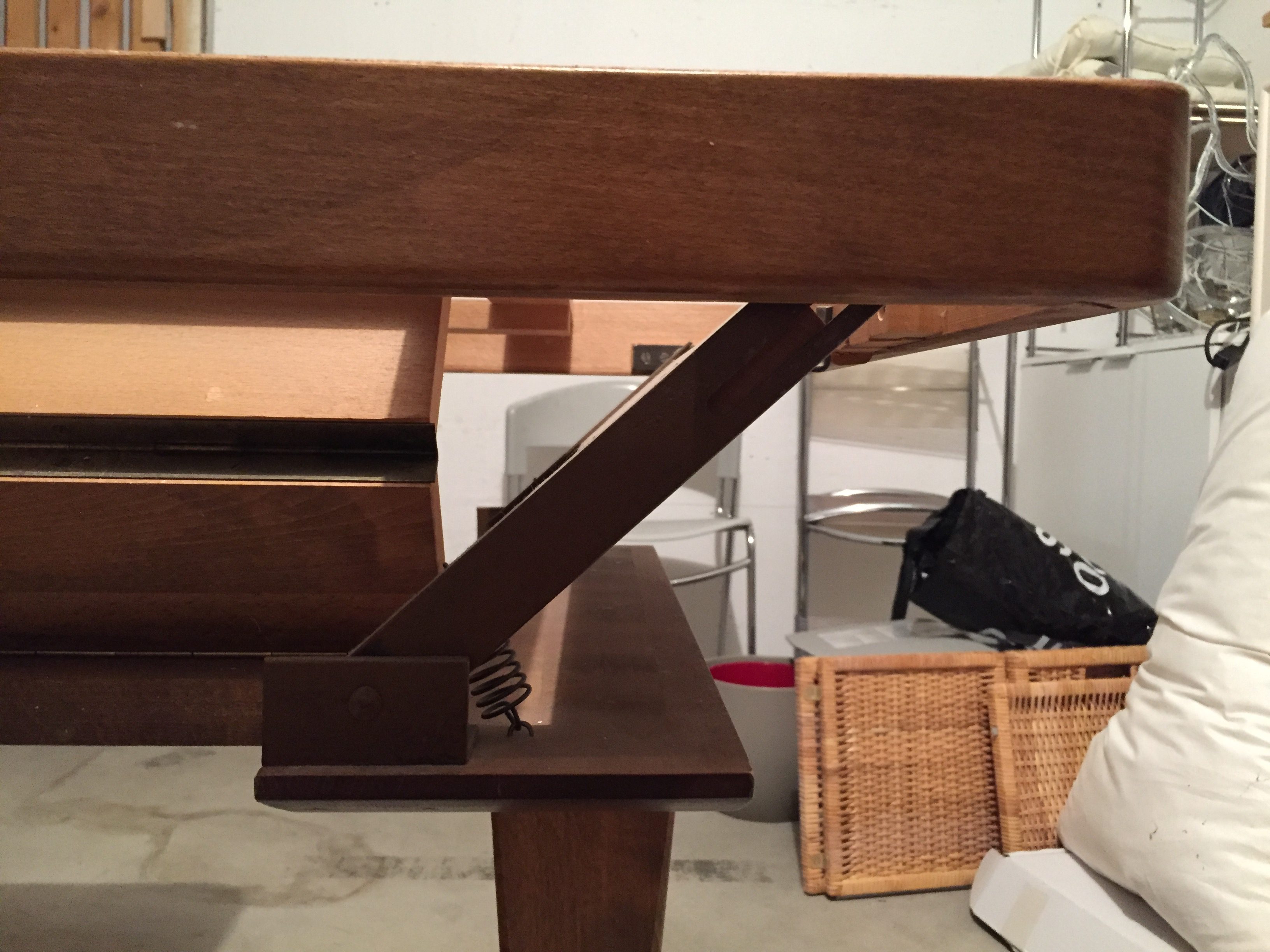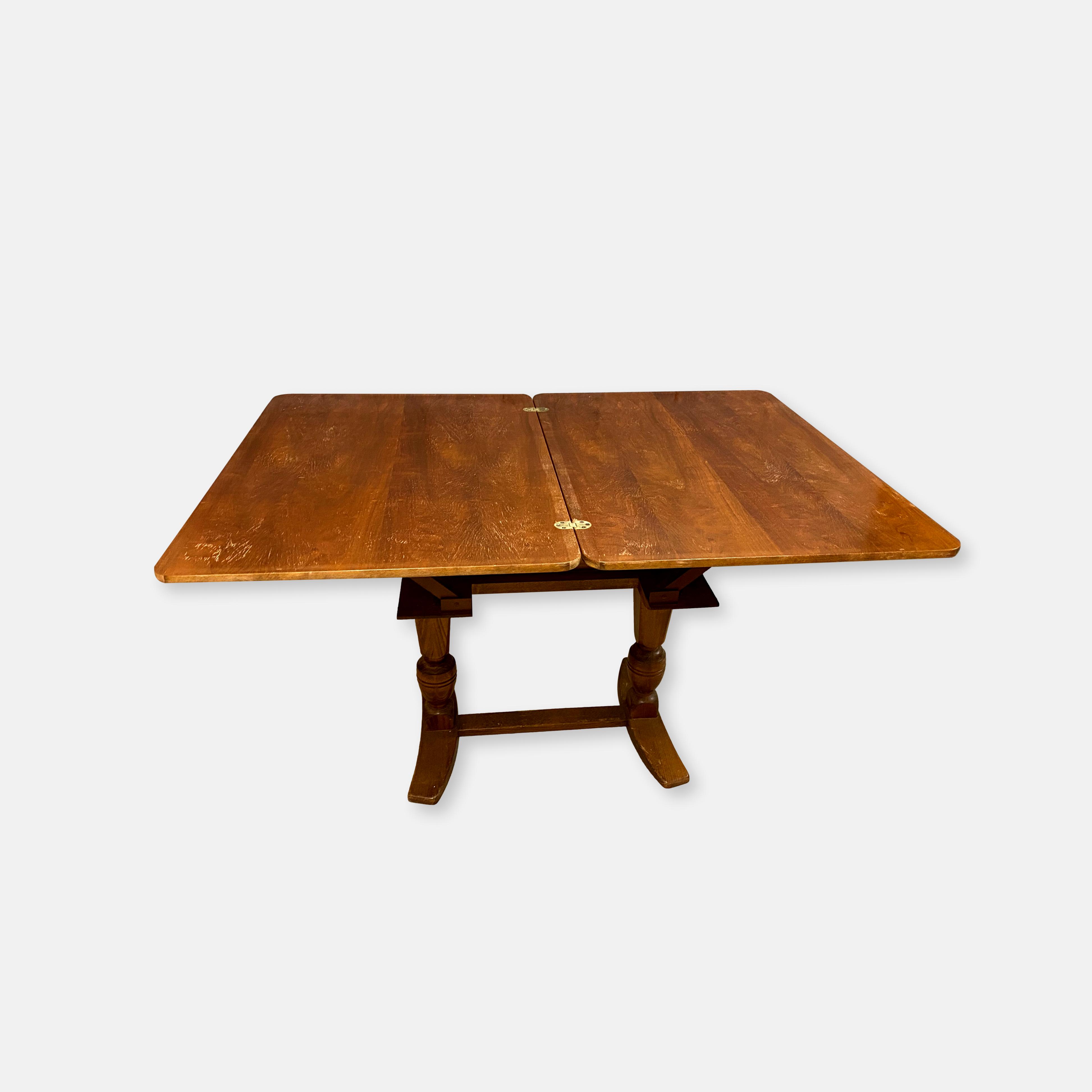 Produit venduTable vintage en bois massif. Un petit bijou de créativité. Le plateau est réglable à la fois en hauteur et en largeur par un système breveté de charnières, de pivots et de ressorts. Parfaitement fonctionnelle. Petites dimensions: L90 x l65 x h64cm. Grandes dimensions: L130 x l90 x H76 cm. Le plateau comporte quelques traces d’usures, mais un coup de ponçage et de vernis lui redonneraient une nouvelle jeunesse bien méritée. Retrait si possible. Livraison à discuter.