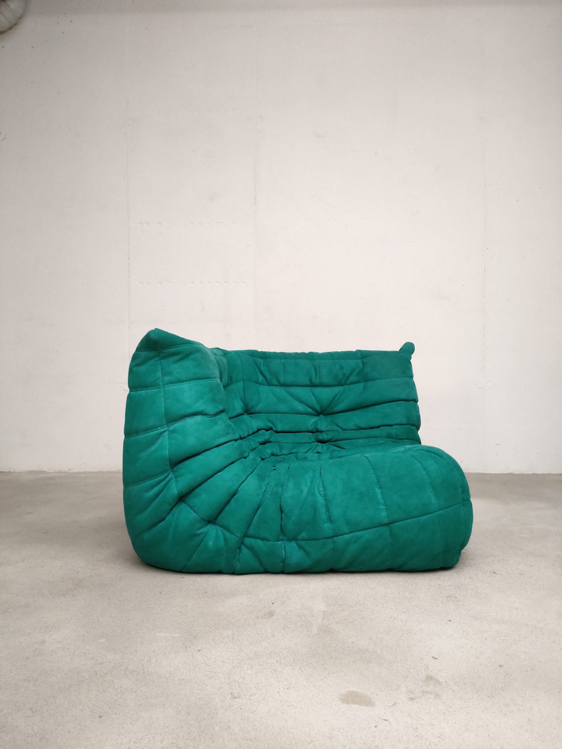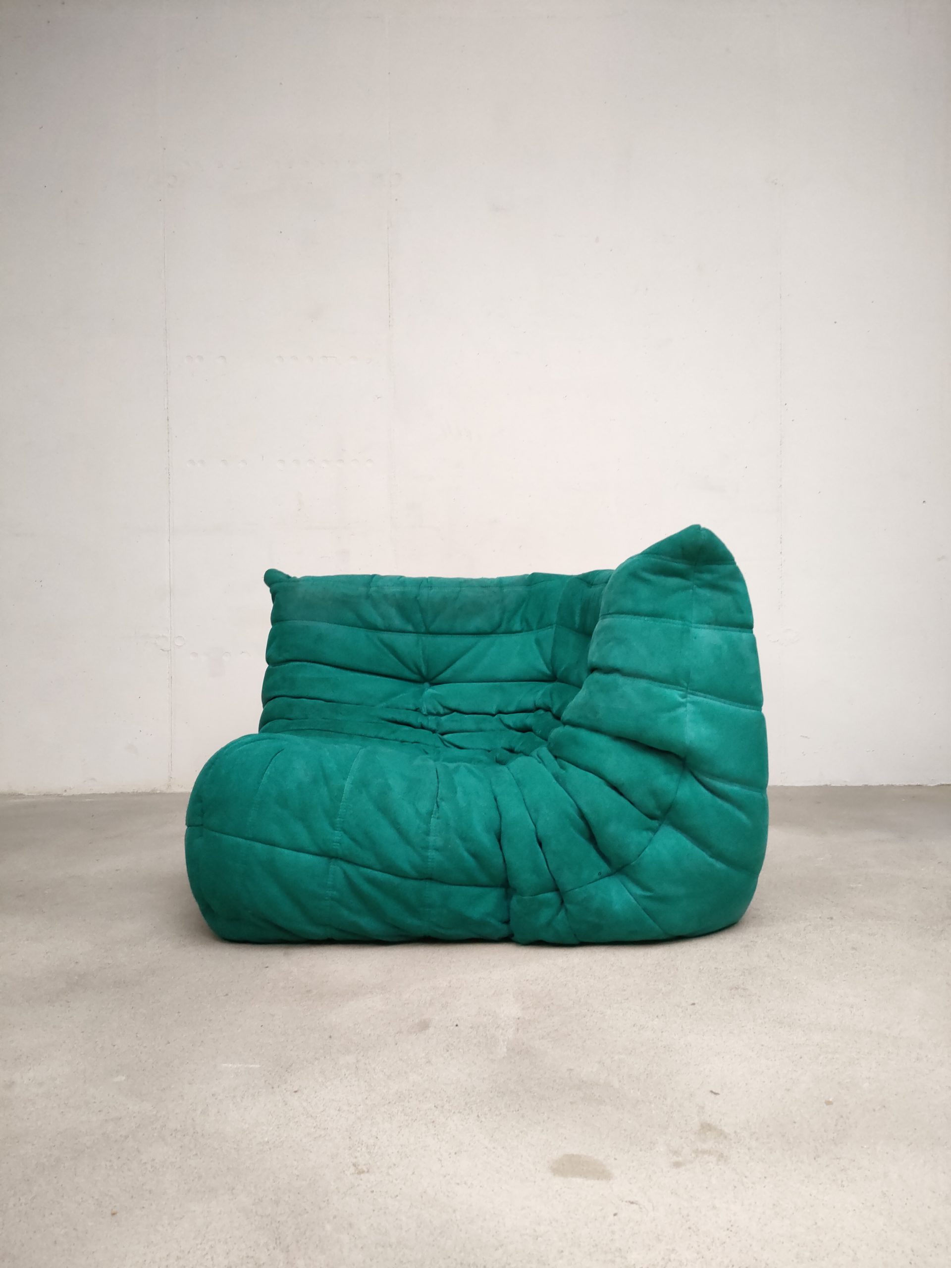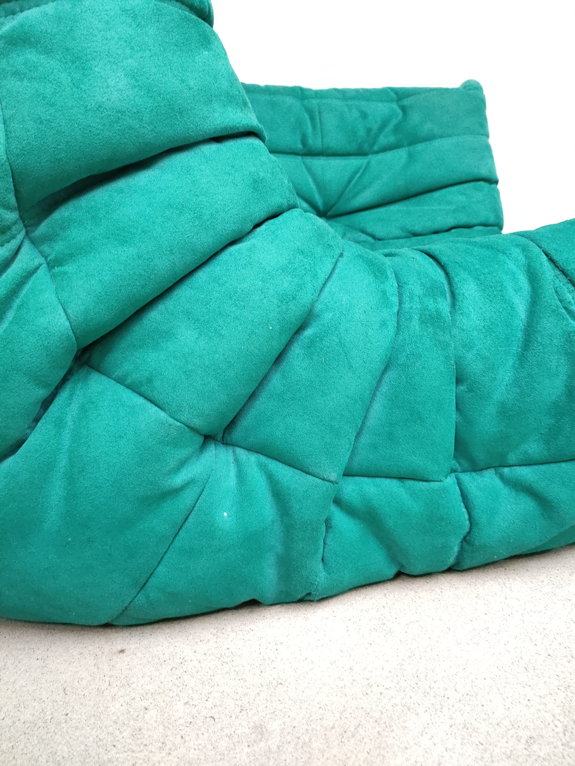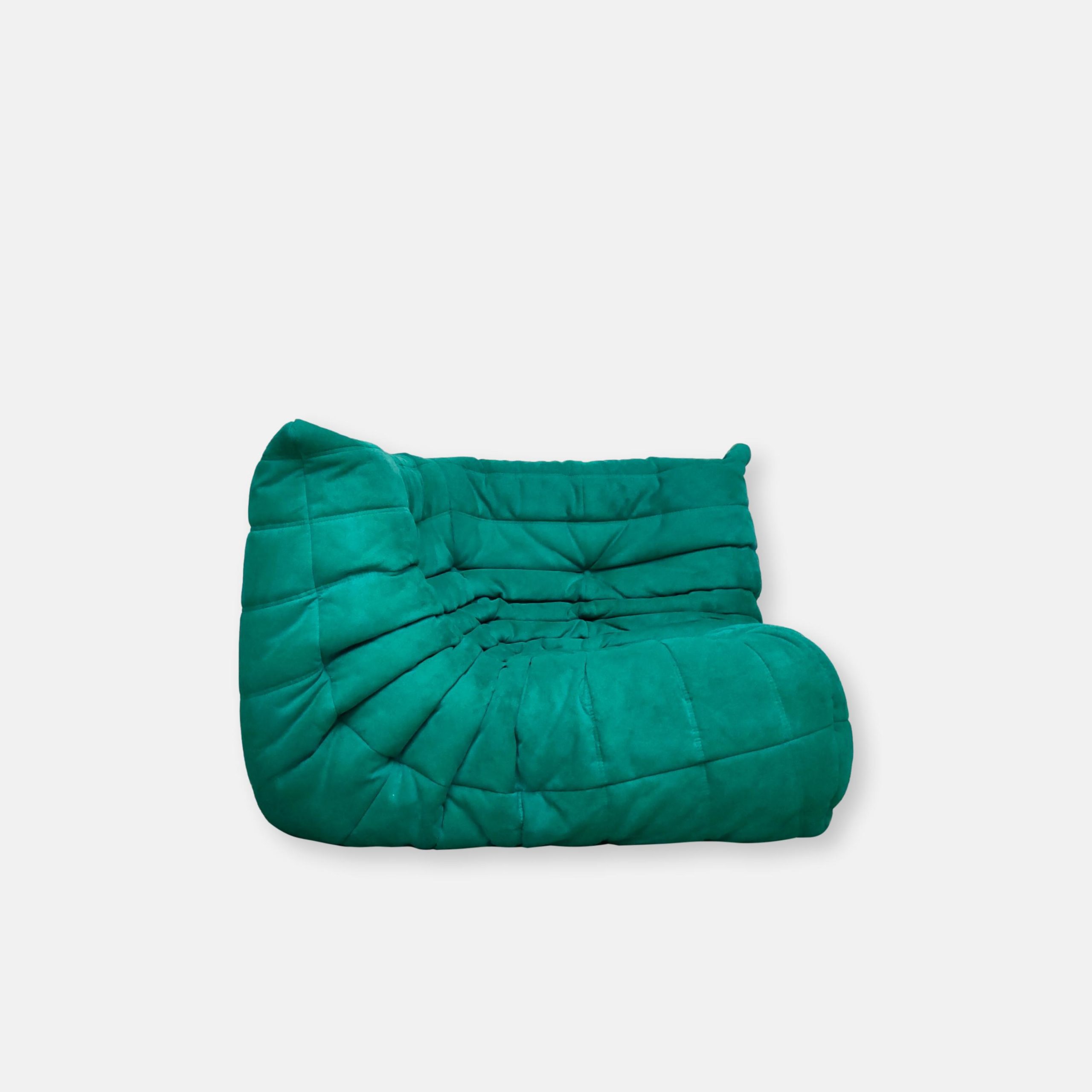 Produit venduAngle Togo dessiné par Michel Ducaroy et produit par Ligne Roset en alcantara de couleur bleu-vert. Signes d’usure sur l’alcantara : des bouloches et quelques petites traces visibles sur les photos. Le tissu a très probablement été reteint par son ancien propriétaire et à certains endroits il n’est plus très souple mais plutôt rigide. Autrement, pas de déchirures et la mousse est en bon état. Pas d’odeurs.