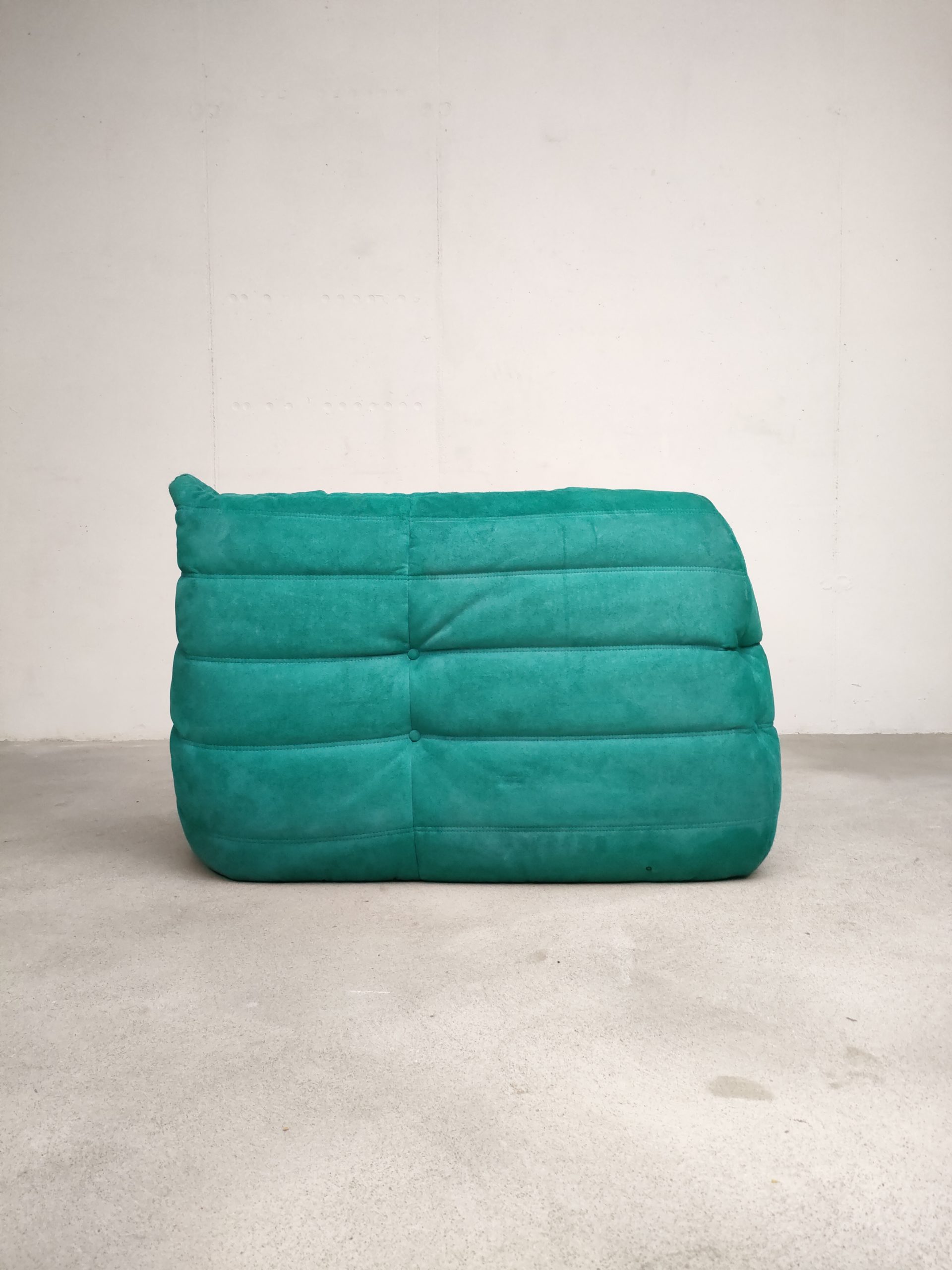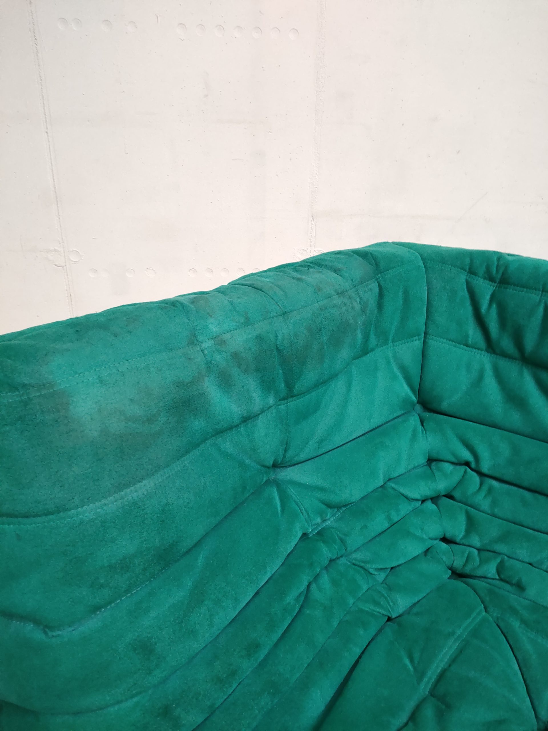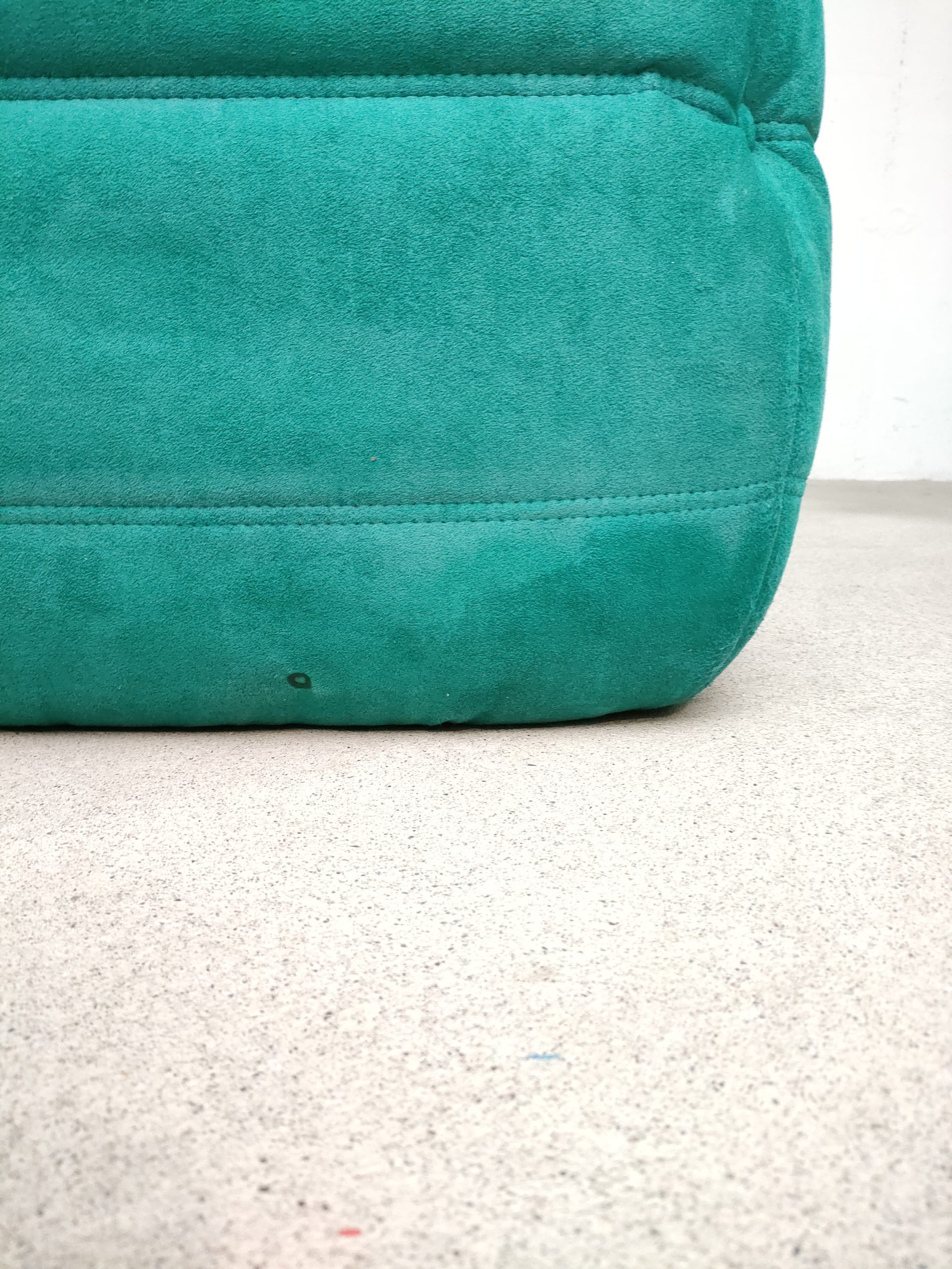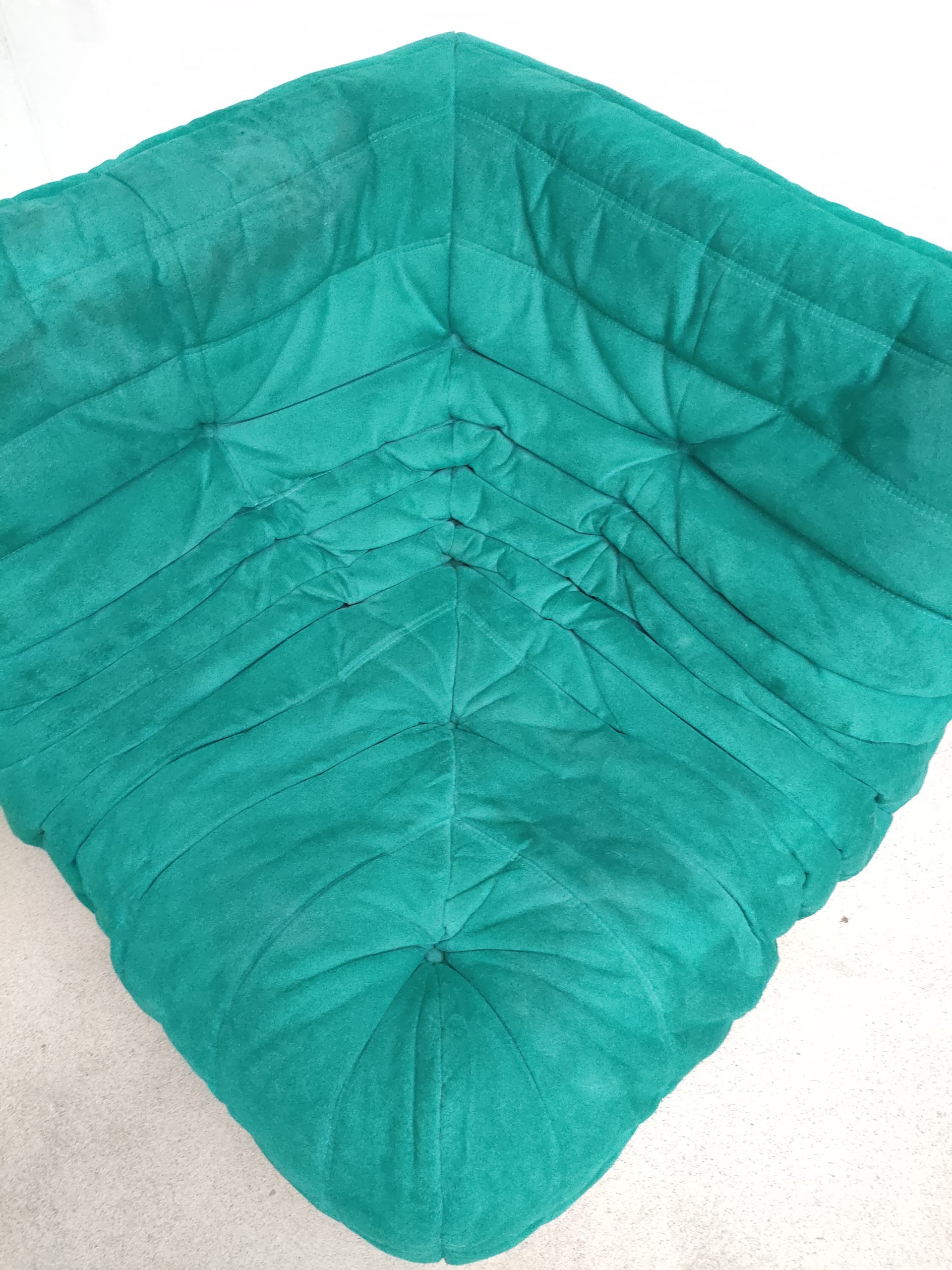 Produit venduAngle Togo dessiné par Michel Ducaroy et produit par Ligne Roset en alcantara de couleur bleu-vert. Signes d’usure sur l’alcantara : des bouloches et quelques petites traces visibles sur les photos. Le tissu a très probablement été reteint par son ancien propriétaire et à certains endroits il n’est plus très souple mais plutôt rigide. Autrement, pas de déchirures et la mousse est en bon état. Pas d’odeurs.