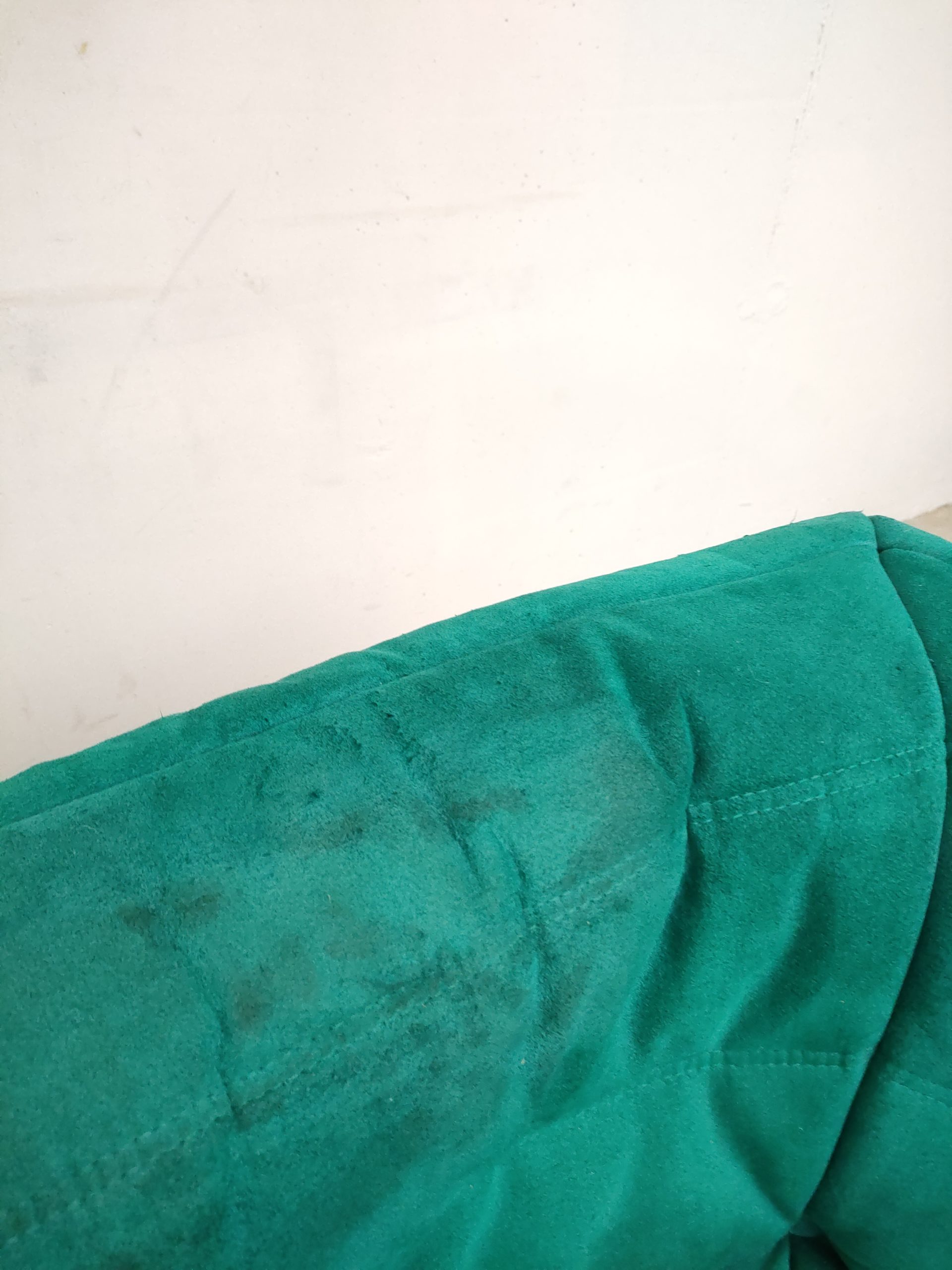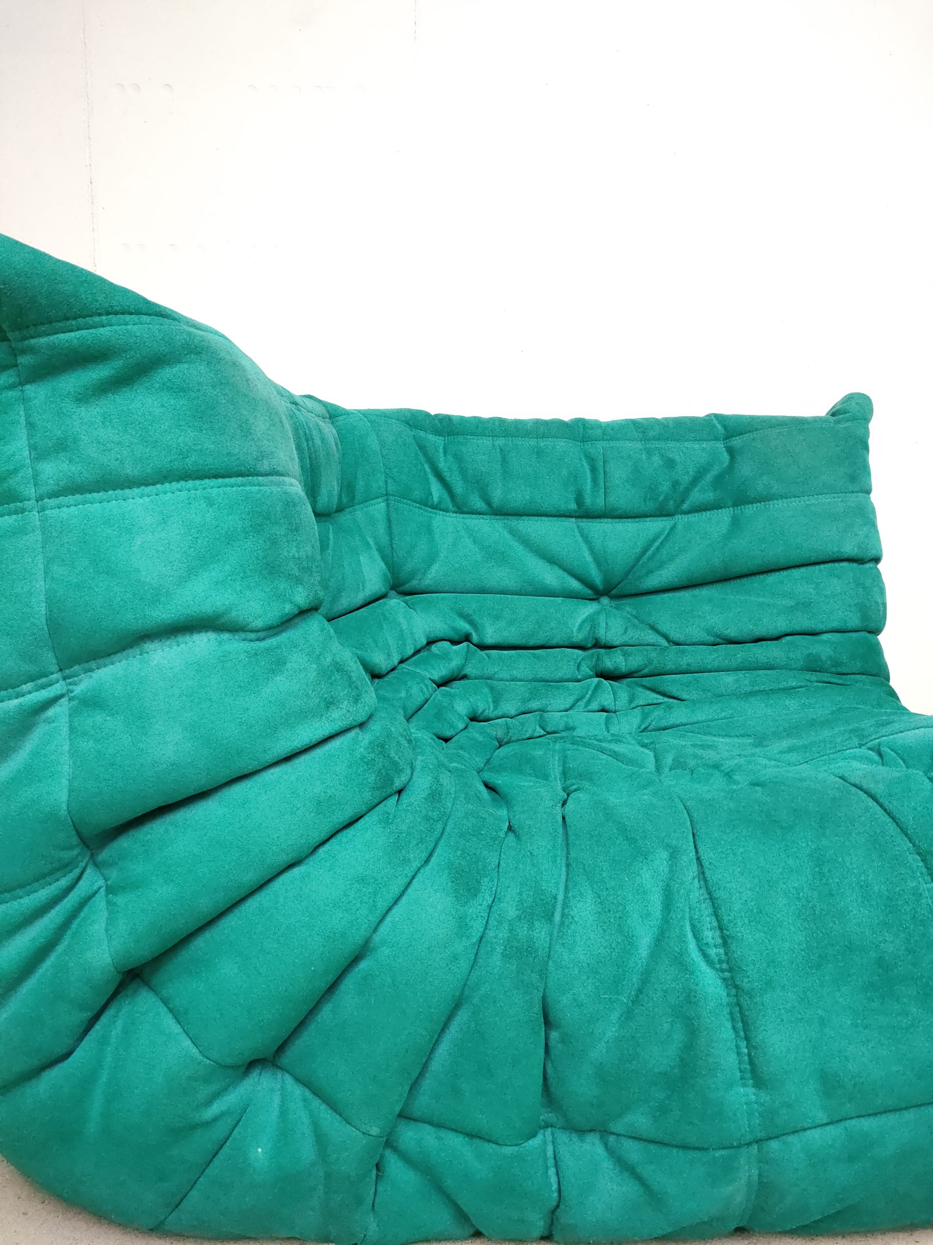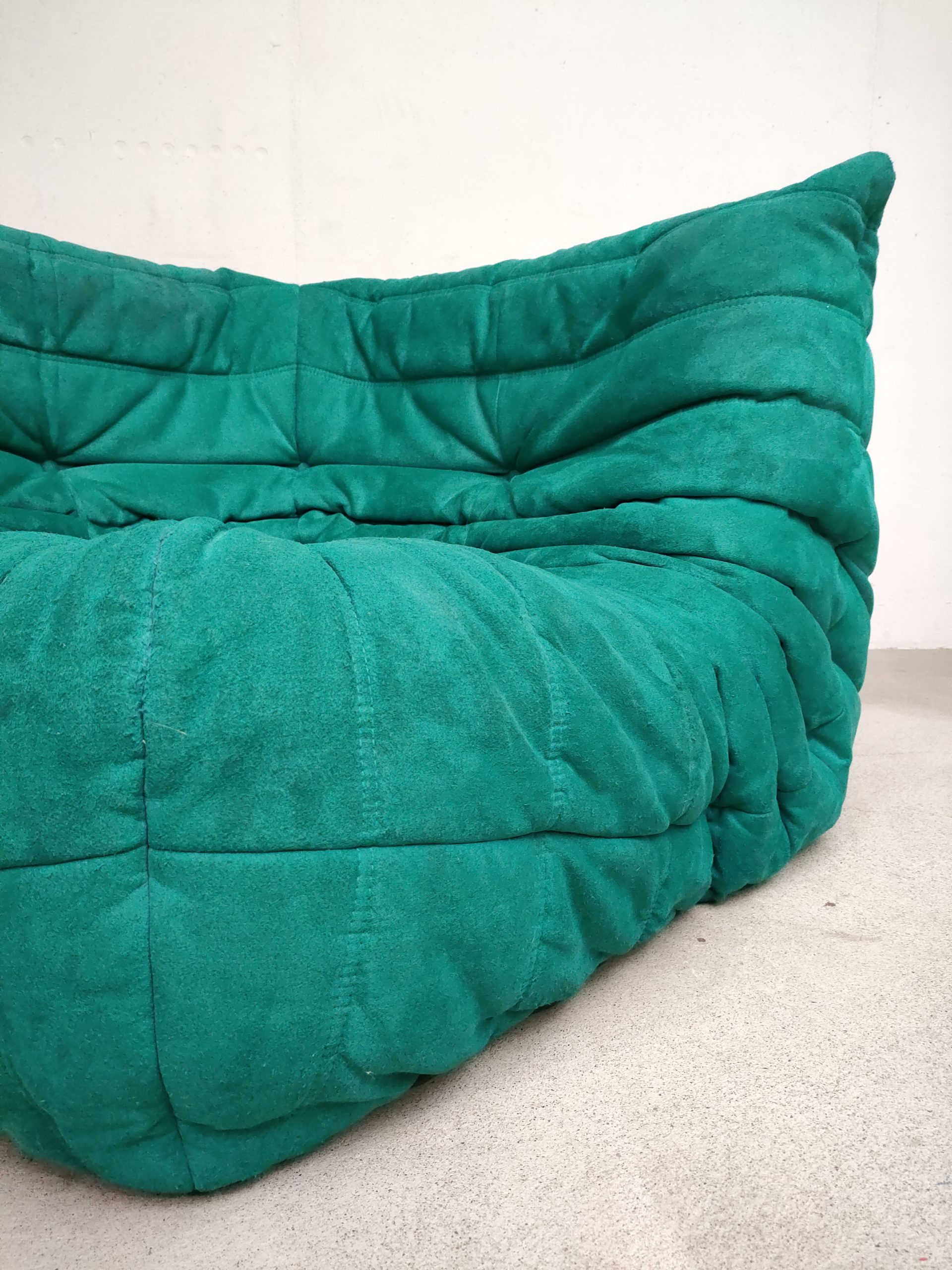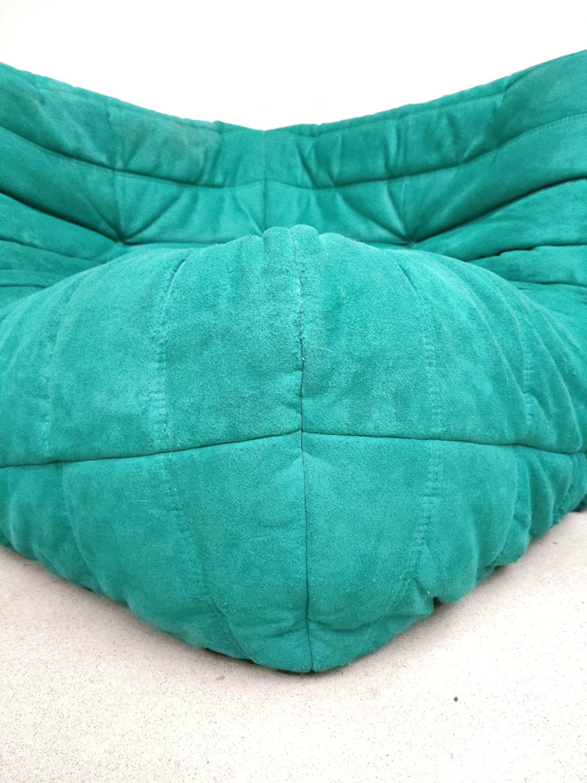 Produit venduAngle Togo dessiné par Michel Ducaroy et produit par Ligne Roset en alcantara de couleur bleu-vert. Signes d’usure sur l’alcantara : des bouloches et quelques petites traces visibles sur les photos. Le tissu a très probablement été reteint par son ancien propriétaire et à certains endroits il n’est plus très souple mais plutôt rigide. Autrement, pas de déchirures et la mousse est en bon état. Pas d’odeurs.