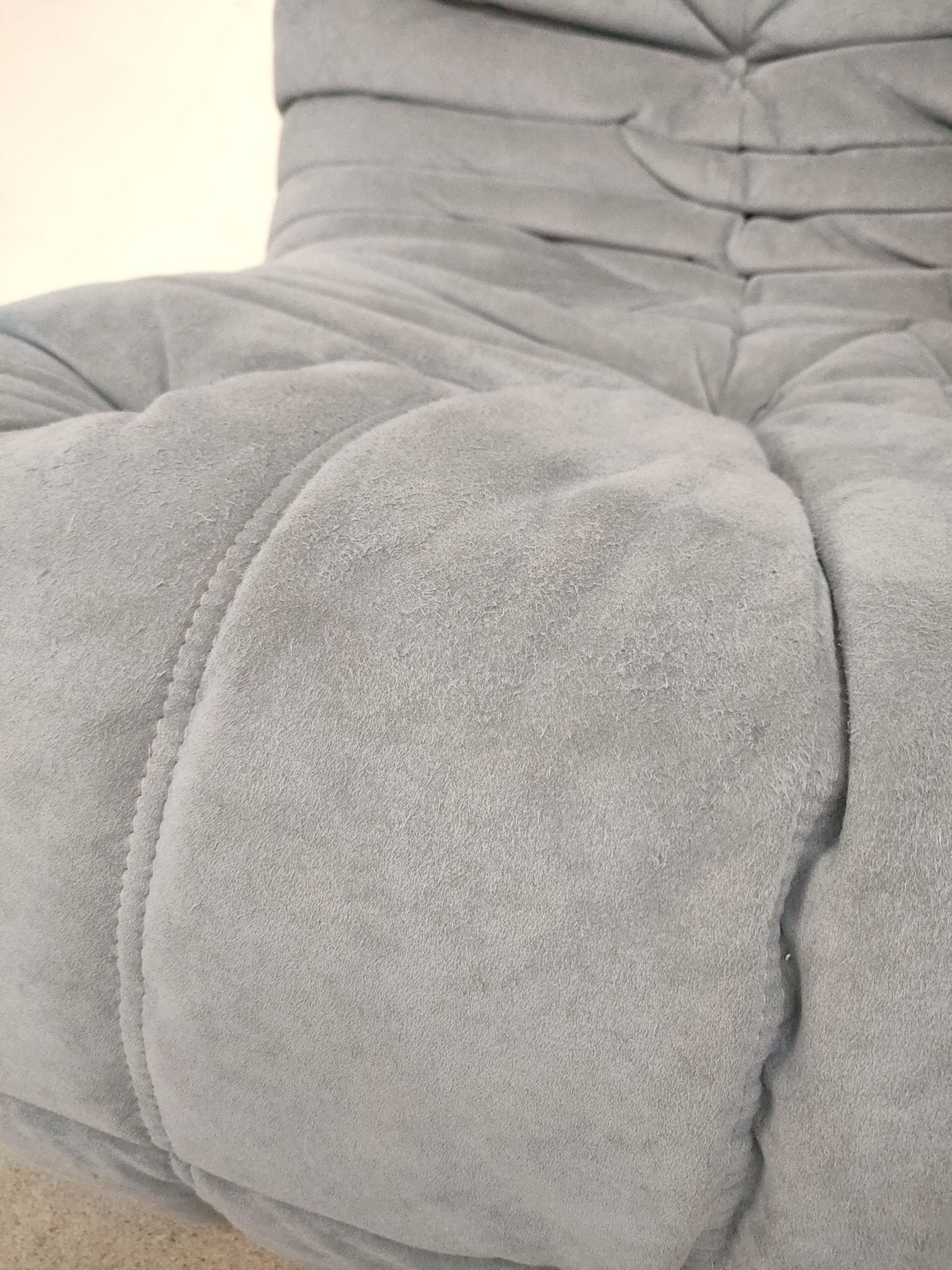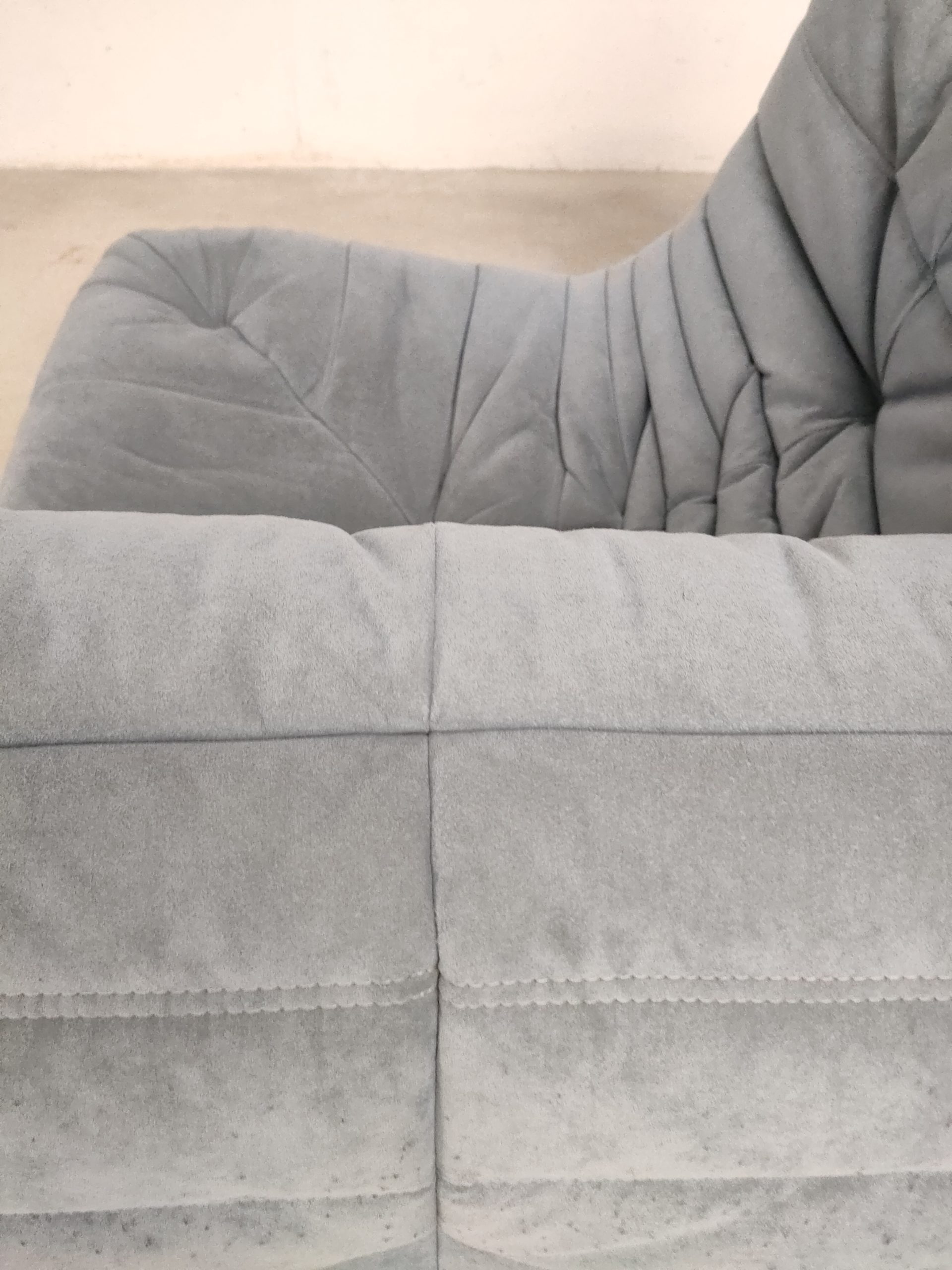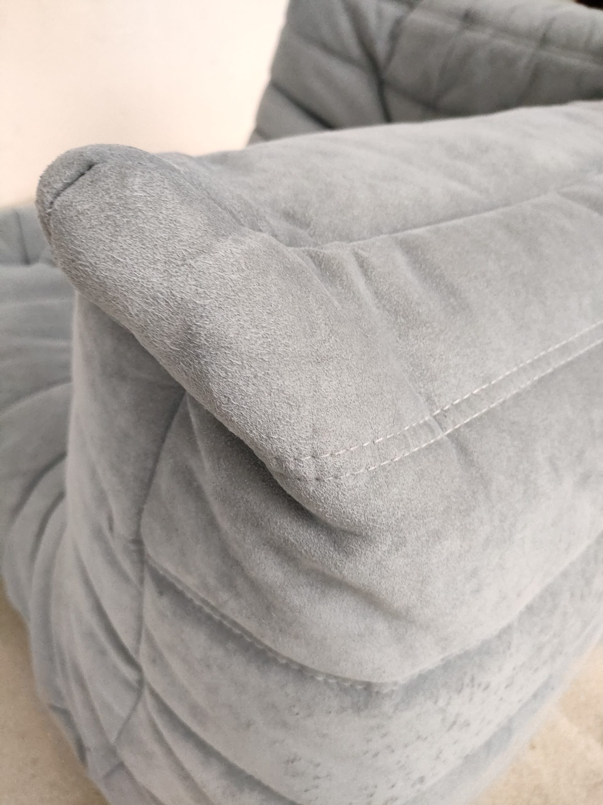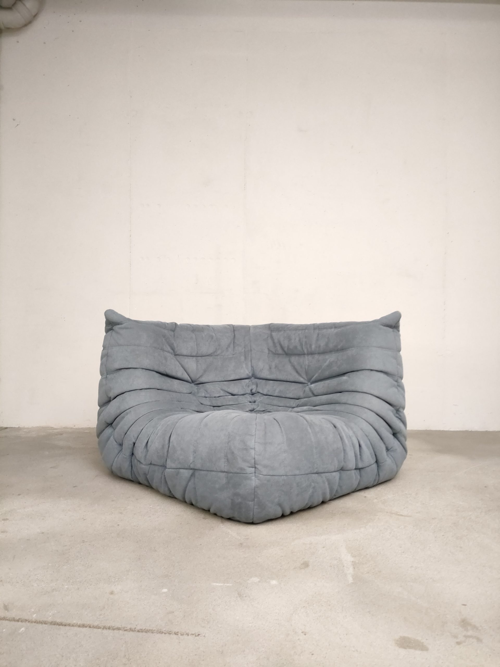 Produit venduAngle Togo dessiné par Michel Ducaroy et produit par Ligne Roset en alcantara de couleur bleu/gris. Signes d’usure sur l’alcantara : des bouloches, une trace (sur un côté au dos – plus visible sur la photo qu’en vrai) et des griffes de chats principalement au dos (ça fait des petites pointes) (voir photos). Autrement, pas de déchirures et la mousse est en bon état. Pas d’odeurs.
