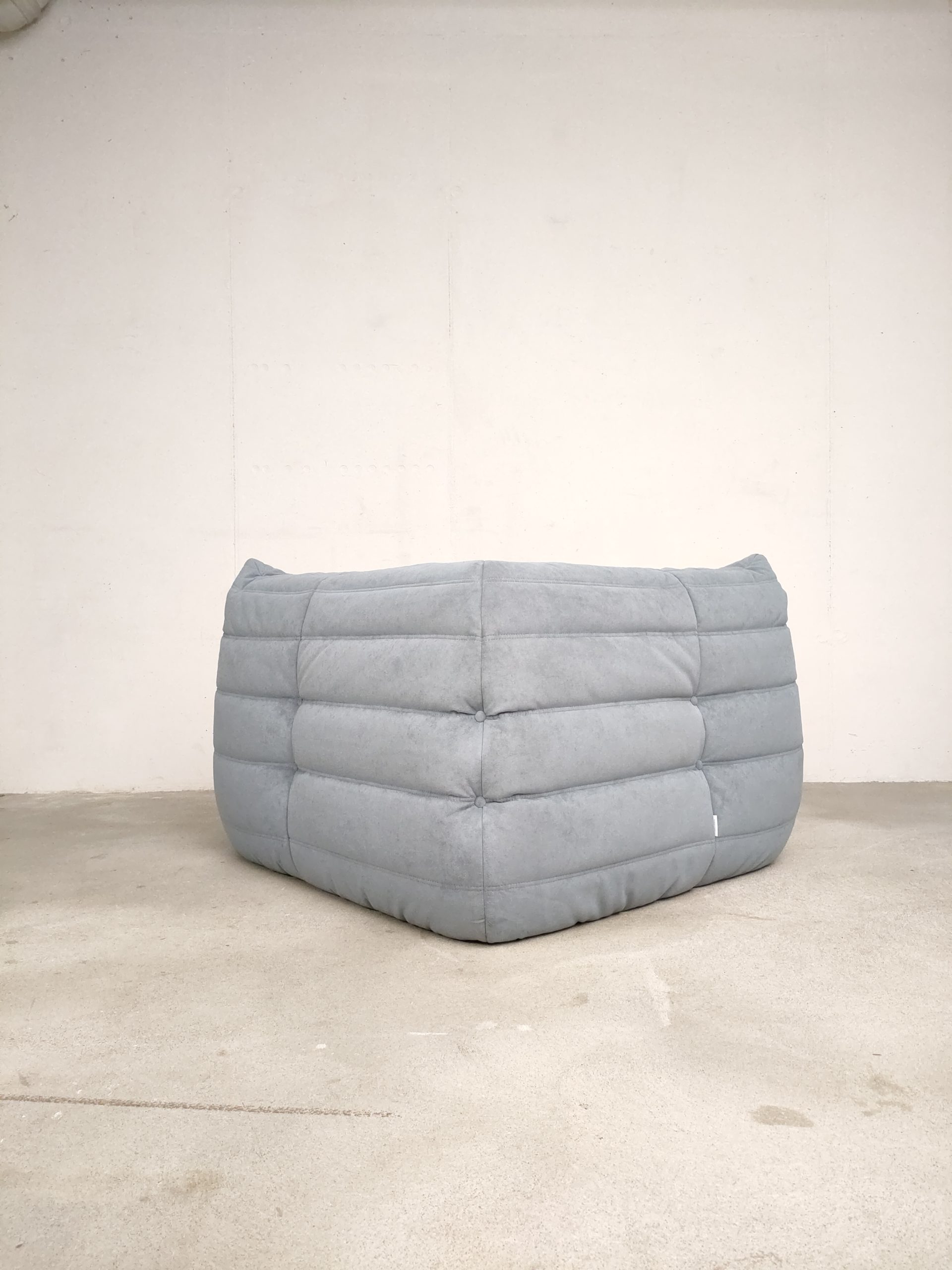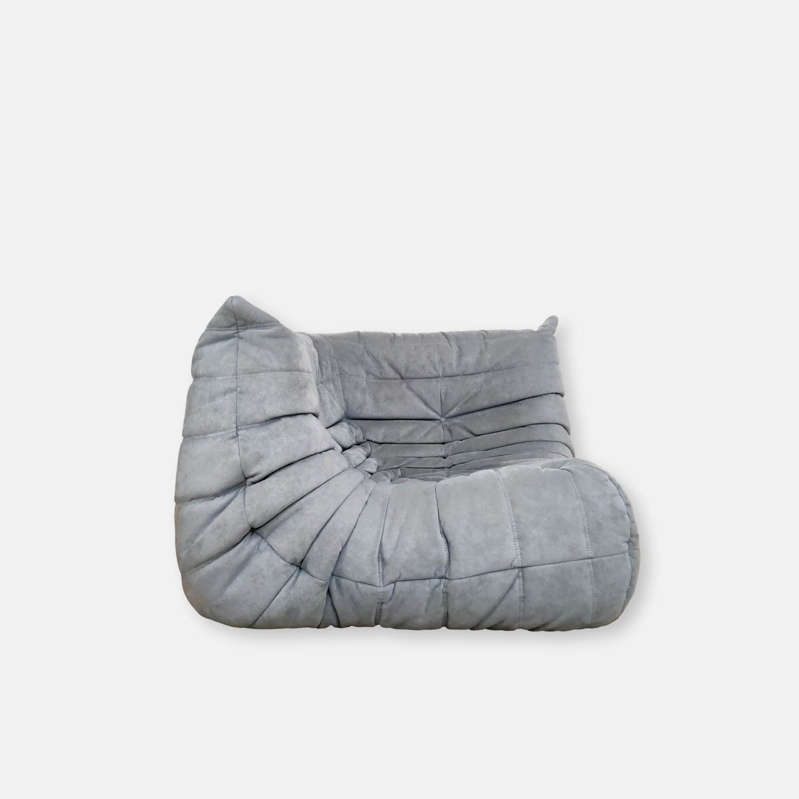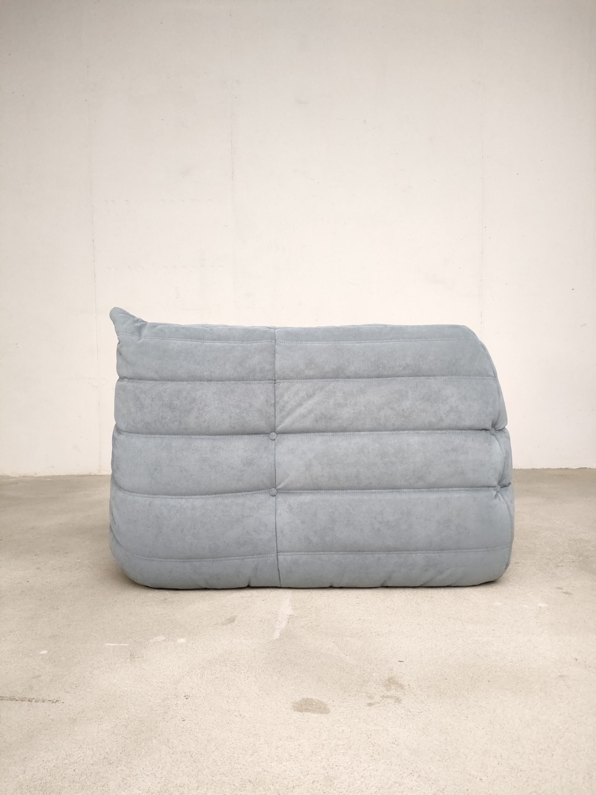 Produit venduAngle Togo dessiné par Michel Ducaroy et produit par Ligne Roset en alcantara de couleur bleu/gris. Signes d’usure sur l’alcantara : des bouloches, une trace (sur un côté au dos – plus visible sur la photo qu’en vrai) et des griffes de chats principalement au dos (ça fait des petites pointes) (voir photos). Autrement, pas de déchirures et la mousse est en bon état. Pas d’odeurs.