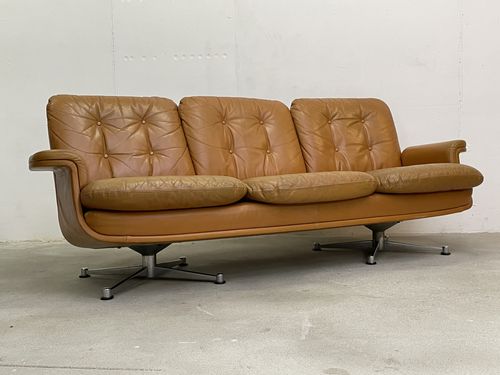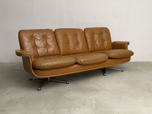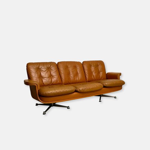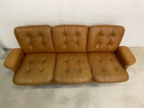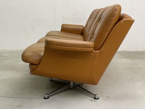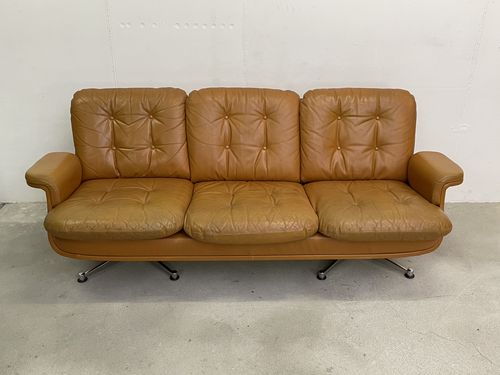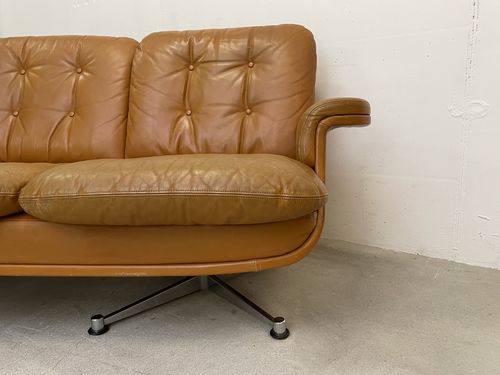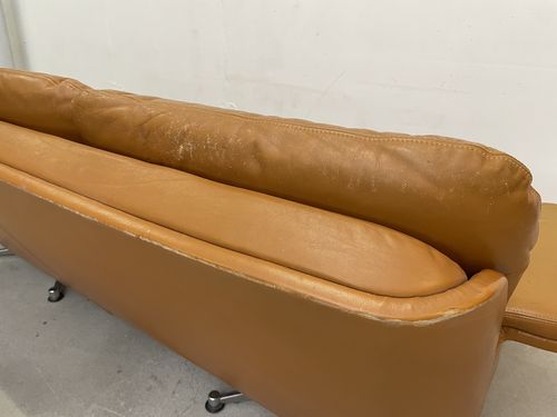 Produit venduCanapé vintage en cuir couleur caramel. L’assise (hauteur environ 40 cm) est confortable. Les pieds sont en métal chromé. Le cuir comporte des traces d’utilisation, en particulier sur les coussins des assises. Ceux-ci ont pris une coloration légèrement différente du reste du canapé avec le temps. Le cuir n’a cependant aucune déchirure et tous les boutons sont présents. Les coussins des assises étaient maintenus, à l’origine, par des bandes de velcro. Elles ont pratiquement toutes disparu, mais les coussins restent bien en place pour autant.