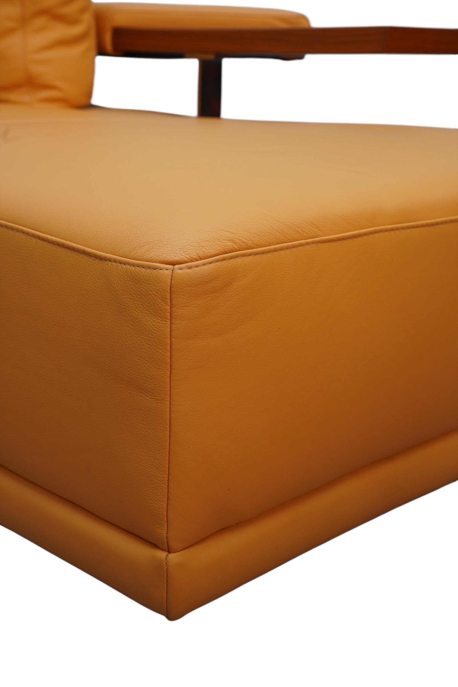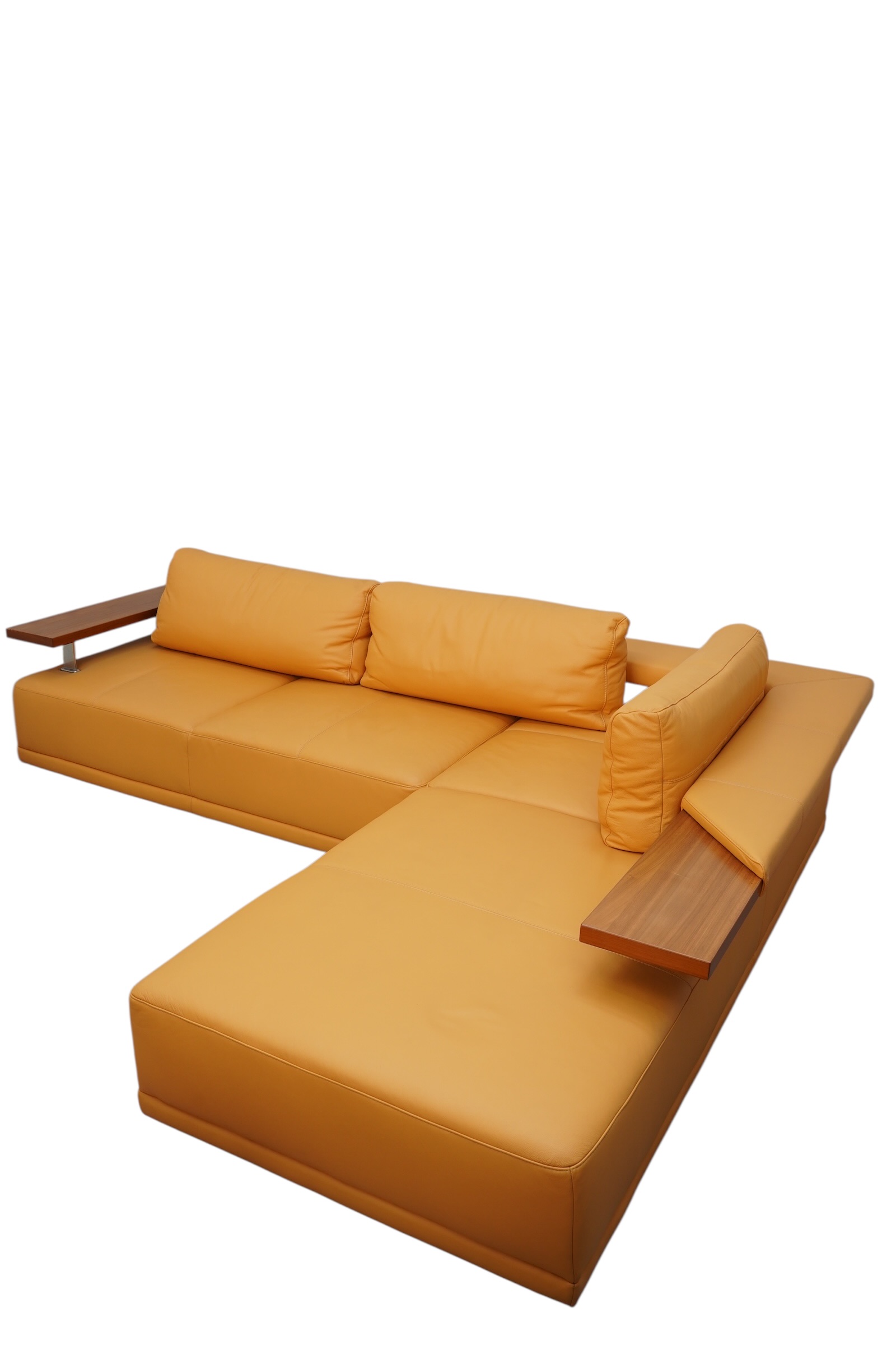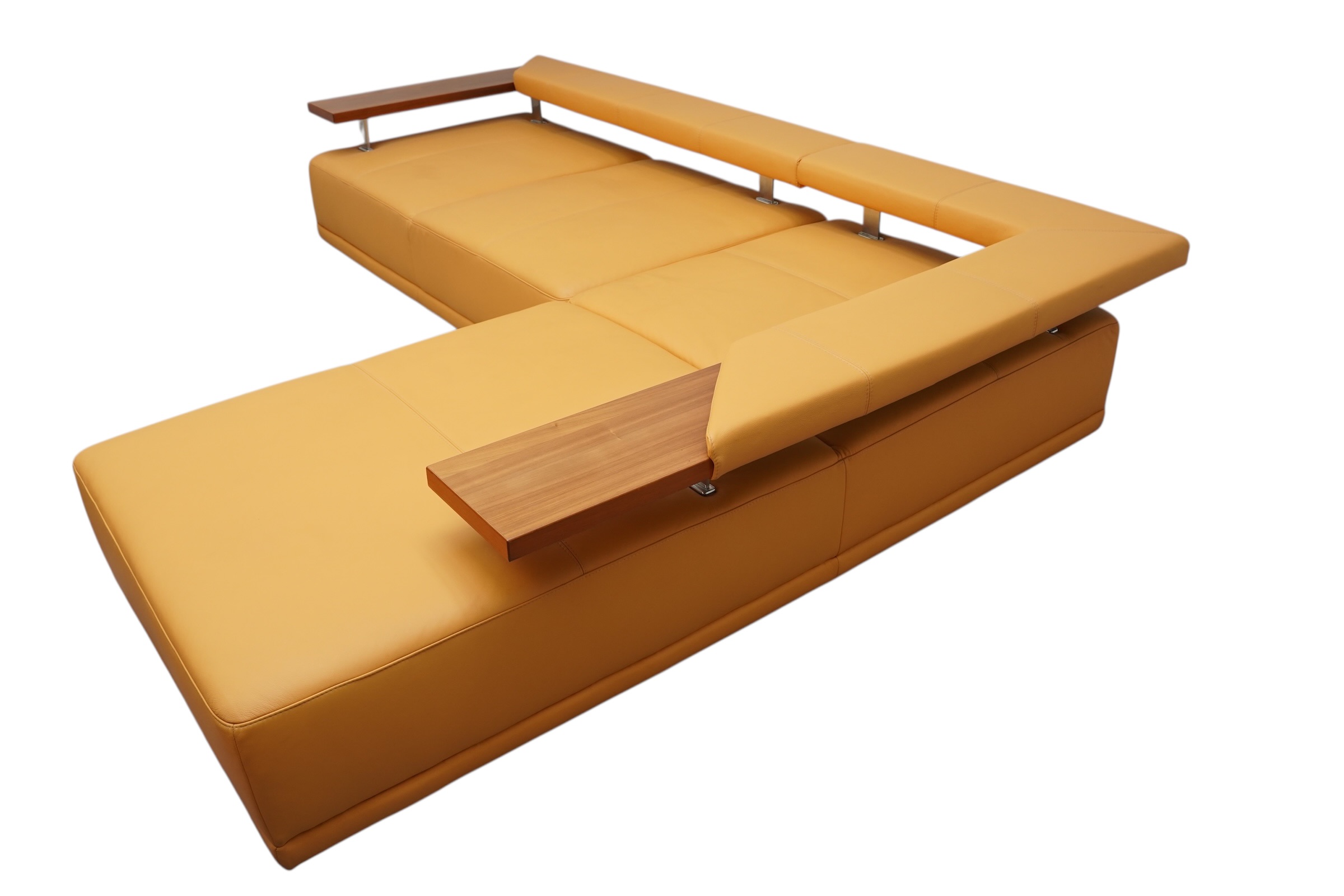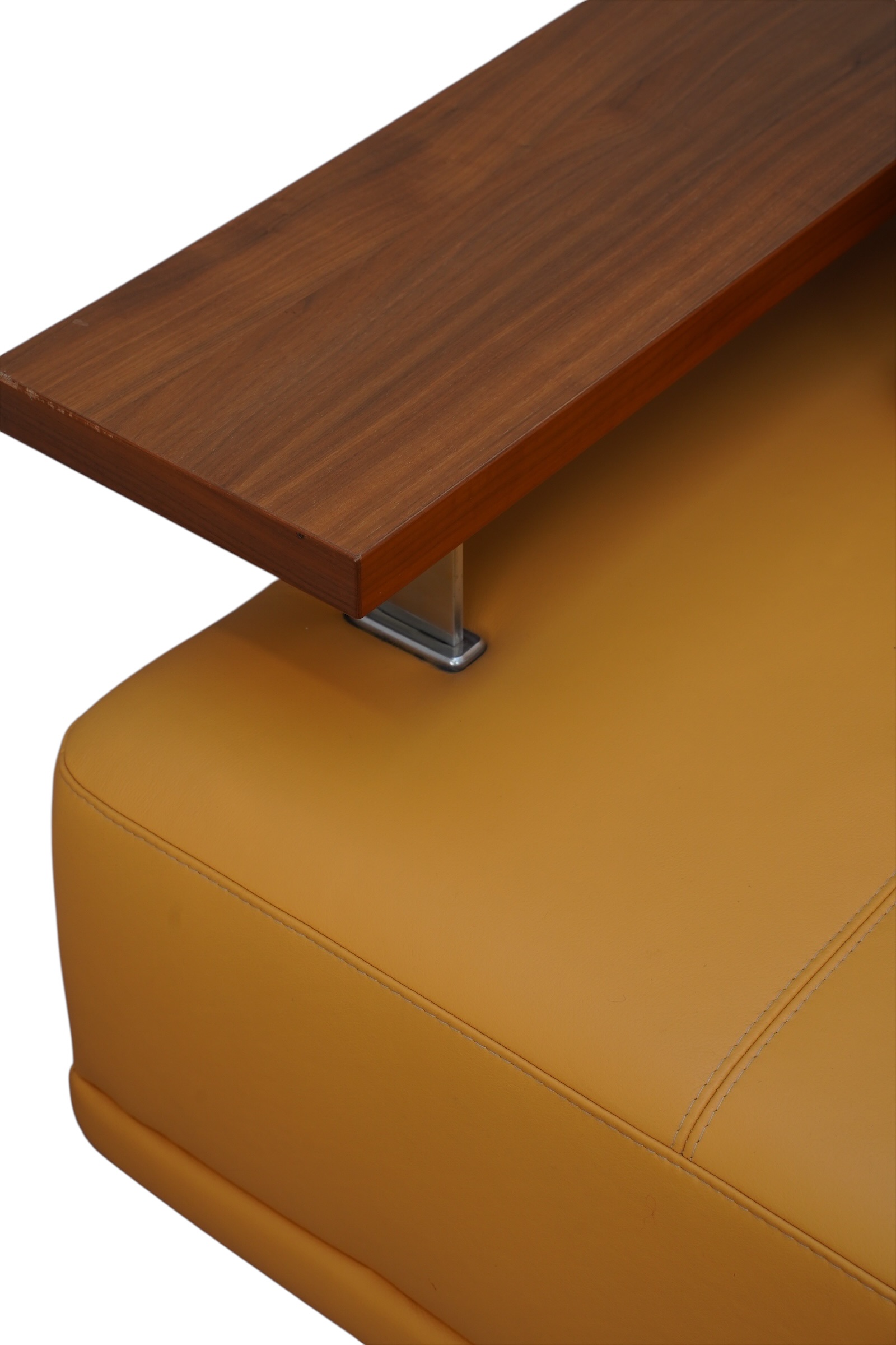 Canapé d’angle en cuir jaune mangue munie de modules d’accoudoirs latérales en bois, on peut y déposer diverses objets. Ce canapé est munie de 3 coussins généreux. L’ensemble repose sur un piétement métallique.