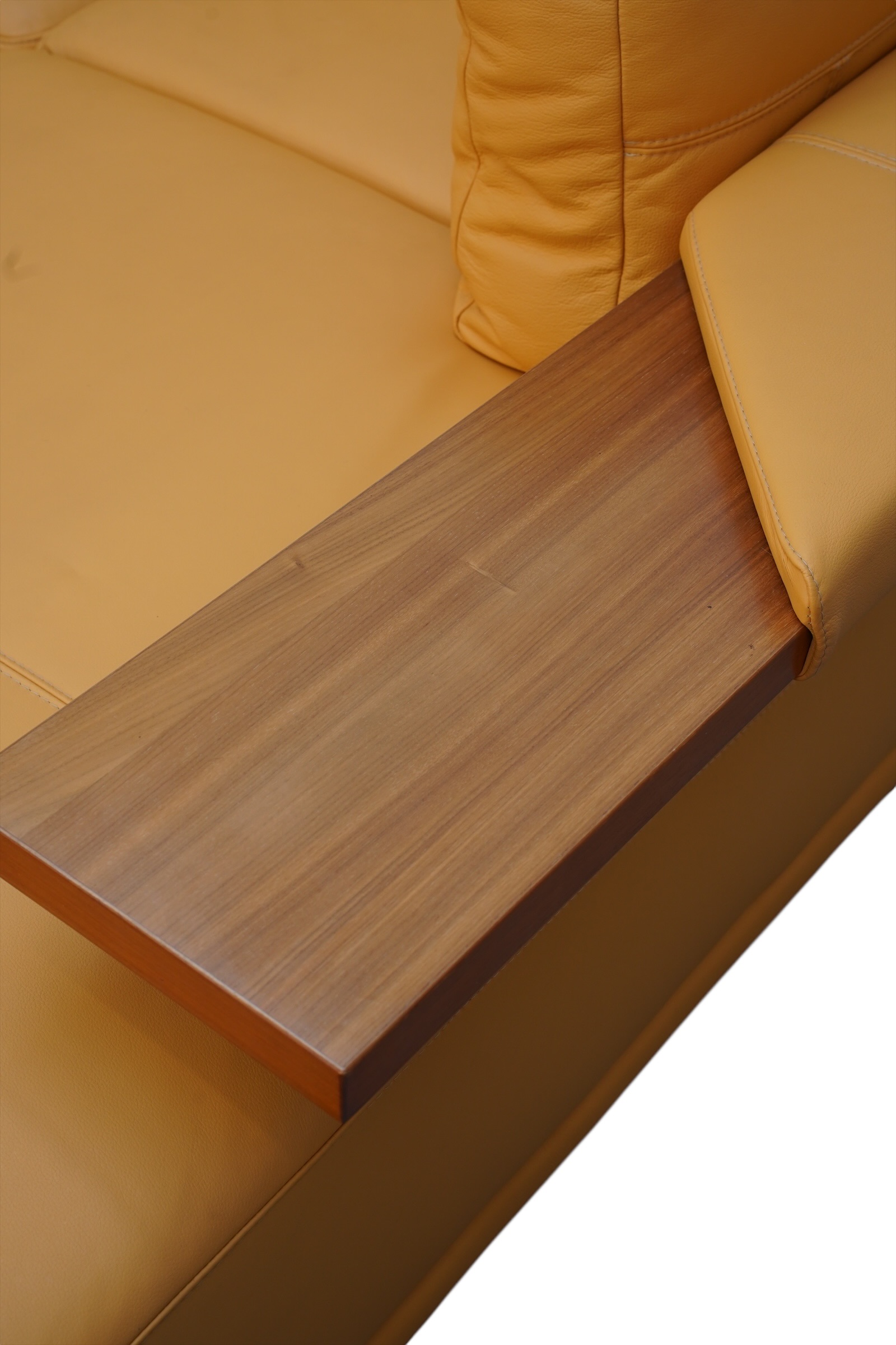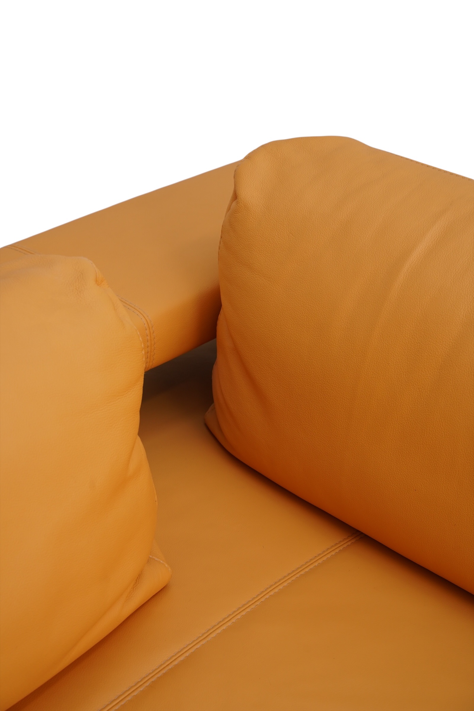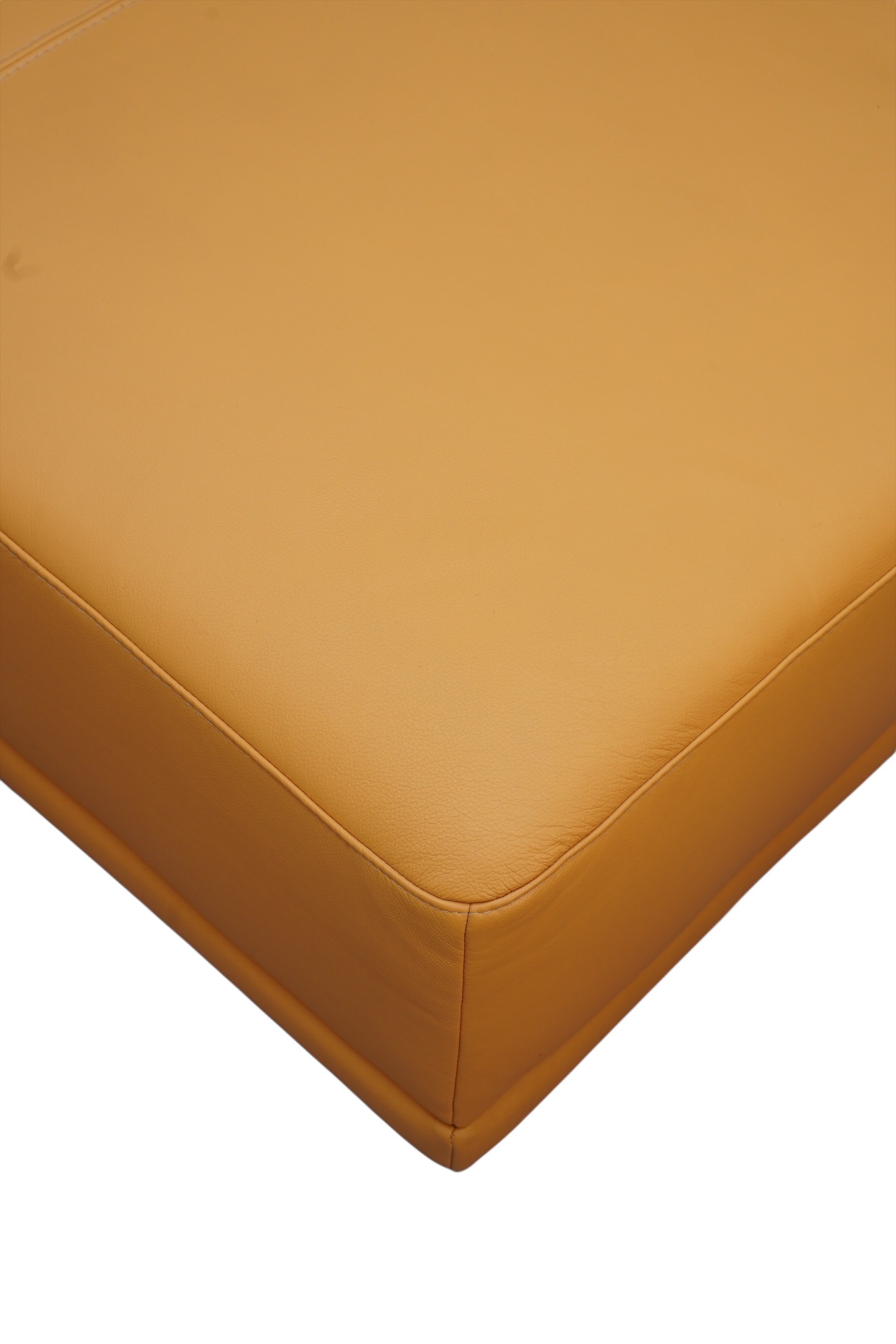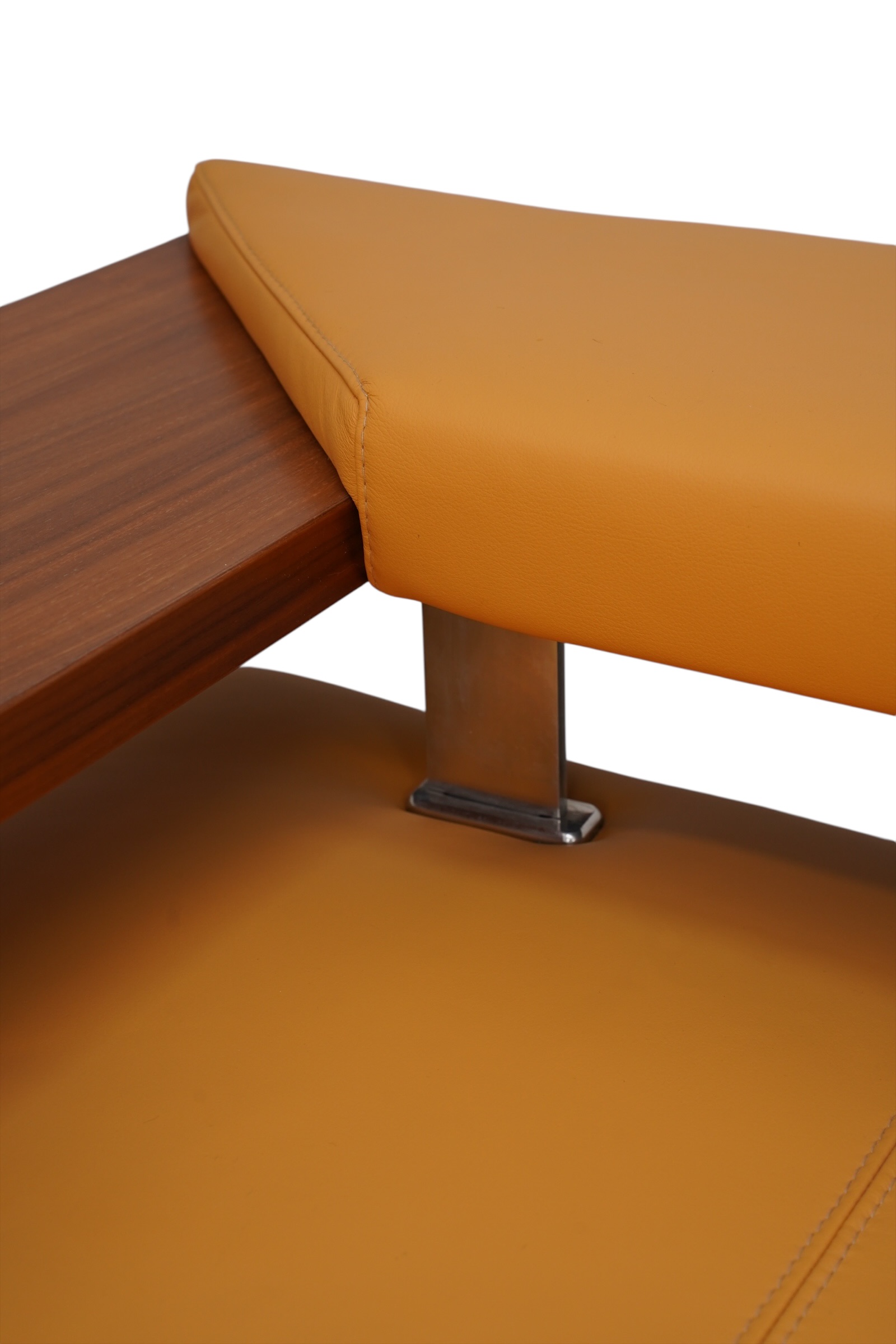 Canapé d’angle en cuir jaune mangue munie de modules d’accoudoirs latérales en bois, on peut y déposer diverses objets. Ce canapé est munie de 3 coussins généreux. L’ensemble repose sur un piétement métallique.