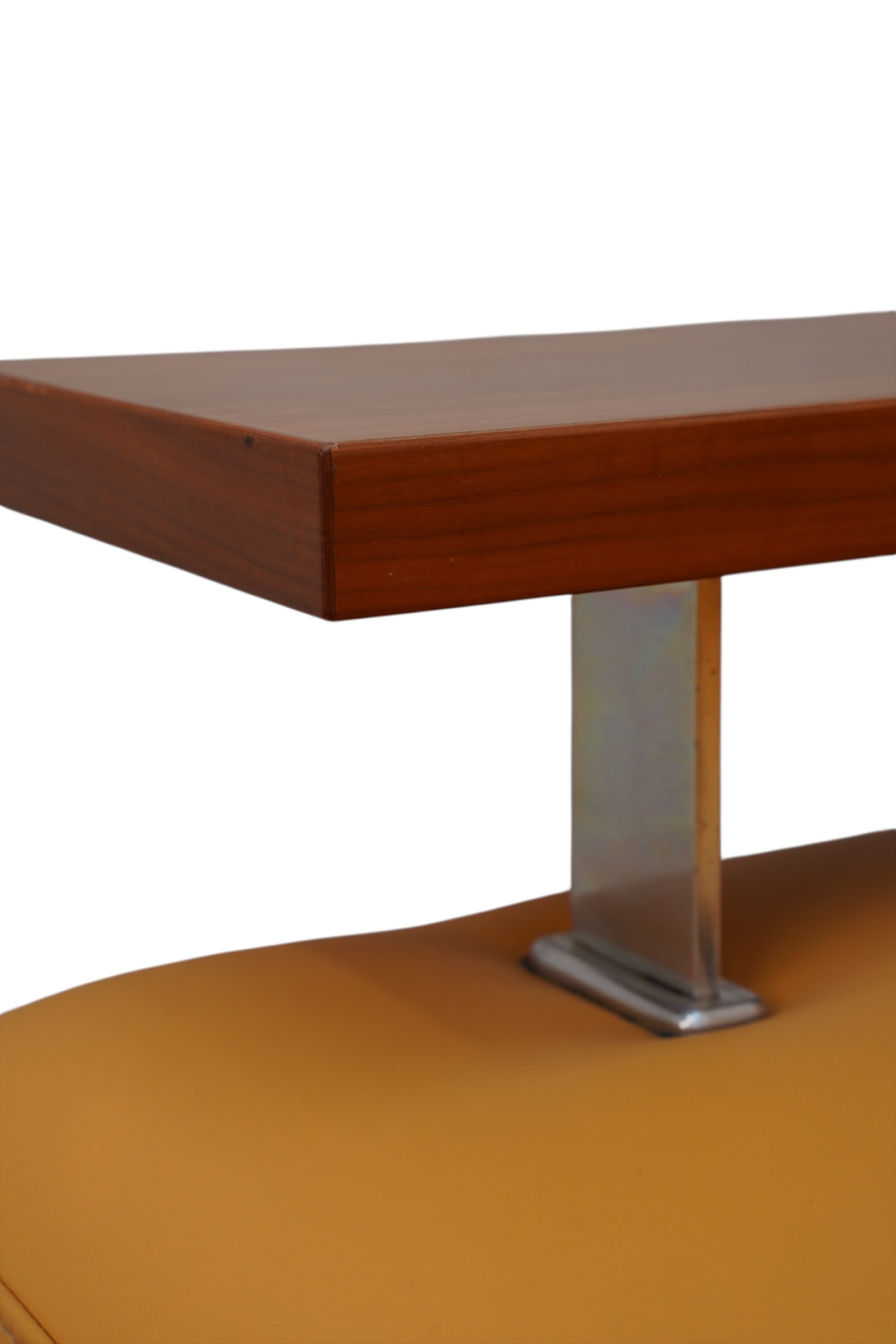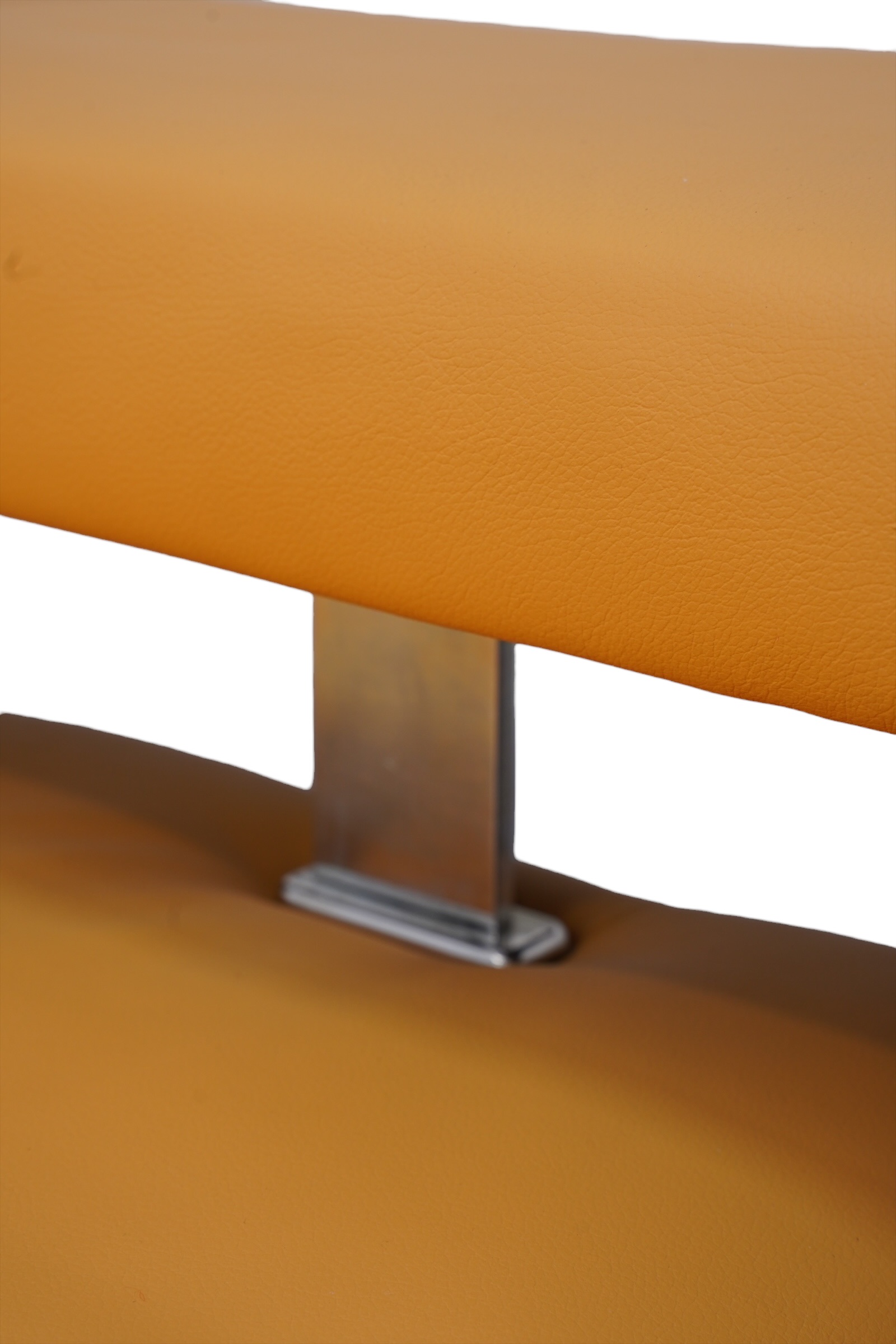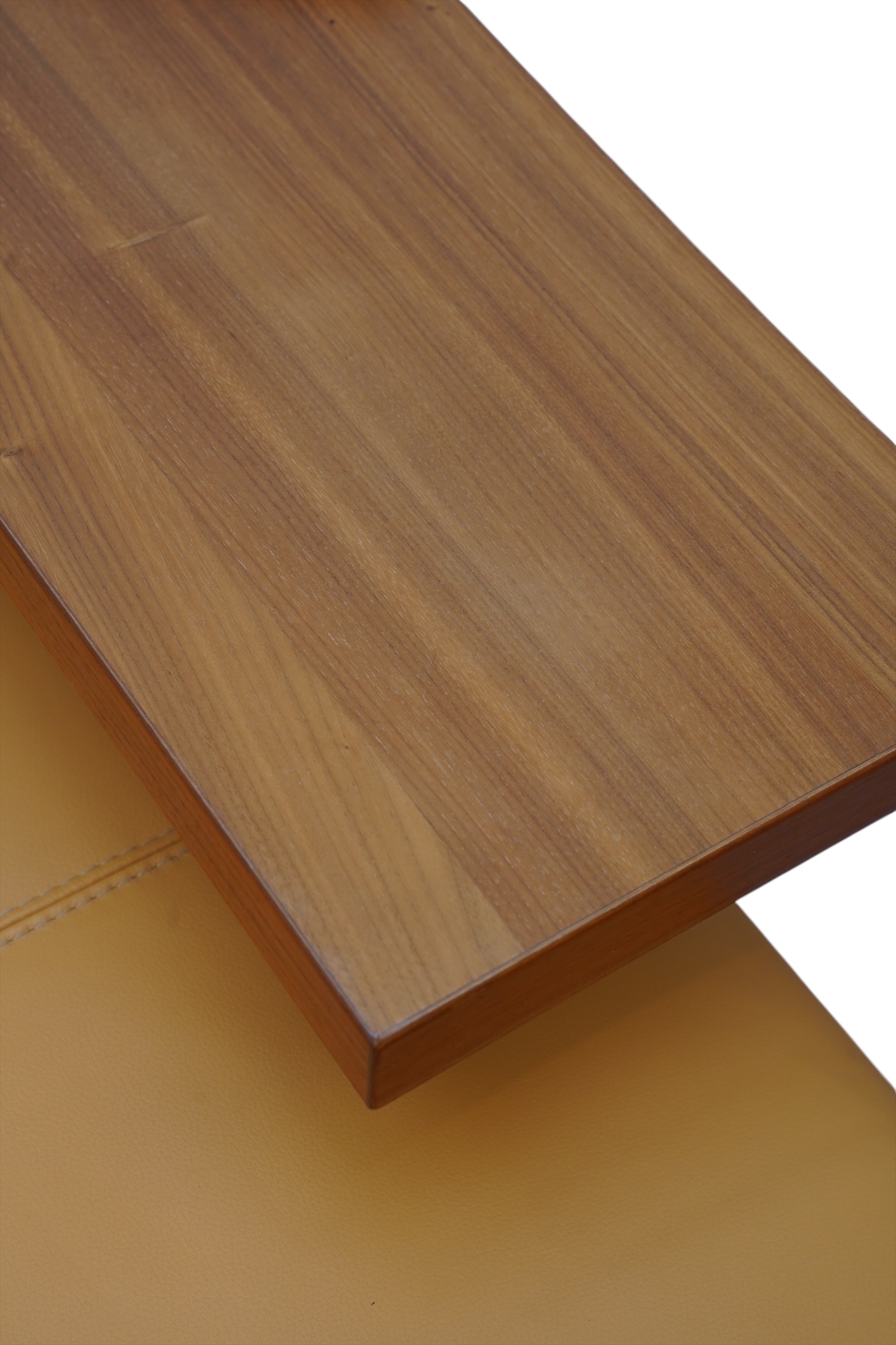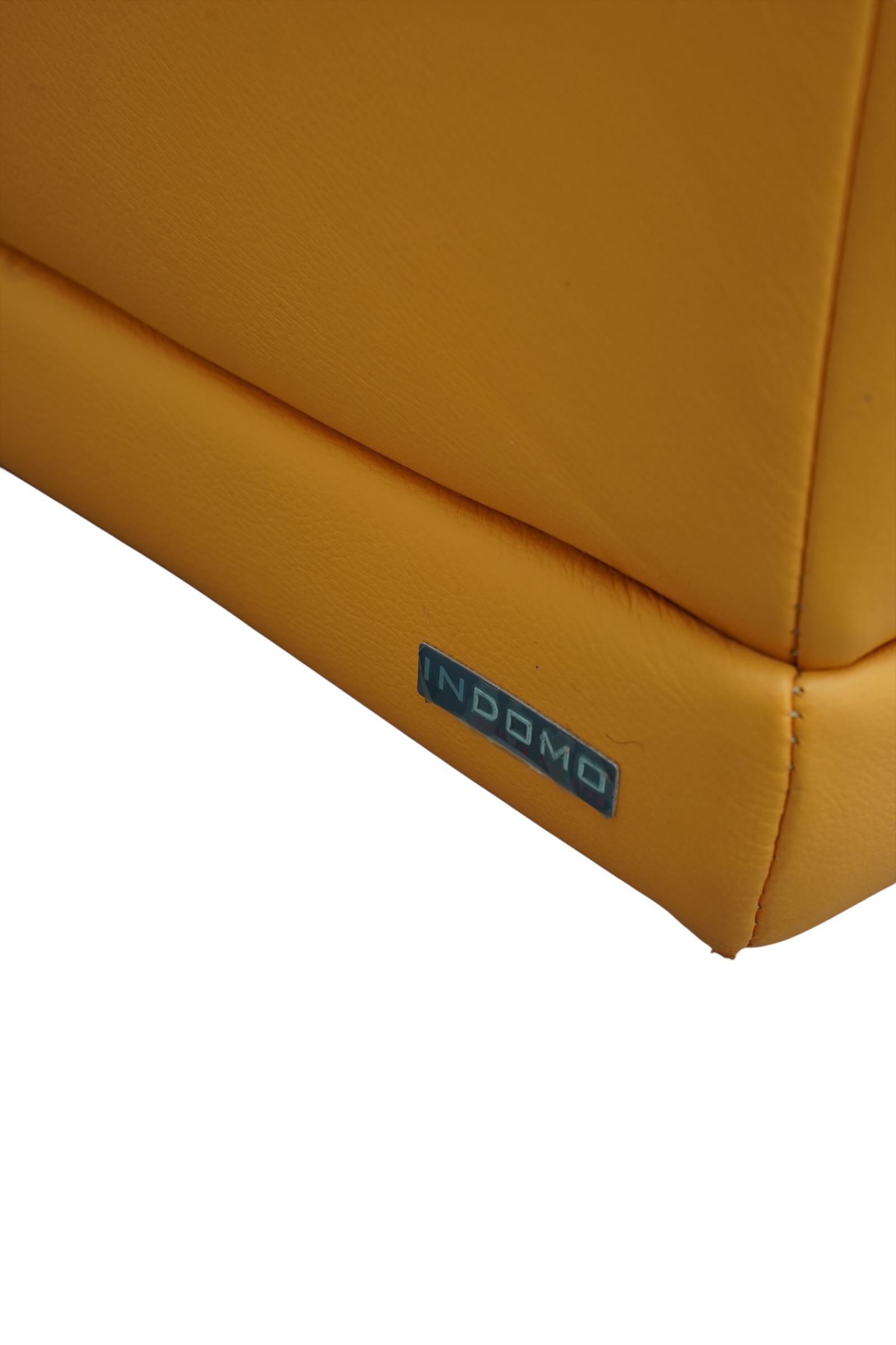 Canapé d’angle en cuir jaune mangue munie de modules d’accoudoirs latérales en bois, on peut y déposer diverses objets. Ce canapé est munie de 3 coussins généreux. L’ensemble repose sur un piétement métallique.
