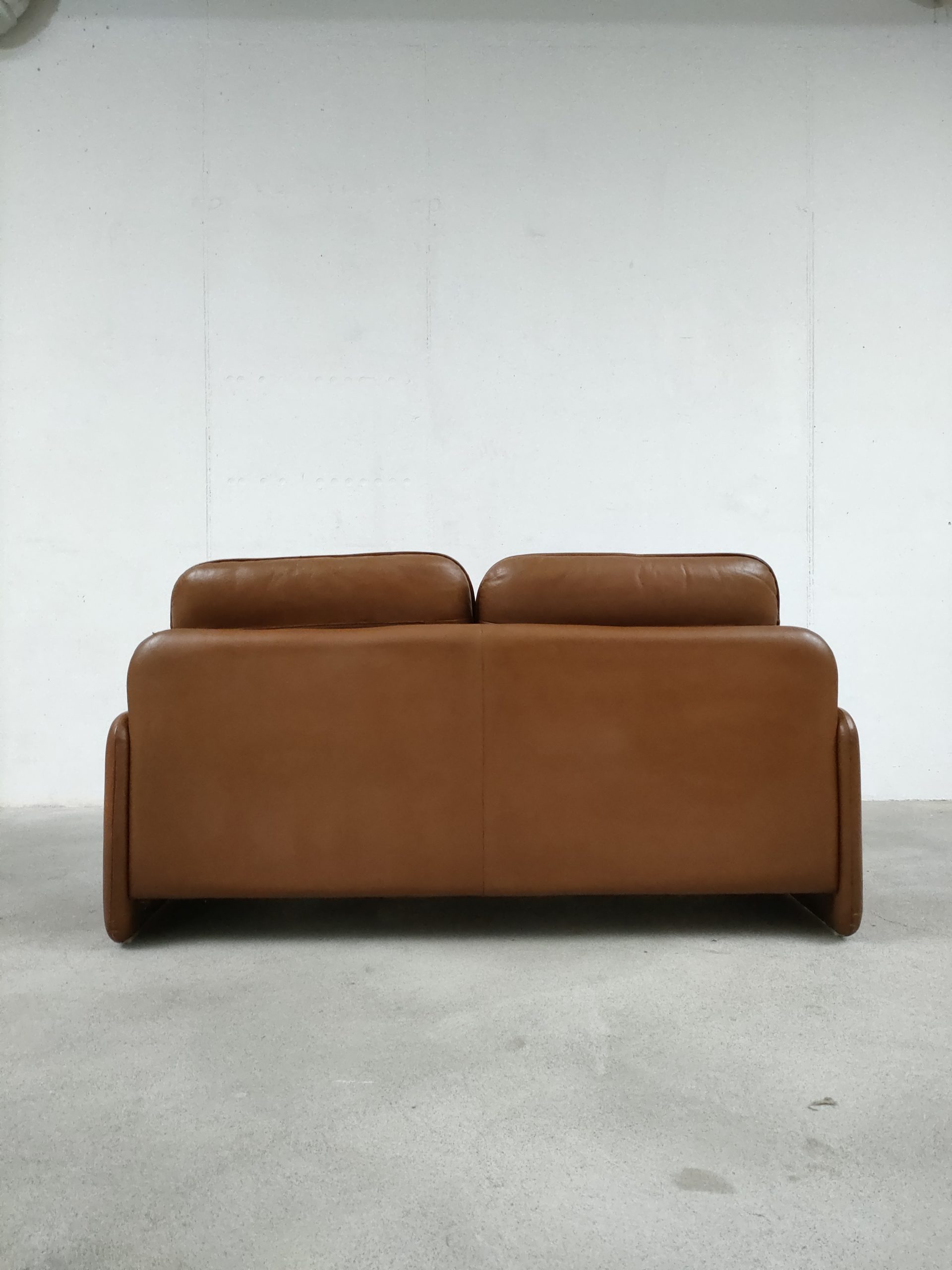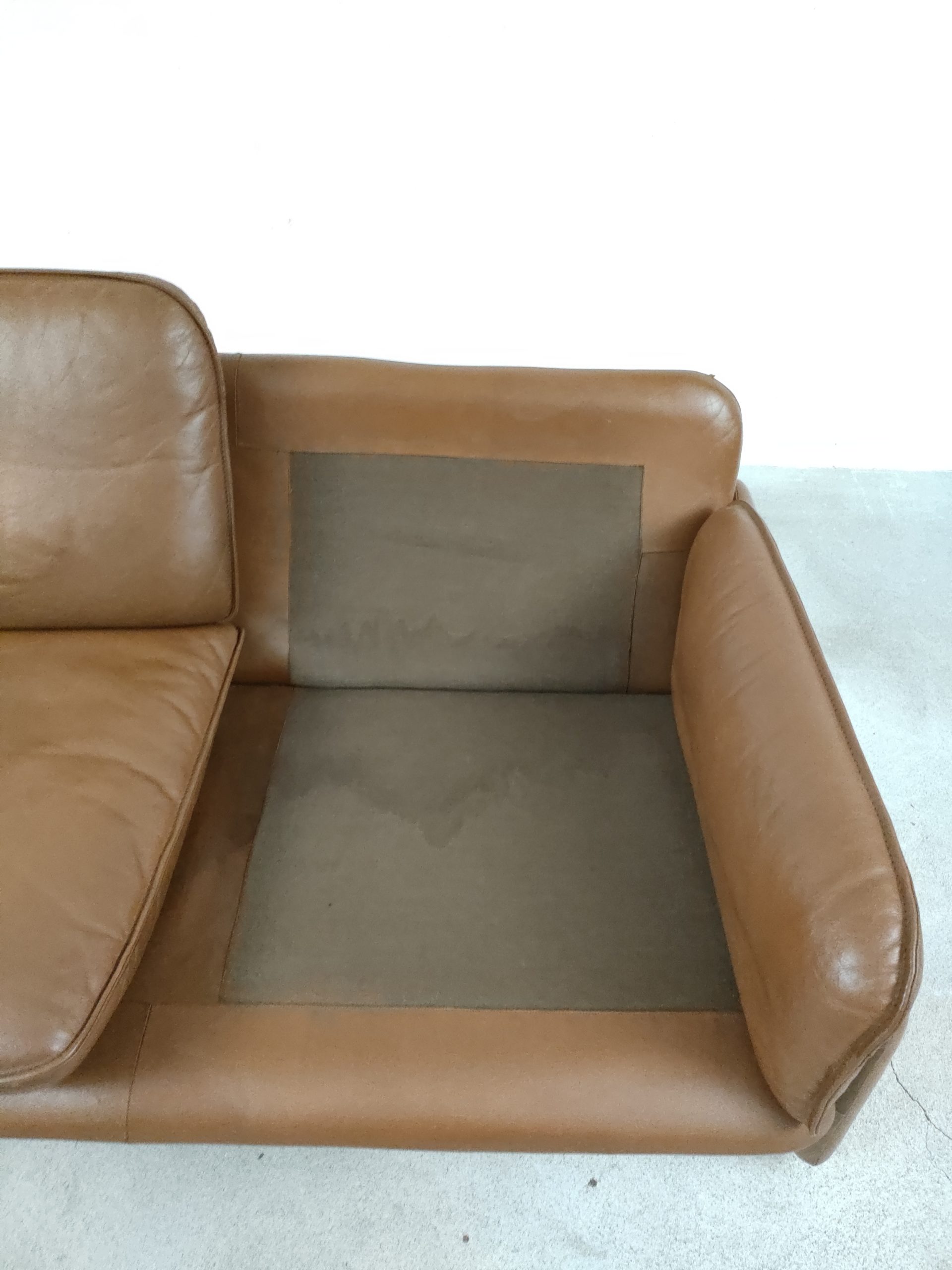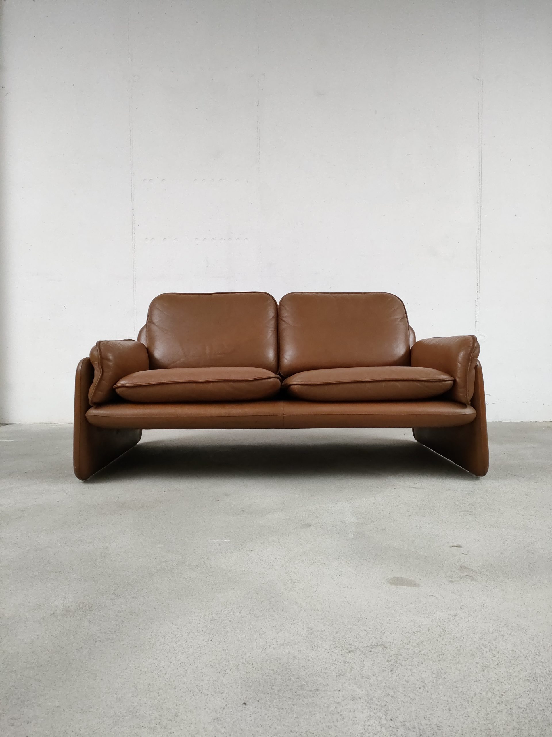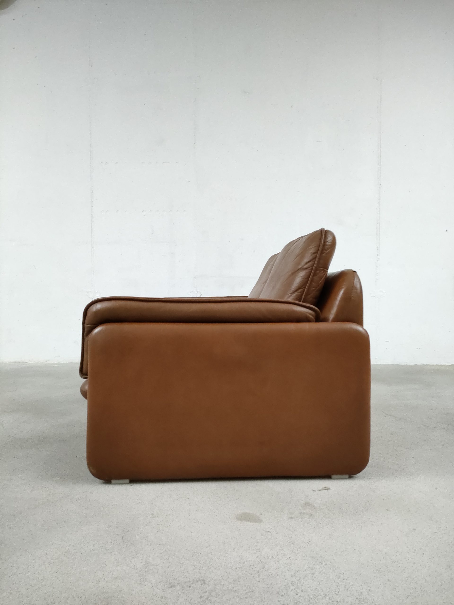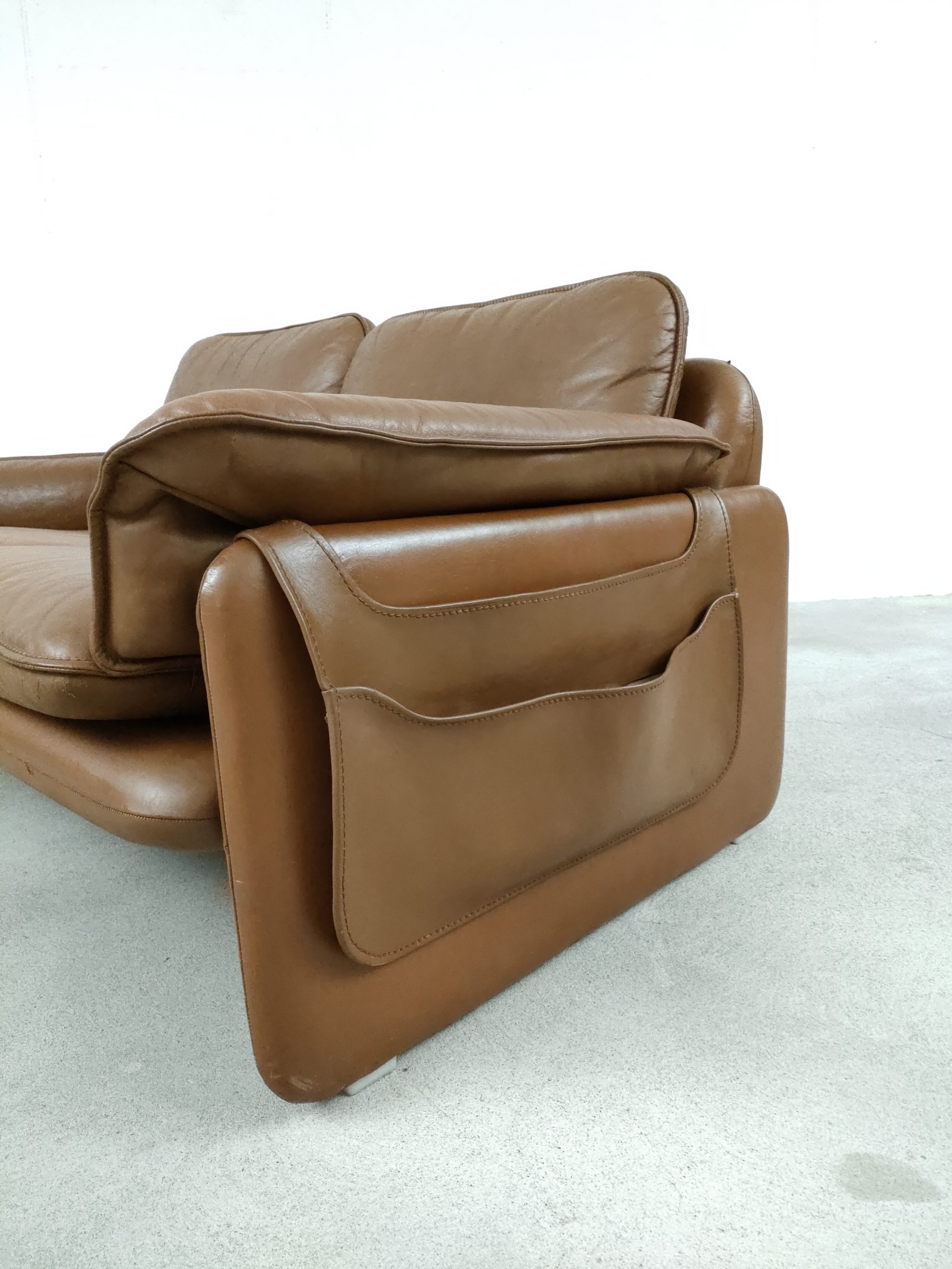 Produit venduCanapé deux places en cuir marron produit par la fabricant suisse De Sede, modèle DS-61 concu dans les années 60. Doté d’un porte-revues en cuir amovible qui se clipse sur le coté. Des traces d’usure sur le cuir sont présentes en particulier sur la partie haute d’un des dossiers (voir photo). Des traces d’eau sont présentes sur le tissu sous les dossiers et assises. La structure est stable et solide et la mousse à l’intérieur toujours en bon état. Le canapé est parfaitement fonctionnel. Hauteur de l’assise: 40 cm.