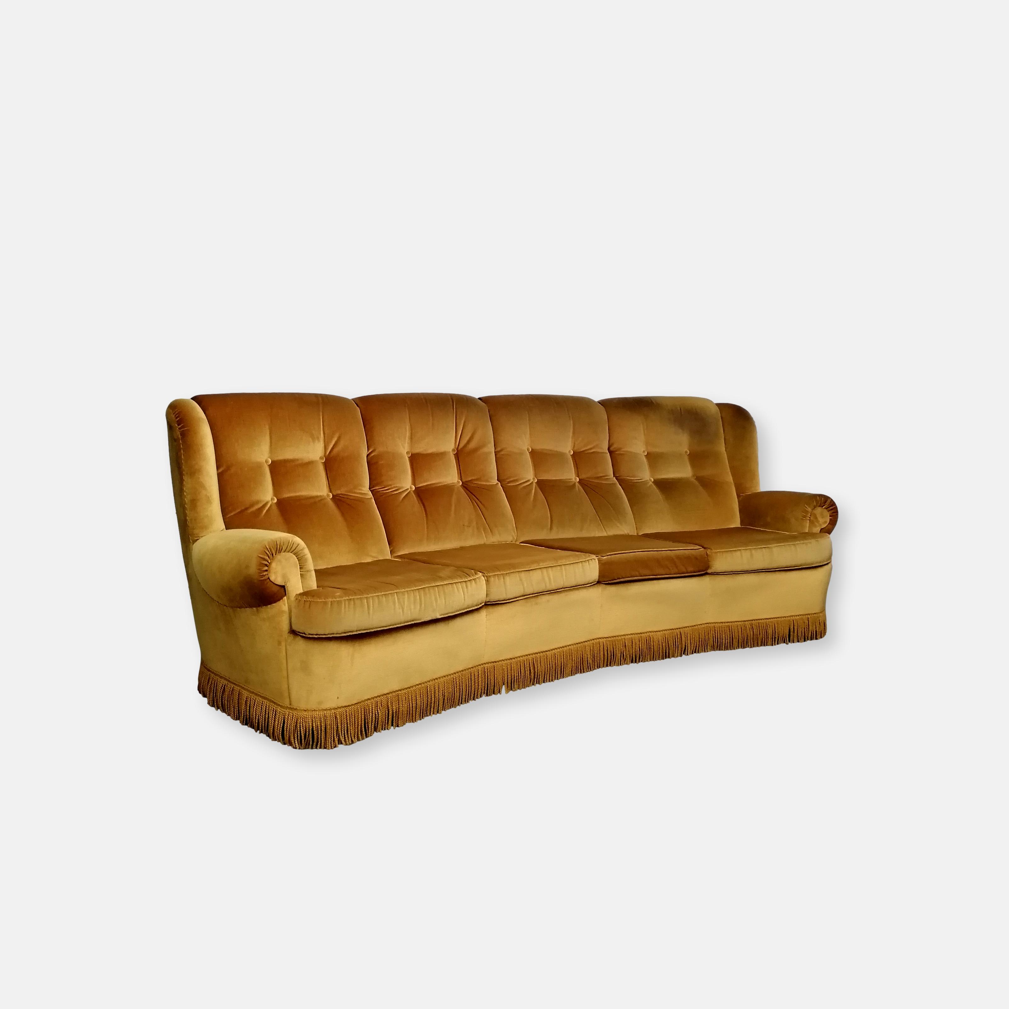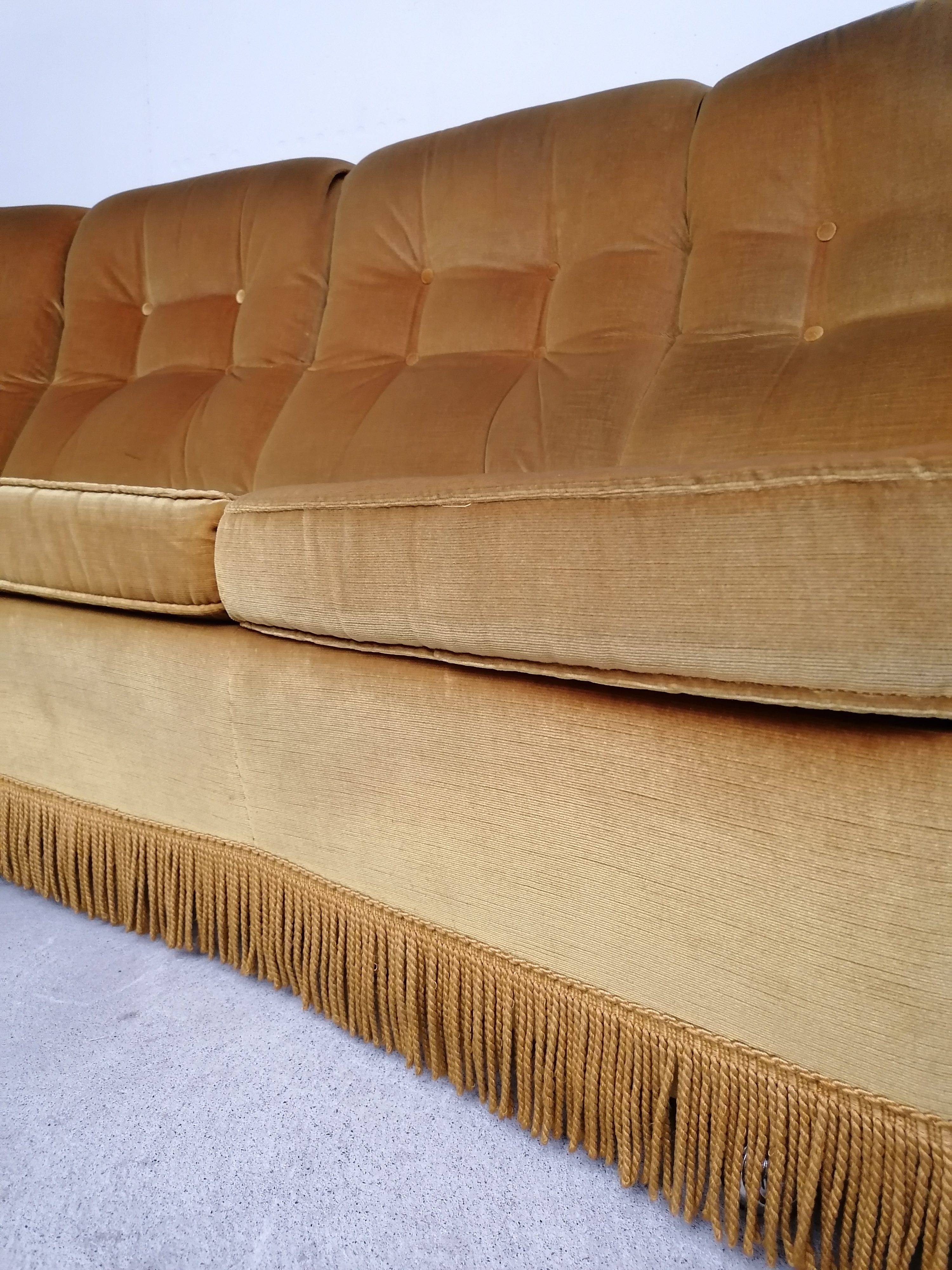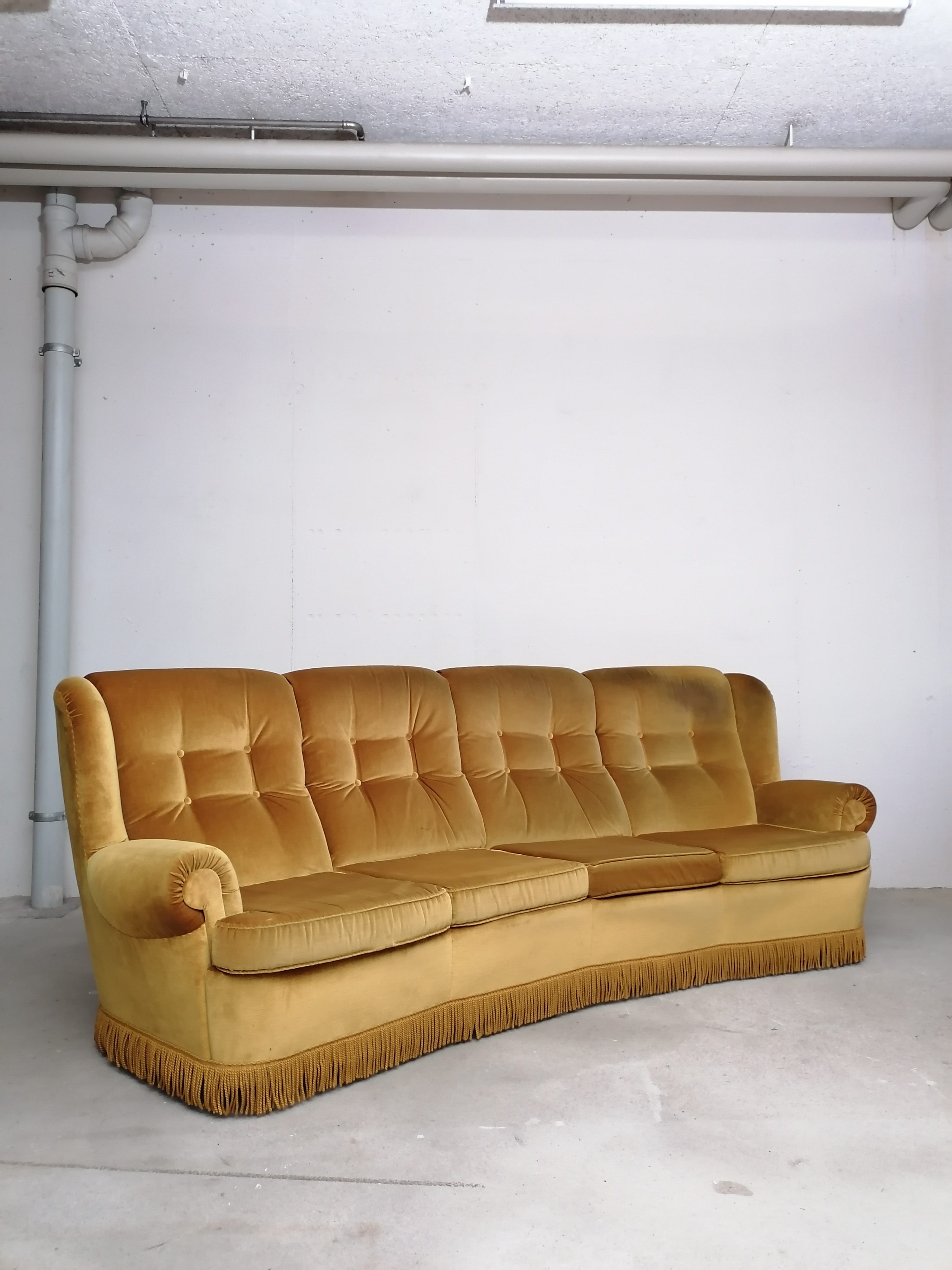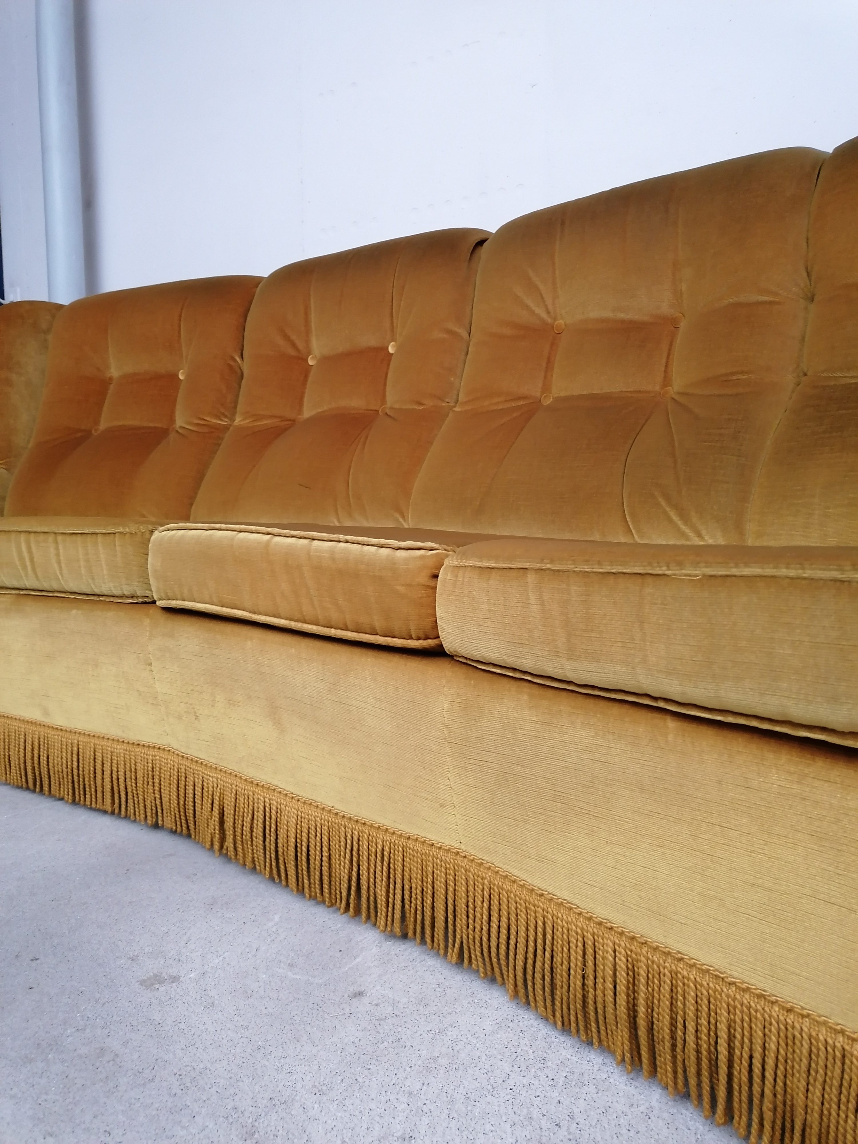 Canapé en velours vert de 4 places en forme de croissant avec franges, pieds et roulettes.