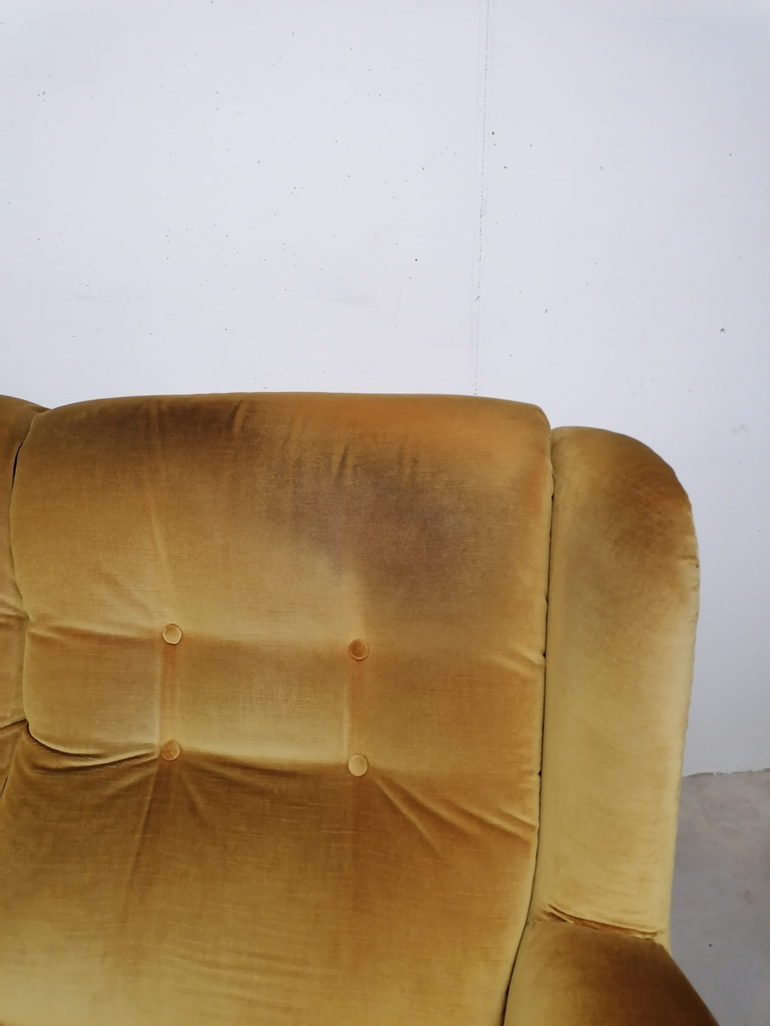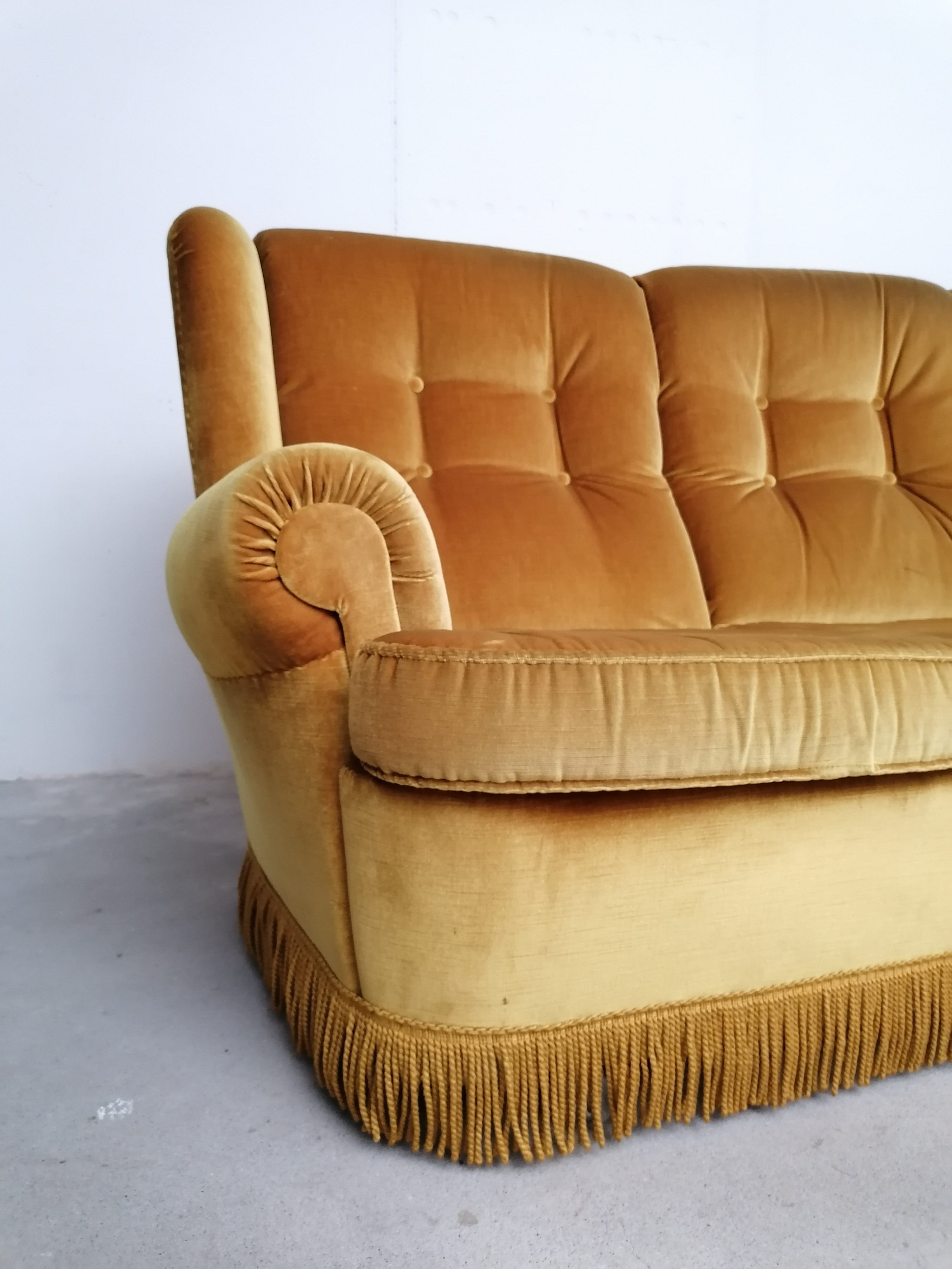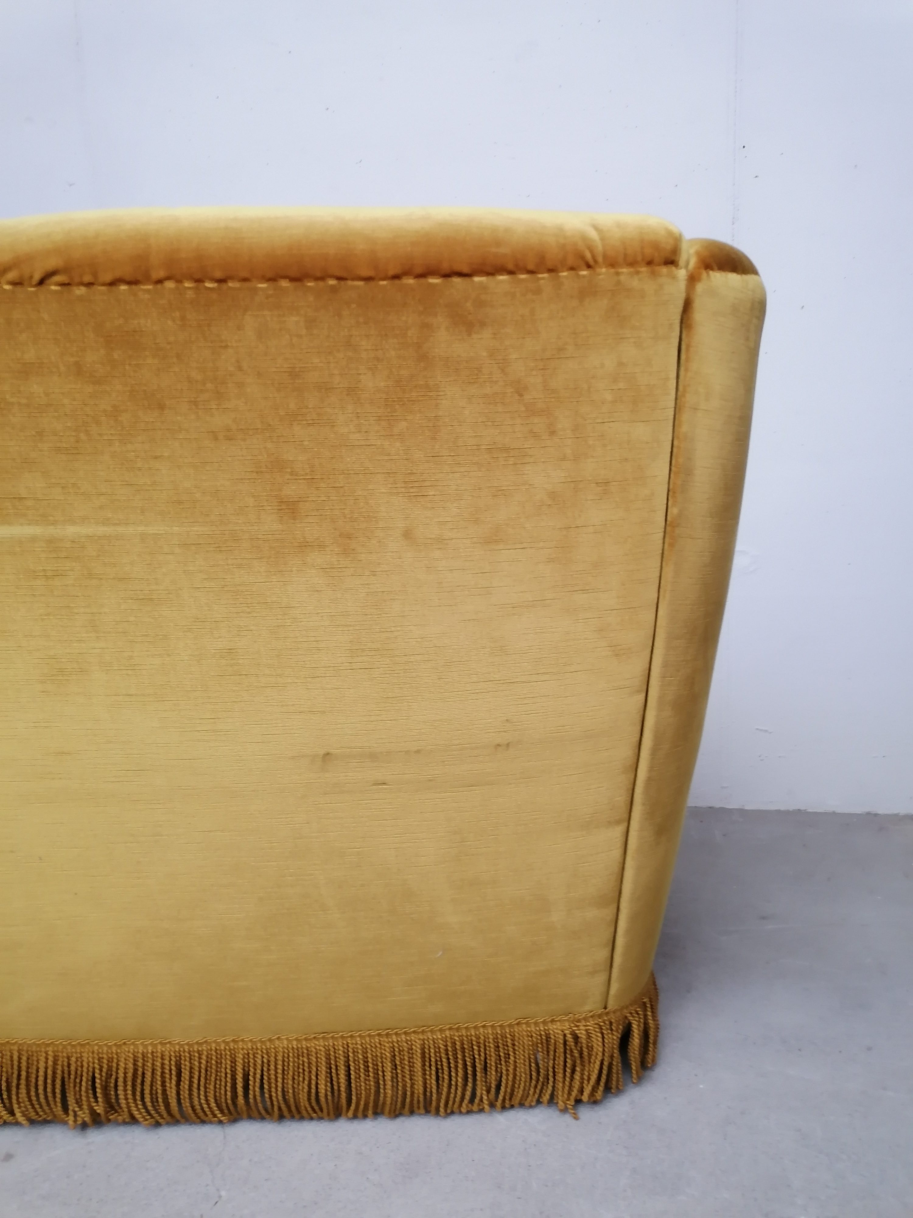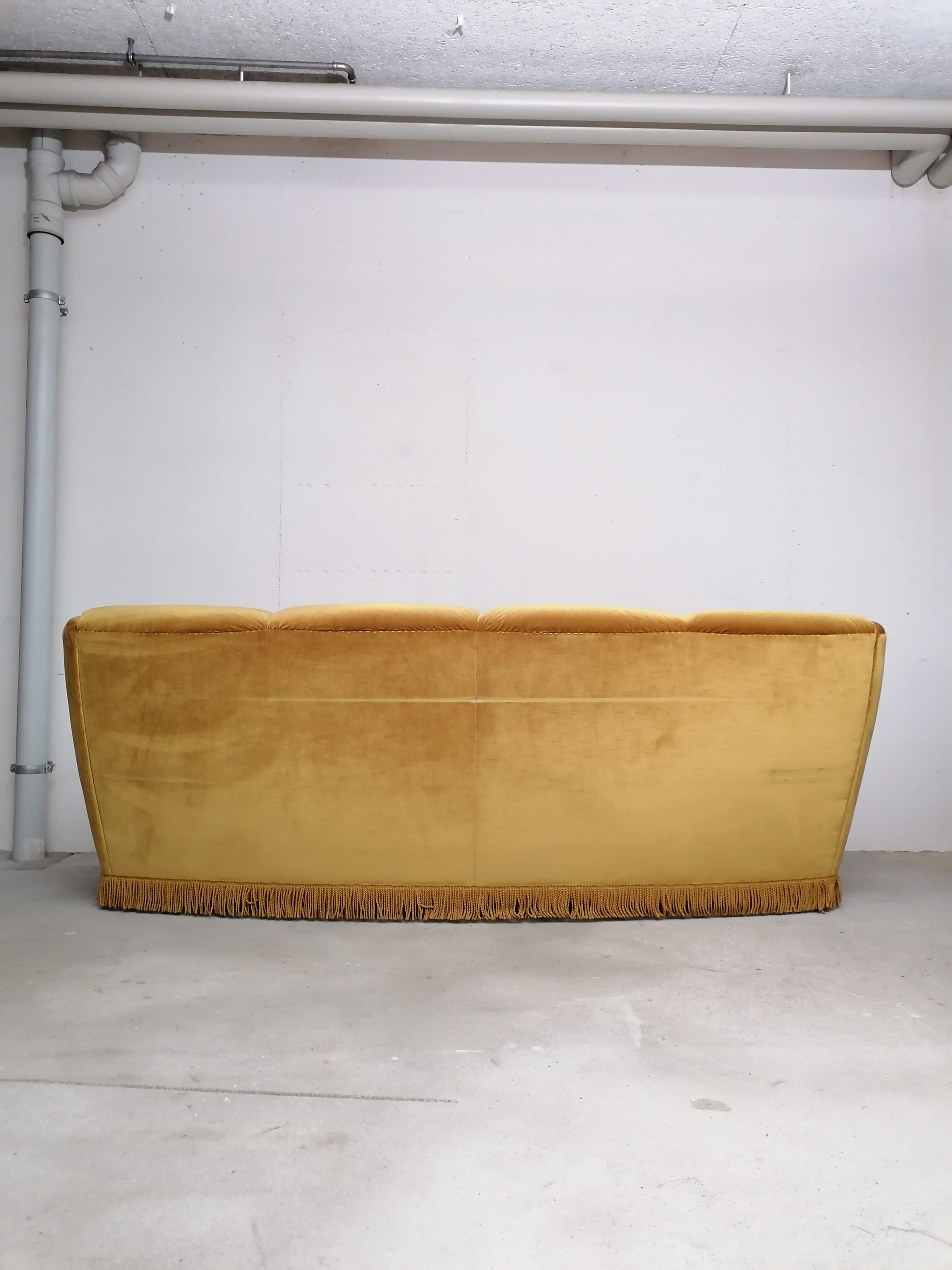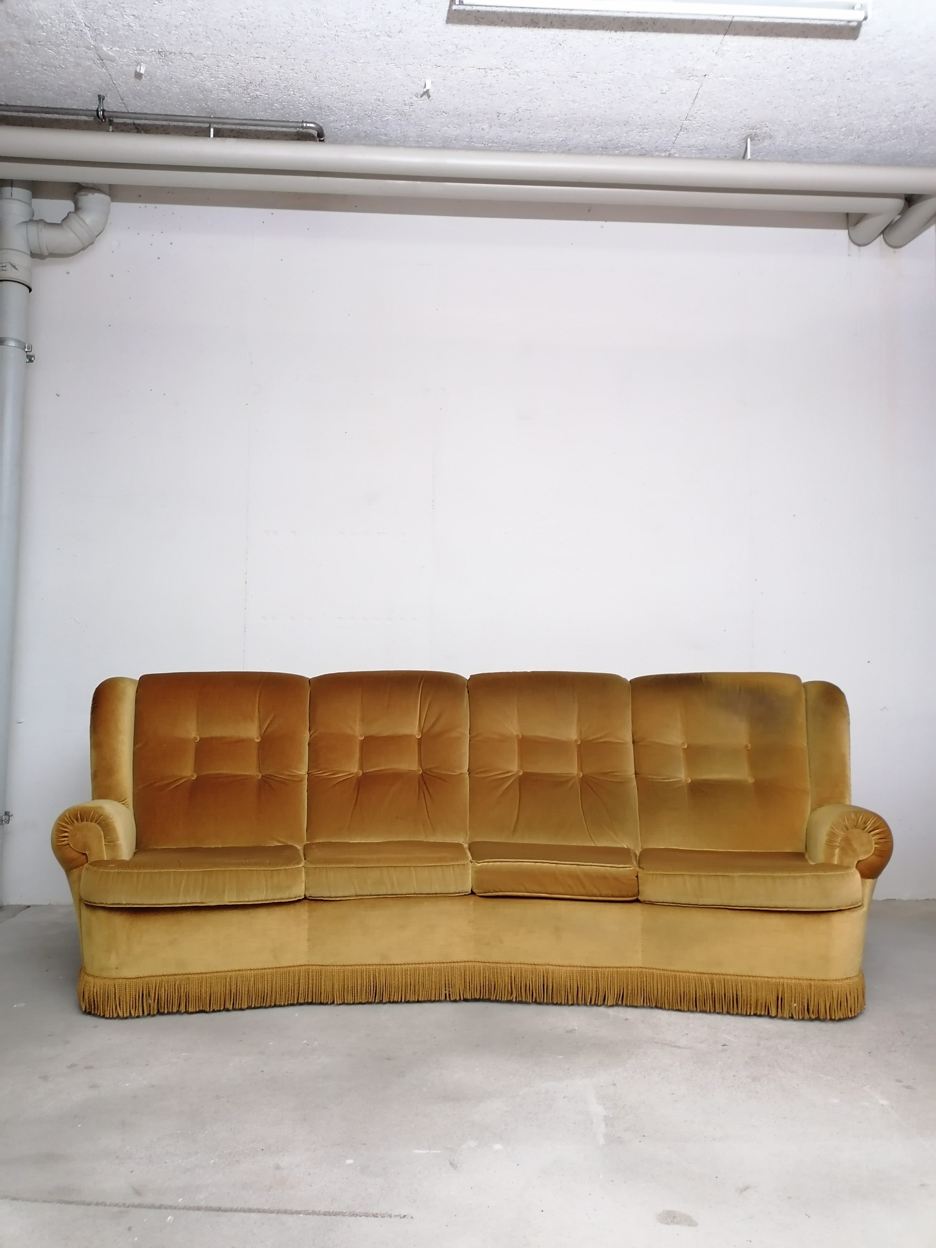 Canapé en velours vert de 4 places en forme de croissant avec franges, pieds et roulettes.