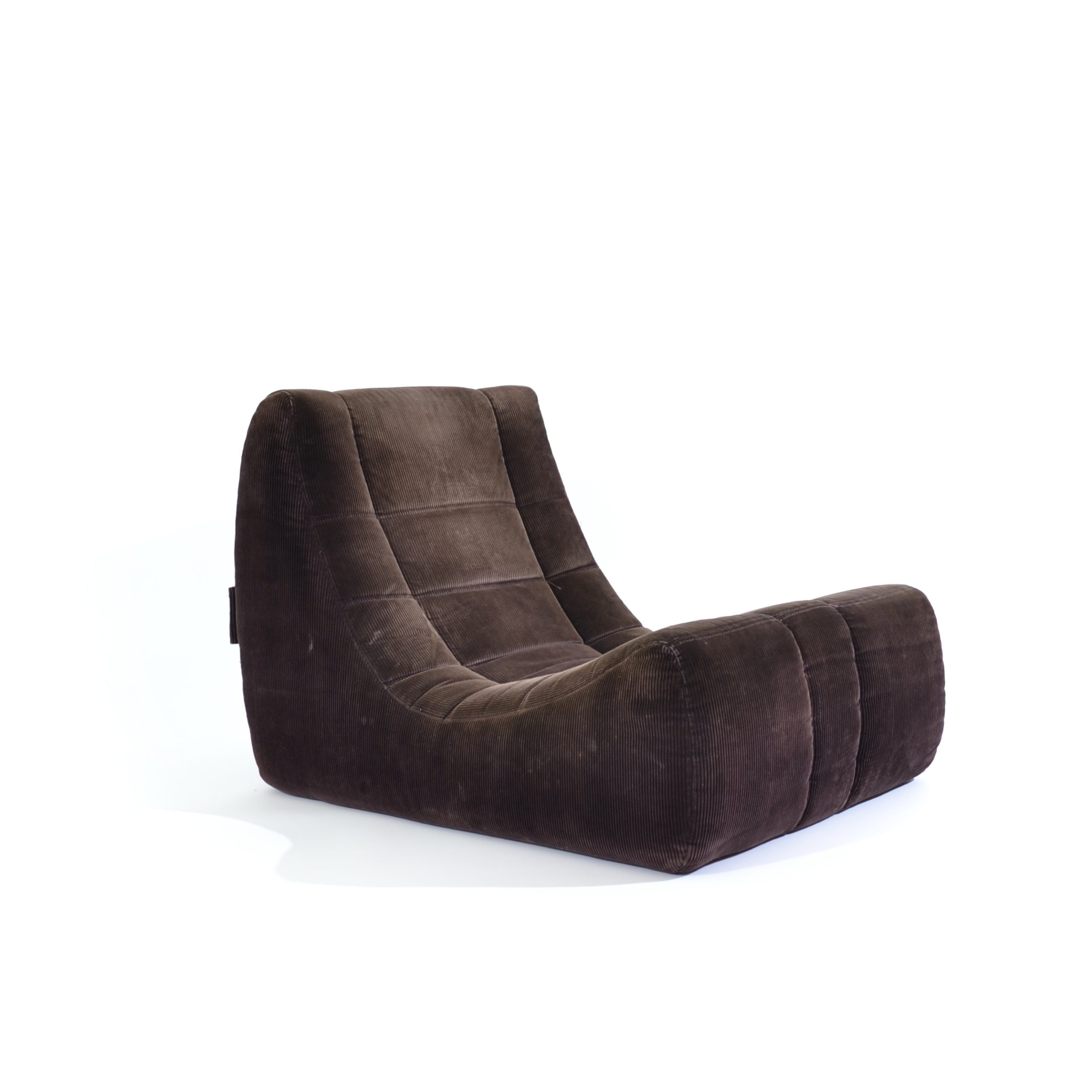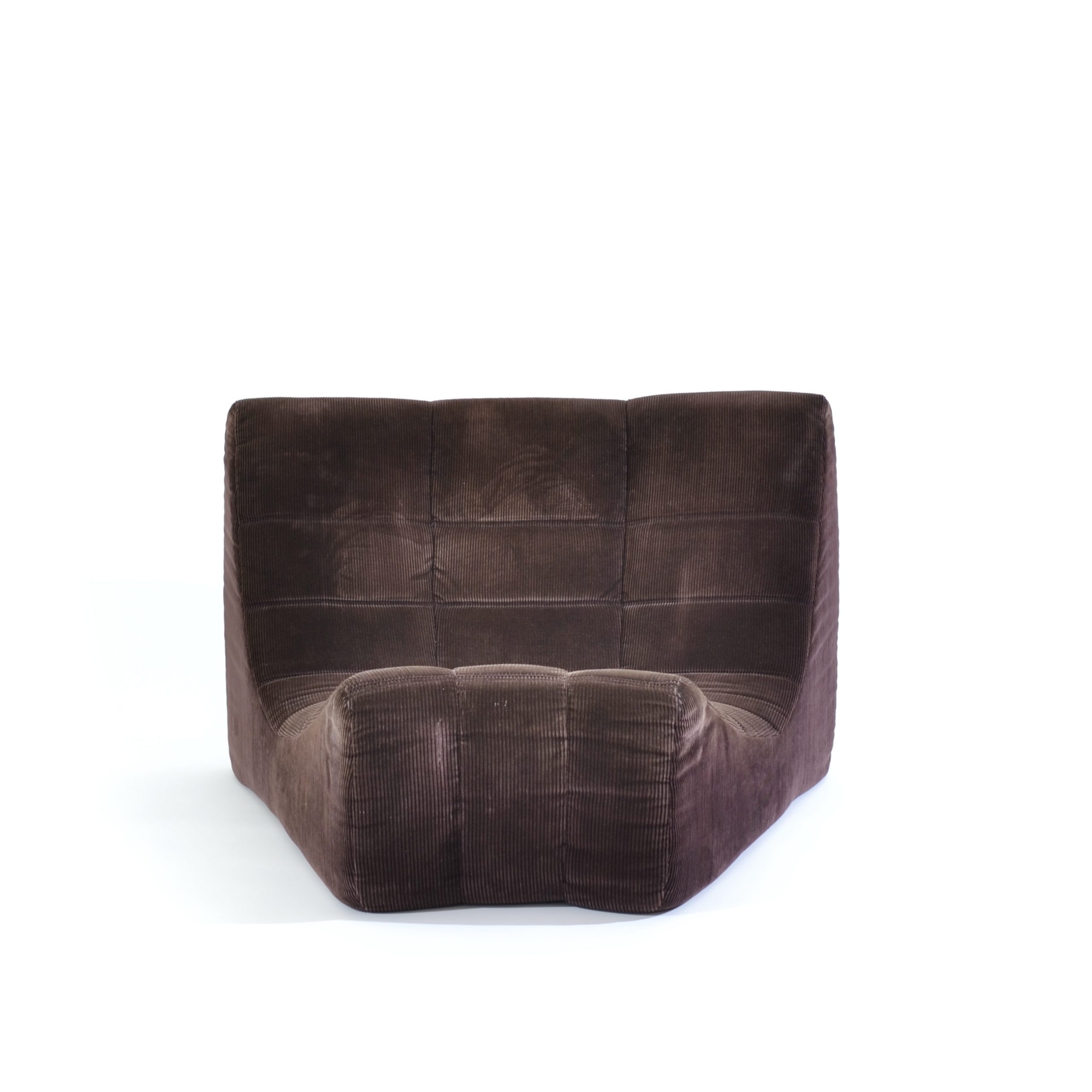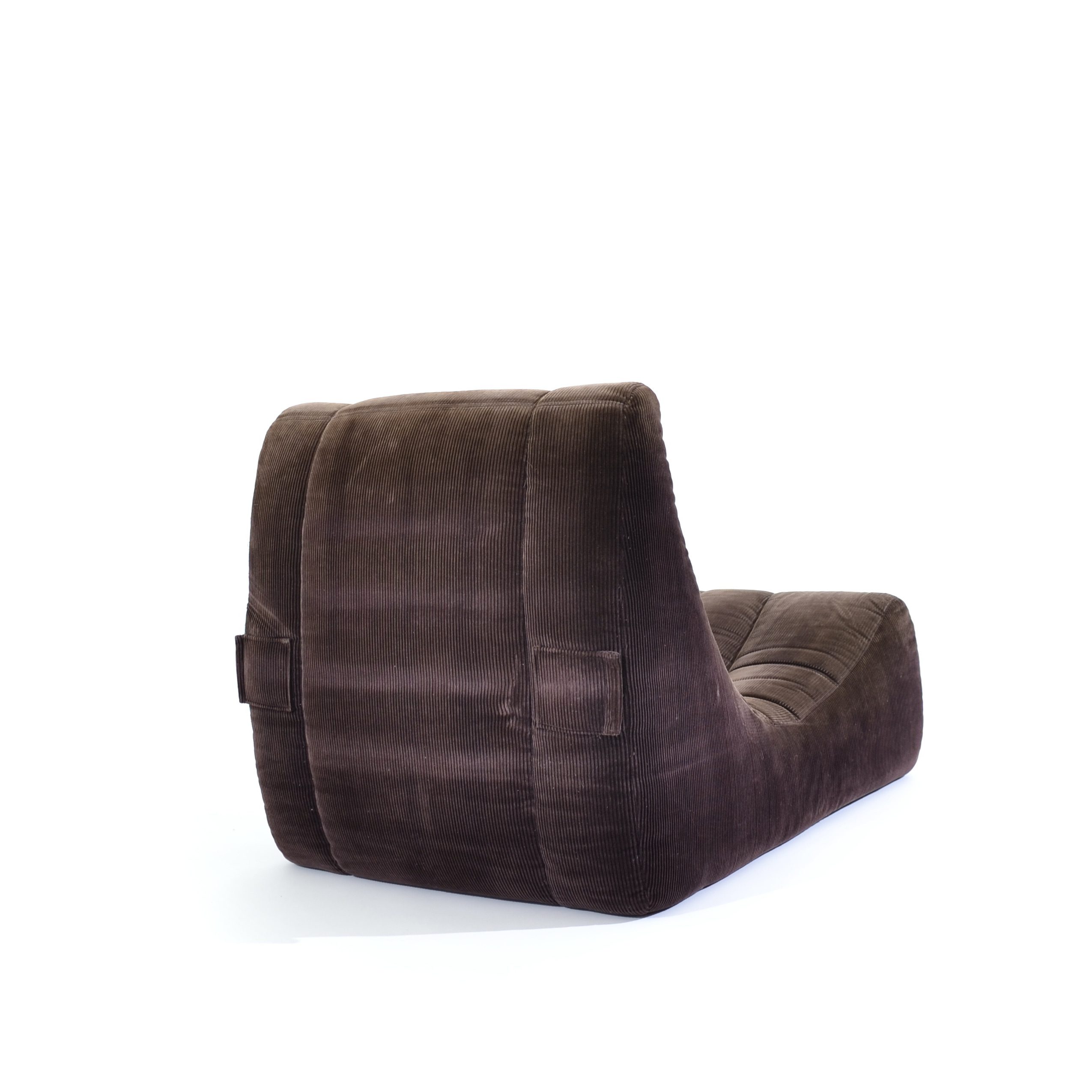 Moins médiatisé que l’iconique Togo, car encore en production chez Ligne Roset, ce modèle Gilda est en revanche plus insolite. Élaborées par Ducaroy en 1972, ces chauffeuses en velours côtelé sont reliées à l’arrière par une boucle métallique aux autres modules pour constituer un canapé au ras du sol extrêmement confortable.
