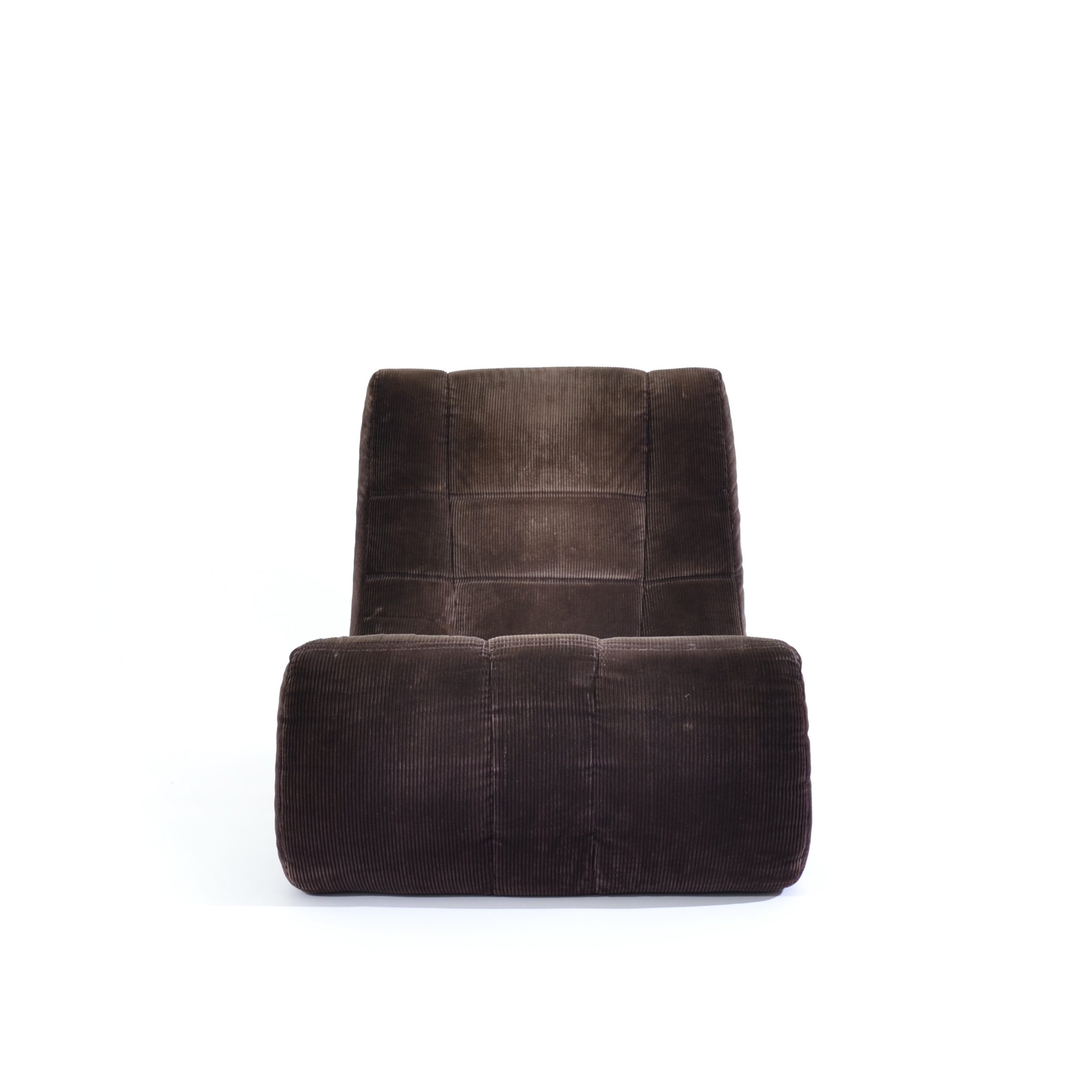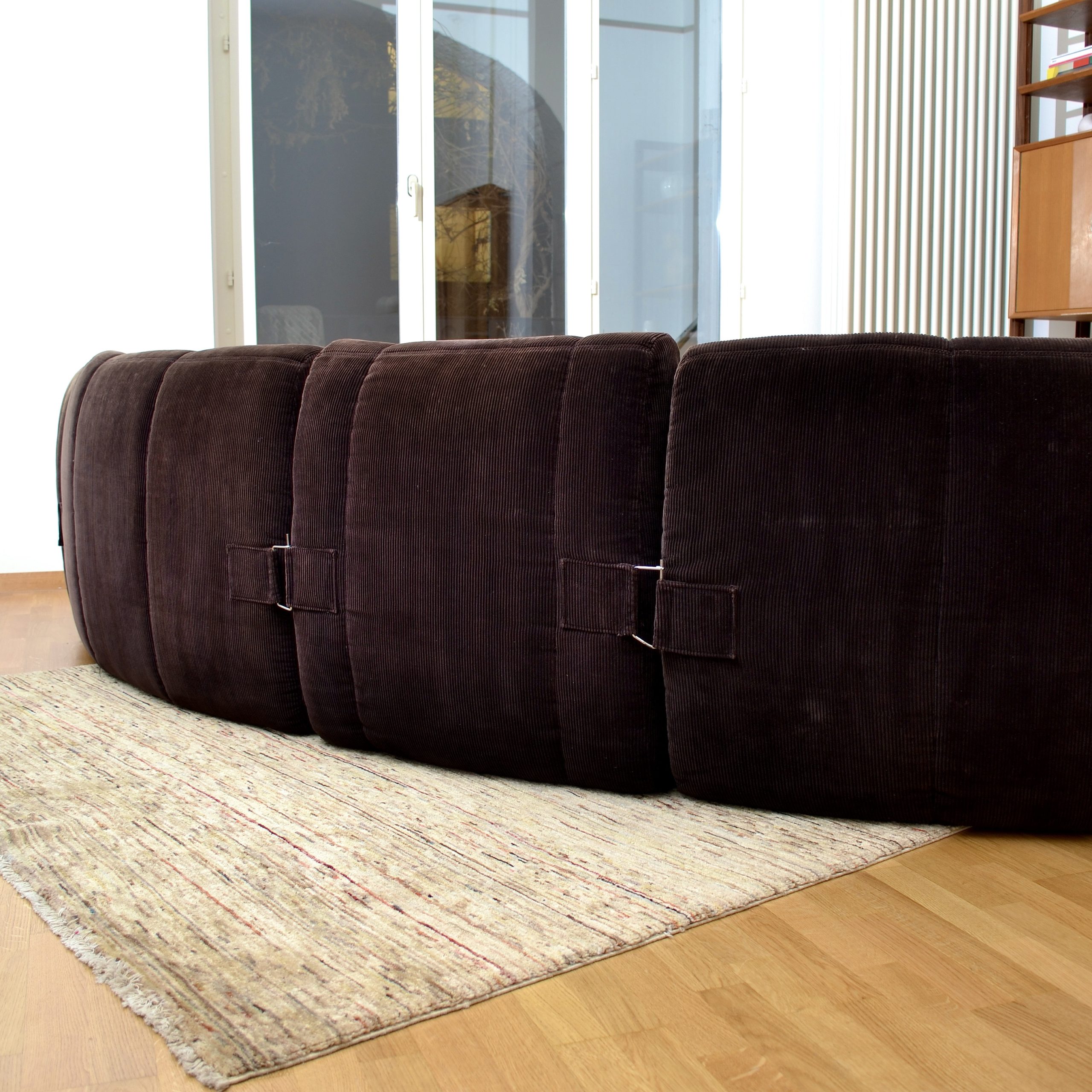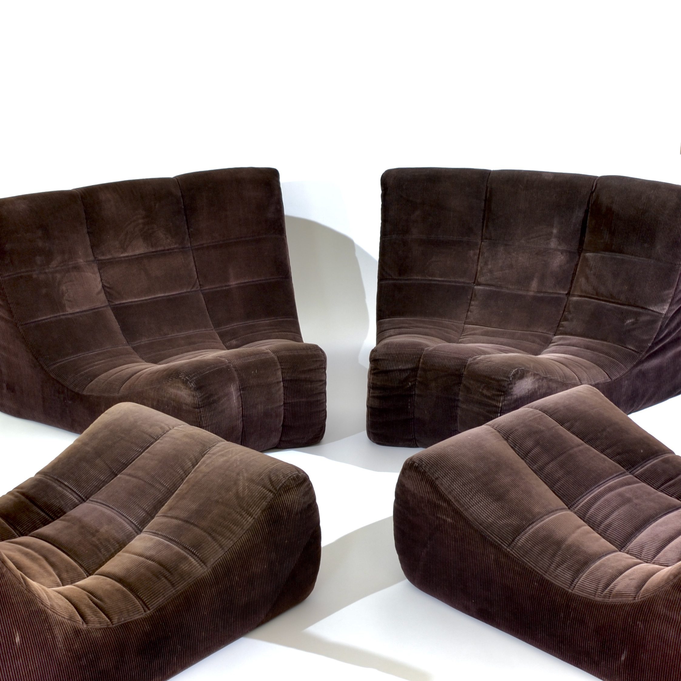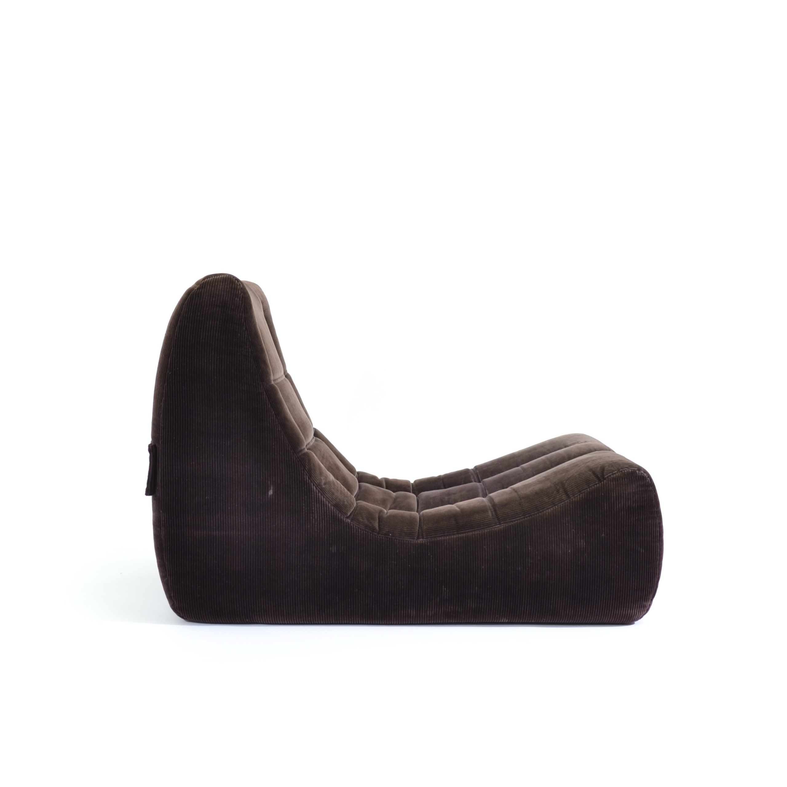 Moins médiatisé que l’iconique Togo, car encore en production chez Ligne Roset, ce modèle Gilda est en revanche plus insolite. Élaborées par Ducaroy en 1972, ces chauffeuses en velours côtelé sont reliées à l’arrière par une boucle métallique aux autres modules pour constituer un canapé au ras du sol extrêmement confortable.