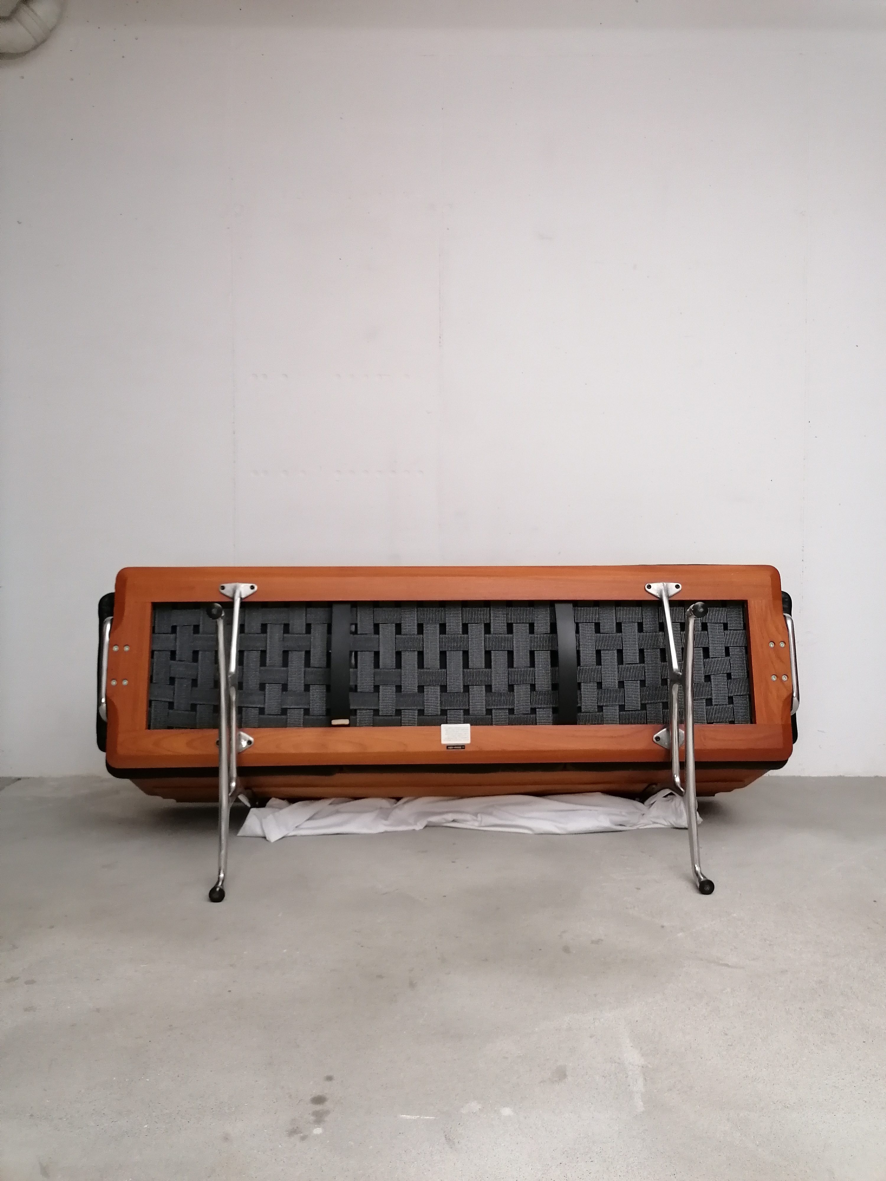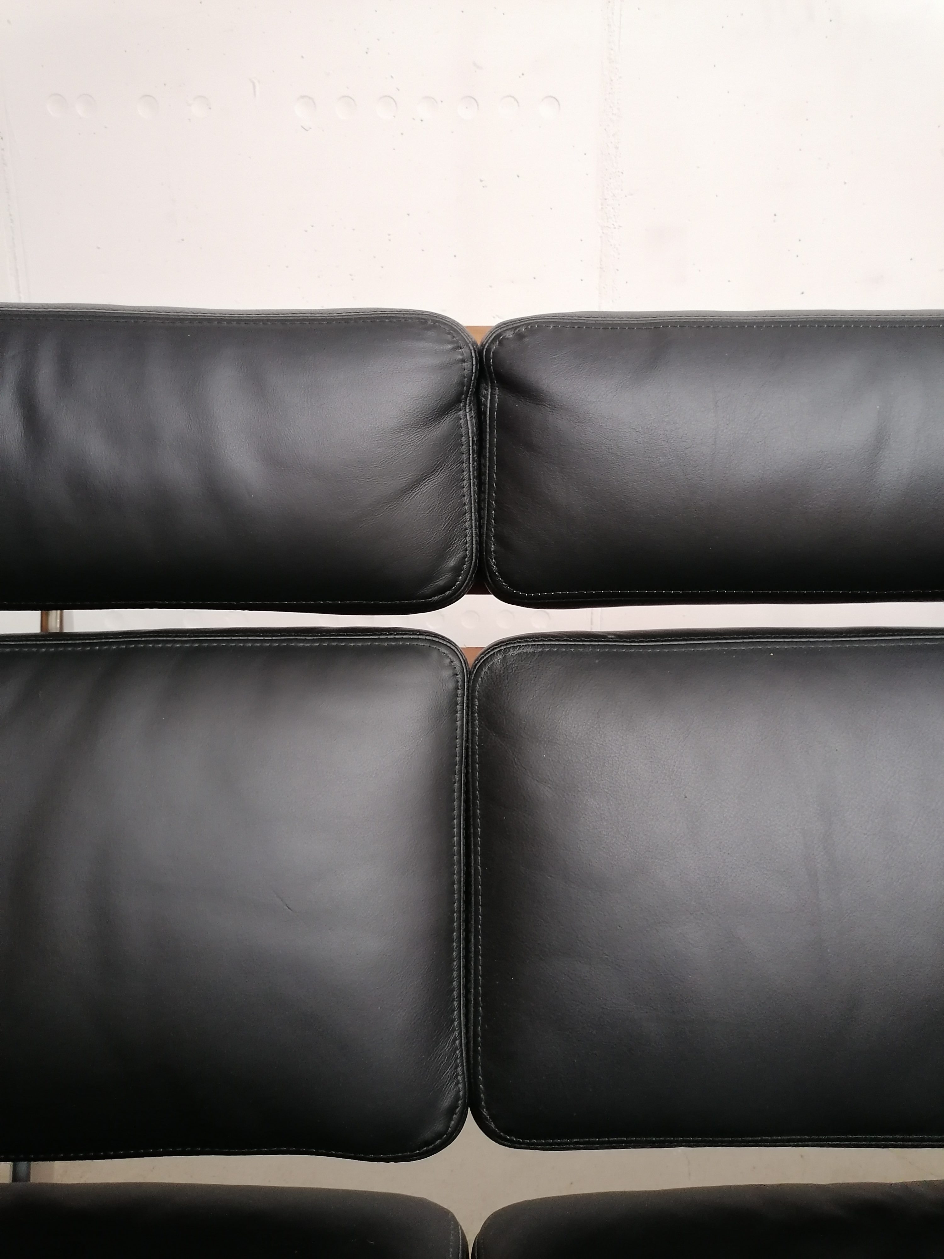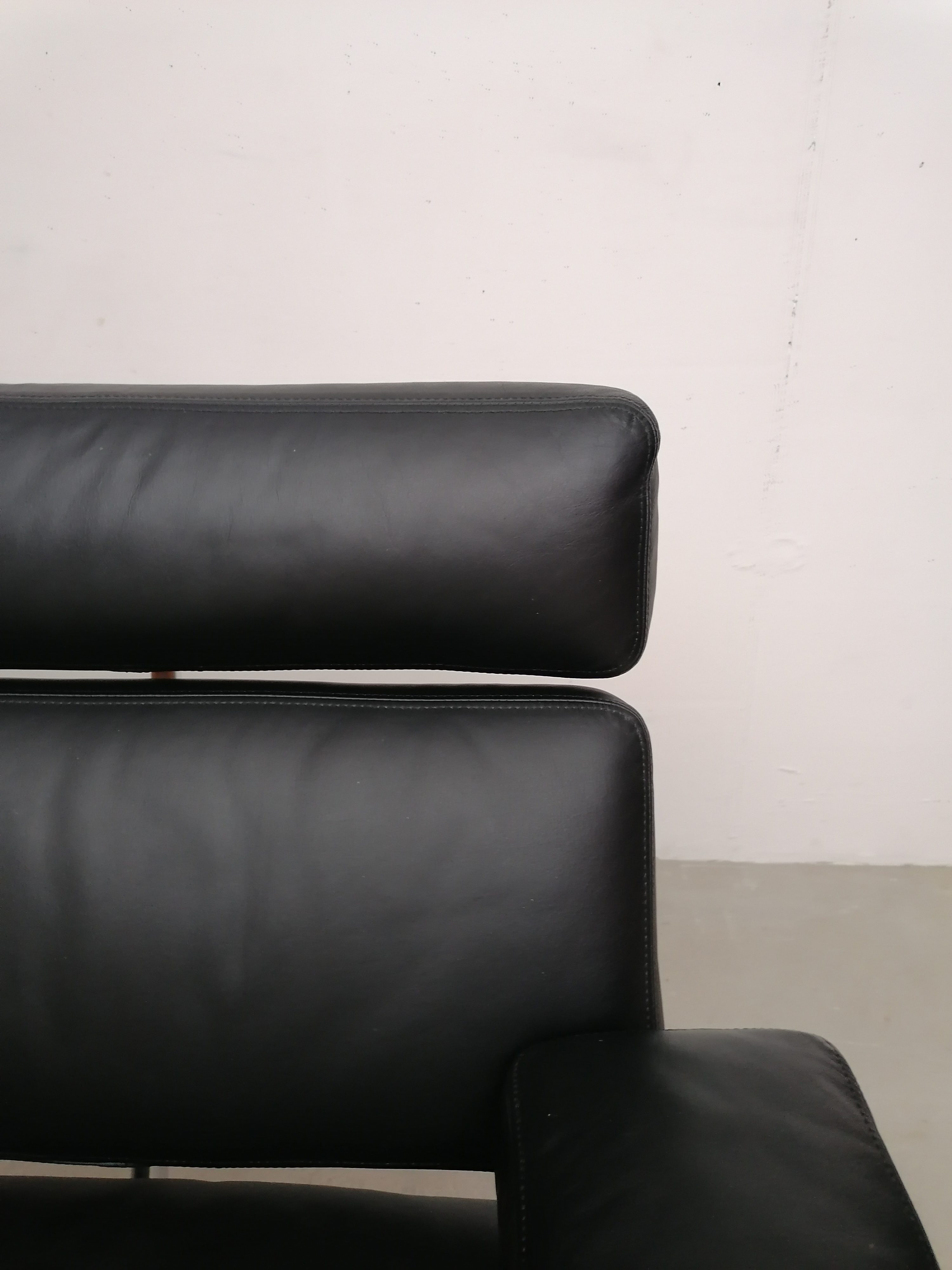 Le piétement est réalisé en aluminium poli; les coussins en cuir reposent sur une structure en bois et des sangles en nylon. Le canapé est plutôt ferme; son ergonomie le rend cependant confortable. Hauteur de l’assise: 45 cm.
