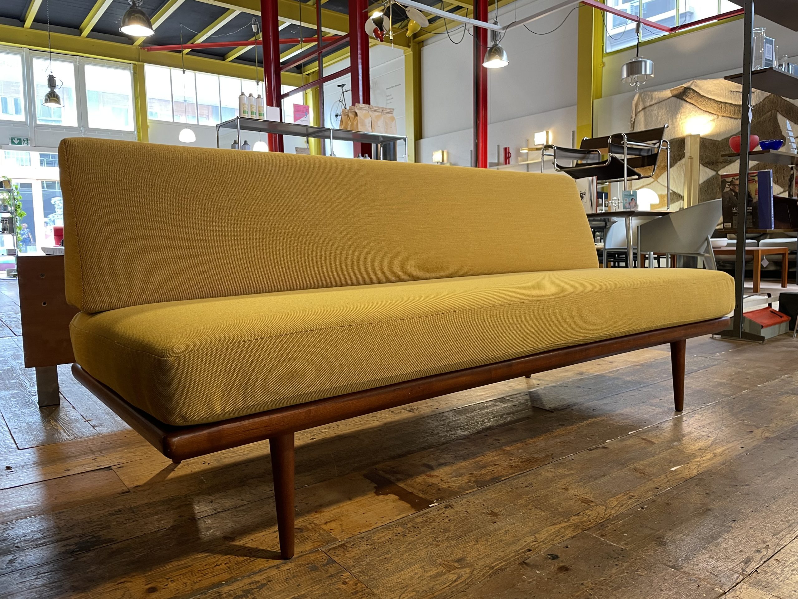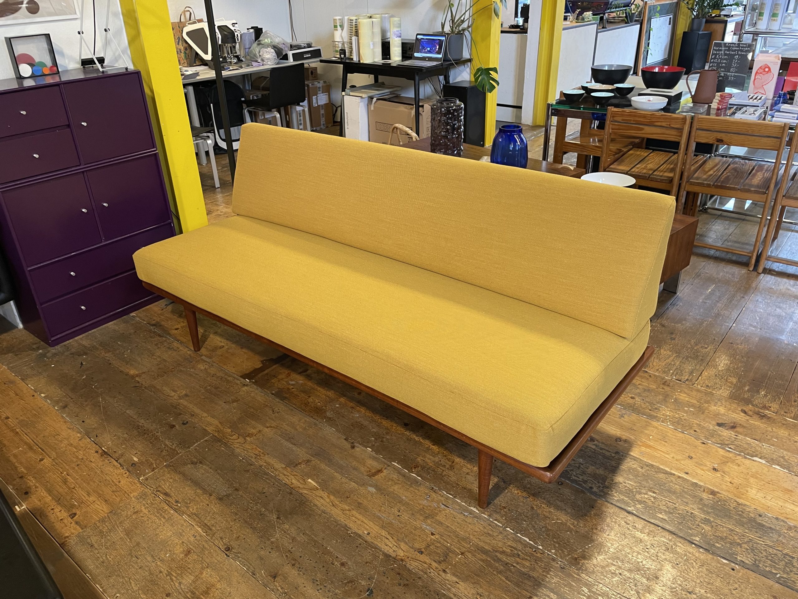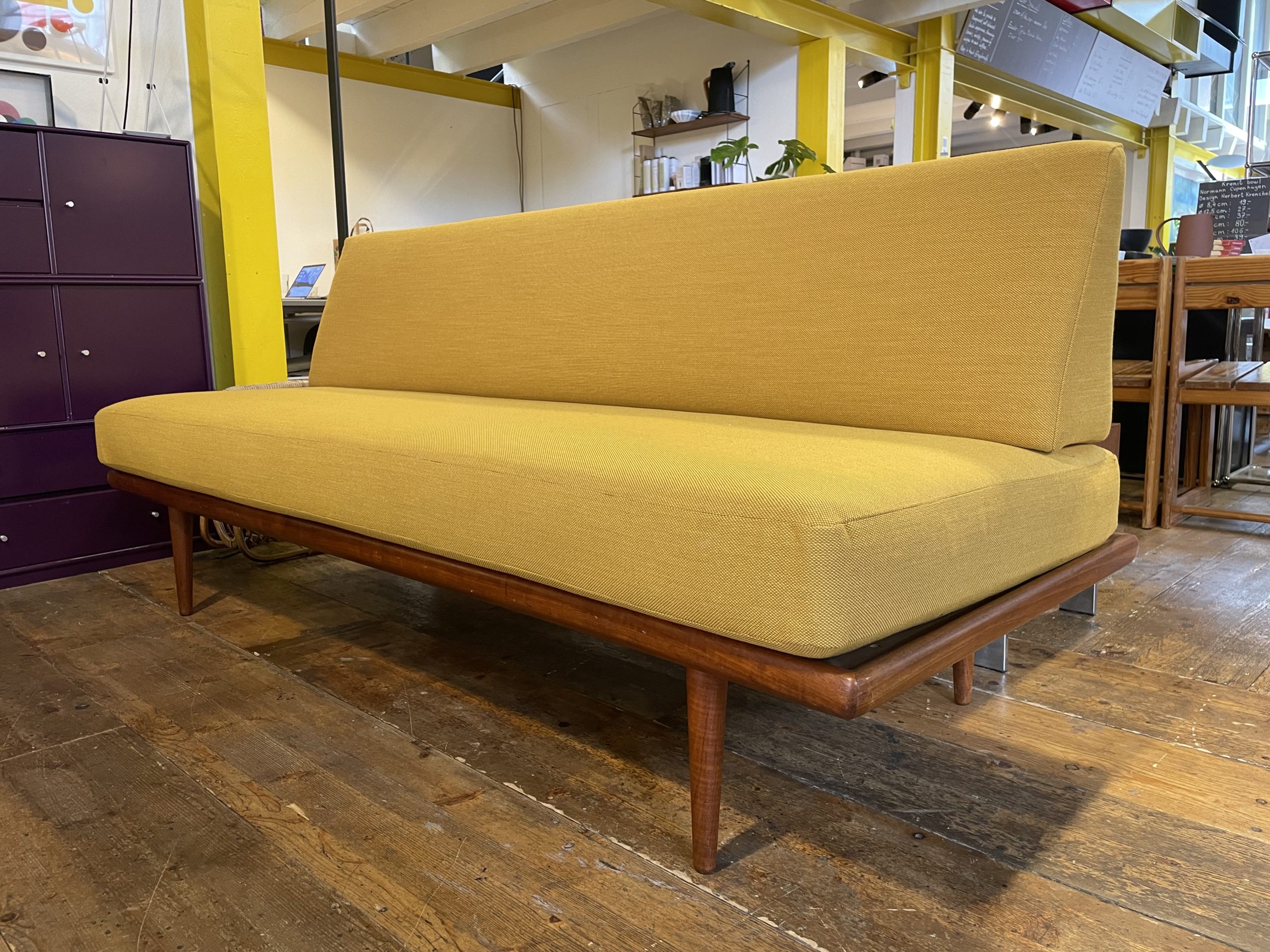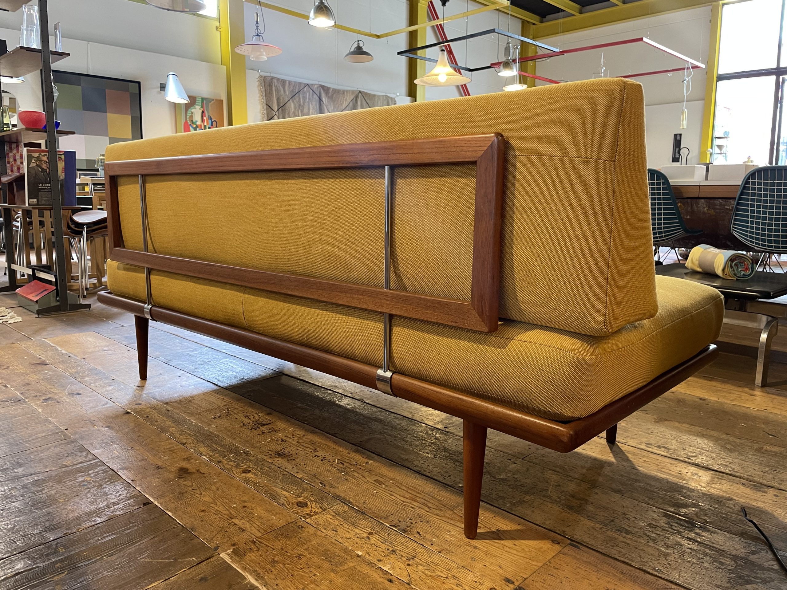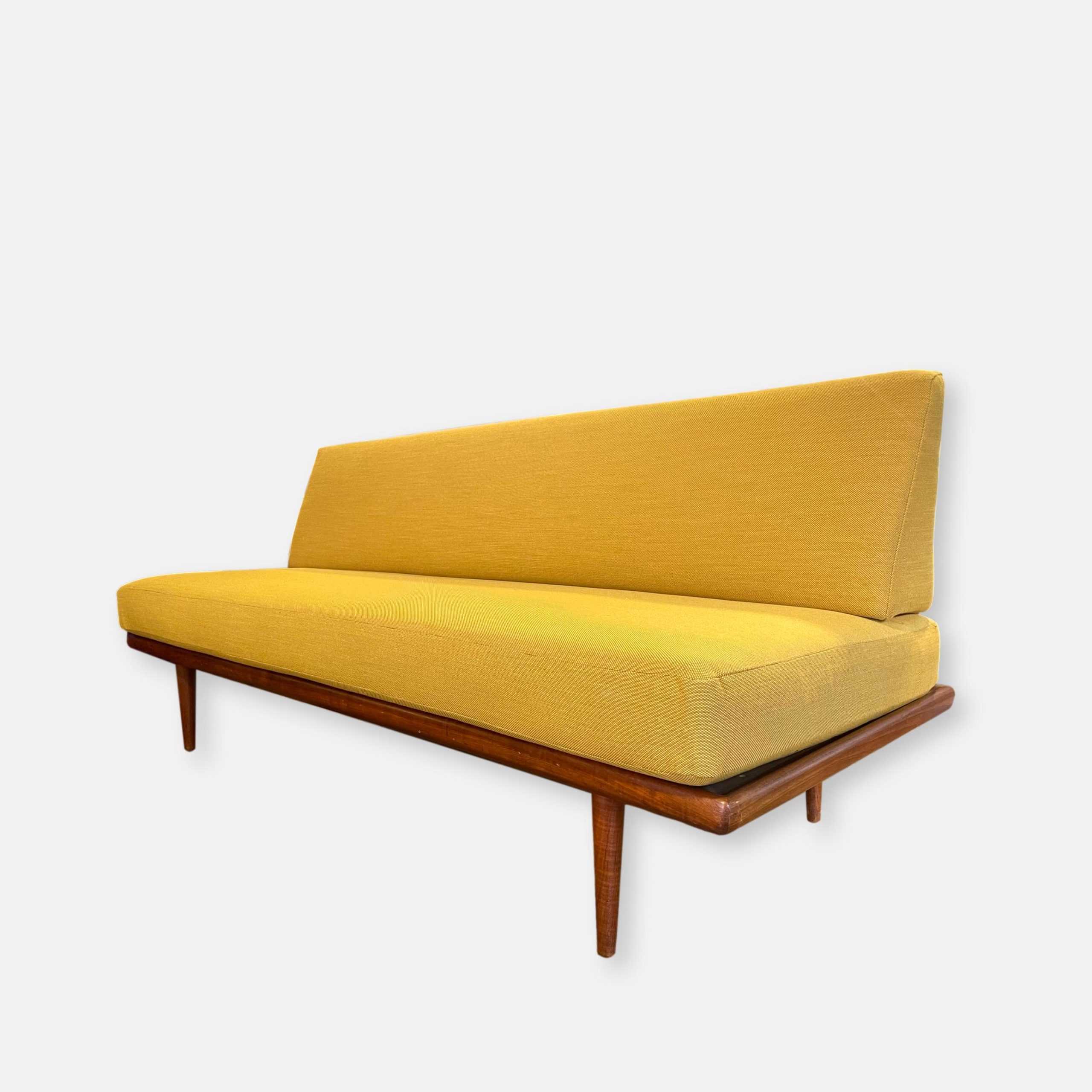 Produit venduCanapé “Minerva” des designers Peter Hvidt & Orla Mølgaard Nielsen en bois de teak. Années 1960 avec un tissu kvadrat neuf.