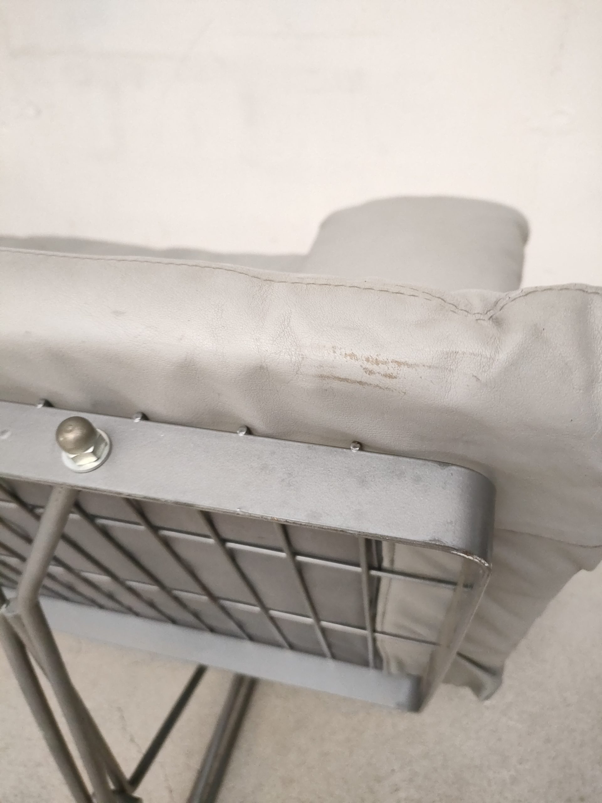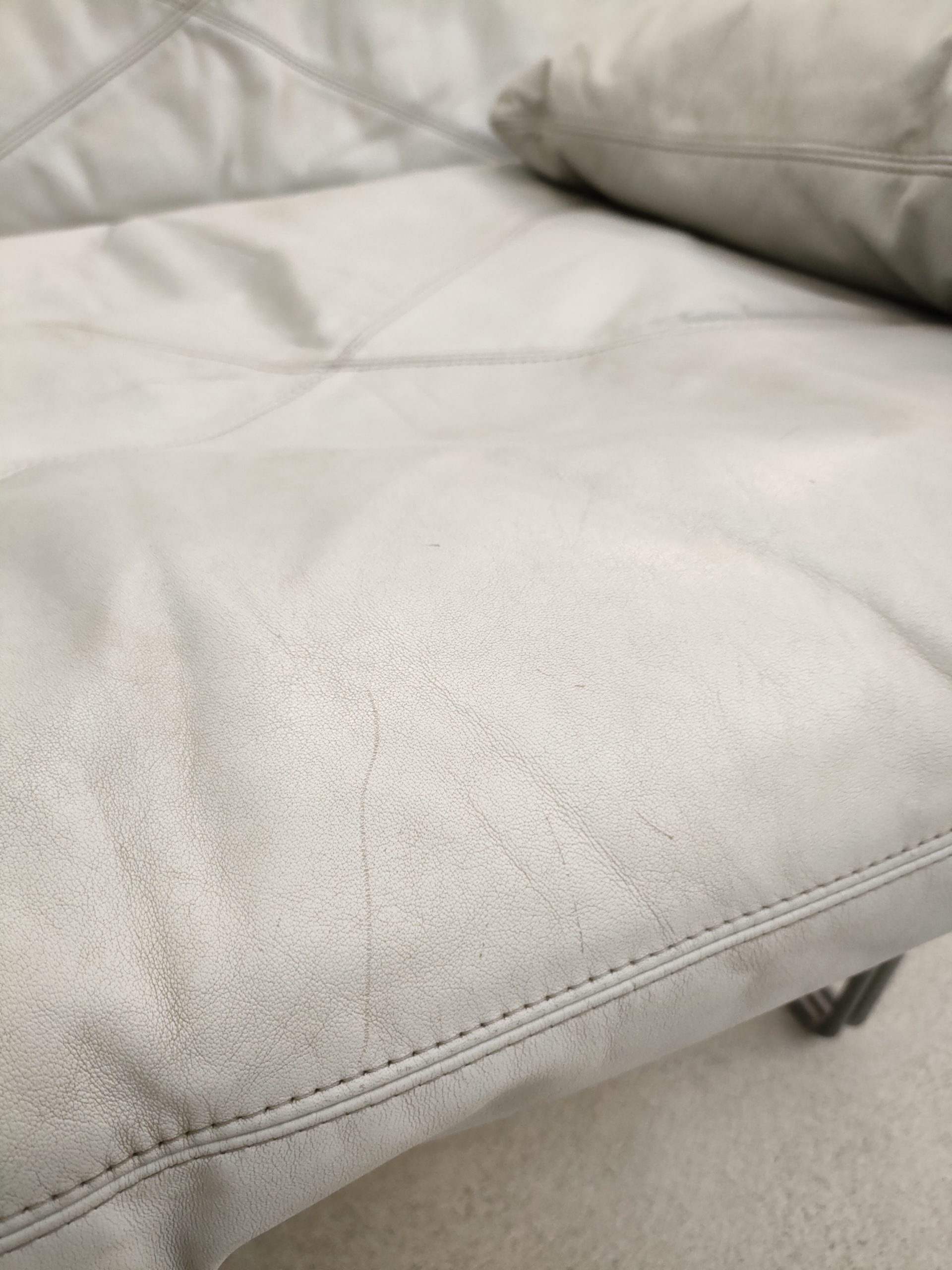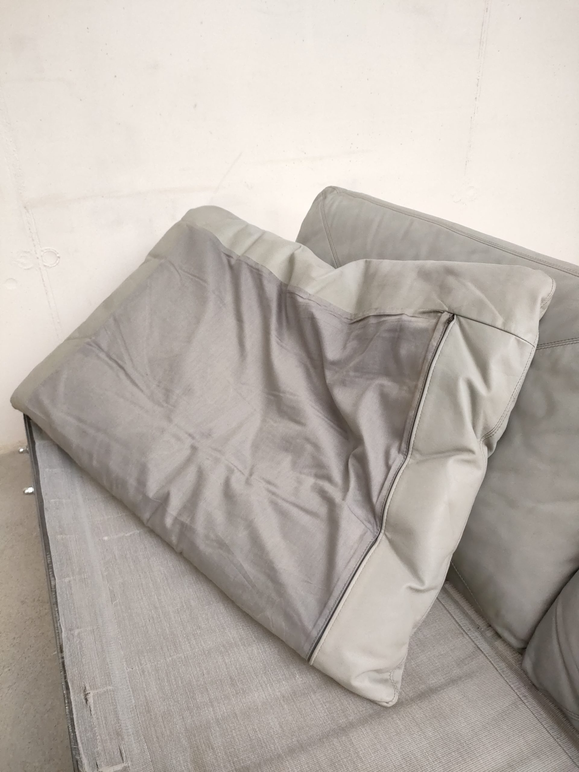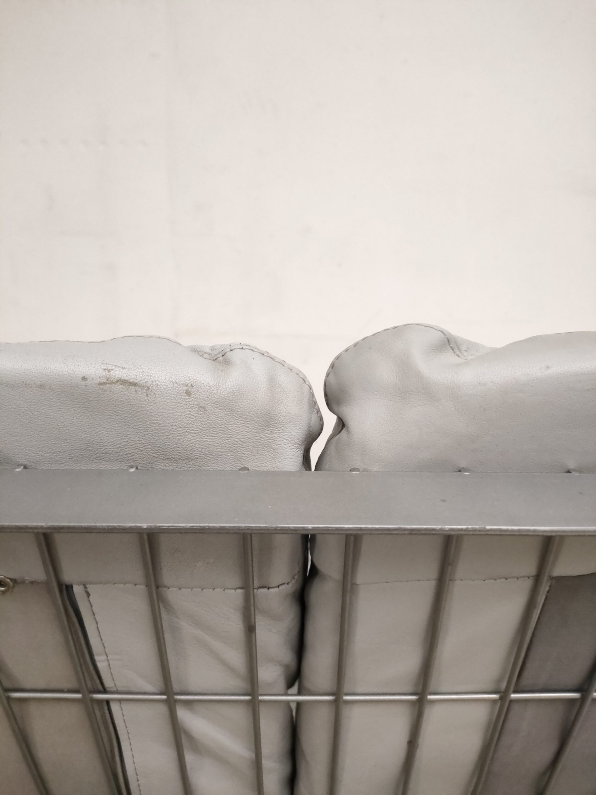 Quelques traces visibles sur les photos sont présentes sur la structure en métal et les coussins. Les coussins en cuir restent en bon état. Les petits coussins sont maintenus par des boutons pression. Le canapé est confortable. Dureté de l’assise : 5/10.