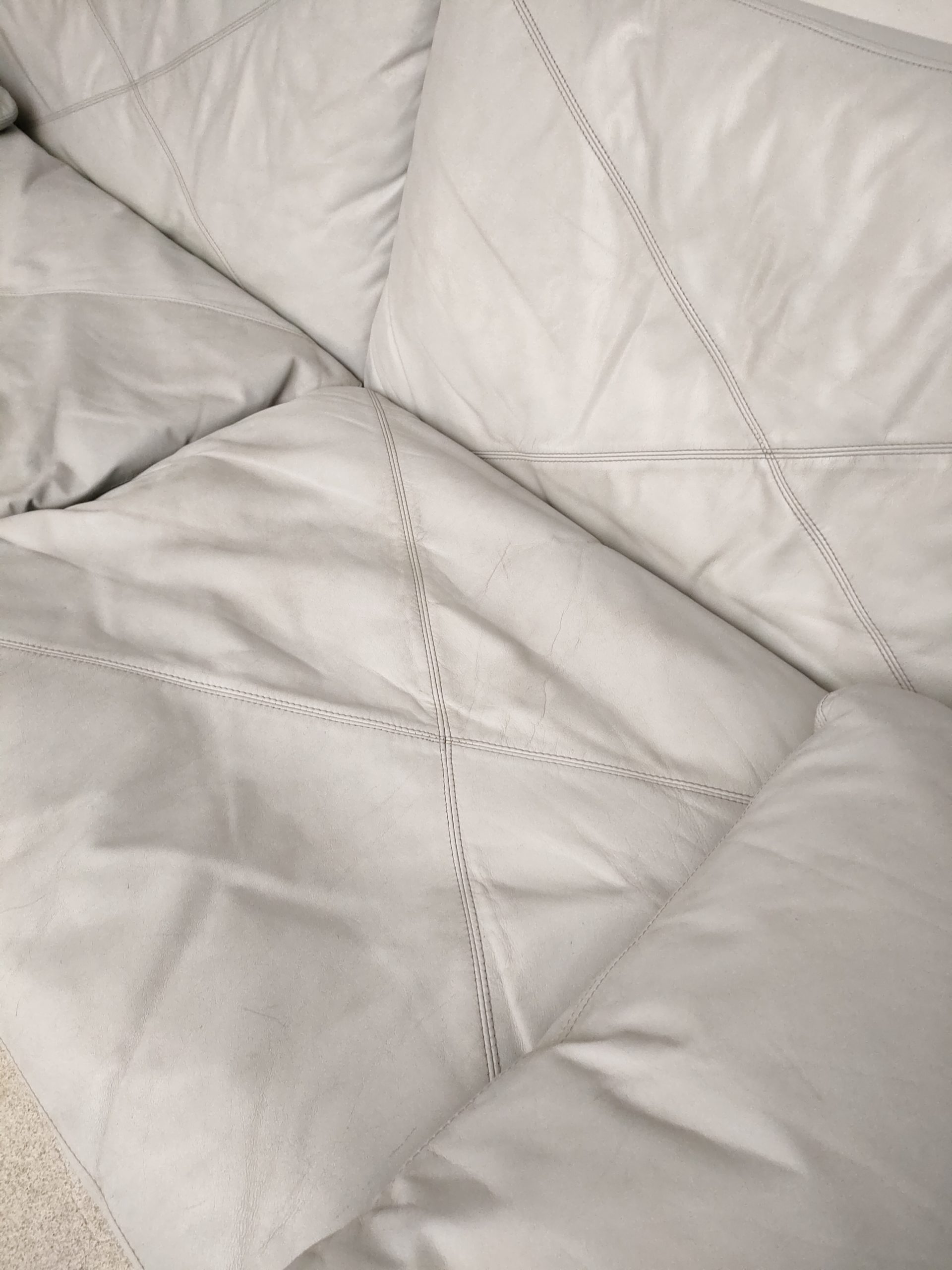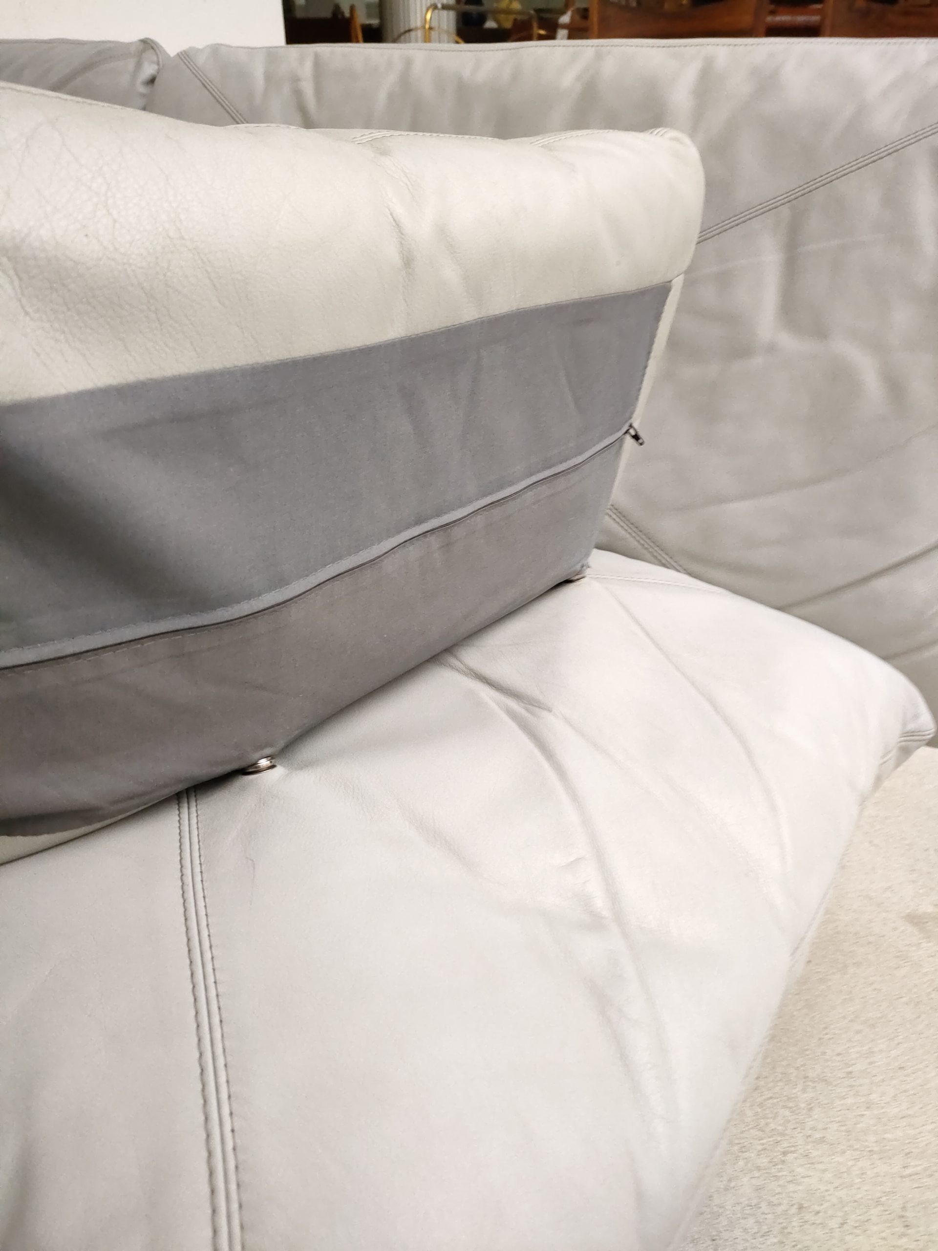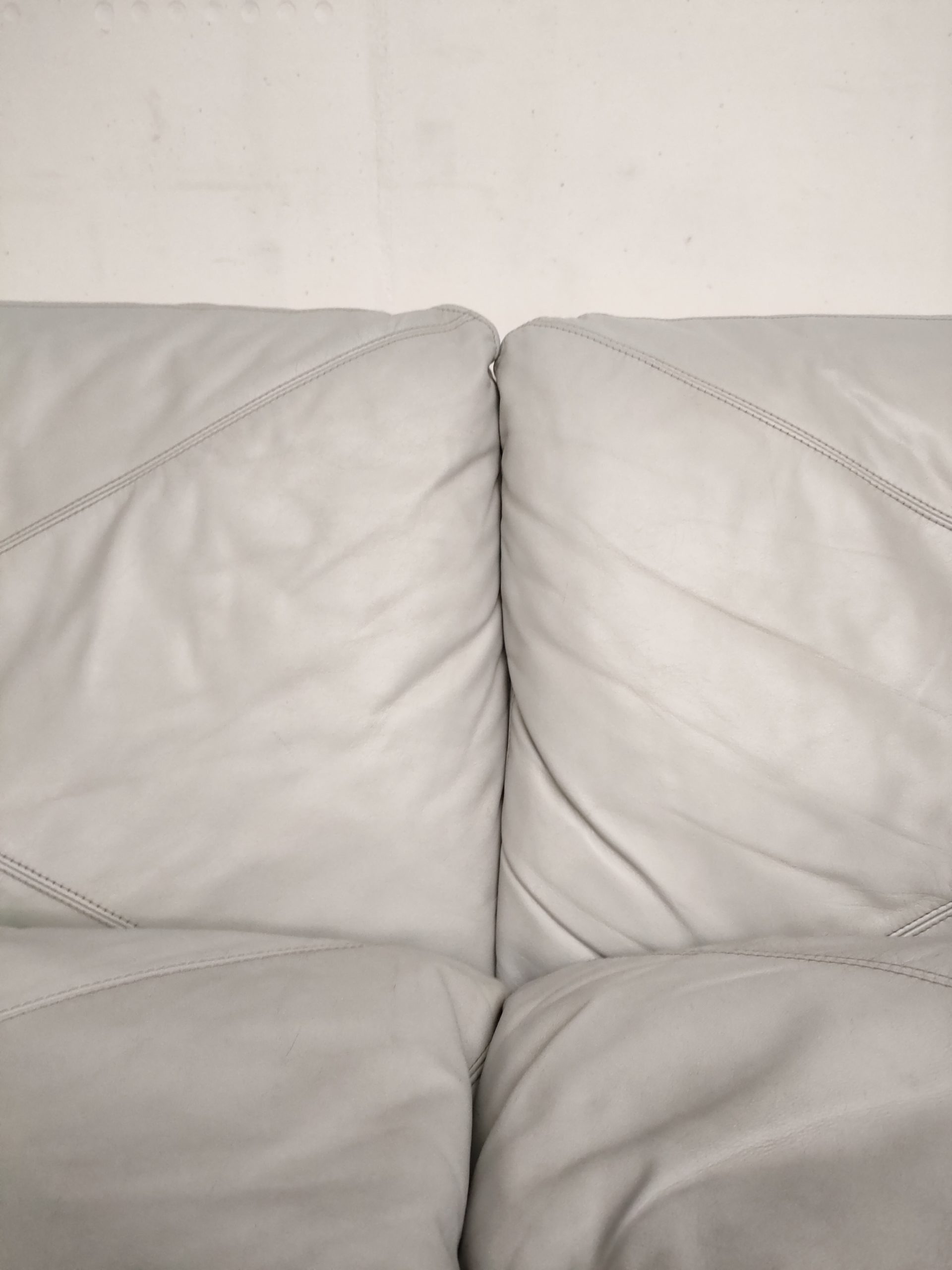 Quelques traces visibles sur les photos sont présentes sur la structure en métal et les coussins. Les coussins en cuir restent en bon état. Les petits coussins sont maintenus par des boutons pression. Le canapé est confortable. Dureté de l’assise : 5/10.