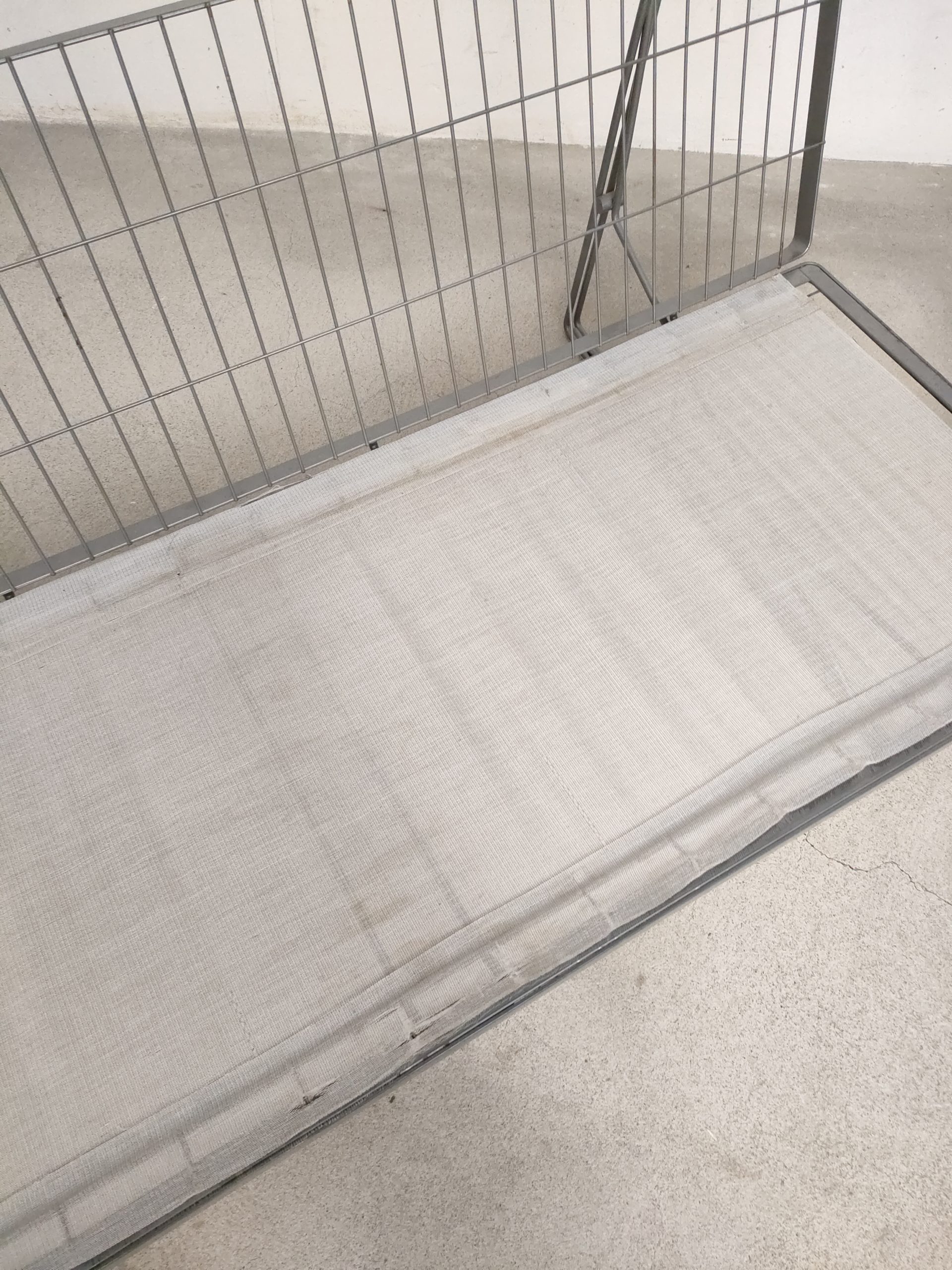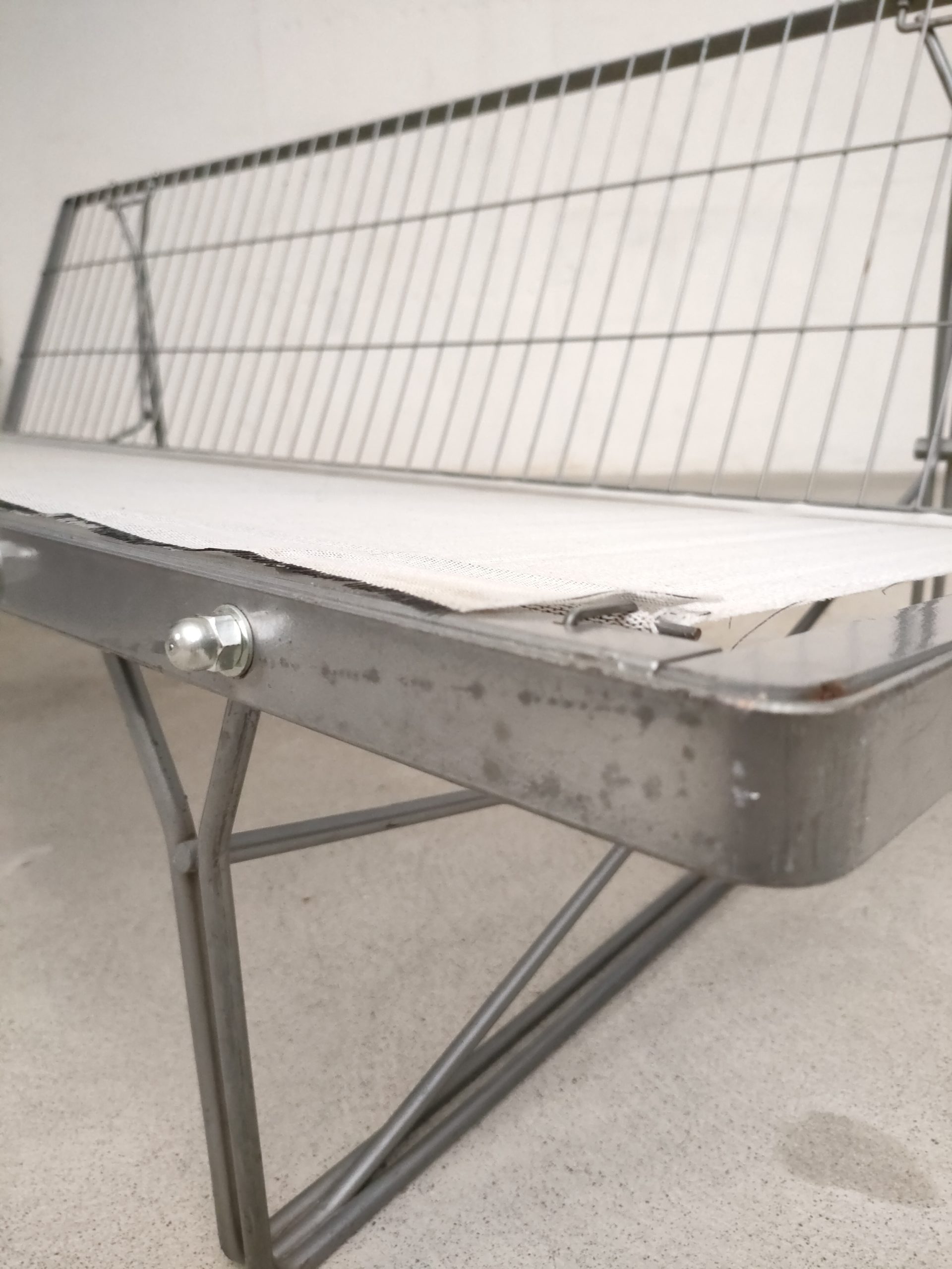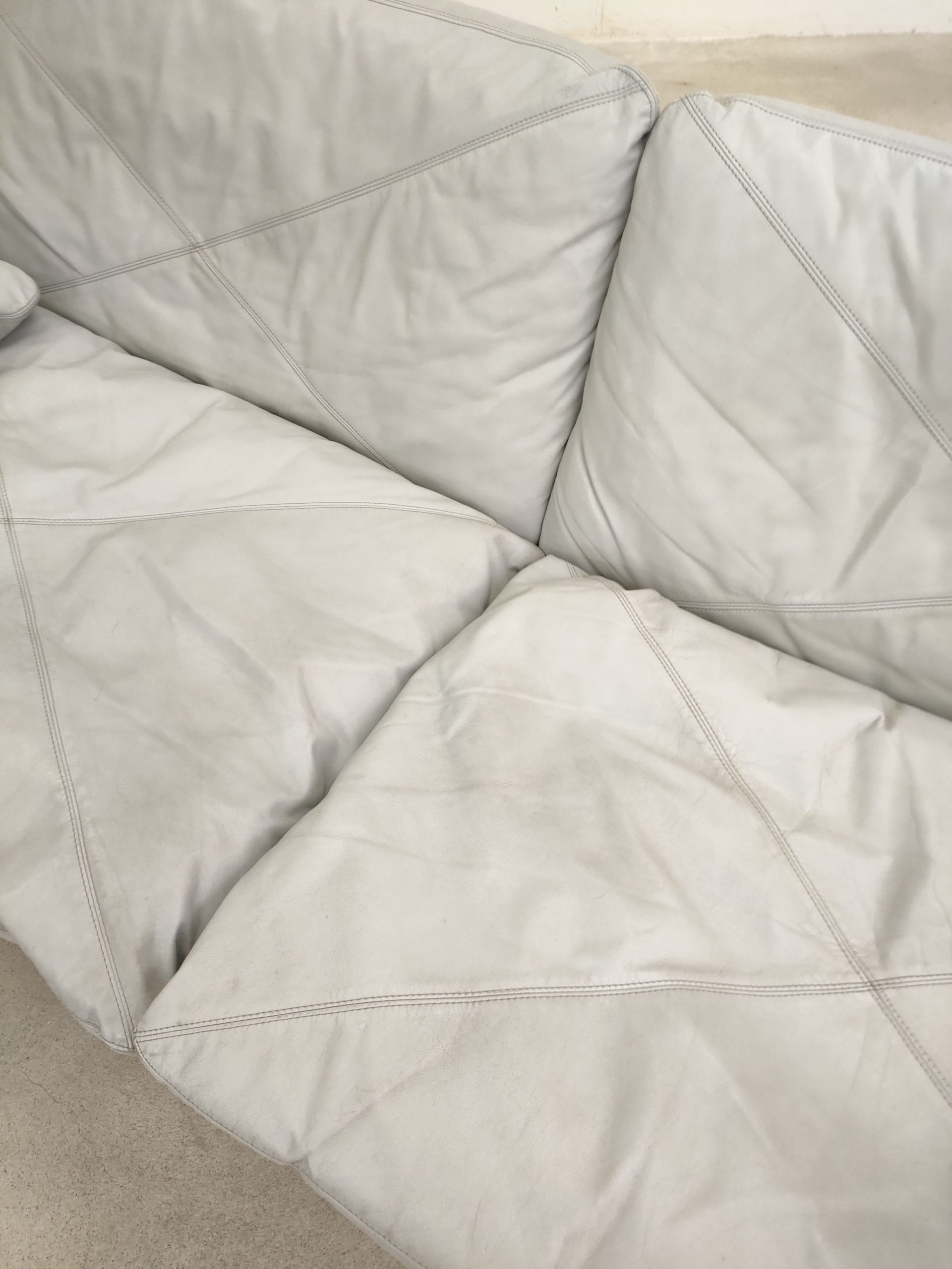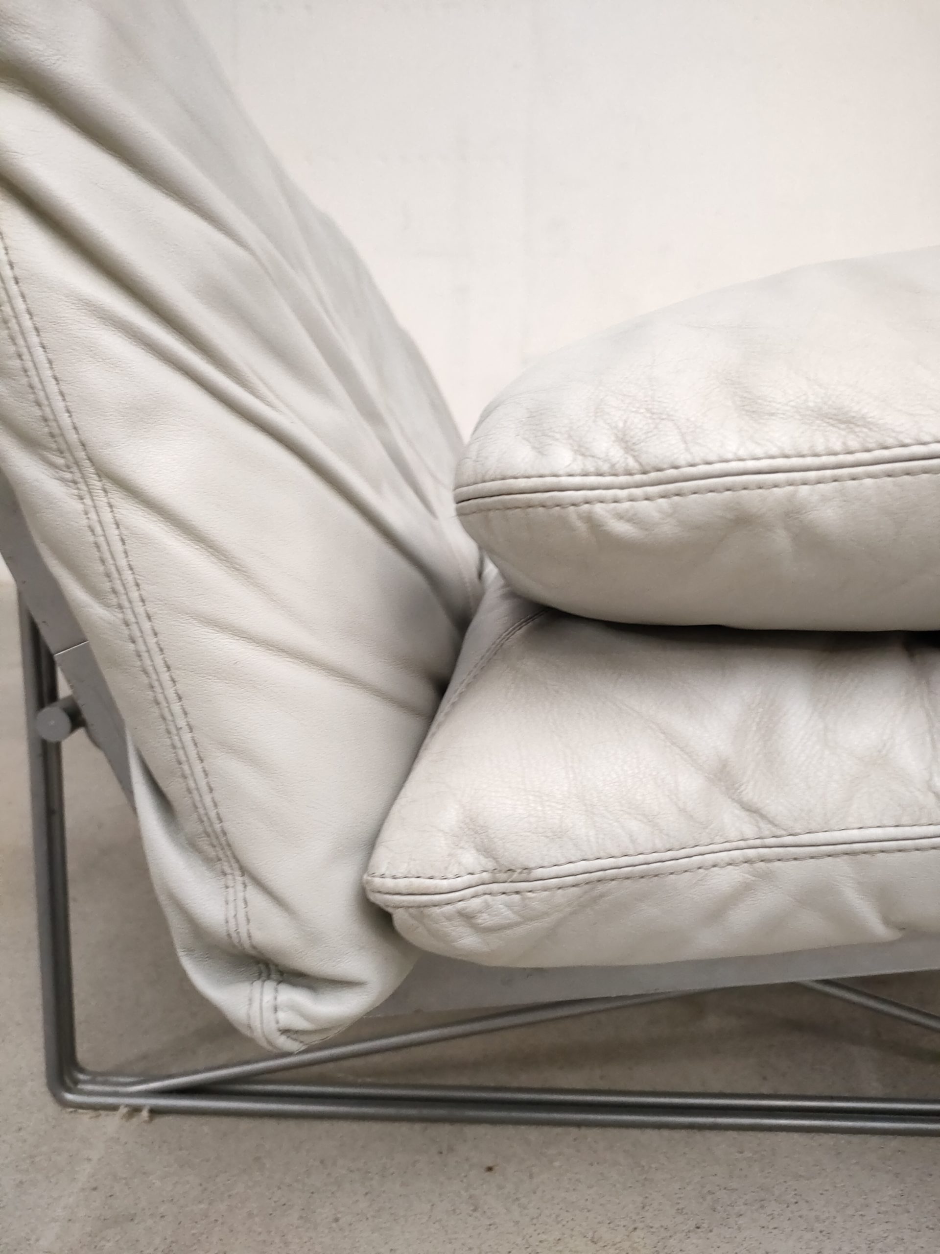 Quelques traces visibles sur les photos sont présentes sur la structure en métal et les coussins. Les coussins en cuir restent en bon état. Les petits coussins sont maintenus par des boutons pression. Le canapé est confortable. Dureté de l’assise : 5/10.