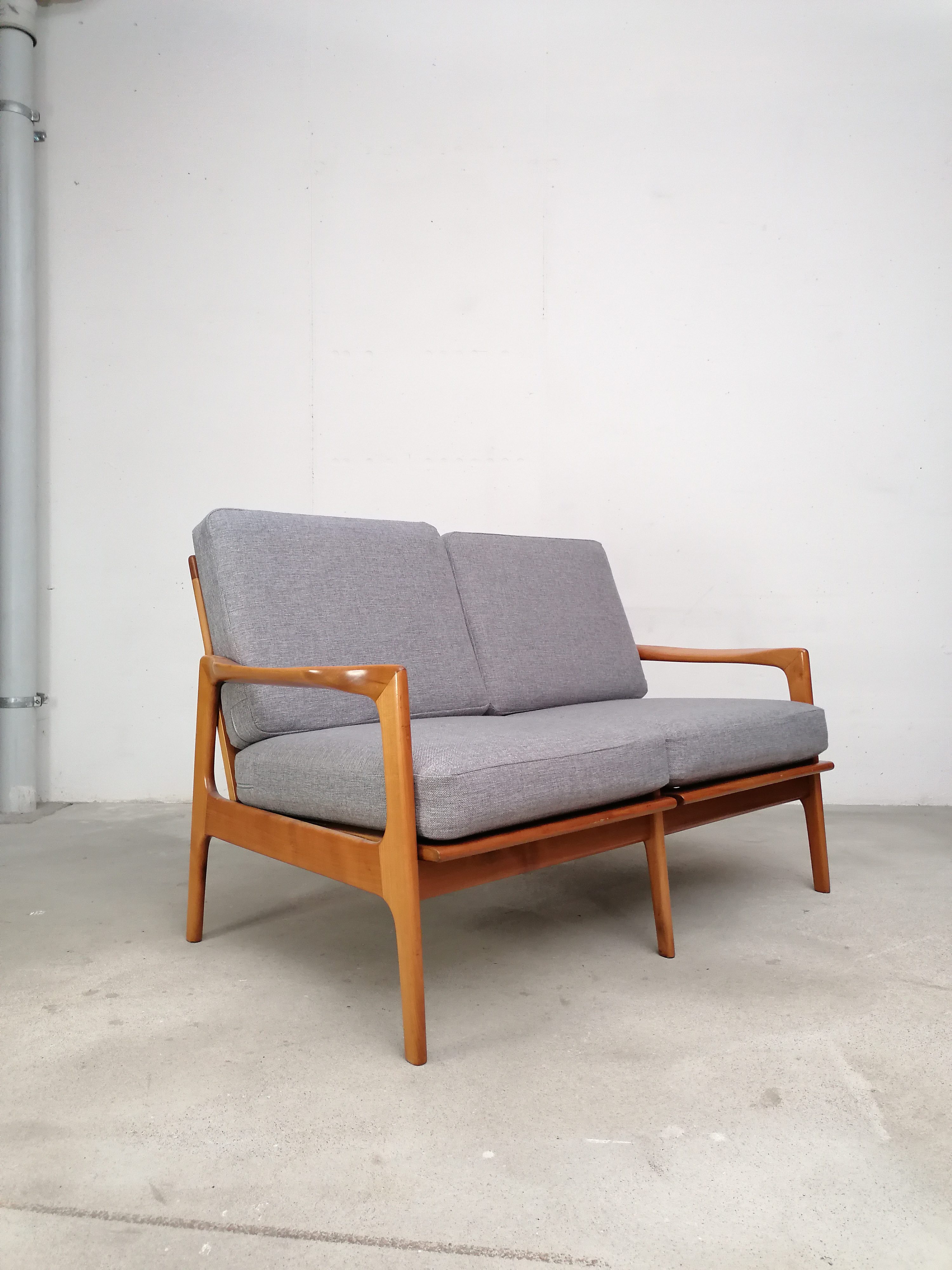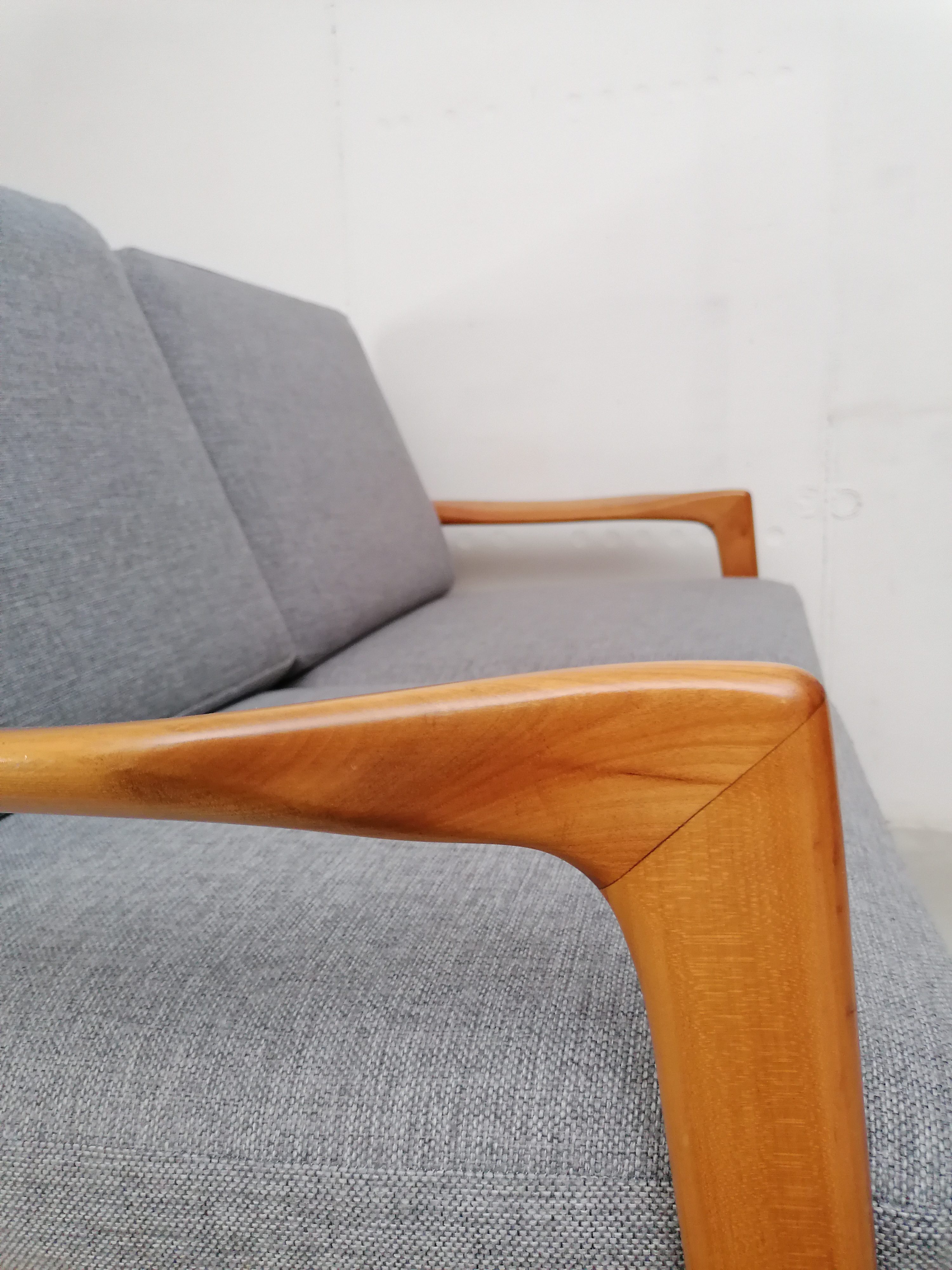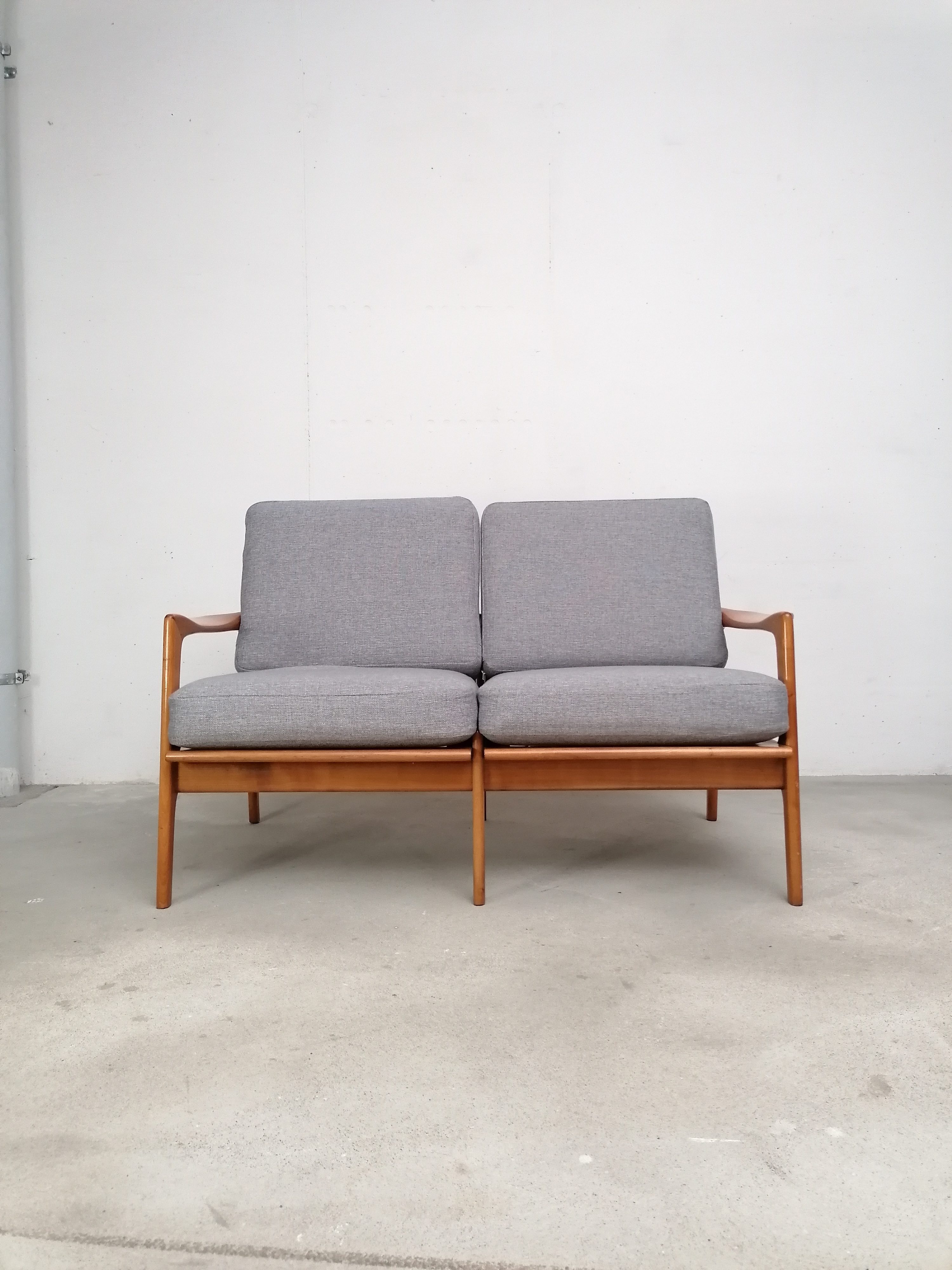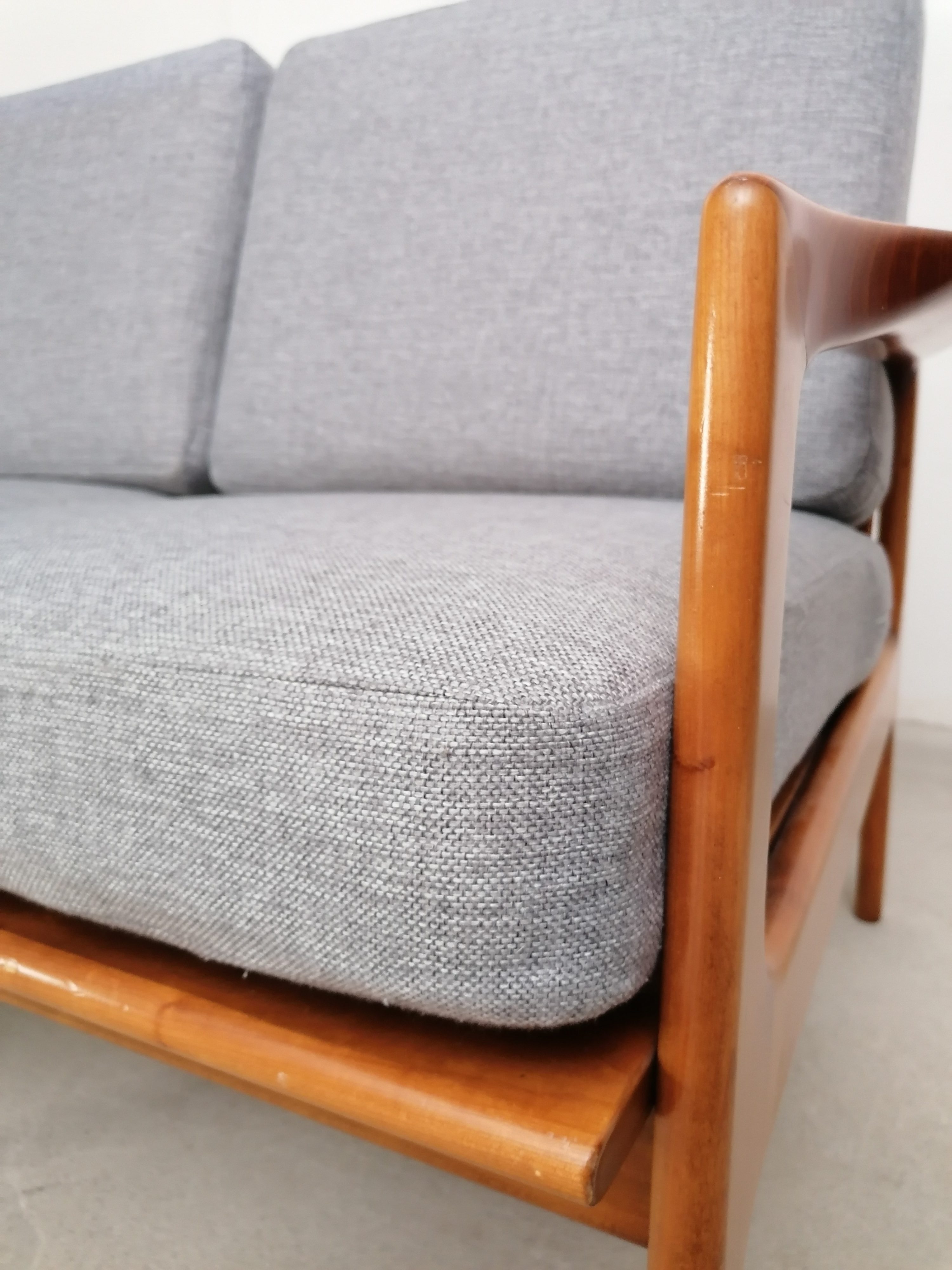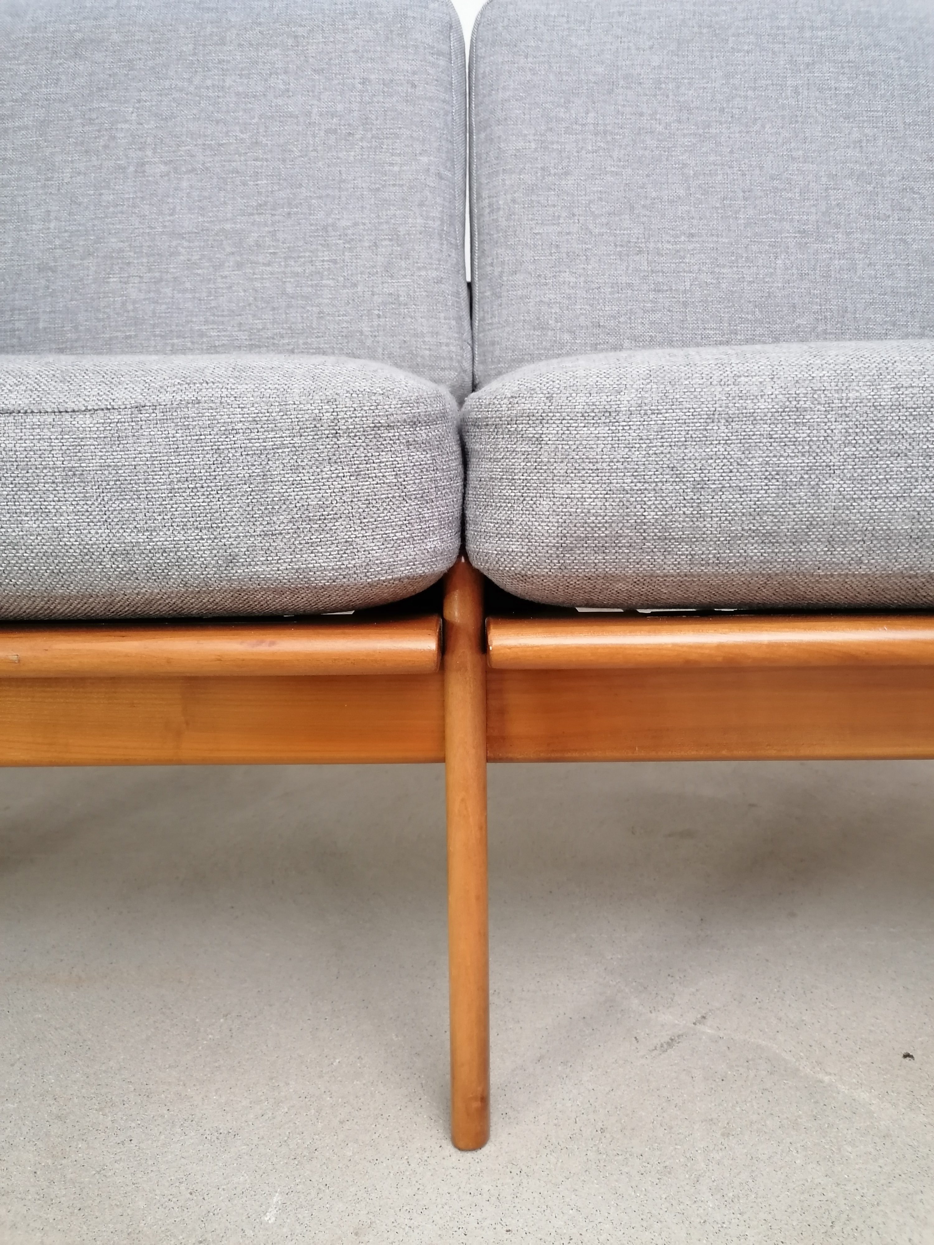 Produit venduCanapé deux places scandinave vintage. Structure en bois et assises et dossiers en tissu. La mousse et le tissu d’origine ont été recouverts avec un nouveau tissu. Le tissu d’origine est toujours présent. À signaler une très légère trace presque imperceptible sur une des assises (voir photo). Quelques traces d’usure sur la structure en bois. Stable et solide et très élégante avec ses lignes typiquement scandinaves. Hauteur de l’assise: 41 cm.