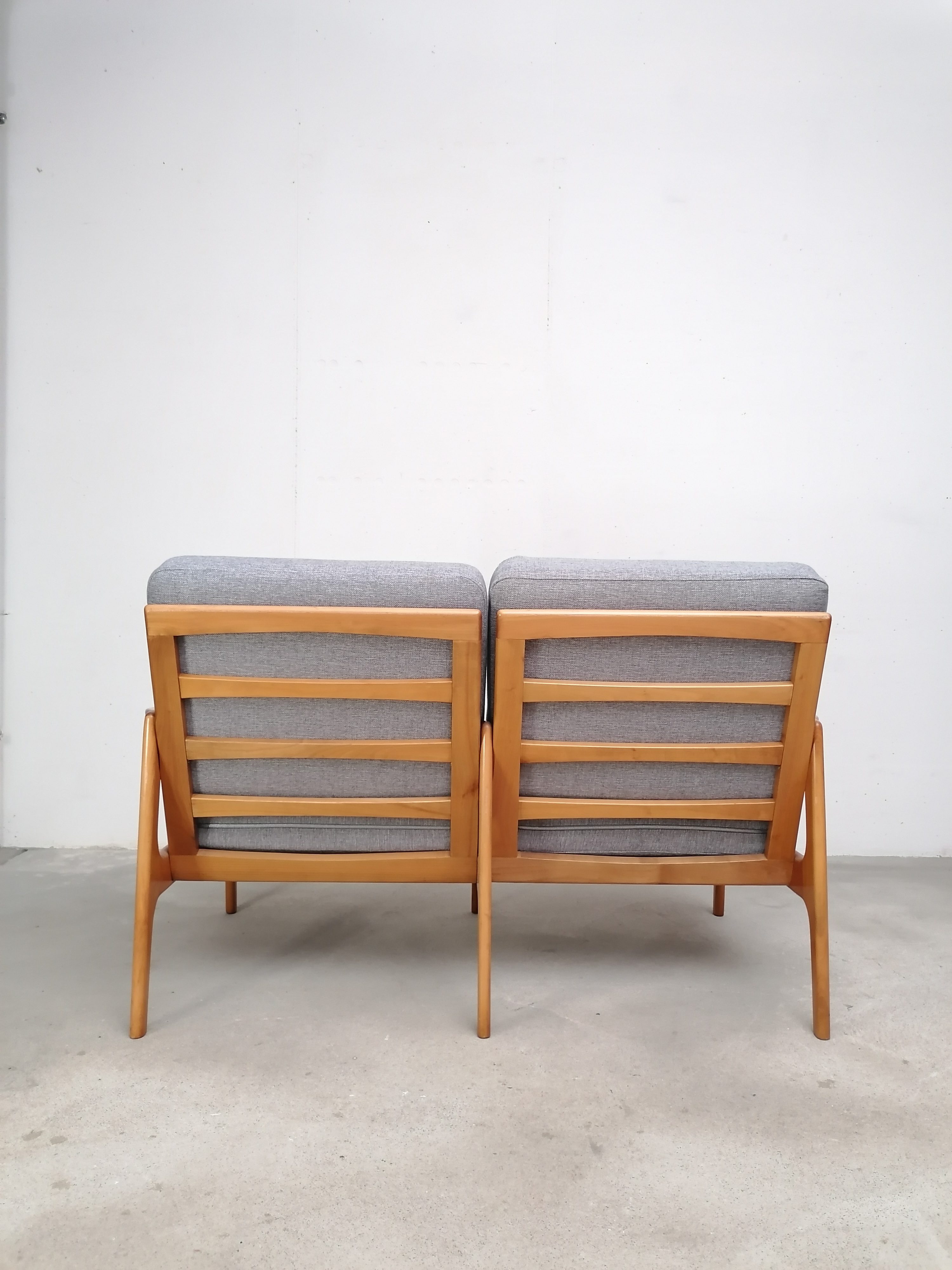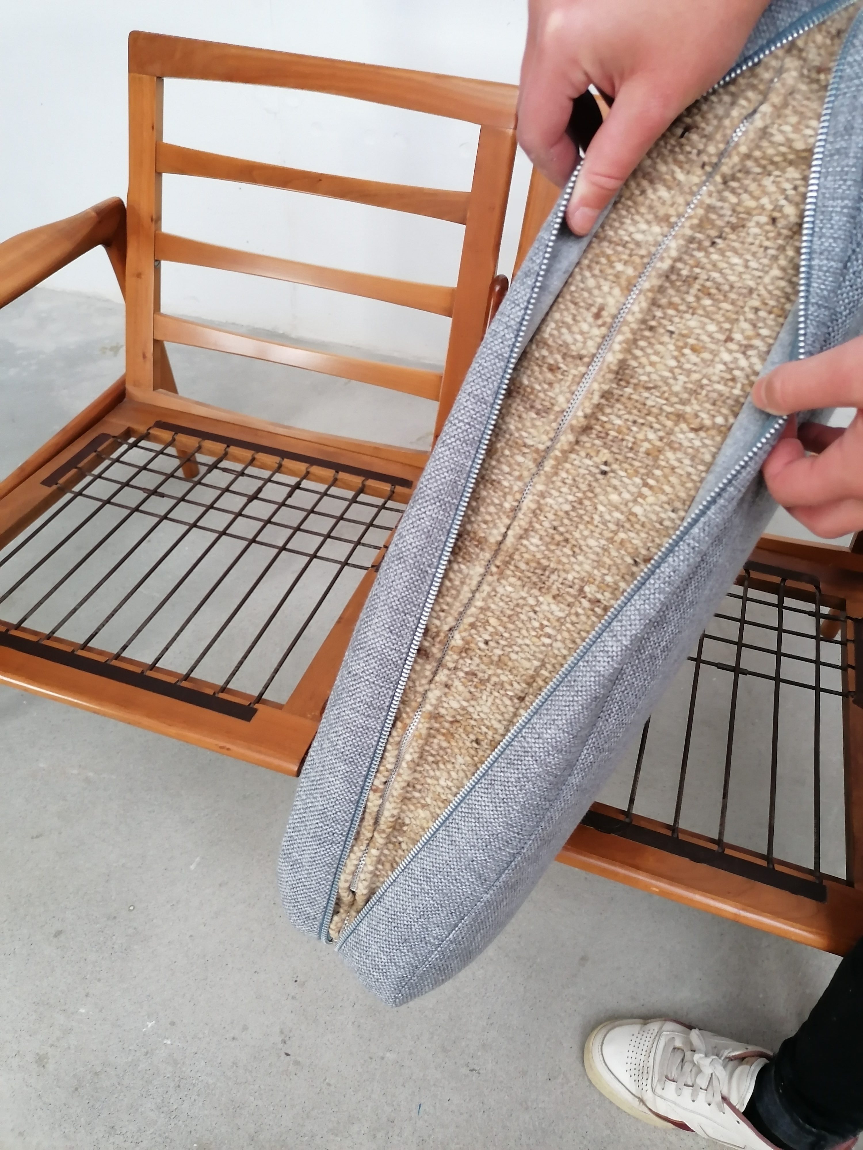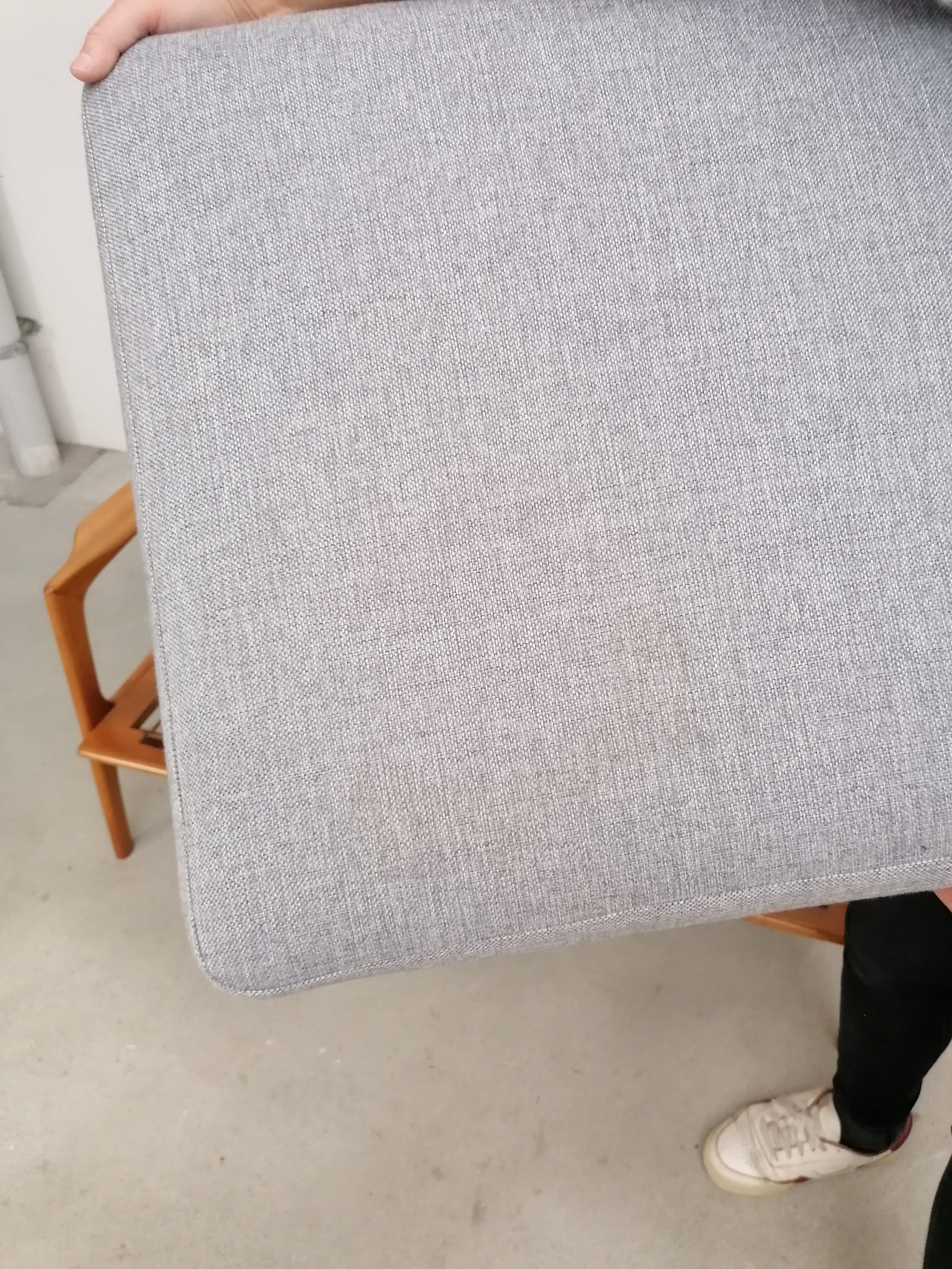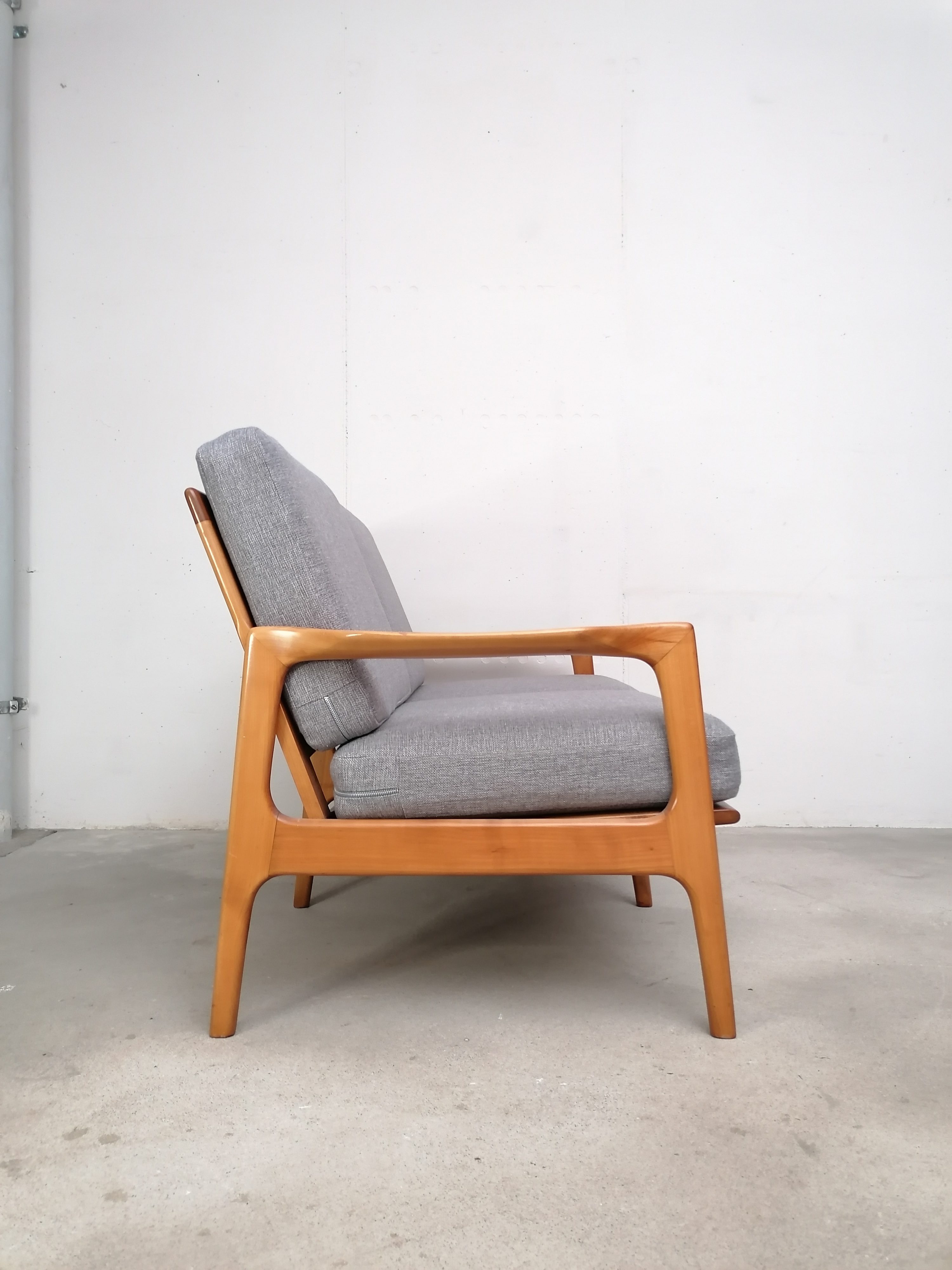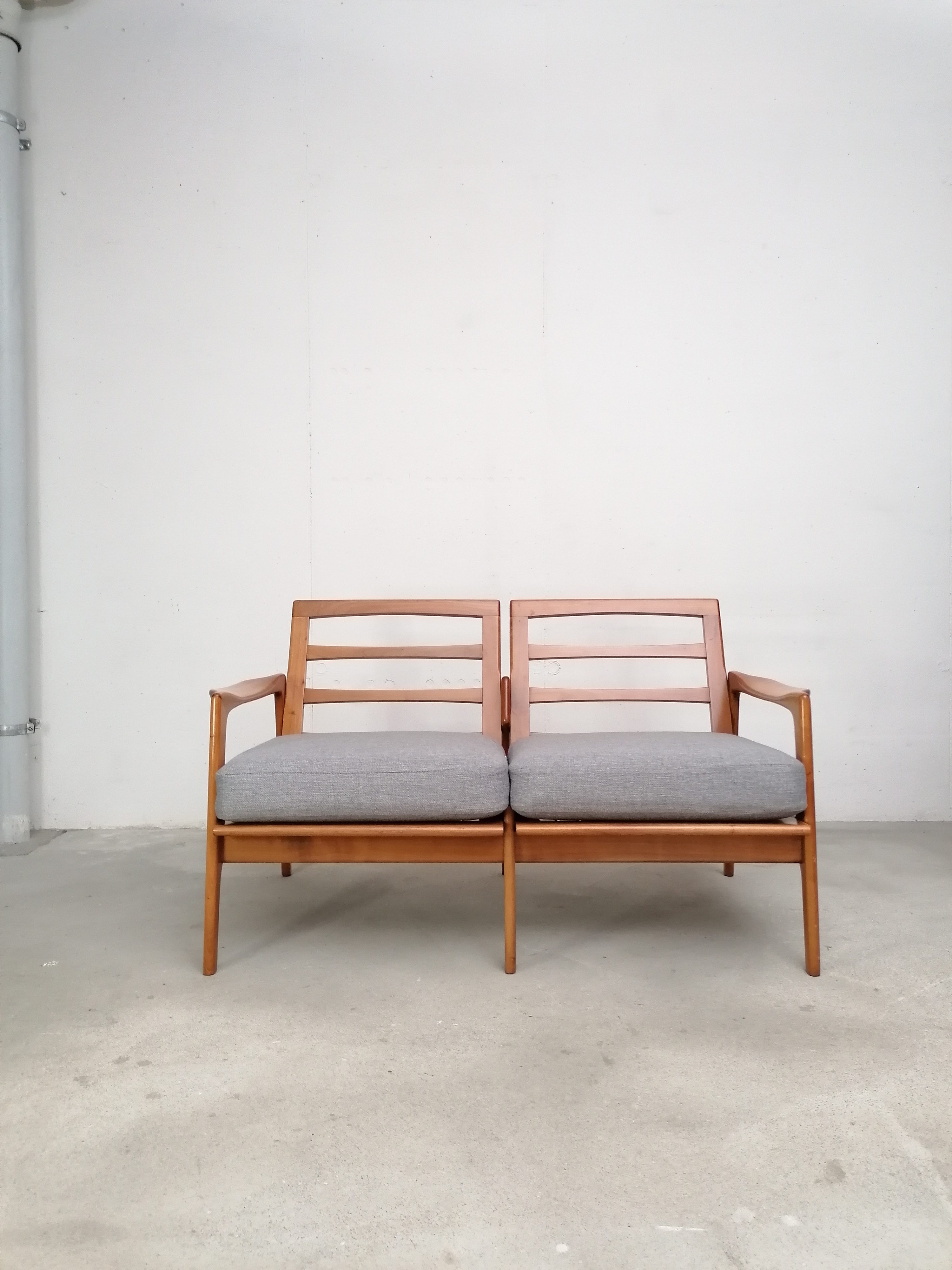 Produit venduCanapé deux places scandinave vintage. Structure en bois et assises et dossiers en tissu. La mousse et le tissu d’origine ont été recouverts avec un nouveau tissu. Le tissu d’origine est toujours présent. À signaler une très légère trace presque imperceptible sur une des assises (voir photo). Quelques traces d’usure sur la structure en bois. Stable et solide et très élégante avec ses lignes typiquement scandinaves. Hauteur de l’assise: 41 cm.