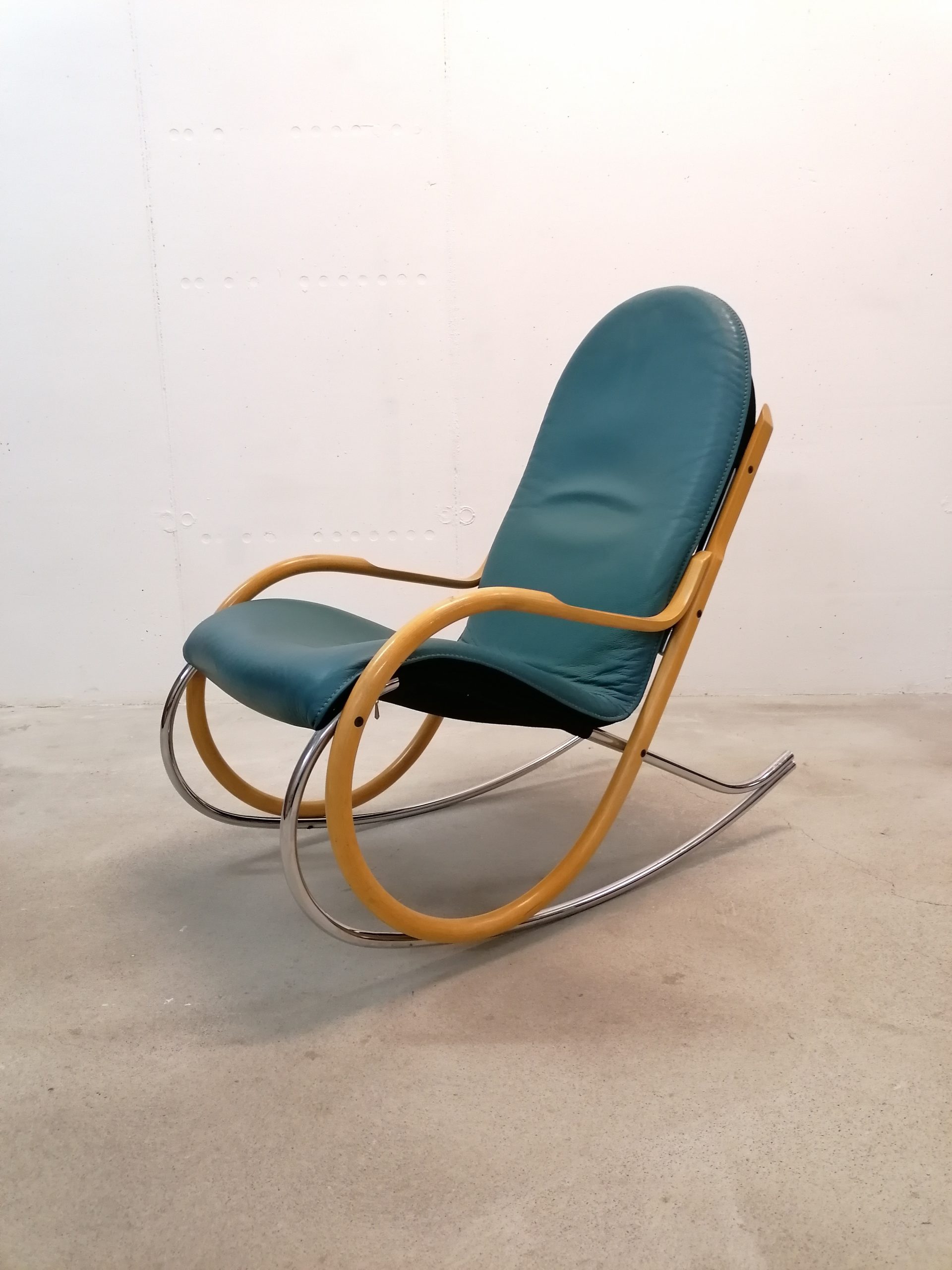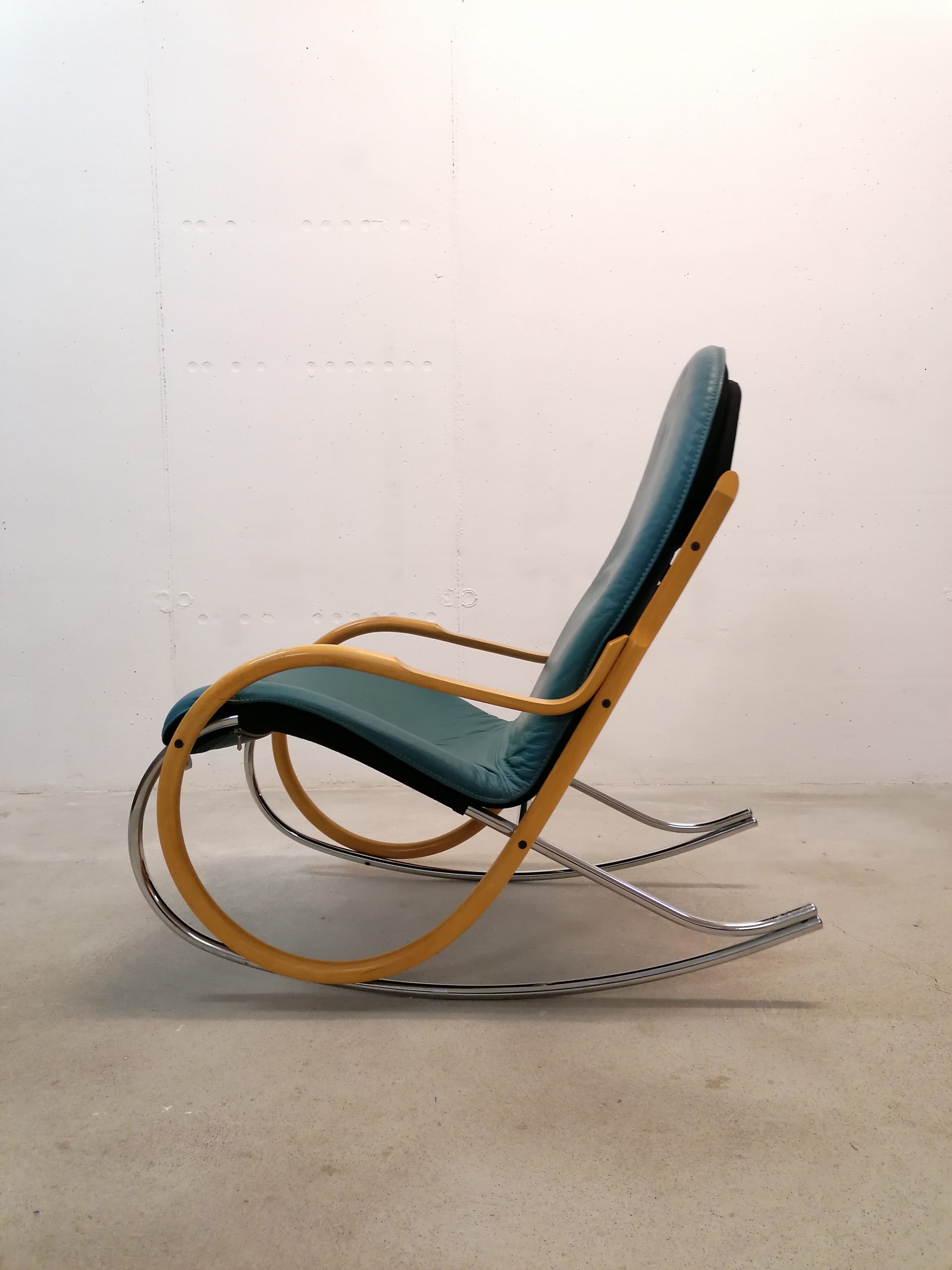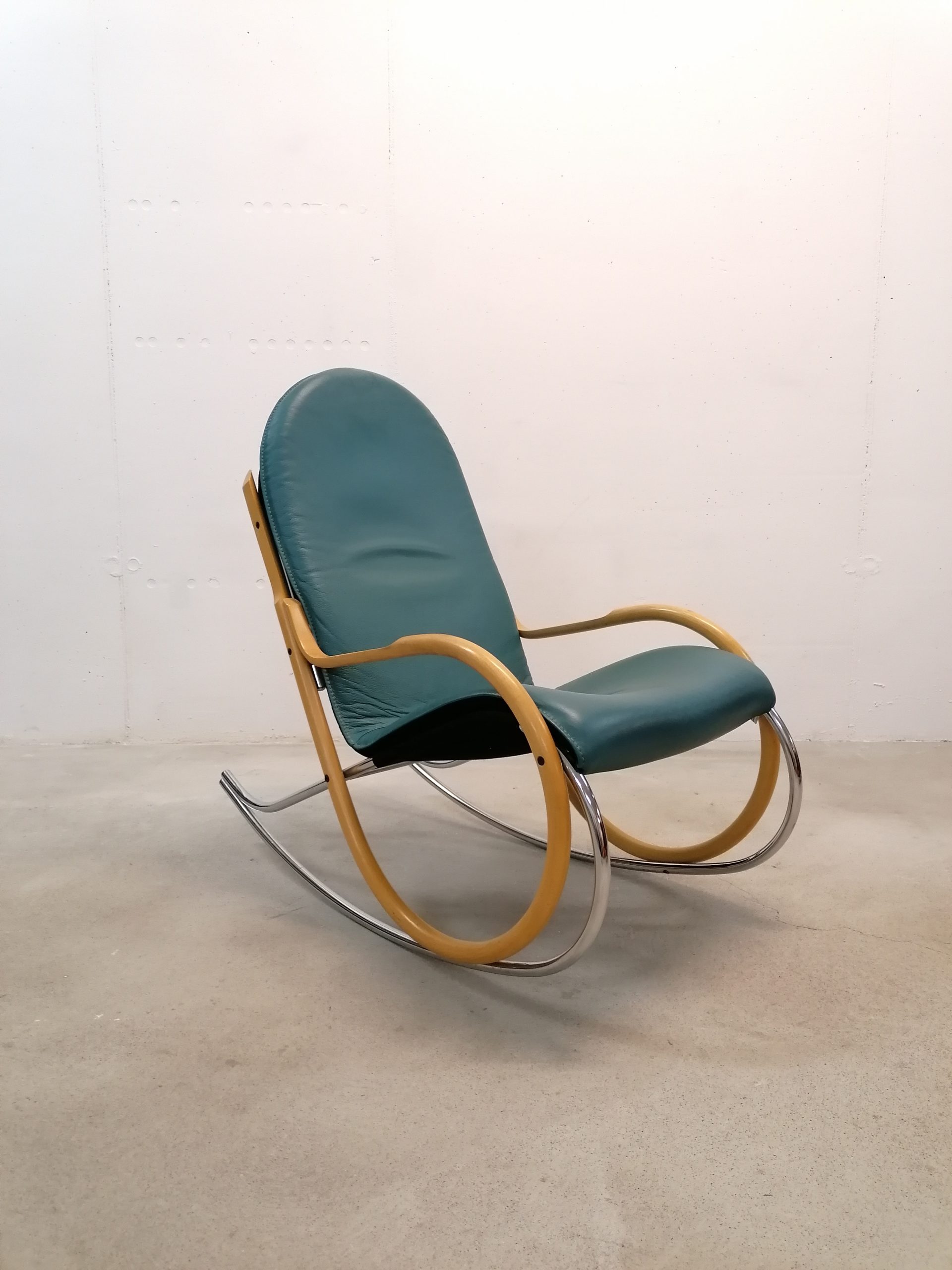 Produit venduChaise à bascule. Modèle “Nonna” dessiné par Paul Tuttle pour Strässle. Le modèle Nonna a été dessiné en 1972, cet exemplaire (en très bon état) est beaucoup plus récent. Assise et dossier en cuir et structure en bois et métal. Hauteur de l’assise: 42 cm.