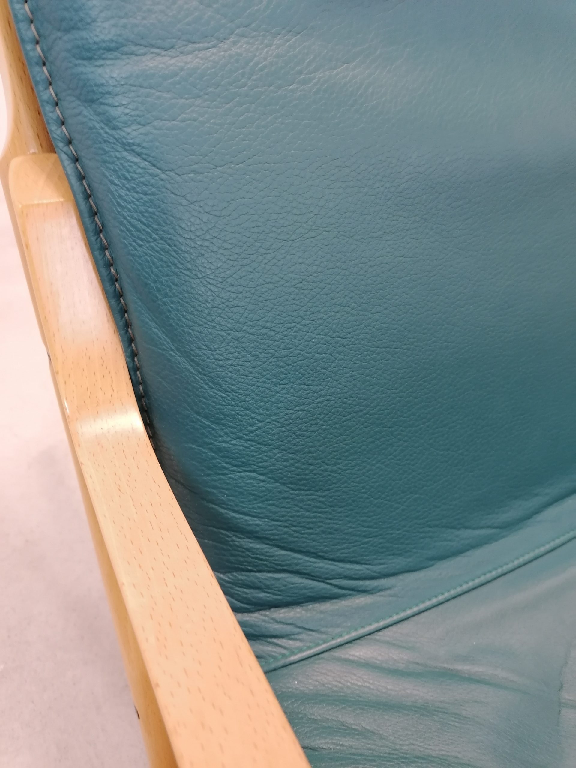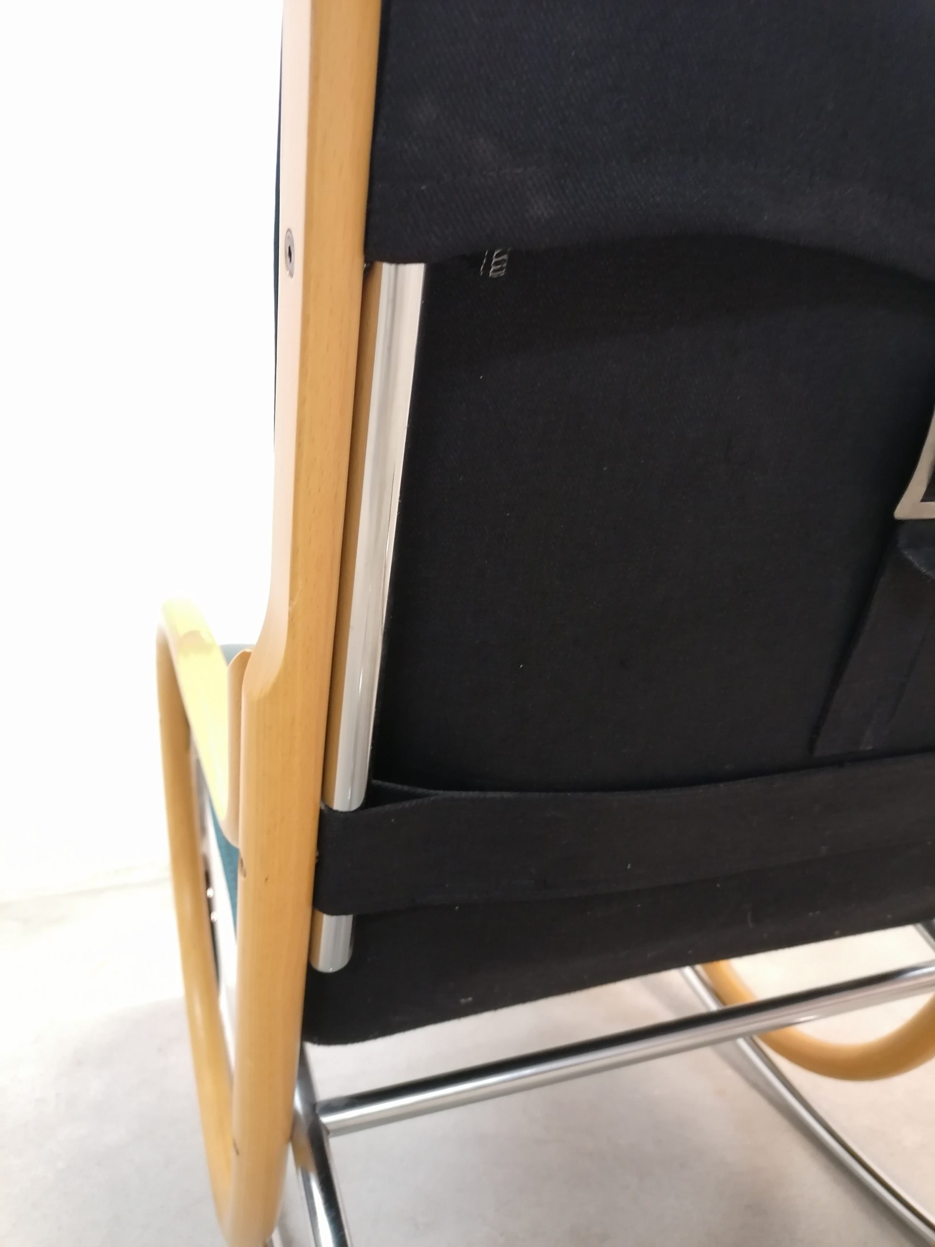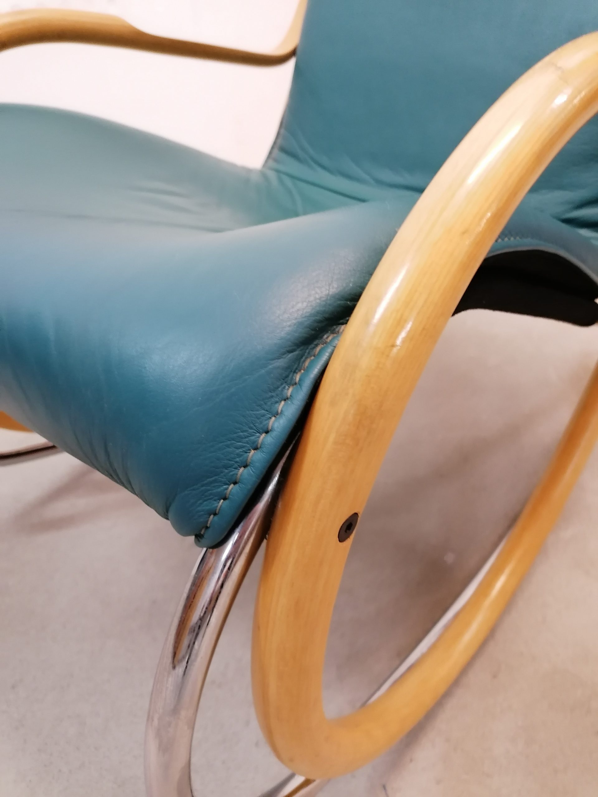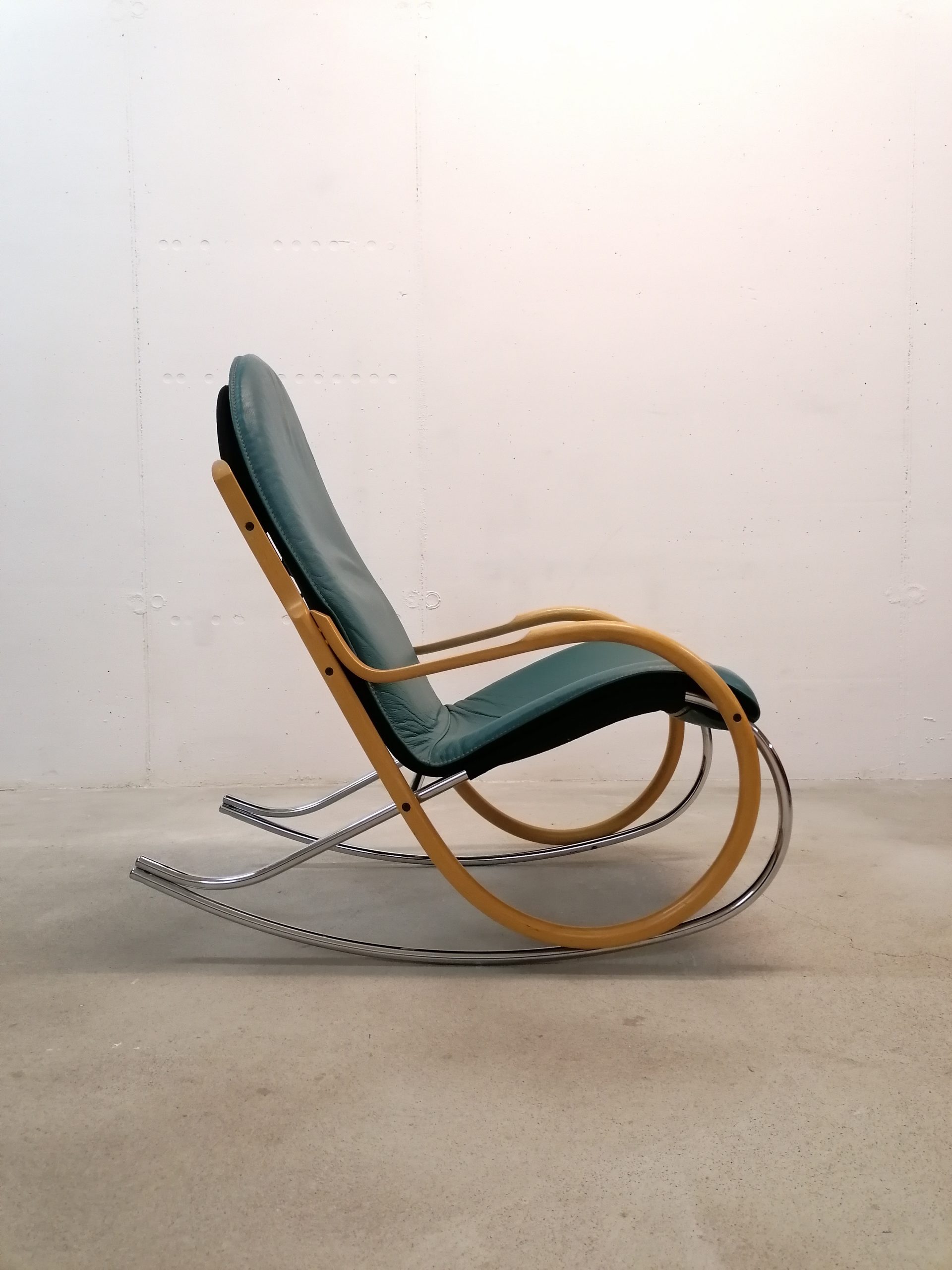 Produit venduChaise à bascule. Modèle “Nonna” dessiné par Paul Tuttle pour Strässle. Le modèle Nonna a été dessiné en 1972, cet exemplaire (en très bon état) est beaucoup plus récent. Assise et dossier en cuir et structure en bois et métal. Hauteur de l’assise: 42 cm.