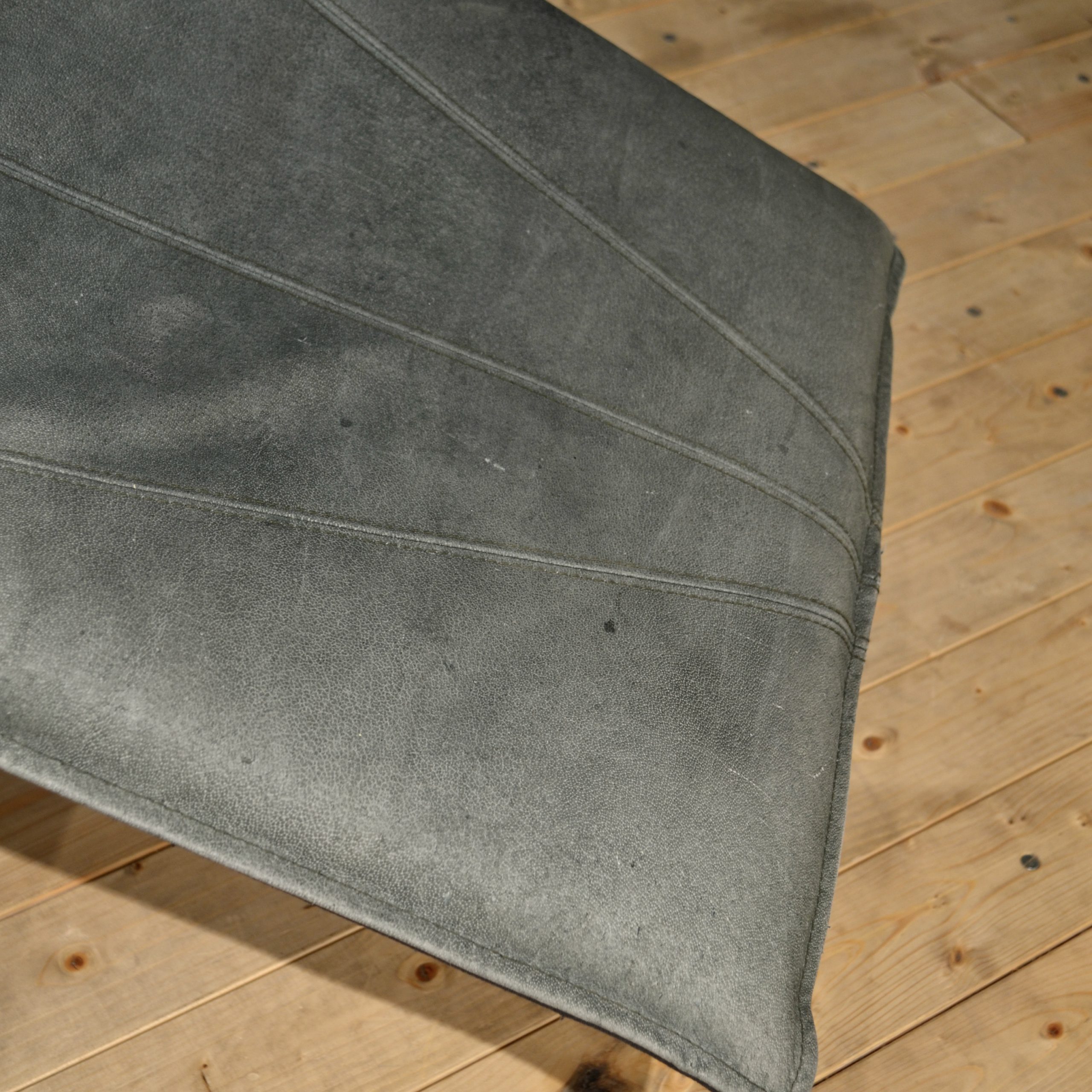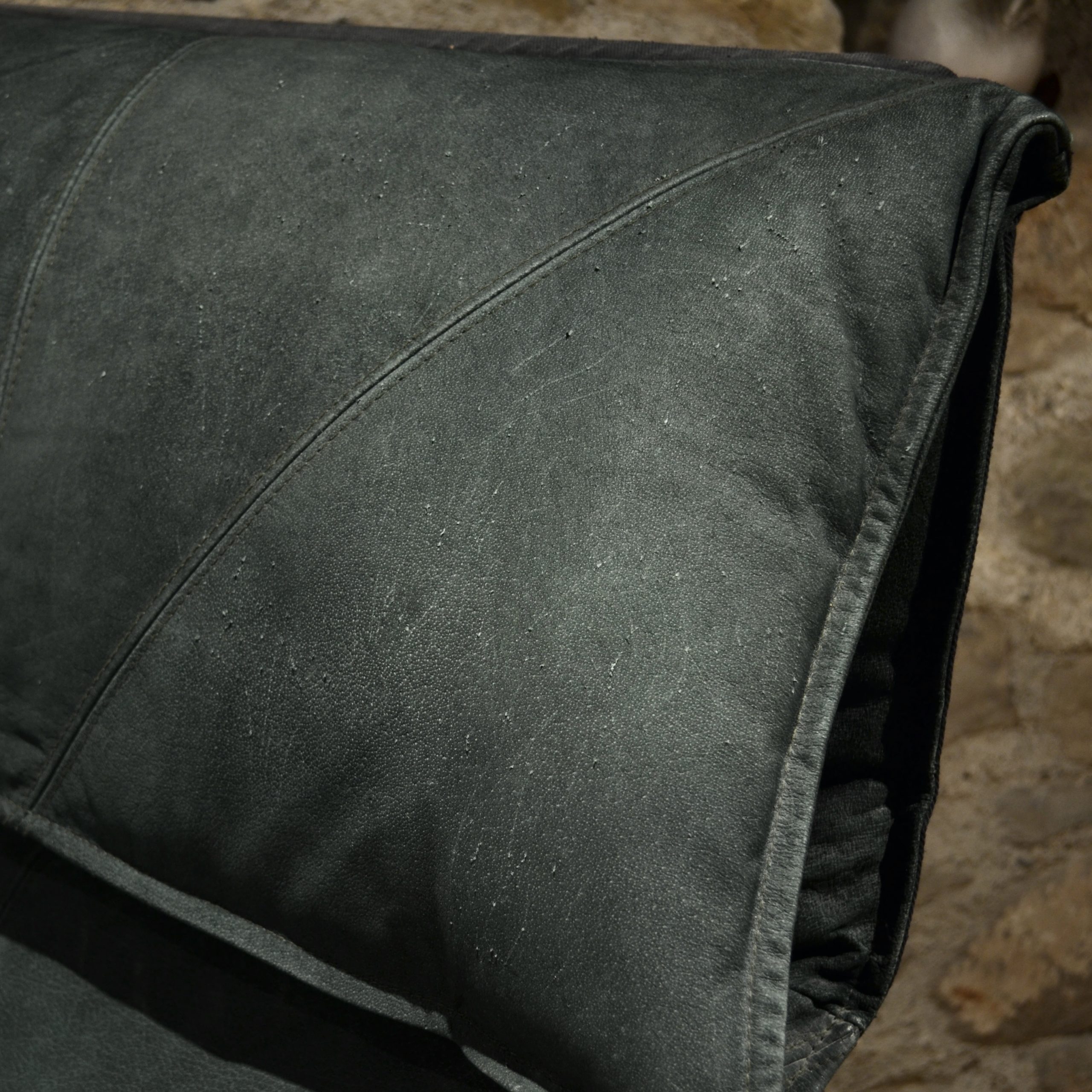 La structure en acier chromé soutient un cadre métallique enveloppé d’une toile sur laquelle repose le matelas en cuir vert bouteille.