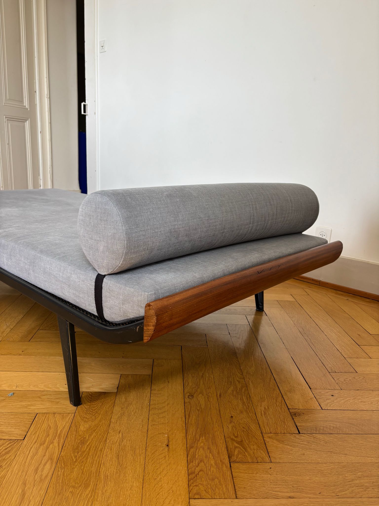 Icône du design néerlandais des années 50, le daybed Cleopatra a été imaginé par Dick Cordemeijer pour la marque Auping. Sa structure en métal tubulaire laqué noir et ses extrémités sont en teck courbé.
