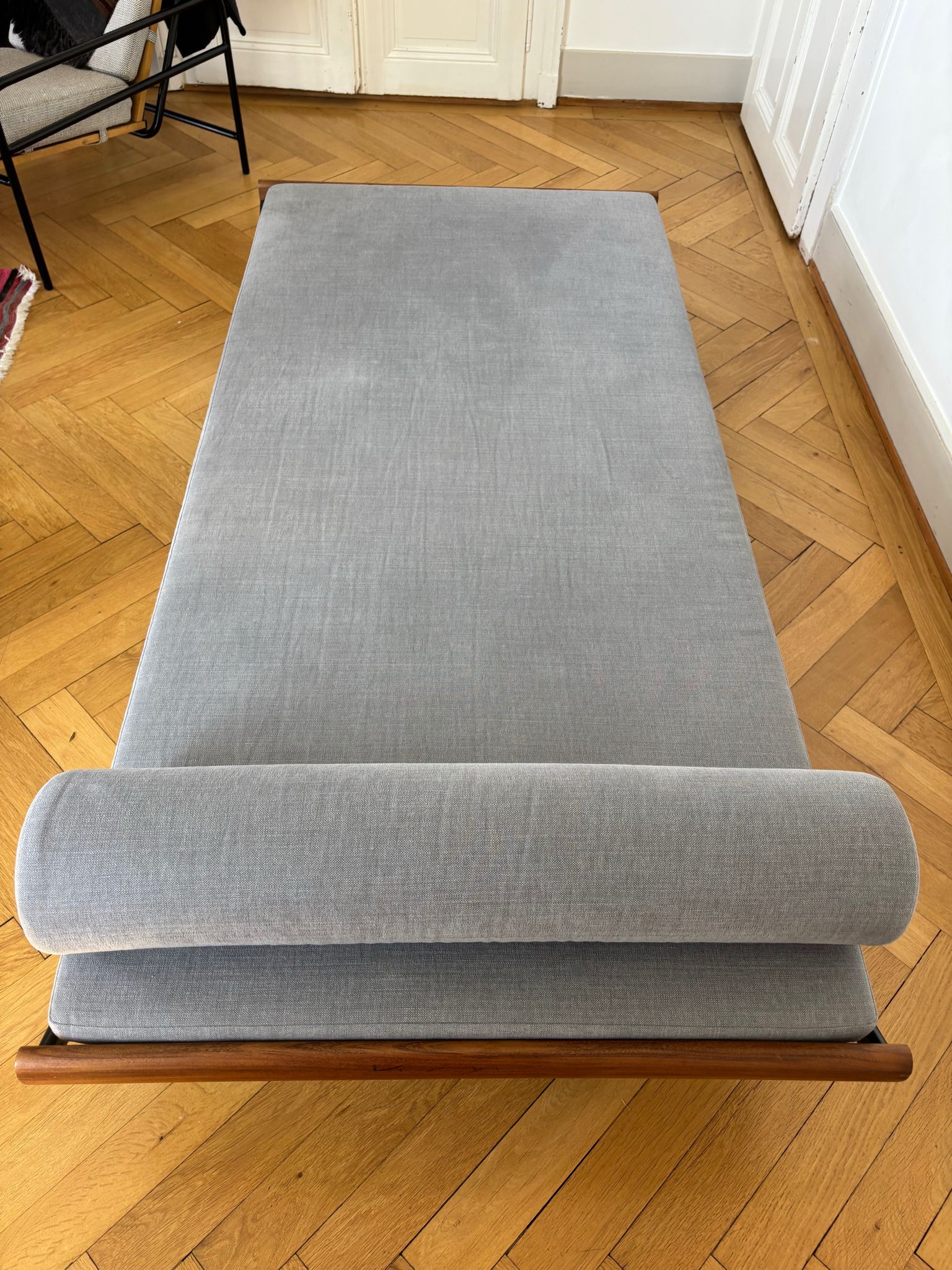 Le sommier métallique est d’origine et en excellent état. L’ensemble du lit a été restauré en 2020 : le bois a été traité (huile de lin), et le matelas (190×90) entièrement refait par le tapissier Vladimir Bosson à Lausanne, dans un tissu haut de gamme de la marque Casamance (collection Paris-Texas, 63 % coton, 37 % lin).