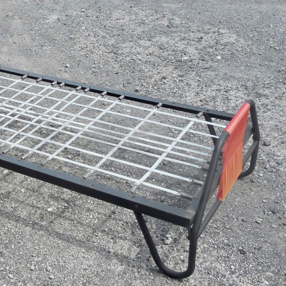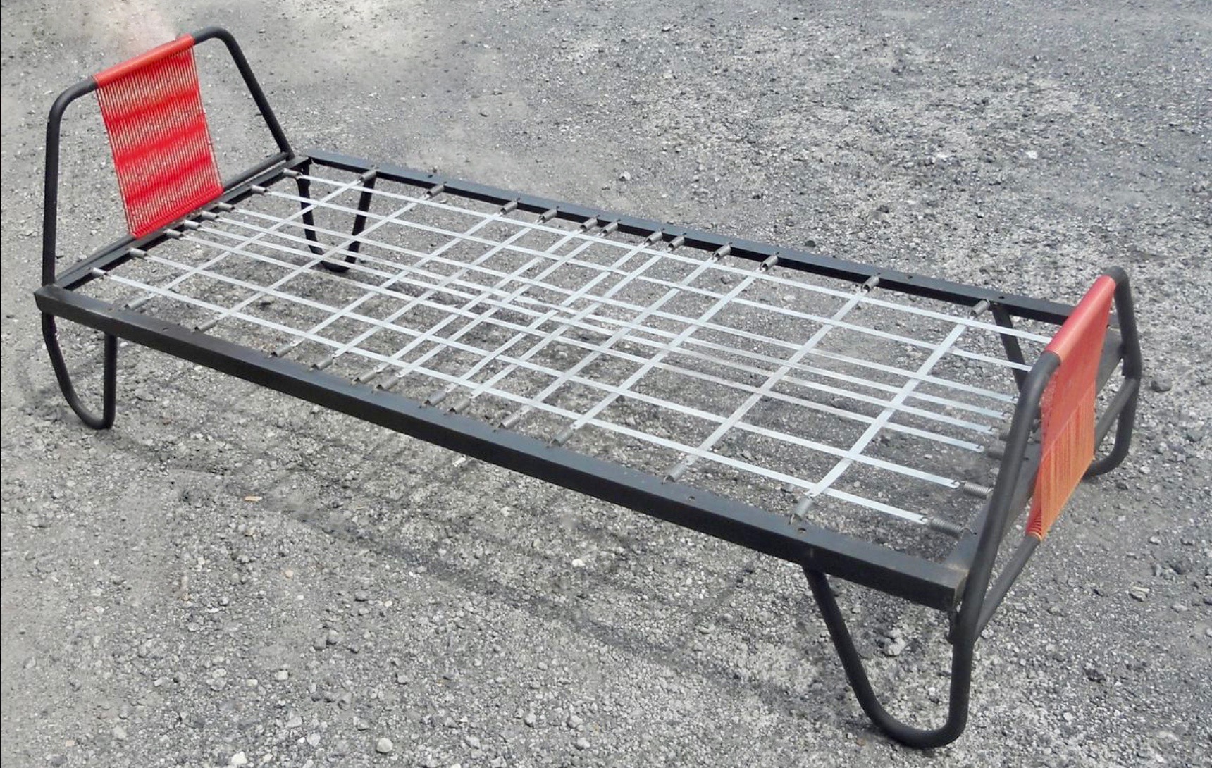 Les têtes de lit sont recouvertes de scoubidous rouges, propres et dans un état impeccable. La structure en métal est faite de tubulaires en acier laqué en noir possédant quelques traces d’usures. Le matelas est fourni. La couleur et la qualité du tissu peut être choisie sur devis.