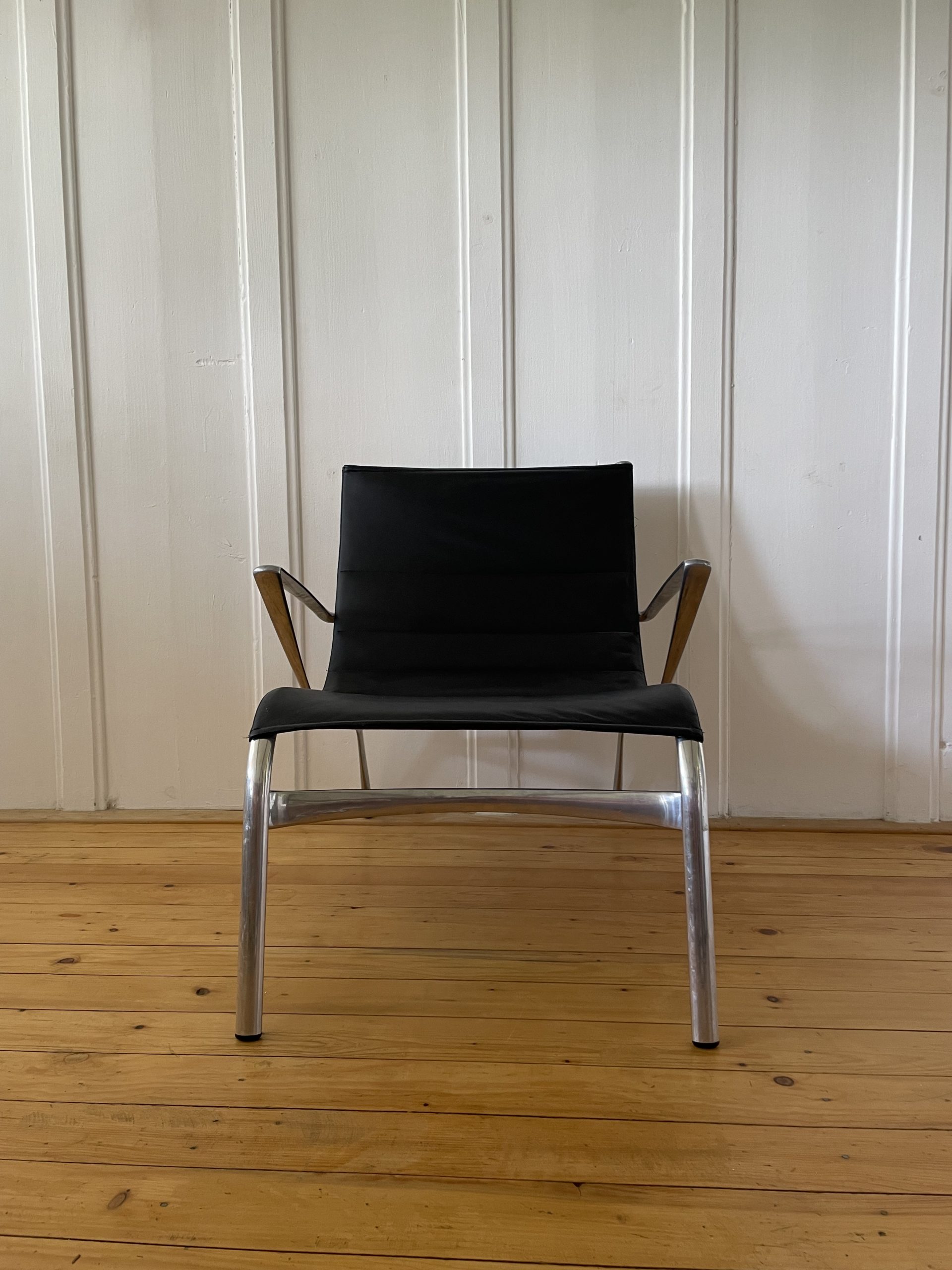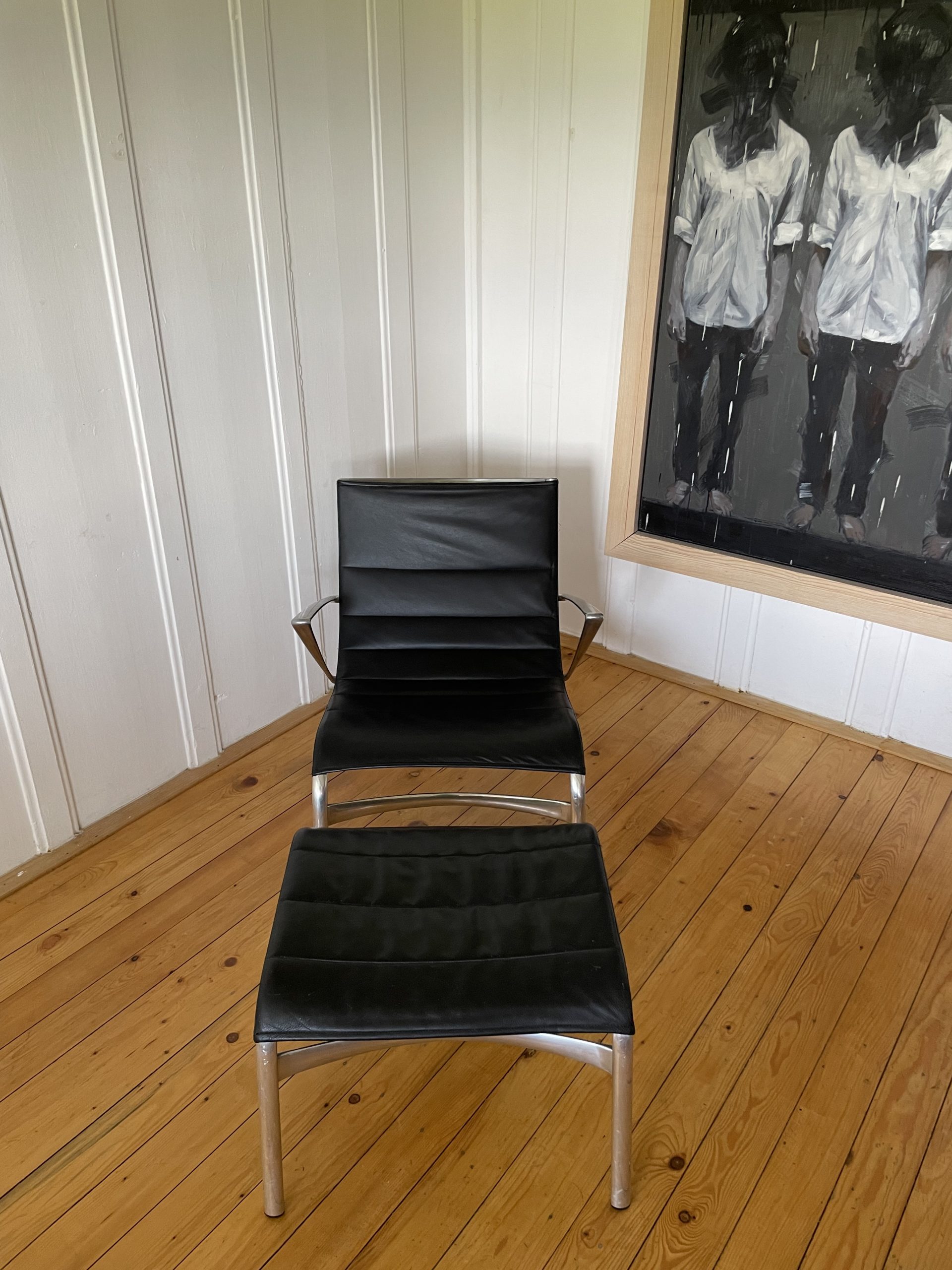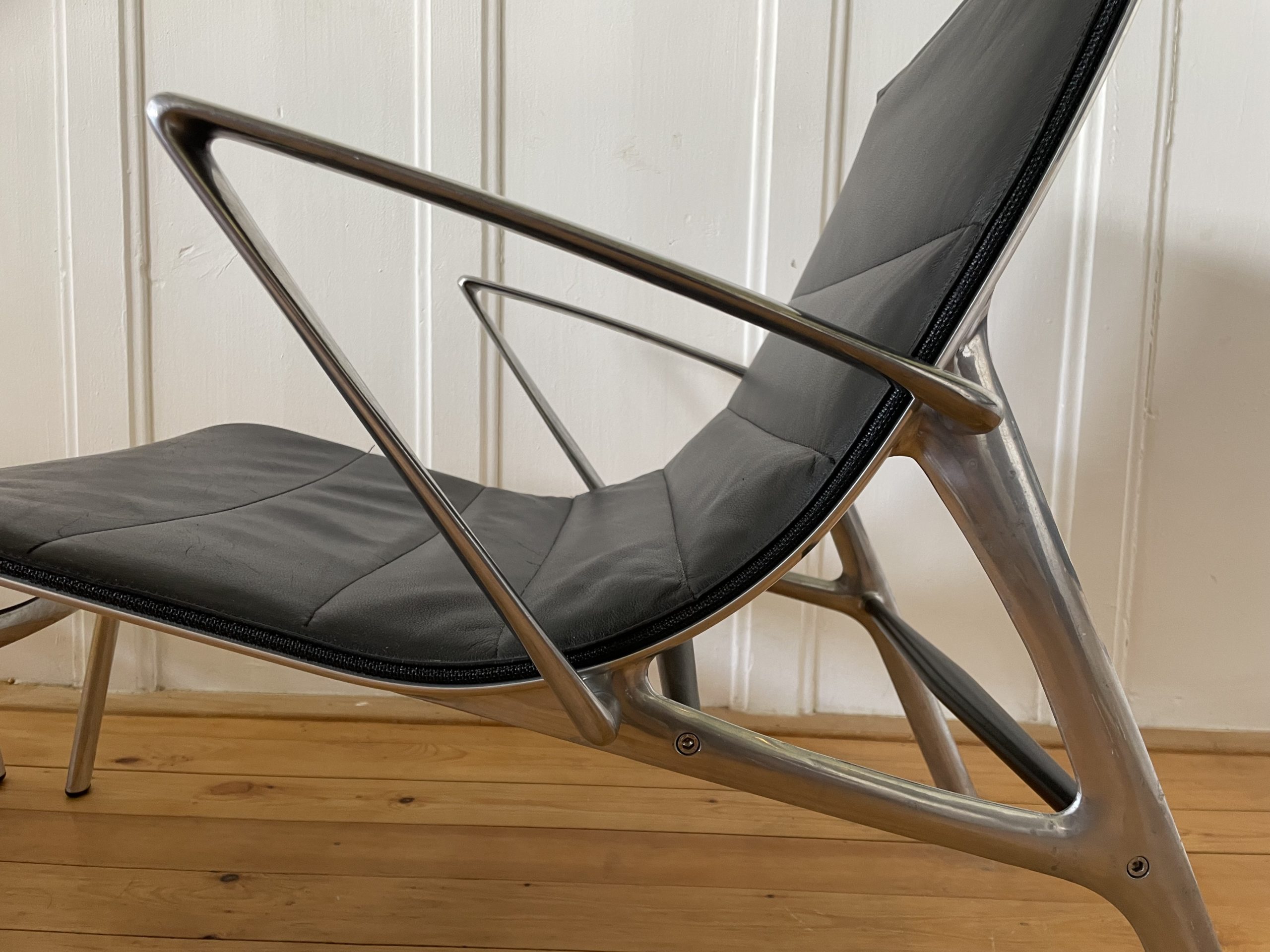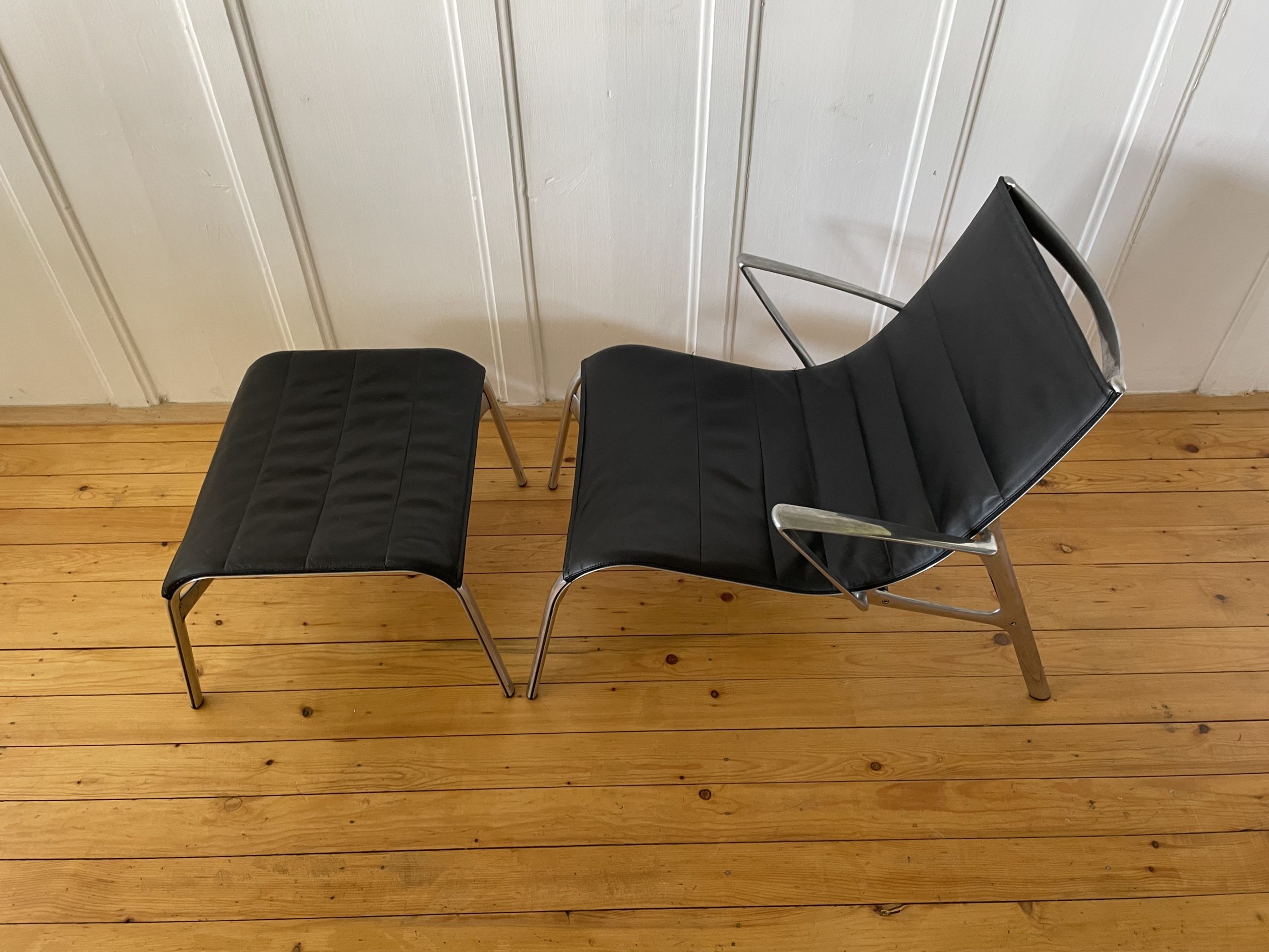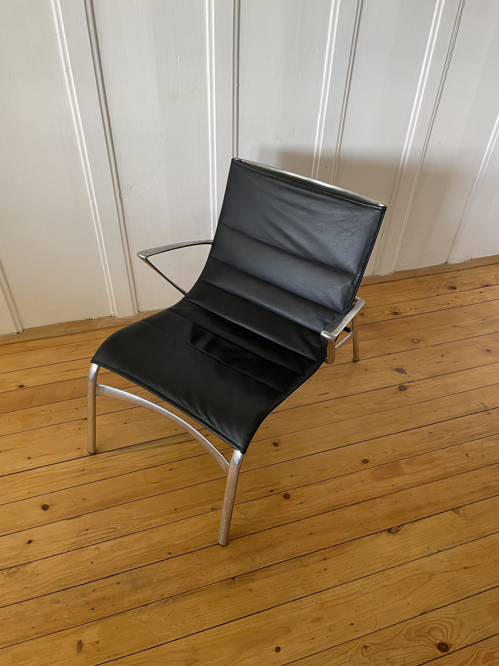 Produit venduFauteuil avec accoudoirs et repose-pied, par Alberto Meda pour Alias. Modèle Armframe 438. Cuir et aluminium. Robuste, léger et confortable. Années 90. N’est plus édité dans ces matériaux. Le repose-pied a des griffures légères (voir photos) sinon très bon état général.