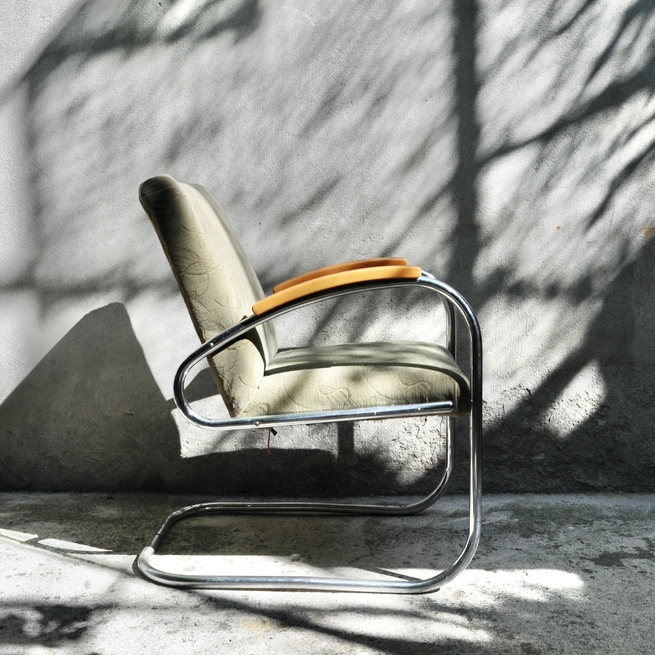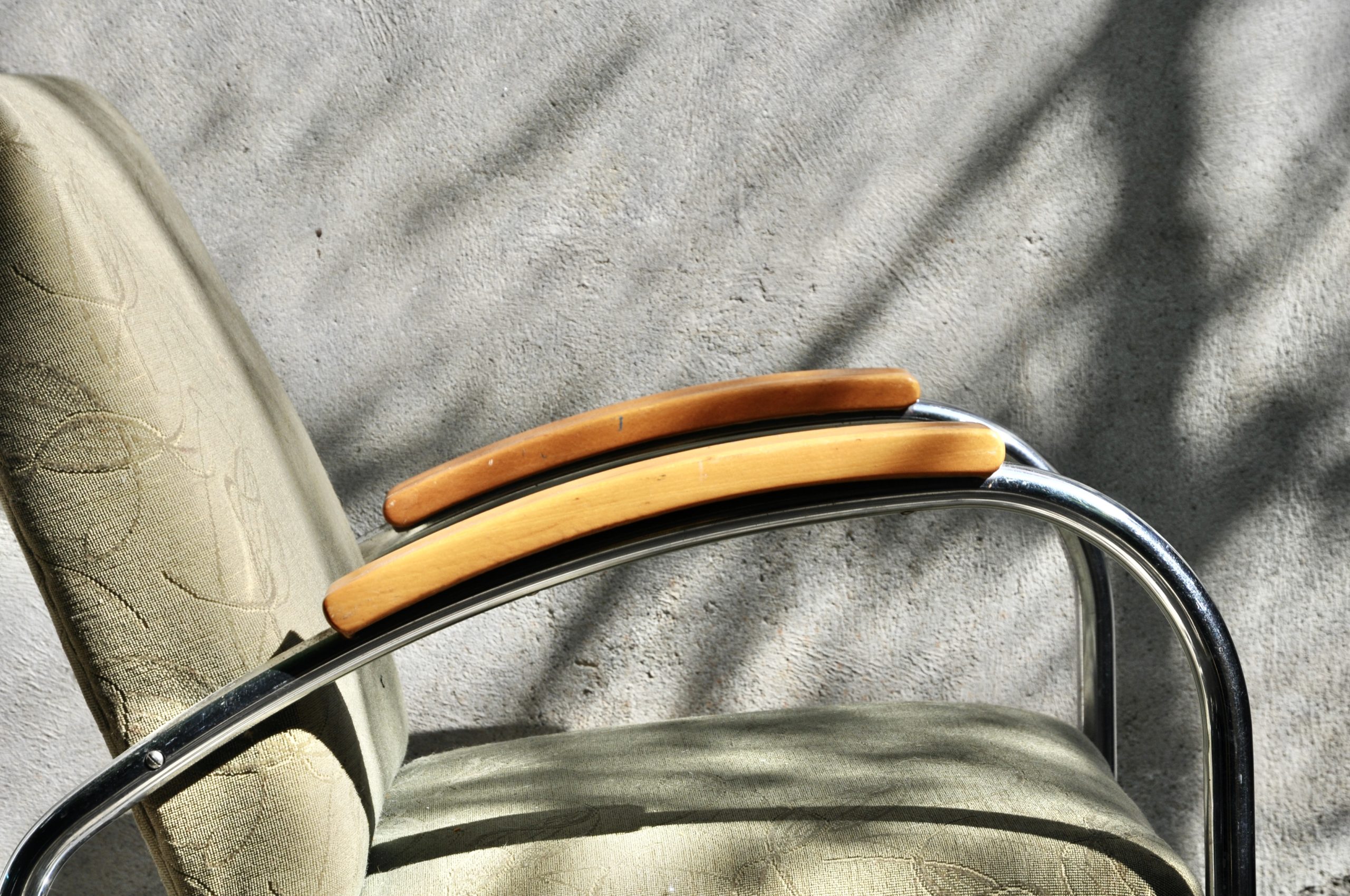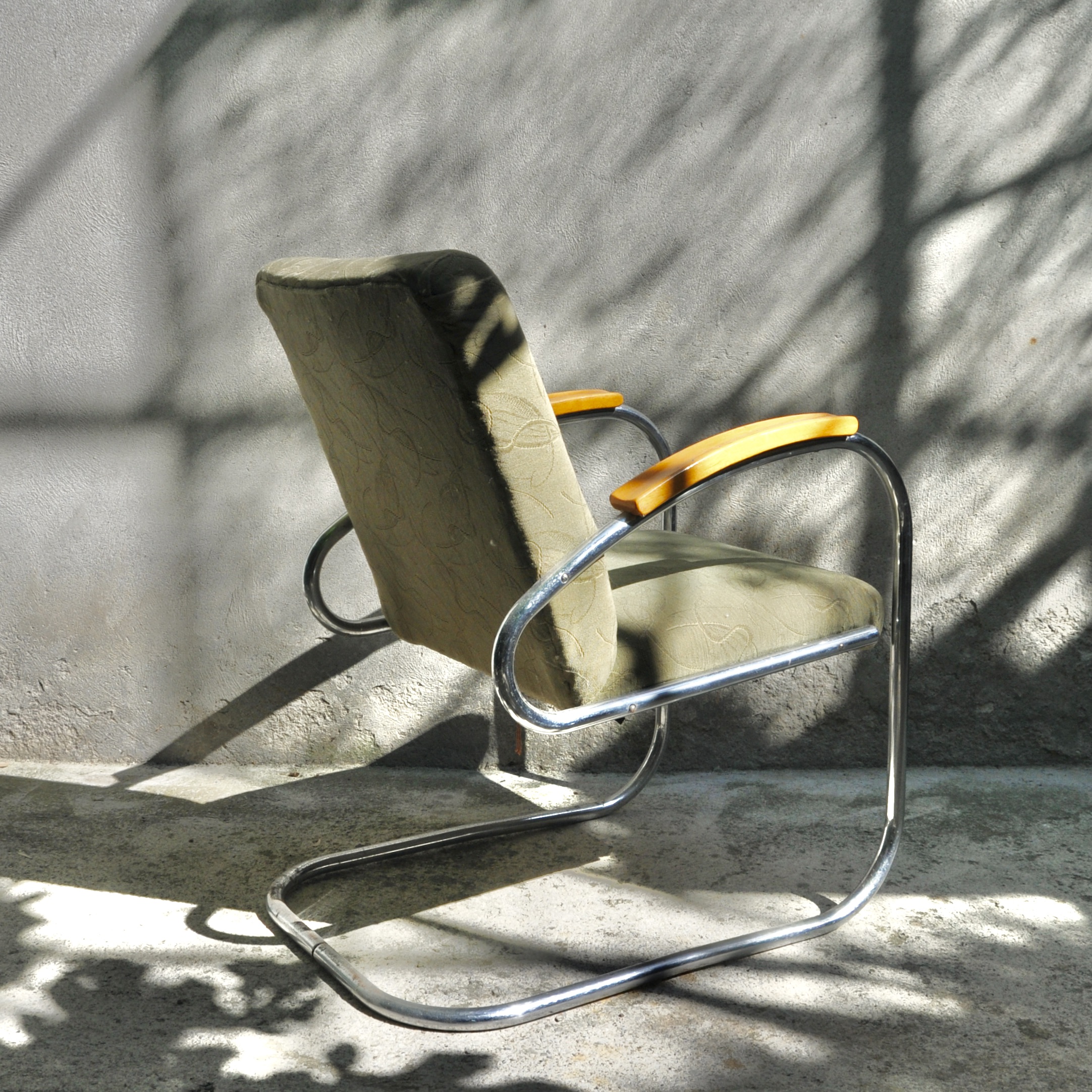 Rare fauteuil cantilever bauhaus allemand, modèle RS 7 édité par Mauser Werke Waldeck en 1950. Le fauteuil possède un piétement tubulaire en acier chromé ne formant qu’une seule ligne continue d’un côté à l’autre de l’assise. Celle-ci, constituée d’un système de ressorts solides très confortable est suspendue à la structure par 6 vis métriques. Les accoudoirs sont recouverts d’une pièce de bois en hêtre massif plié arrondi.