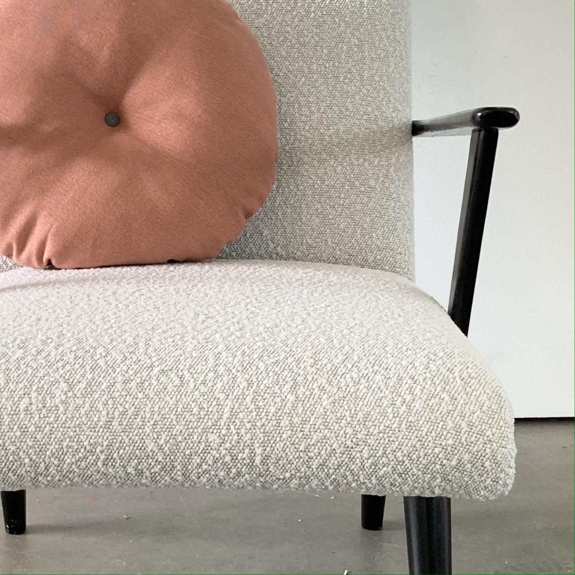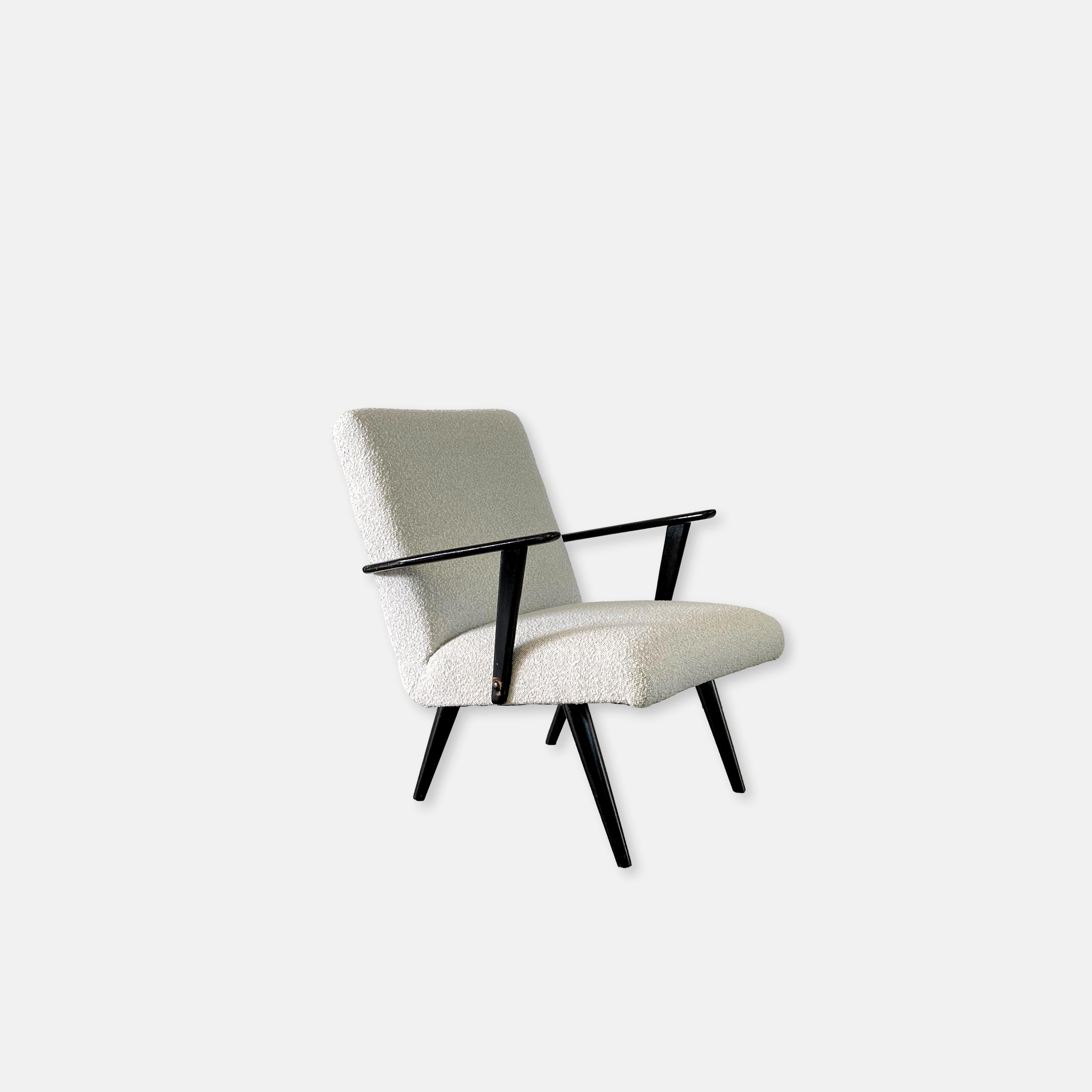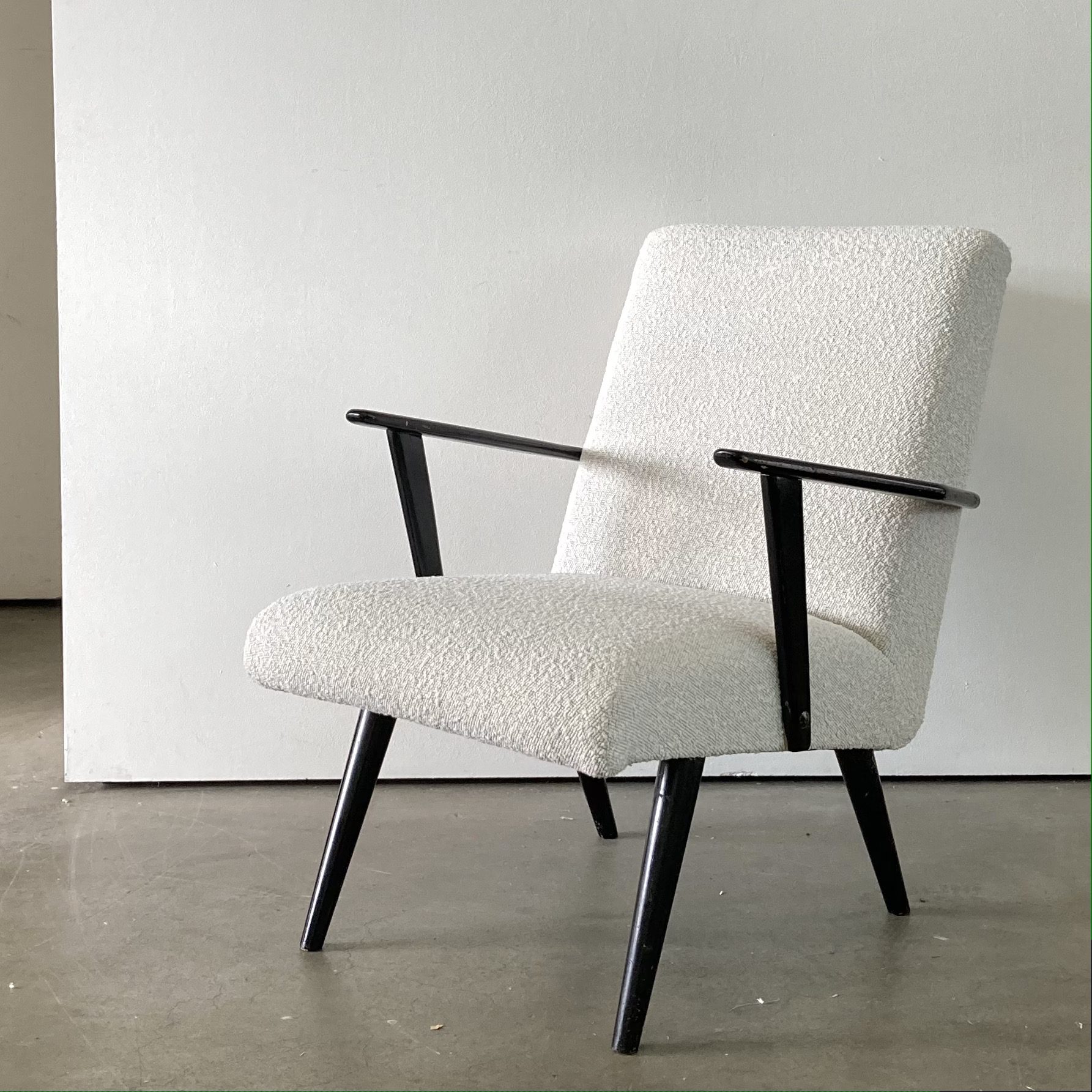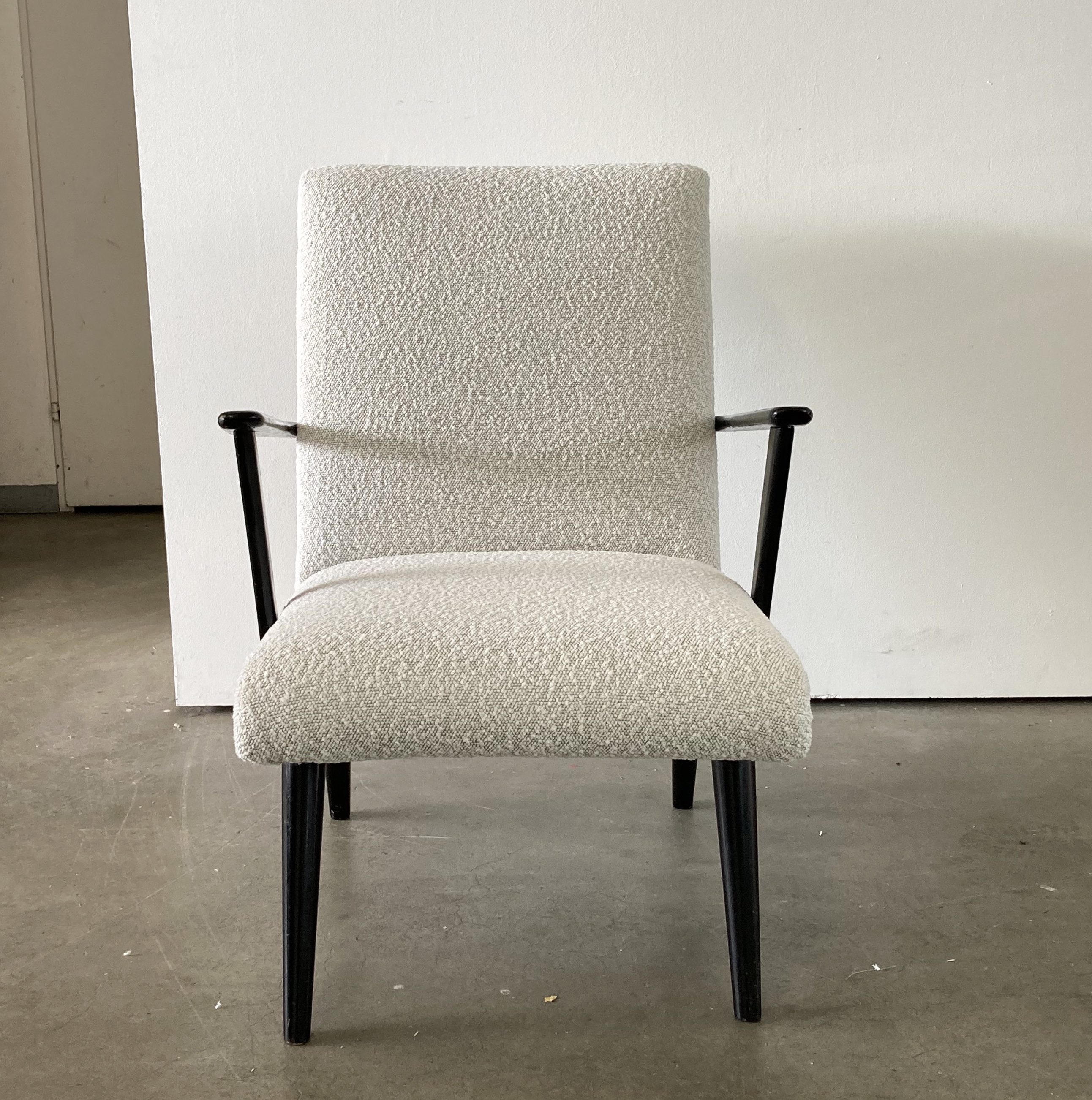 Produit venduPetit fauteuil vintage refait à neuf, rembourrage et tissu bouclé blanc. Pieds et accoudoirs noir patiné par le temps. Petite pièce, très confortable