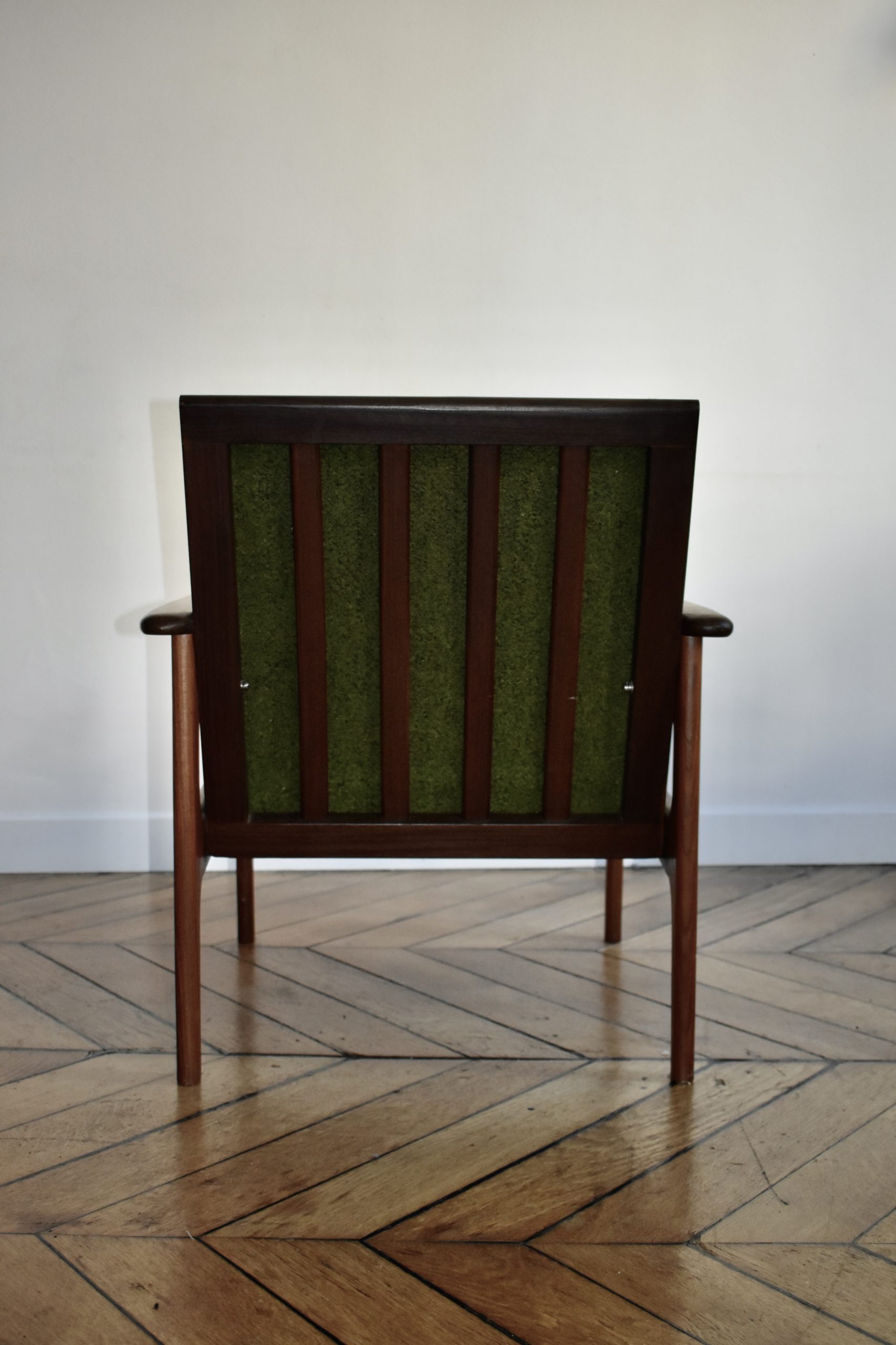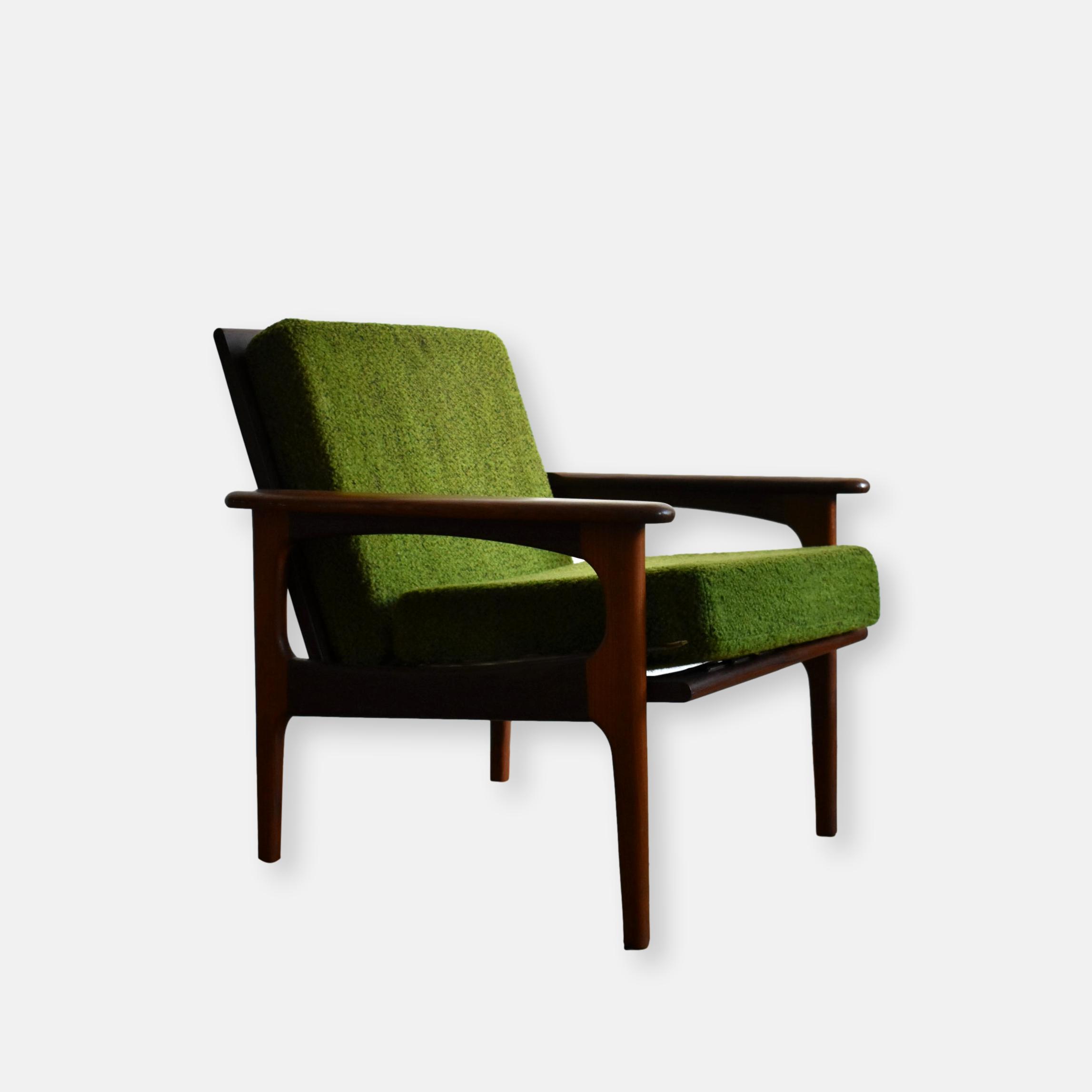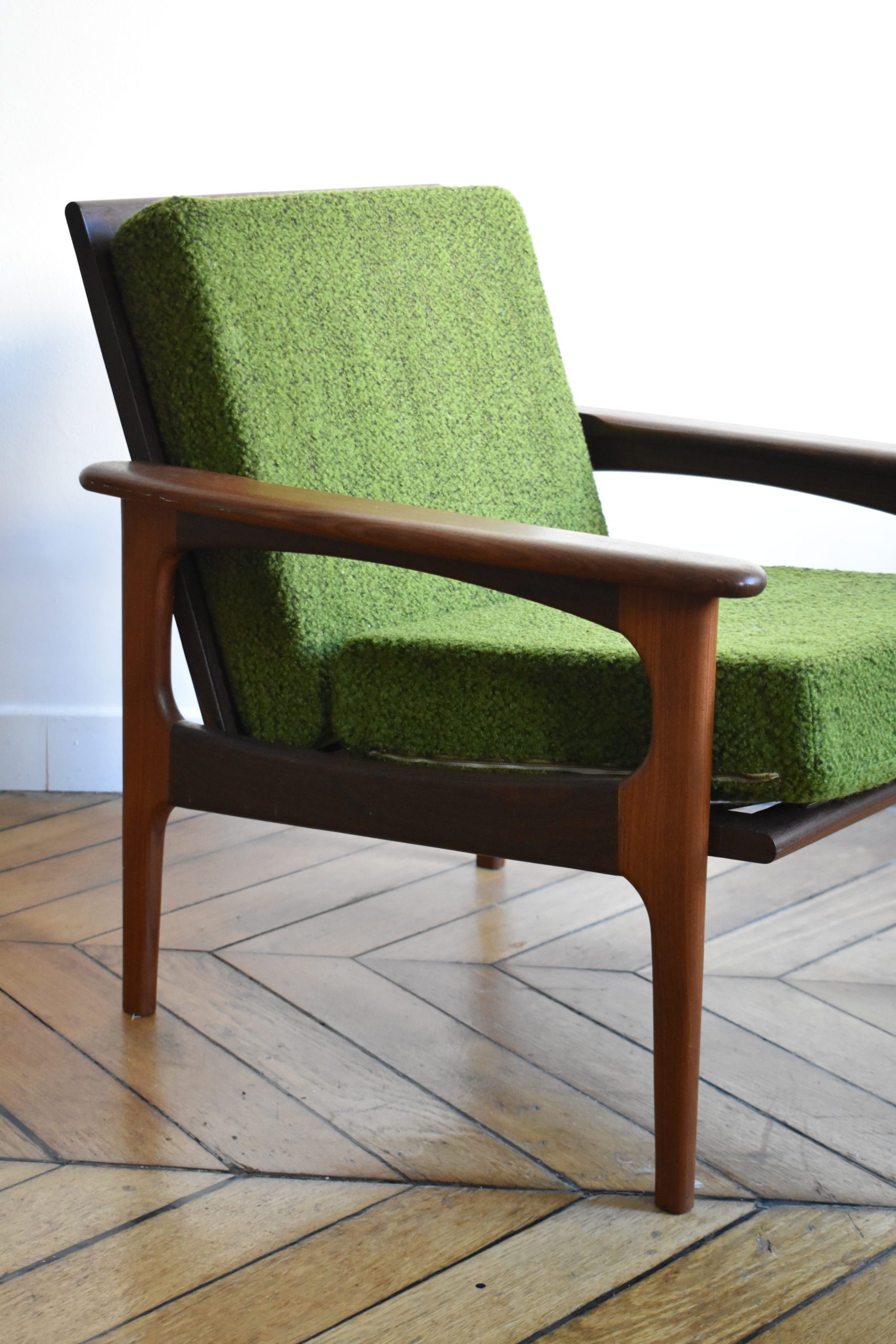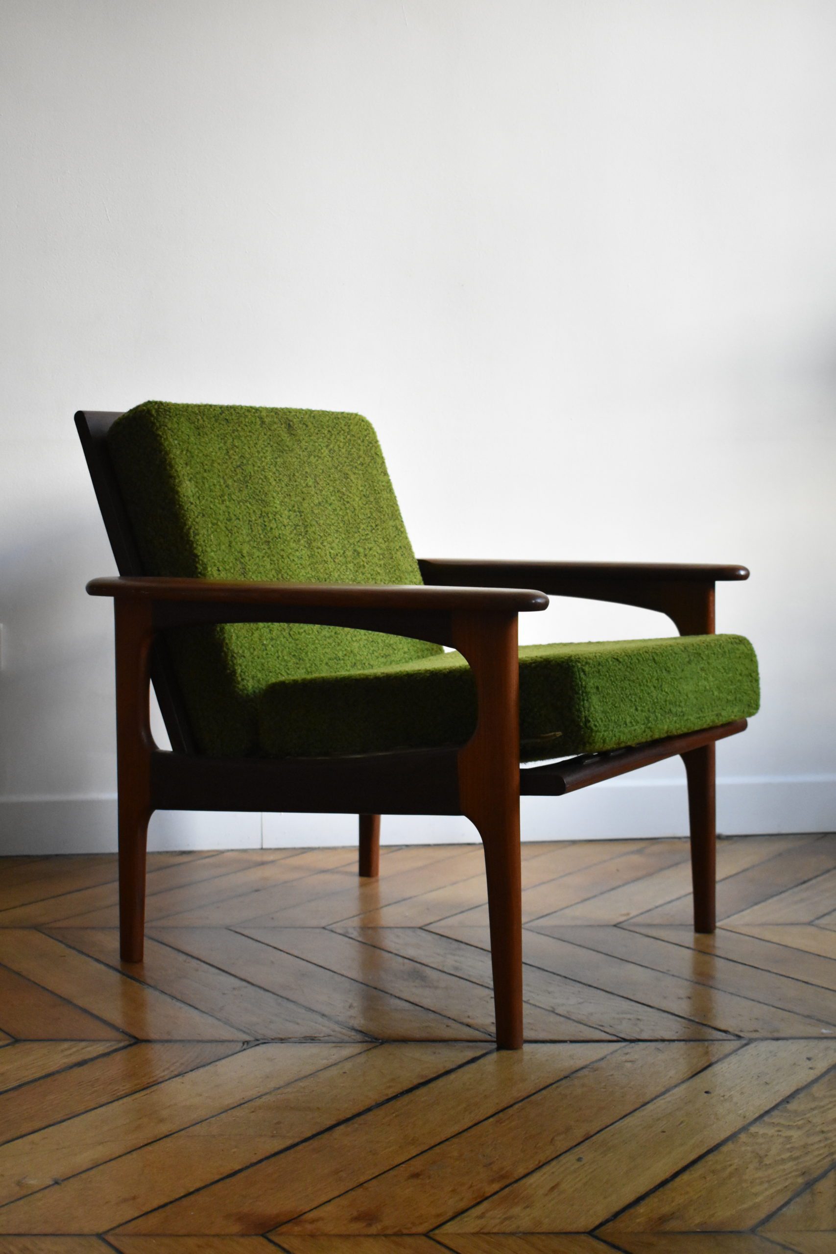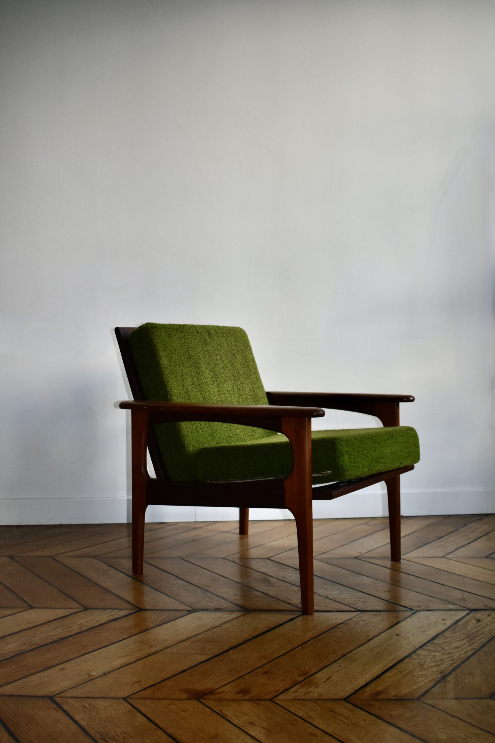 Produit venduClassique fauteuil scandinave. En Teck. Tissu d’origine vert en bon état. (possibilité de changer à votre goût, consultez nous pour les choix).