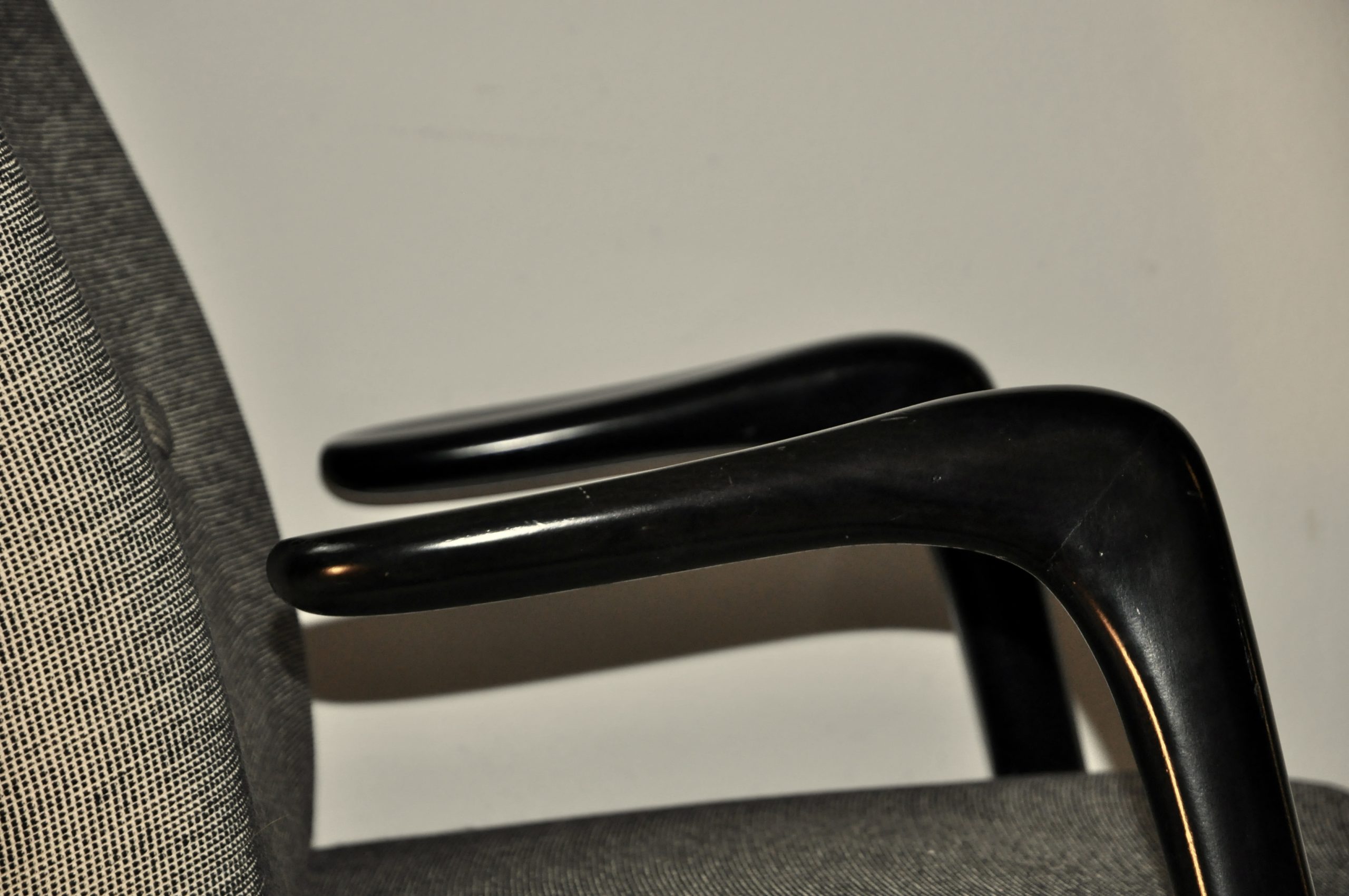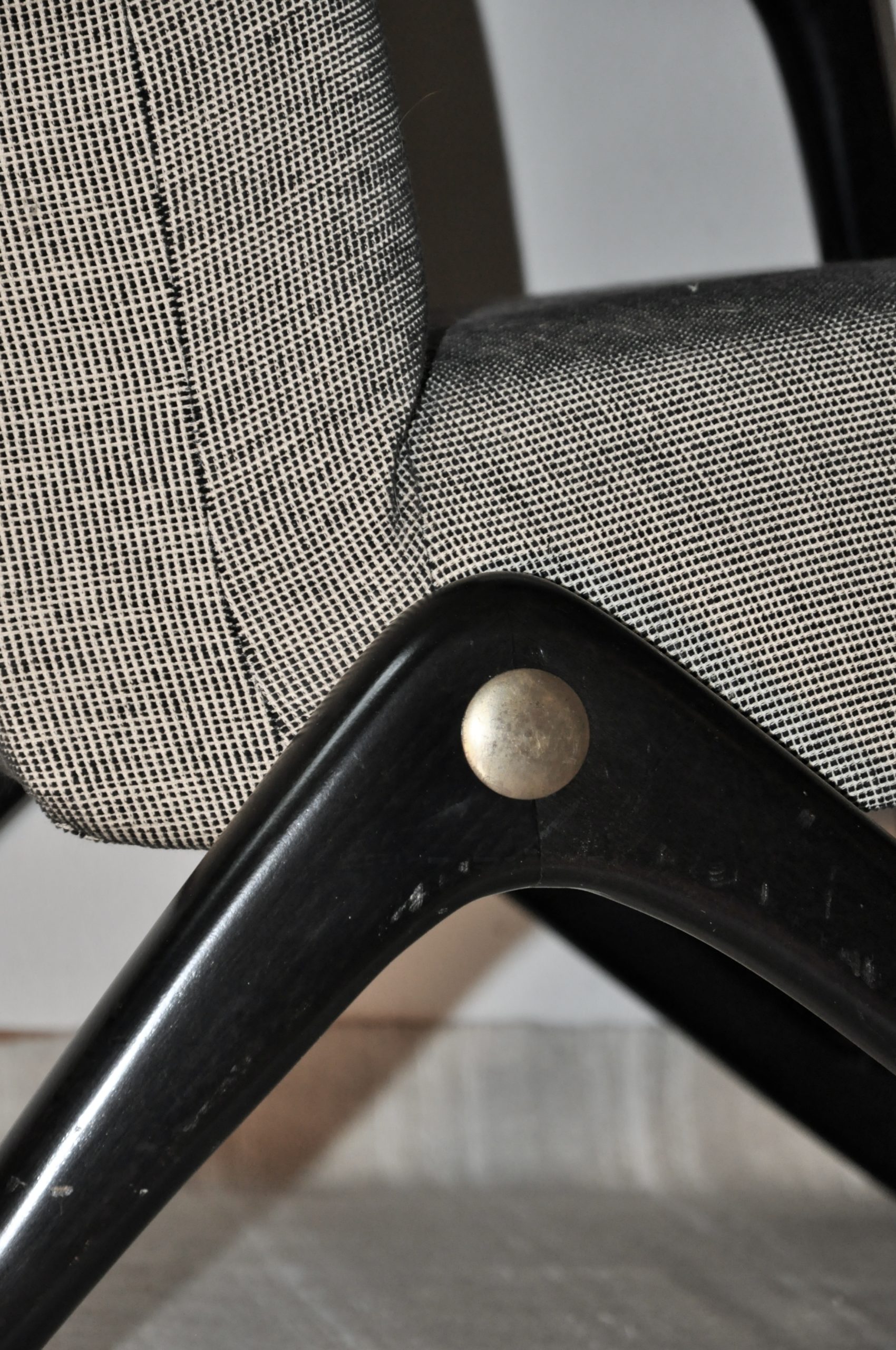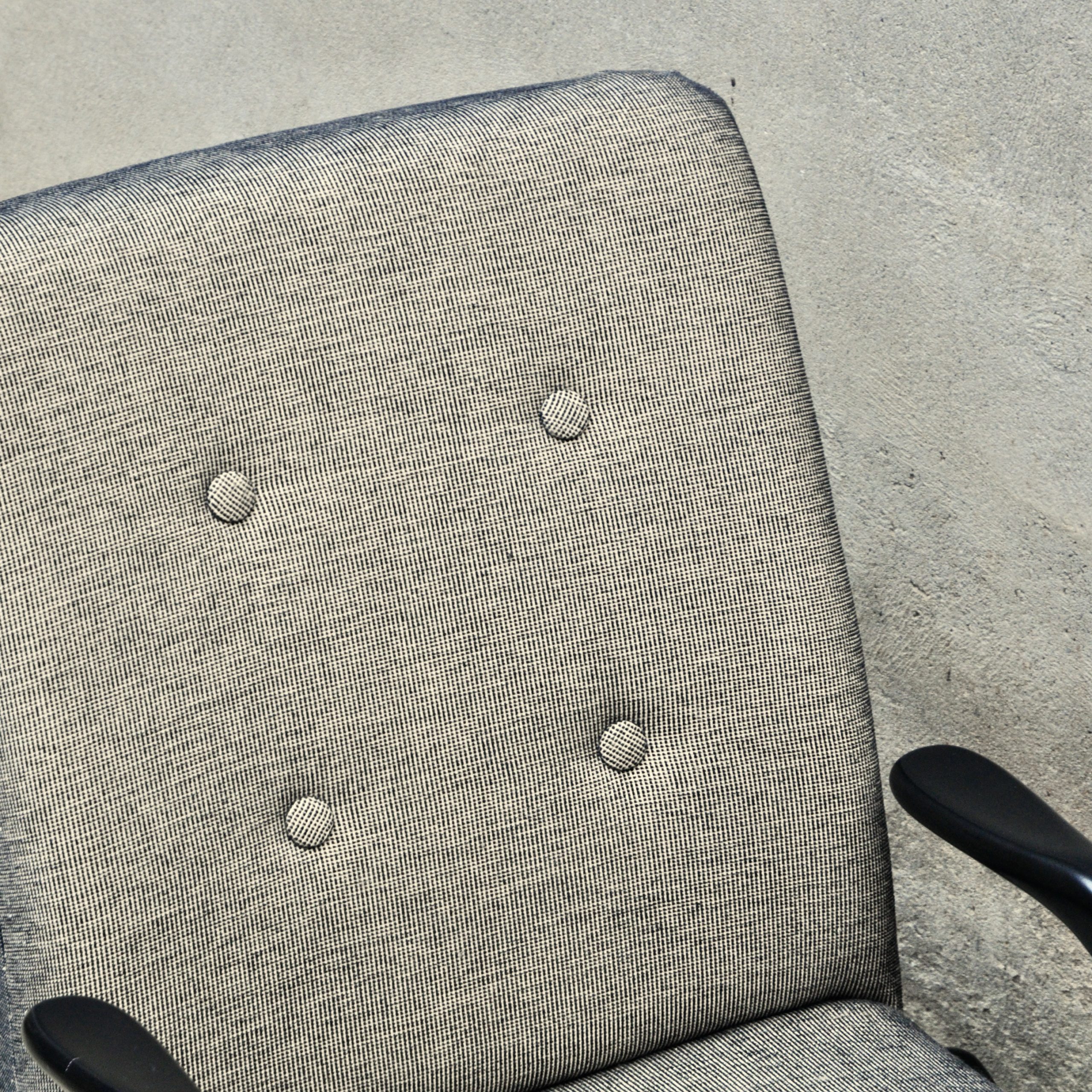 Le fauteuil a été complètement démonté, nettoyé et restauré. Les bois ont été giclé en noir, leur couleur d’origine, et le tissu est neuf. Quatre boutons ont été rajoutés.