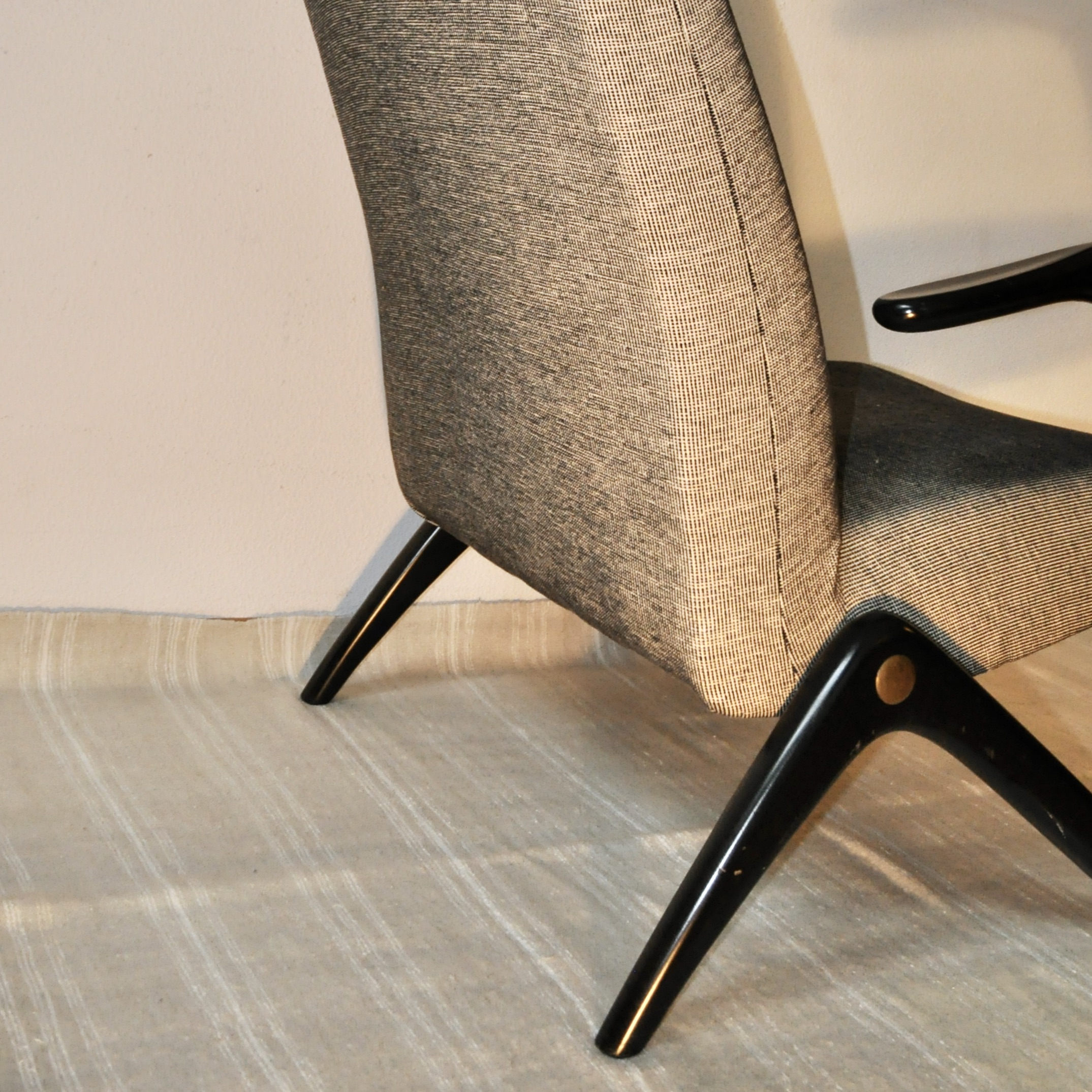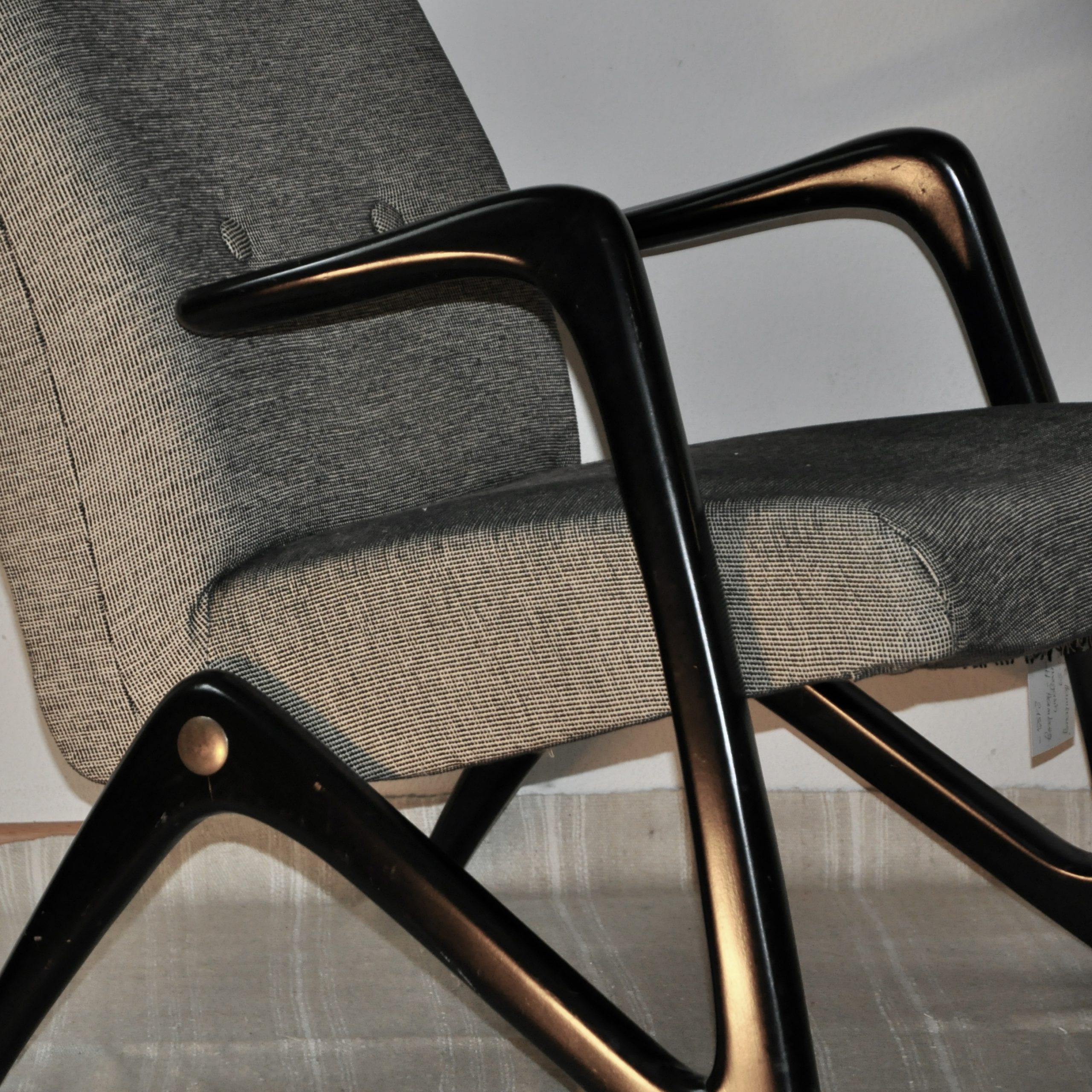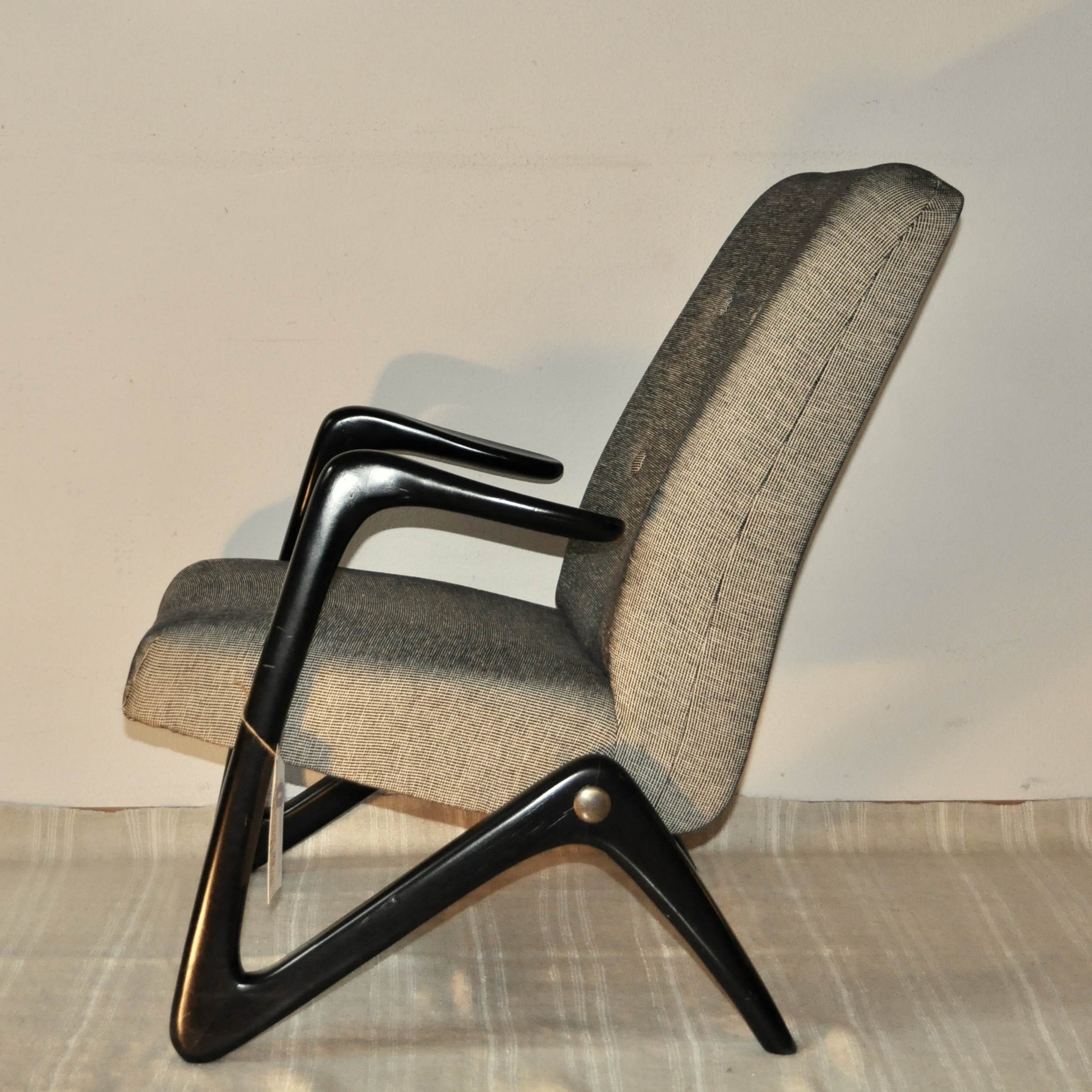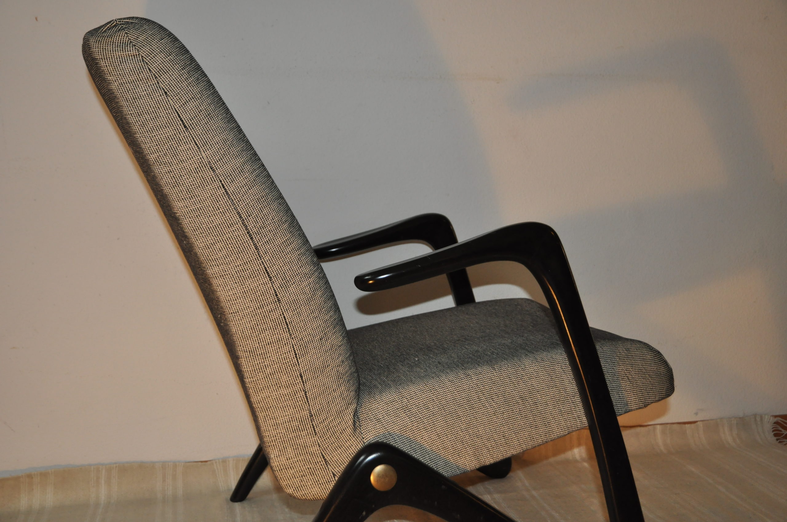 Rare fauteuil en bois des années 1050-59 aquis par un client en 1959 dans un magasin de mobilier design, Möbel Borrnhold, à Hambourg. Ceui-ci existe toujours mais n’a pas pu me donner des précisions sur le nom du designer et/ou son fabricant. Il semblerait qu’il soit l’œuvre du designer Bertil v. Behrman. Le fauteuil produit, probablement dans les années 50, sa structure en bois le prouvant, possède un piètement d’une modernité absolue. Avec ses lignes courbes en zig-zag, il rappelle le modèle S6 conçu par le designer belge Alfred Hendrickx en 1958 pour Belform ou la chaise longue Linea Z du designer brésilien José Zanine Caldas fabriqué par Movies Artisticos en 1950 ou encore un modéle de la même année, celui du fauteuil Z lounge chair du designer Bengt Ruda Pour Nordiska, Suède.