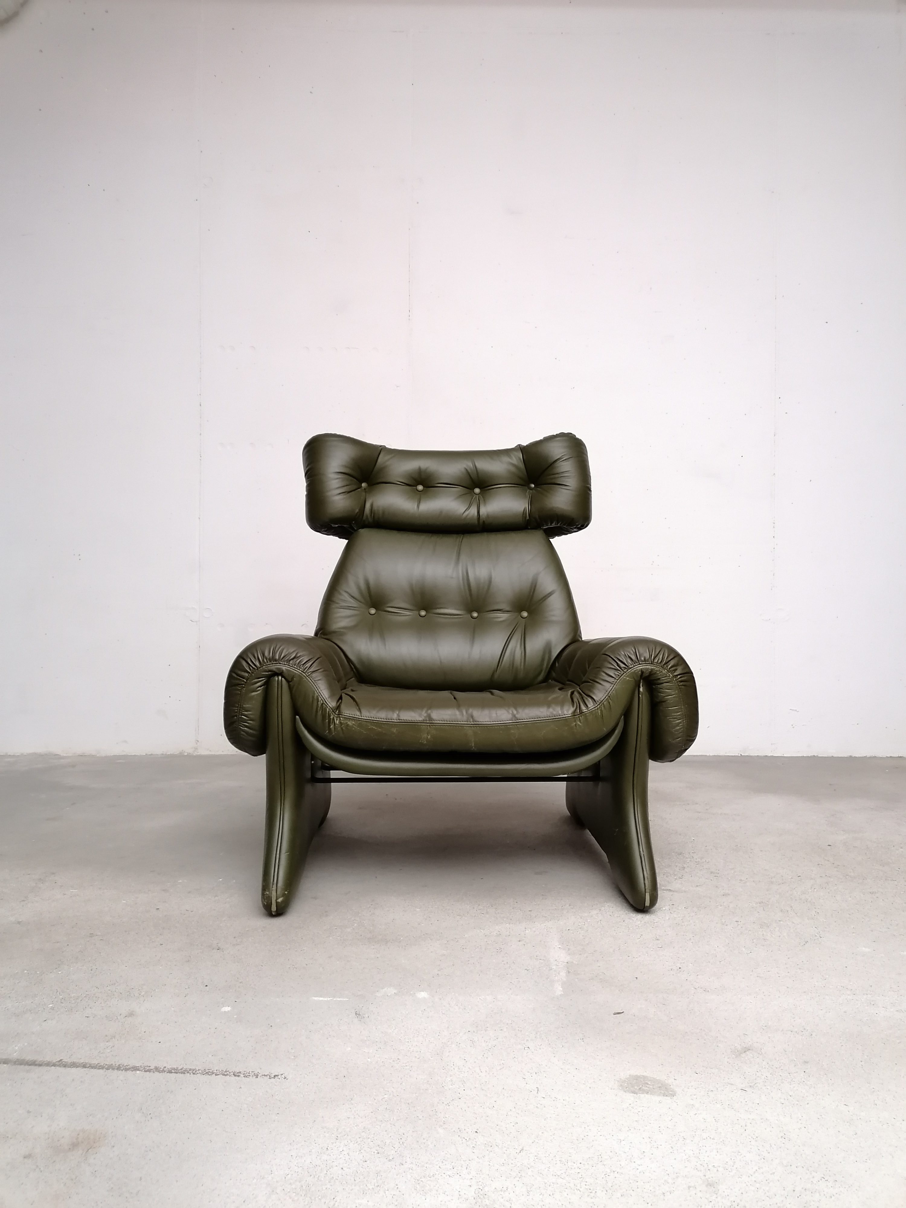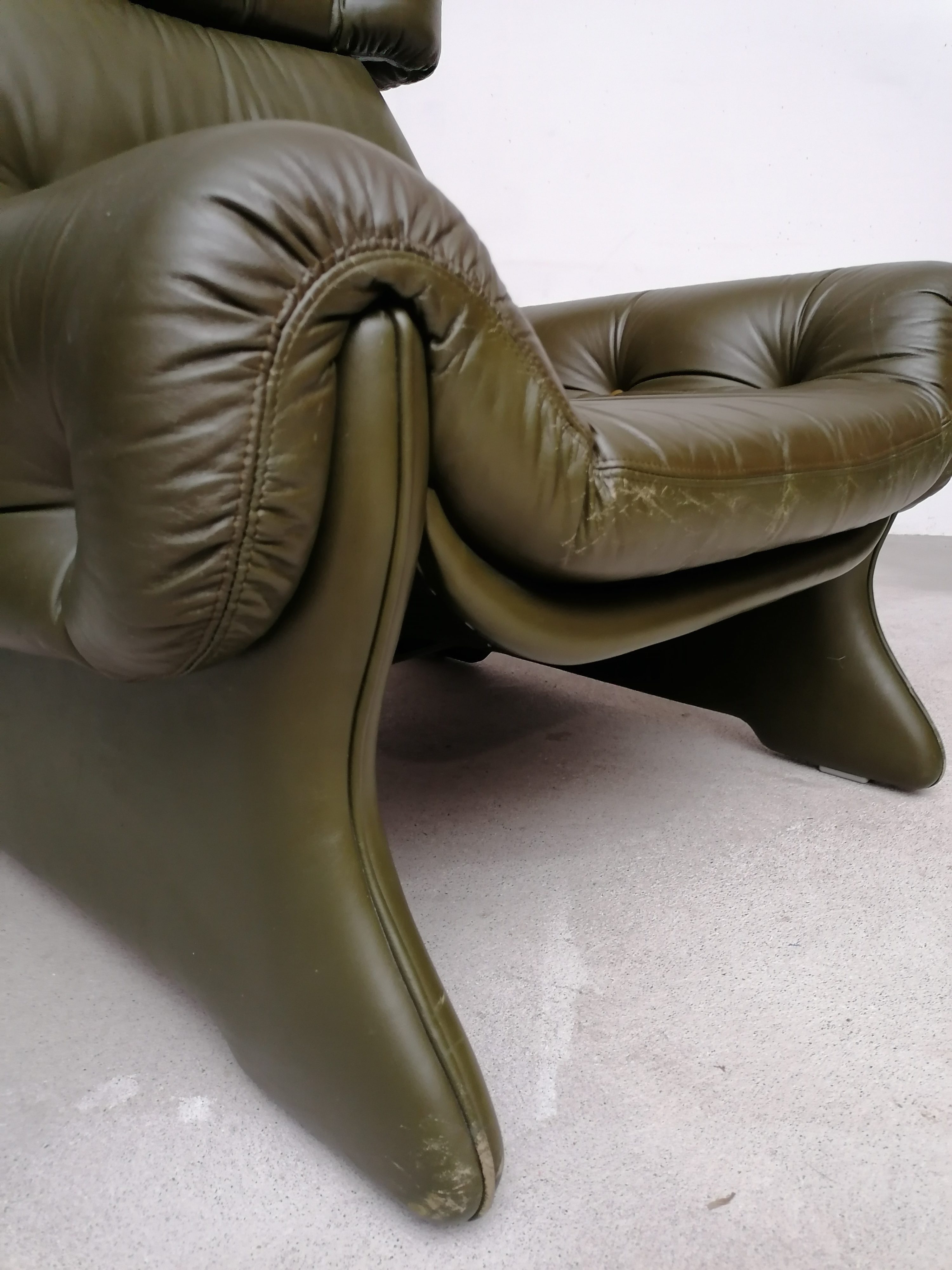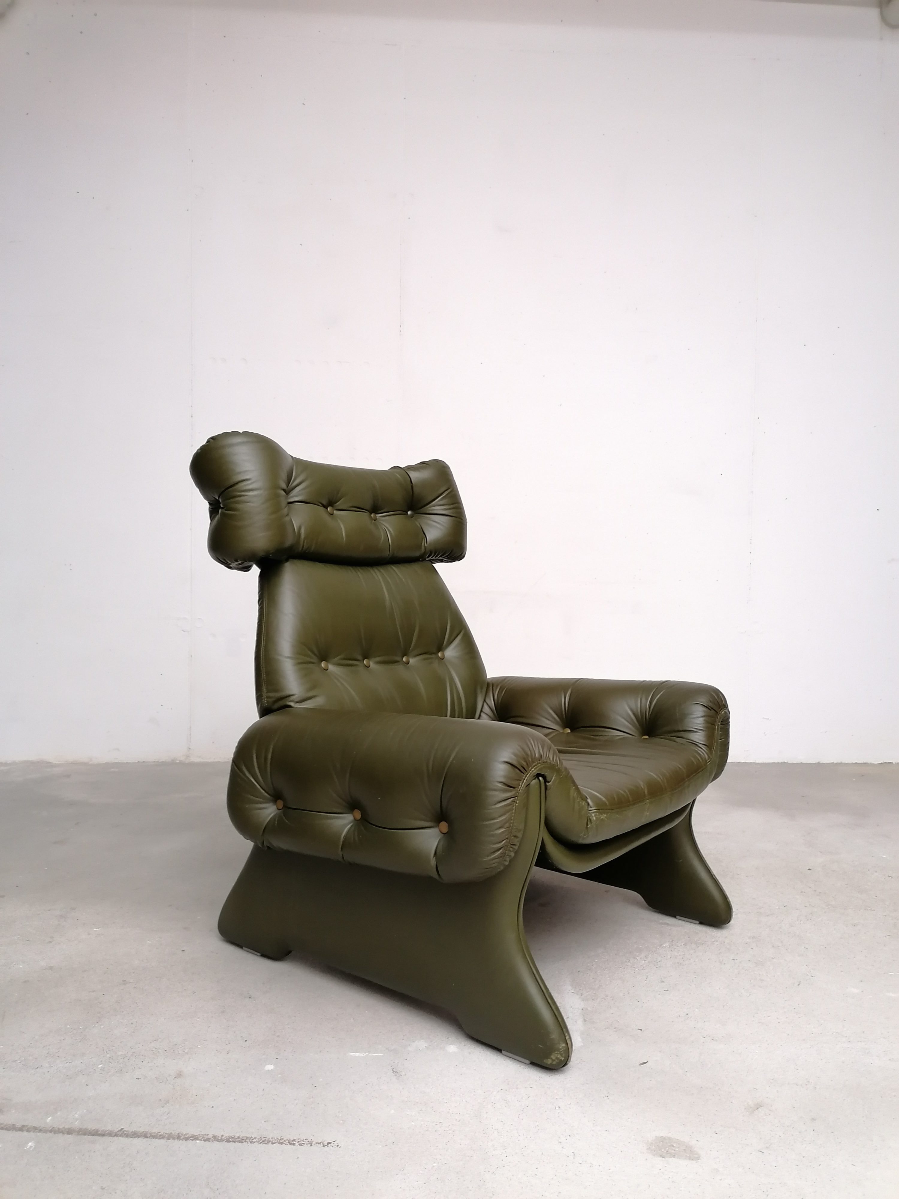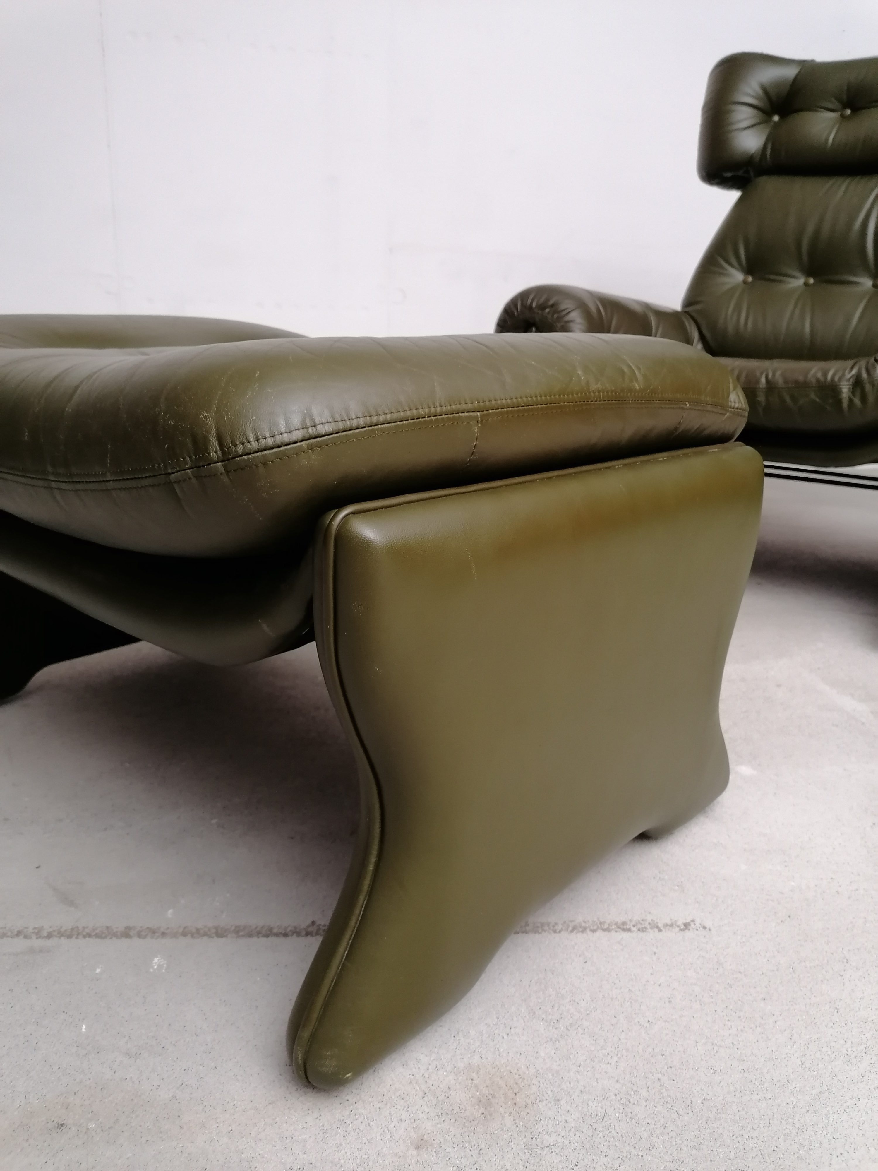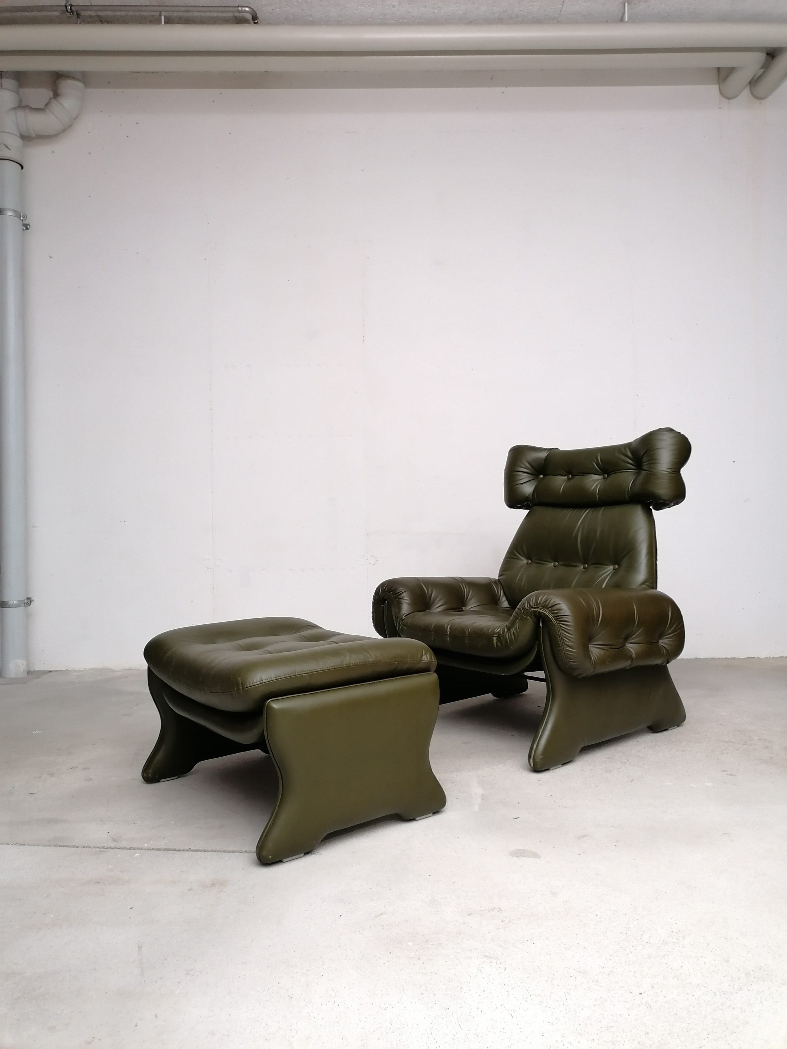 Produit venduFauteuil en cuir vert au look futuriste et design italien des années 70 avec son ottoman.