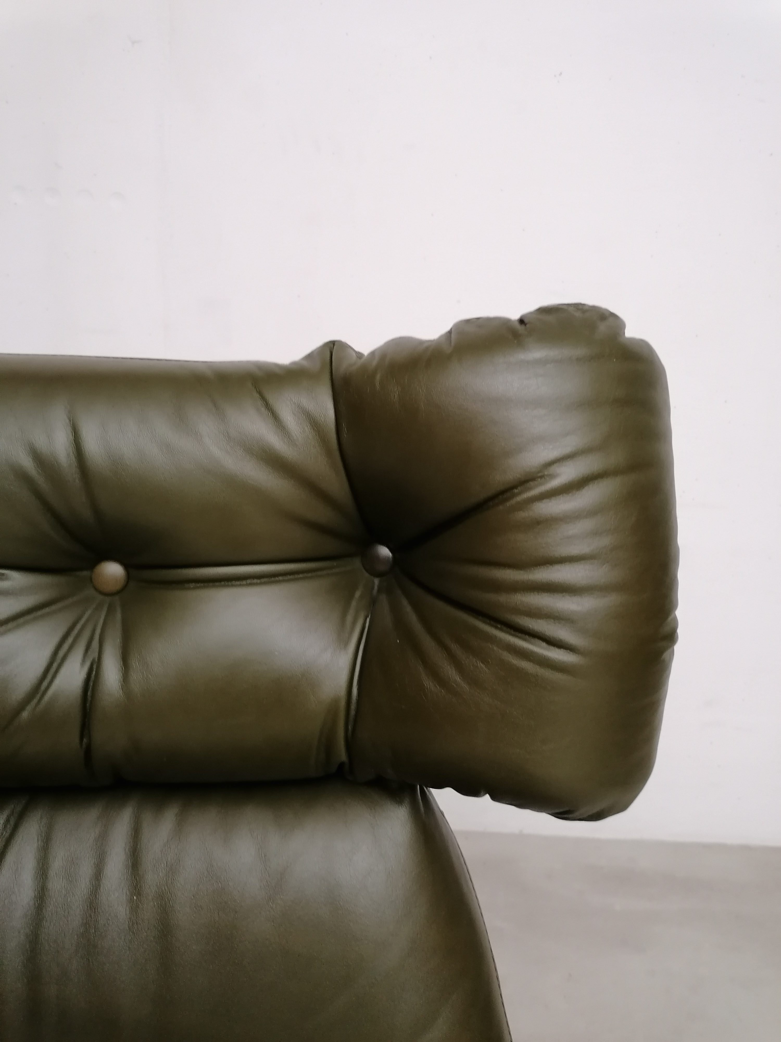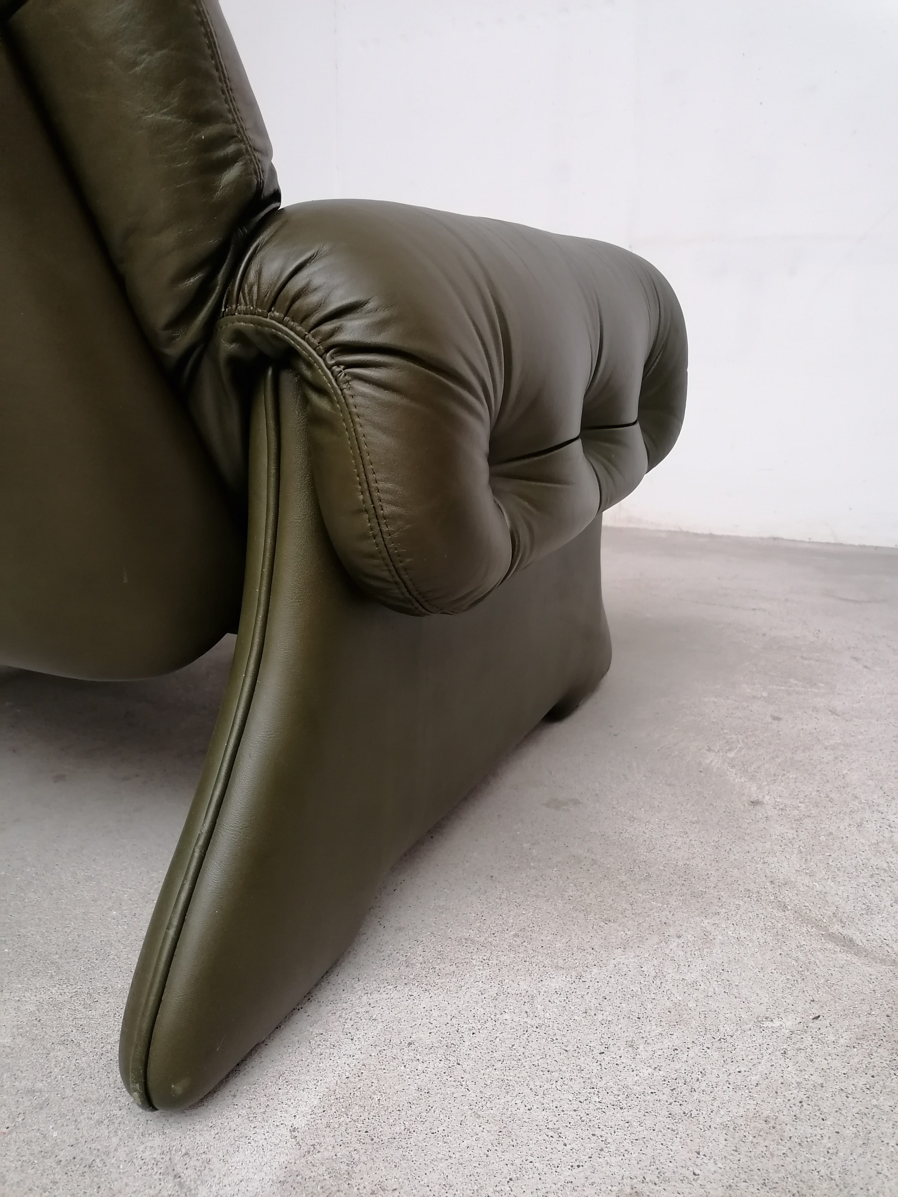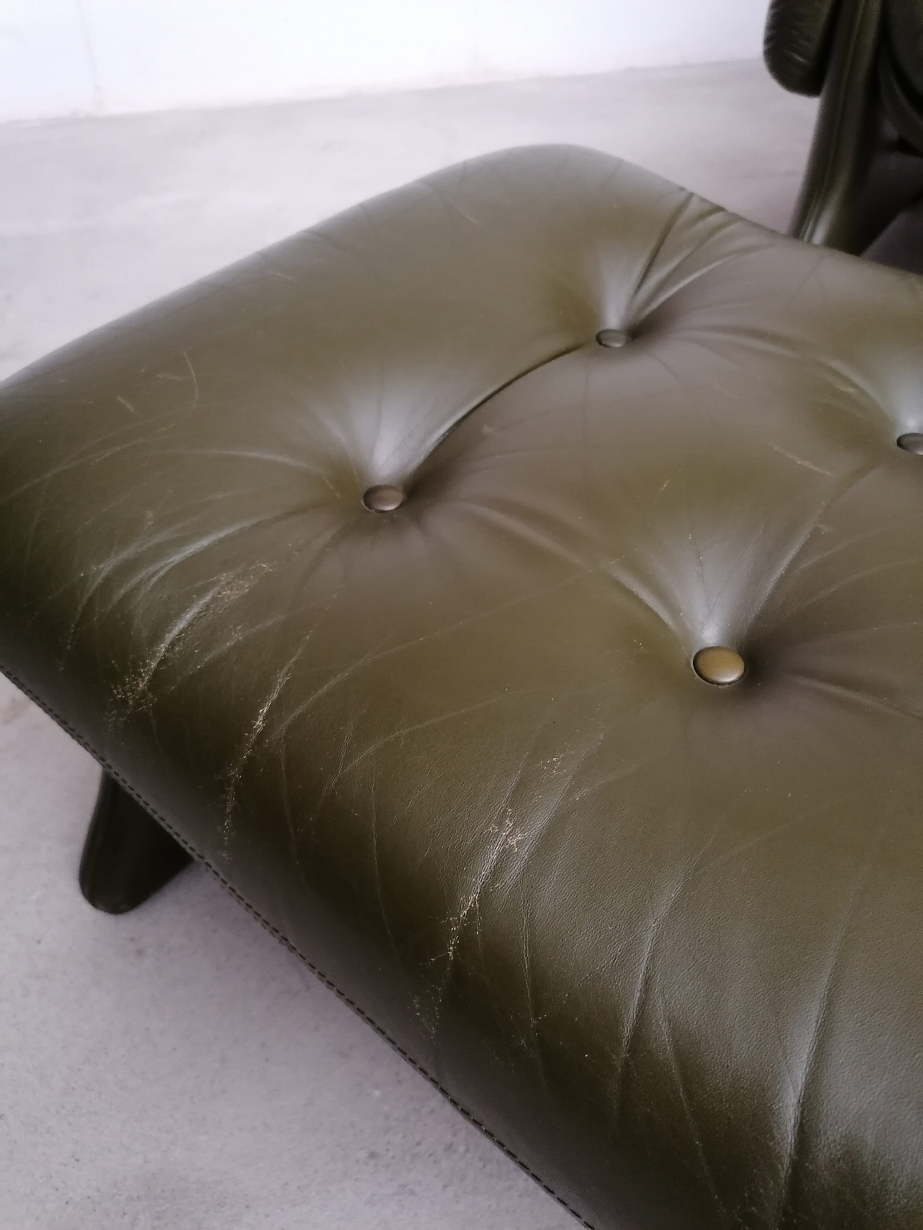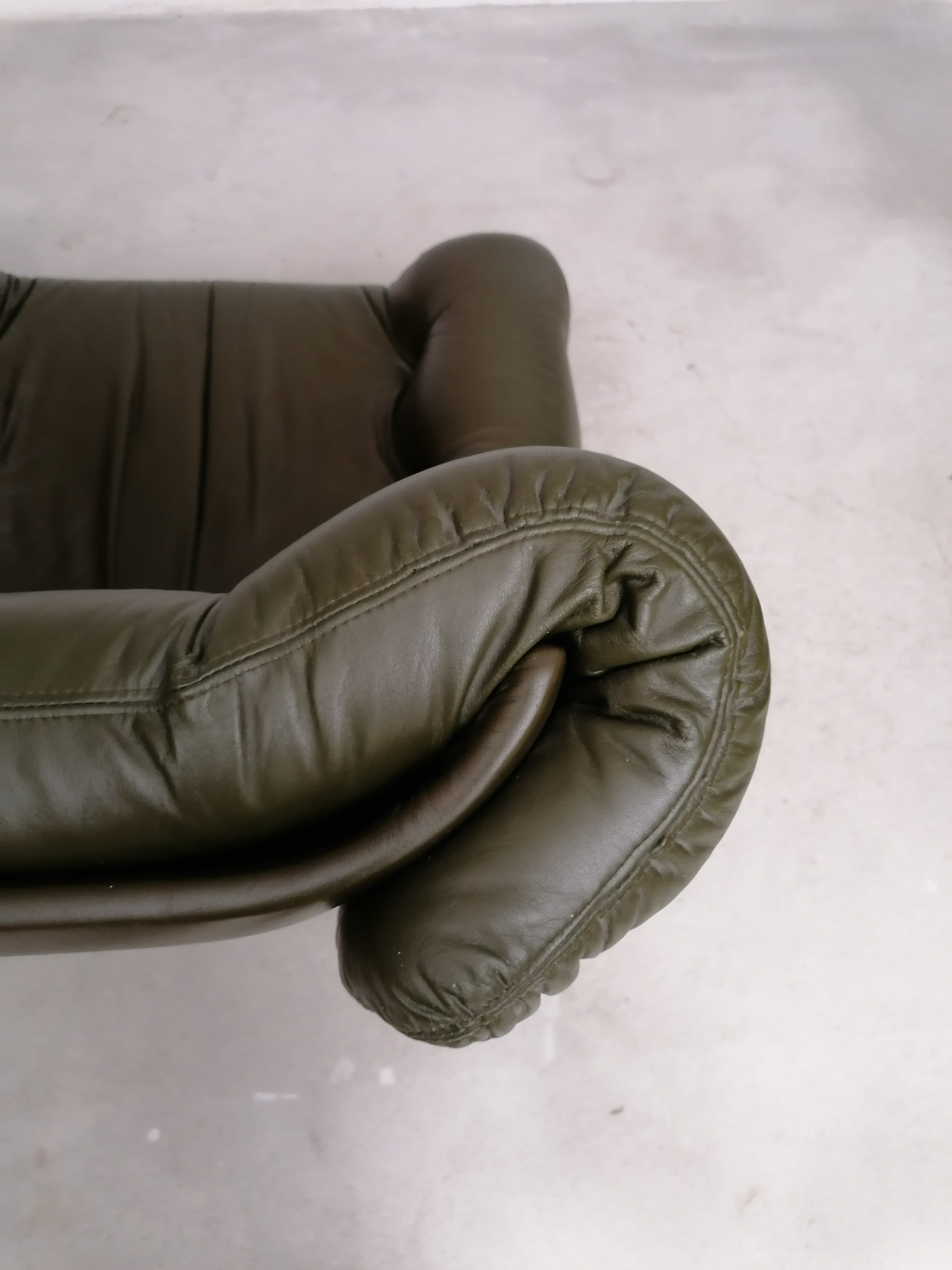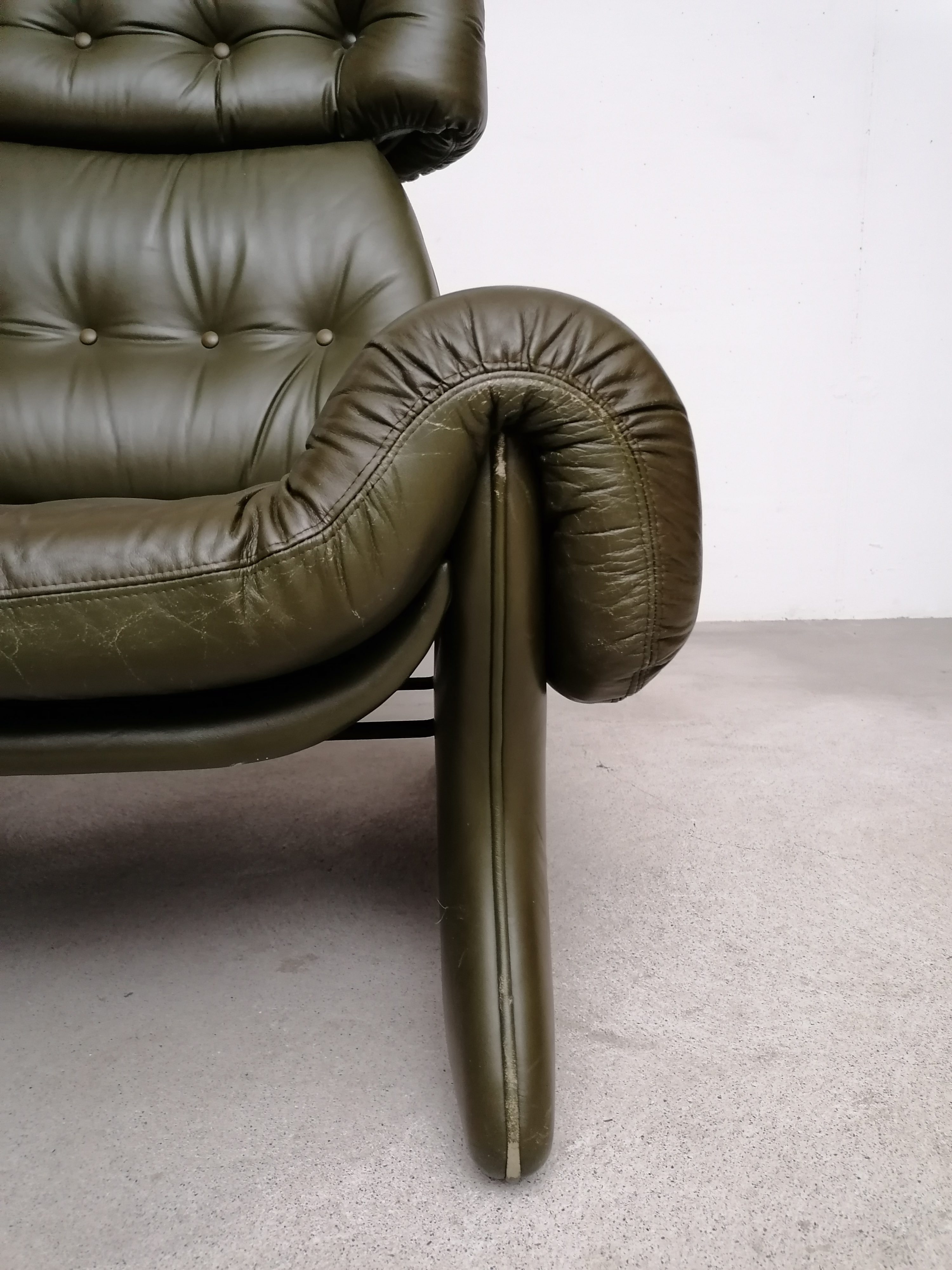 Produit venduFauteuil en cuir vert au look futuriste et design italien des années 70 avec son ottoman.