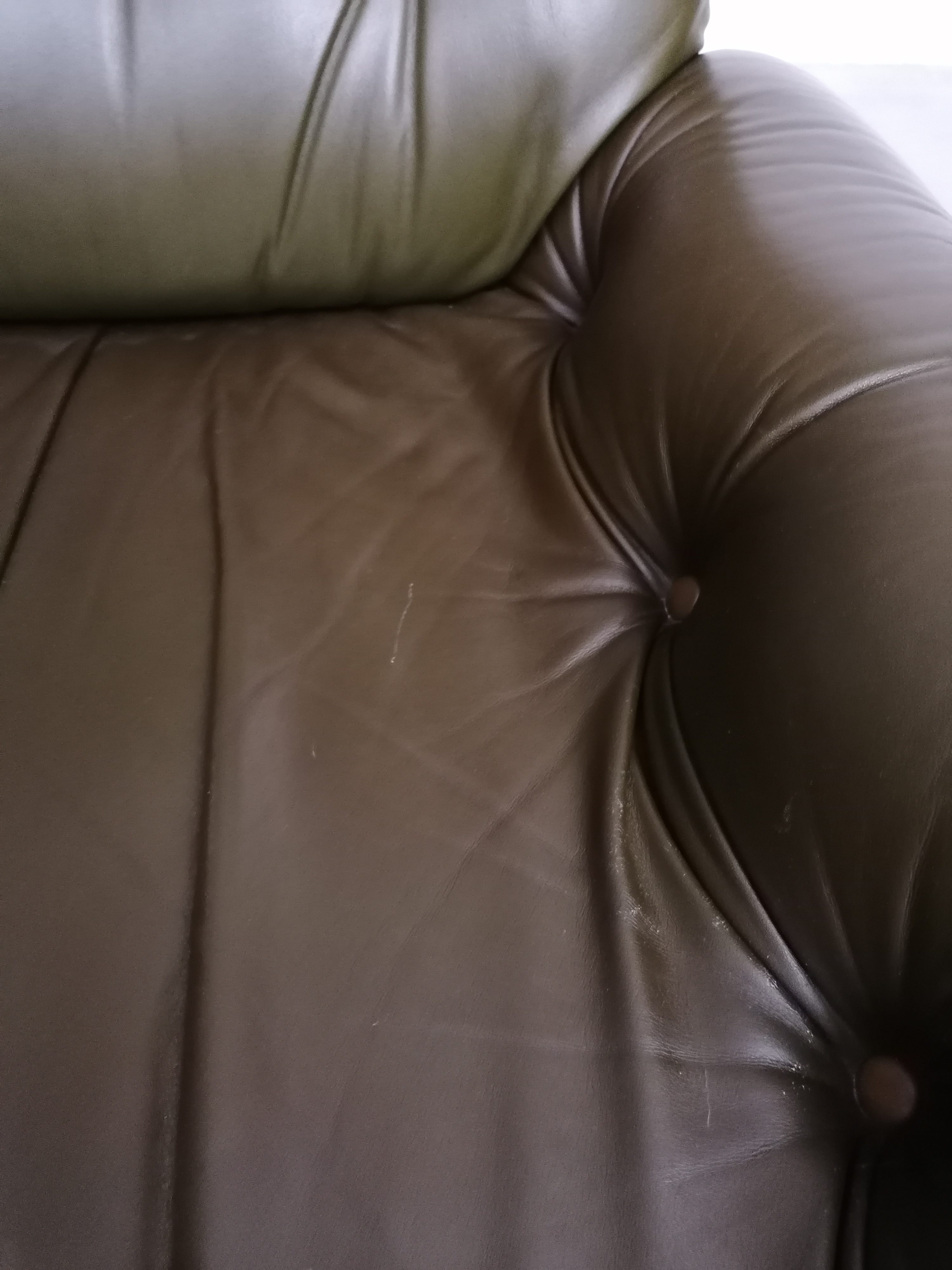 La mousse est en excellent état. Le cuir présente des traces d’usure et griffures visibles sur les photos (surtout sur l’ottoman).