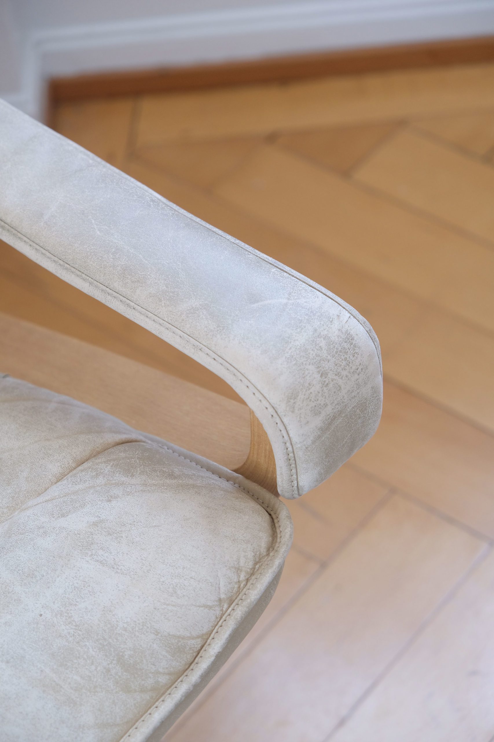 La structure en bois et le textile principale sont en très bon état. Le cuir détachable du dossier, de l’assise et des accoudoirs a beaucoup de patine.