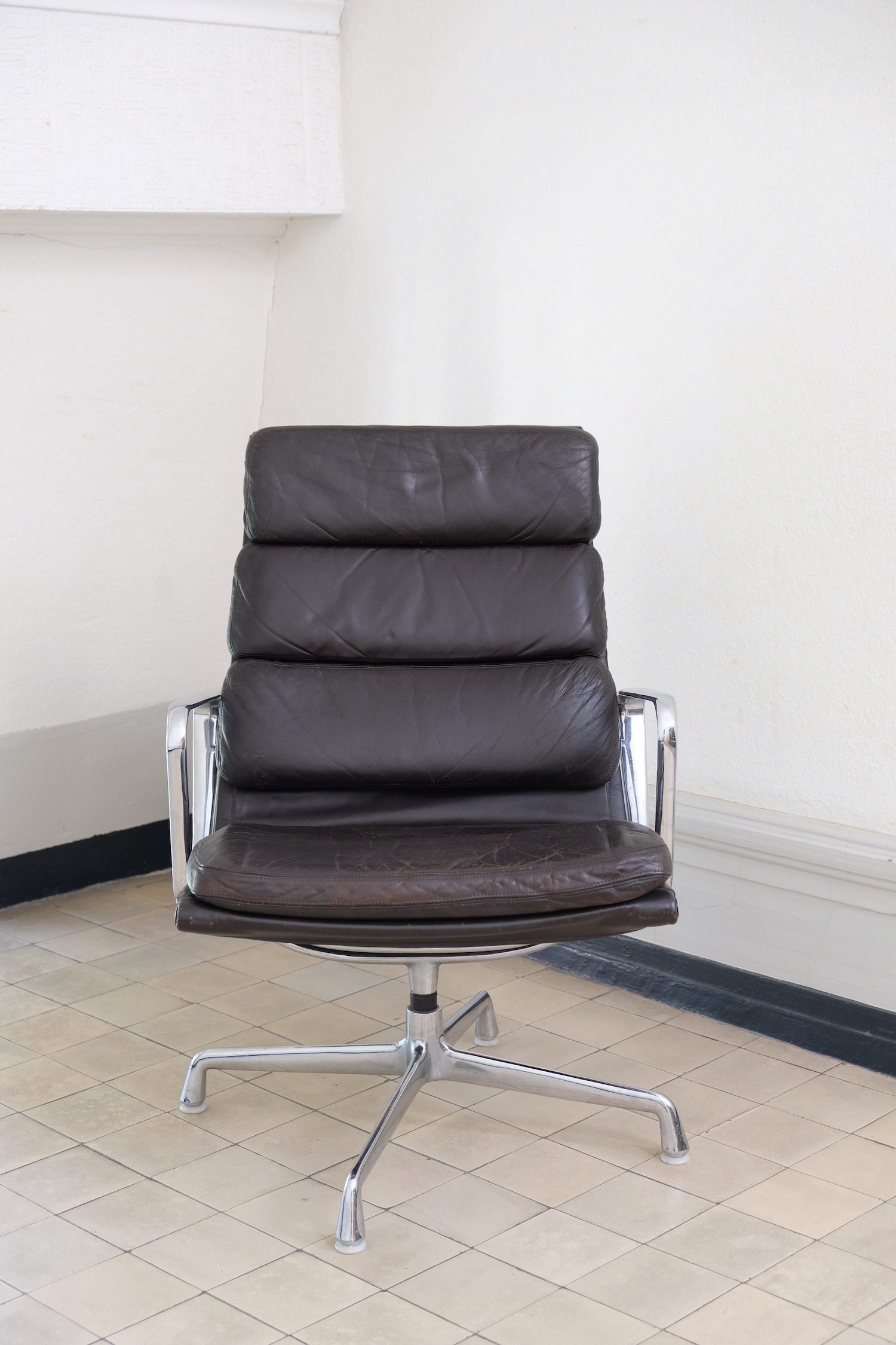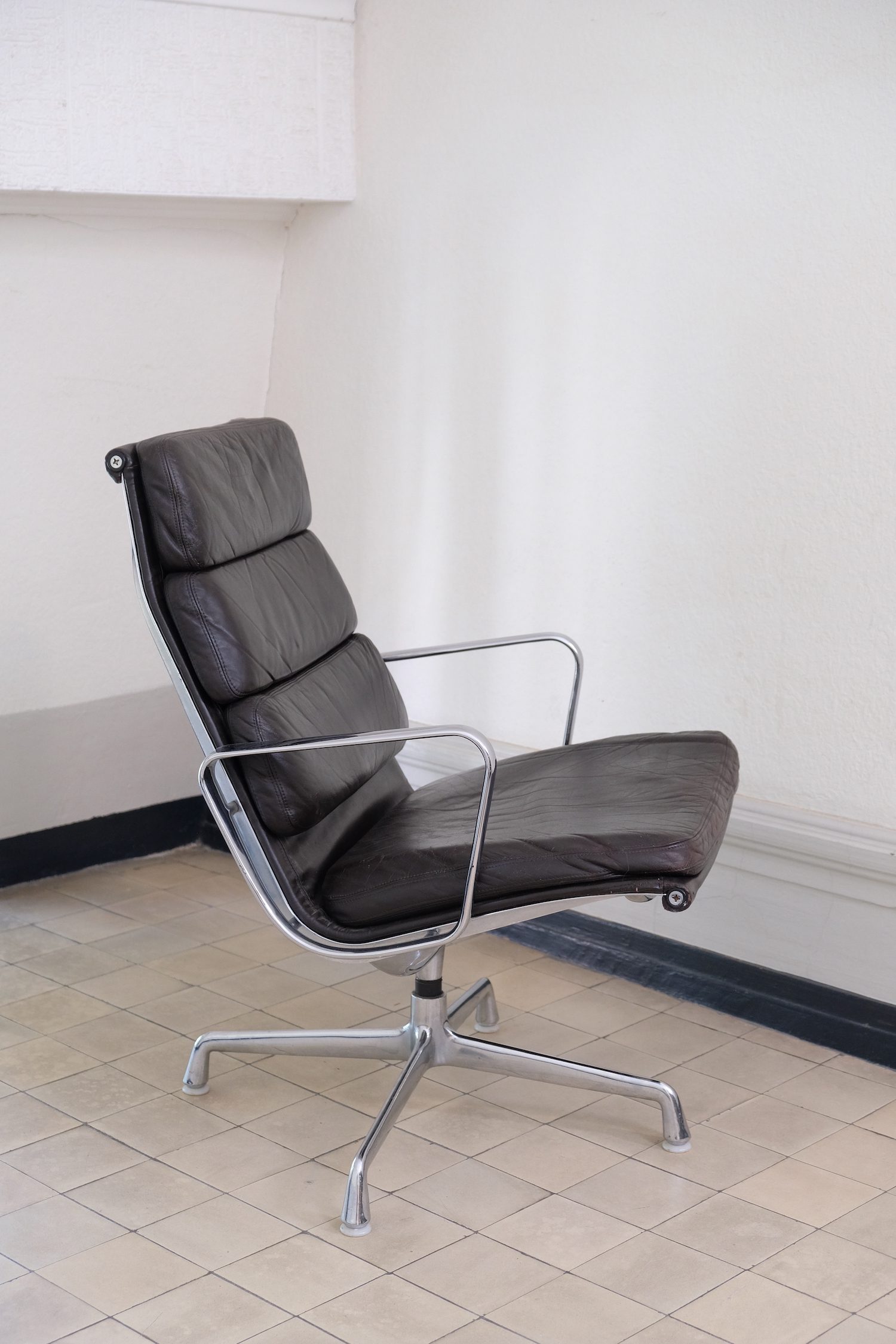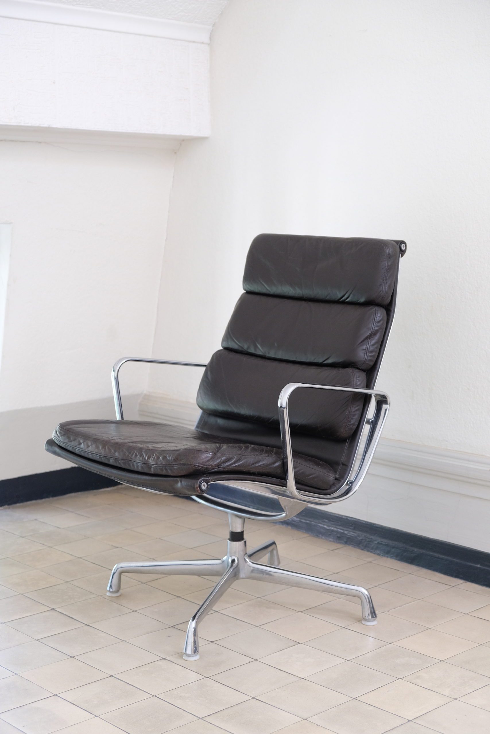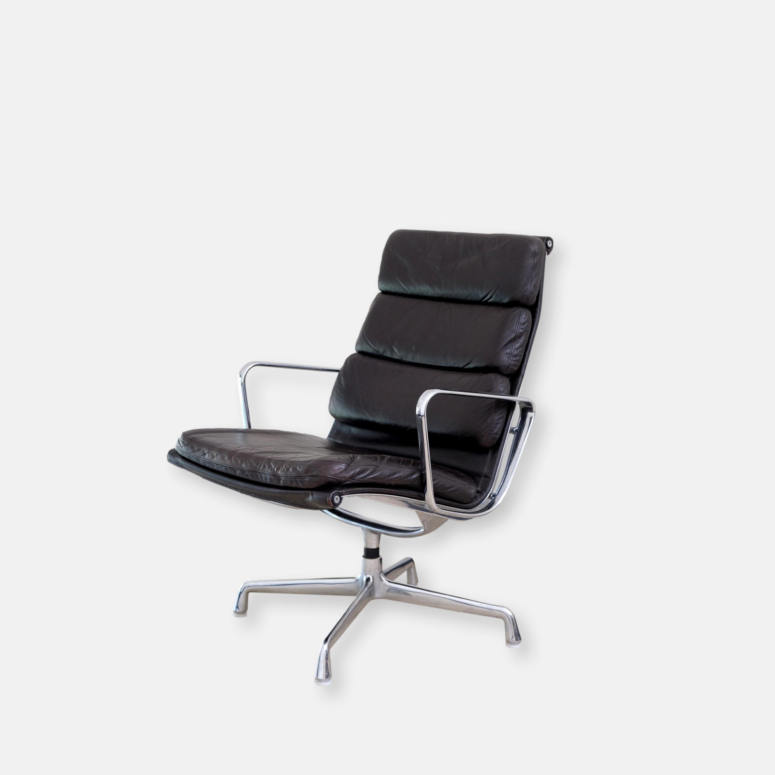 Produit venduFauteuil lounge Soft Pad EA216 de Charles and Rey Eames en cuir marron foncé sur une base chromée pivotante.