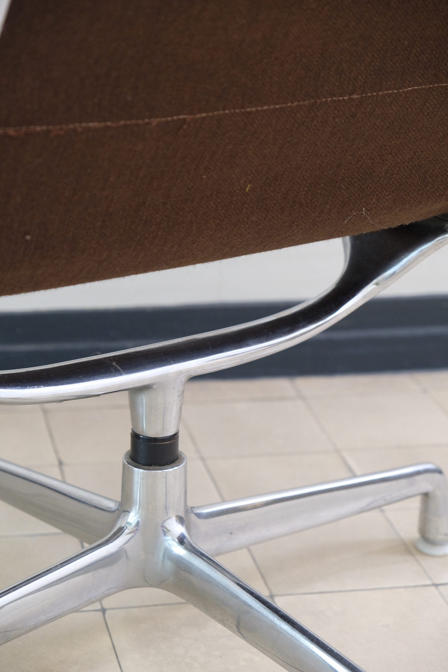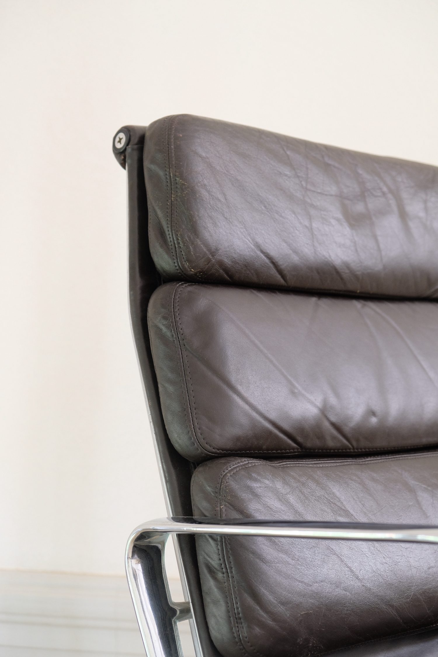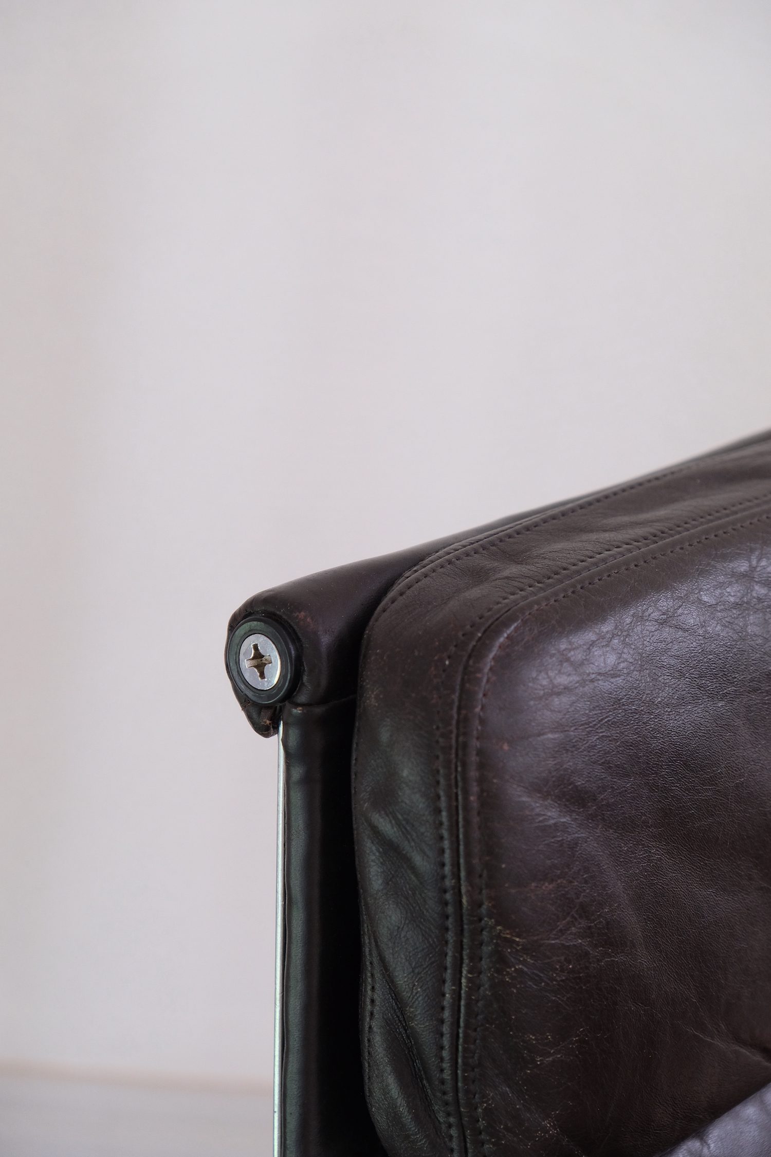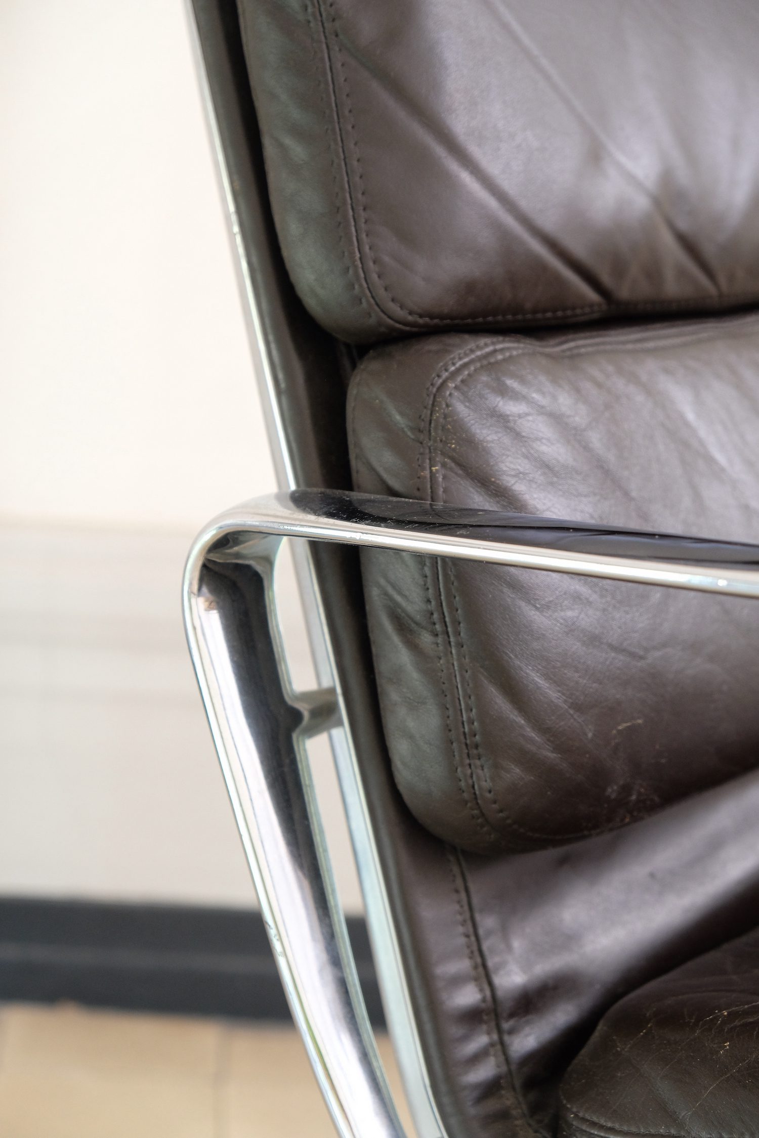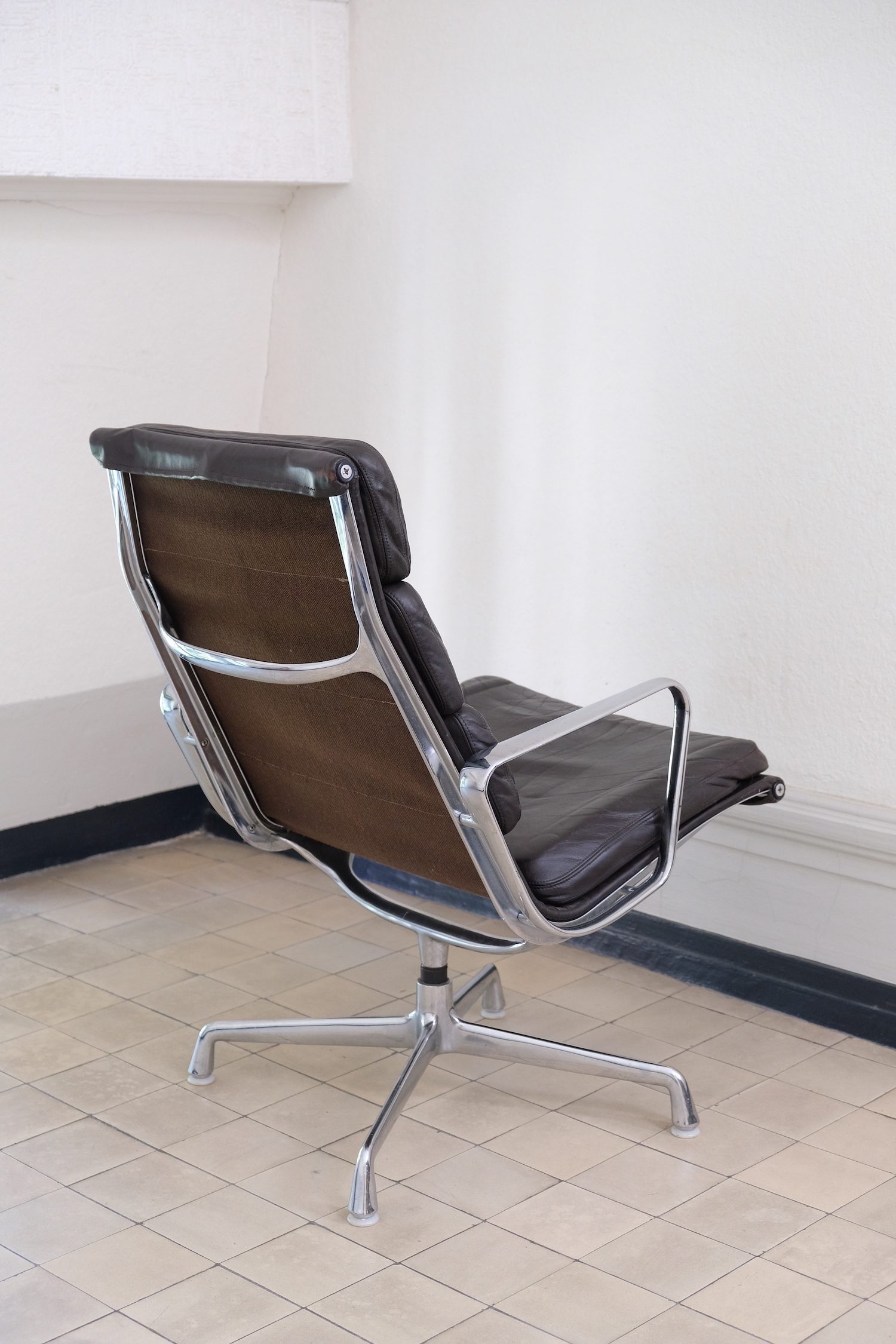 Produit venduFauteuil lounge Soft Pad EA216 de Charles and Rey Eames en cuir marron foncé sur une base chromée pivotante.