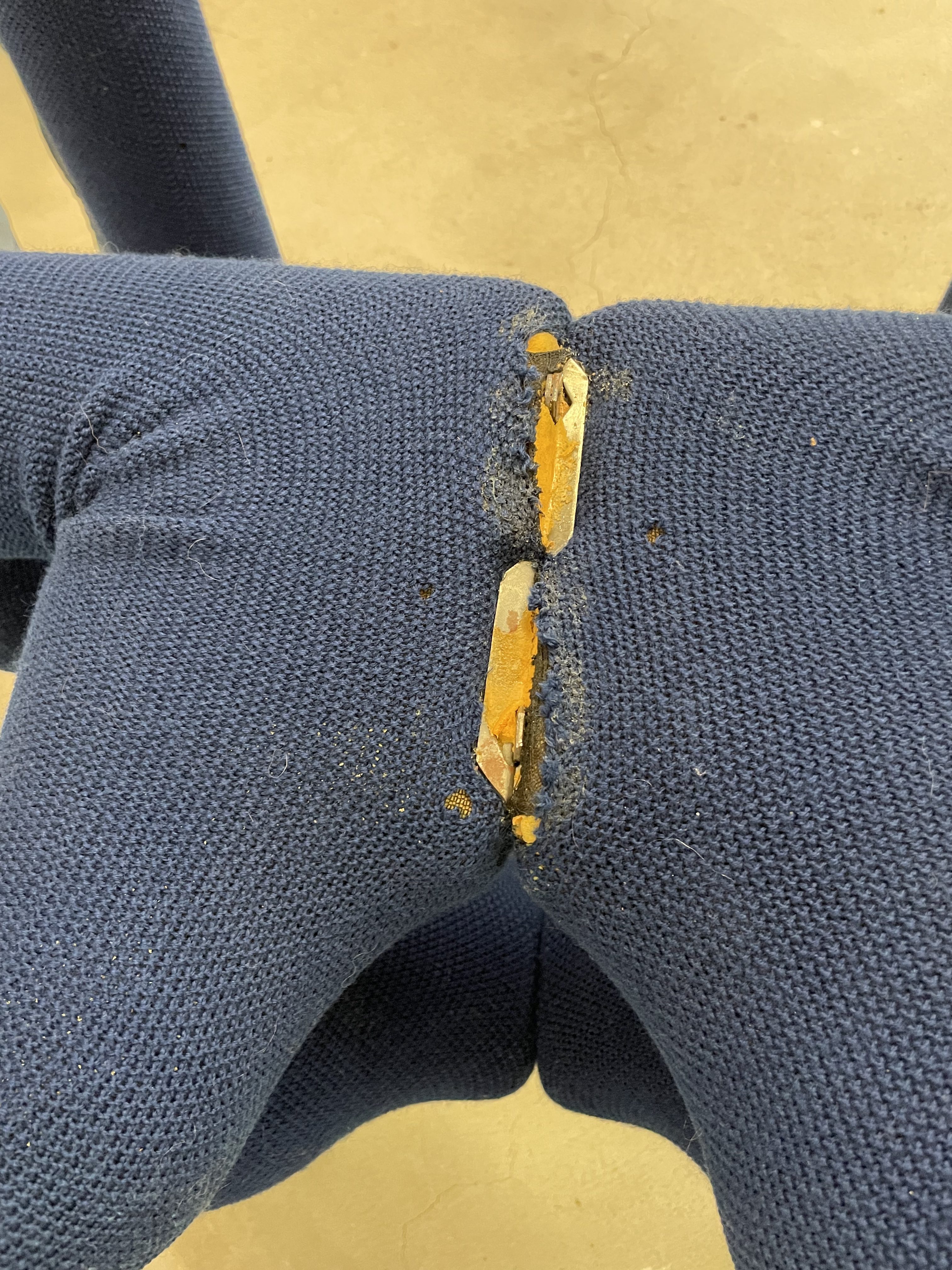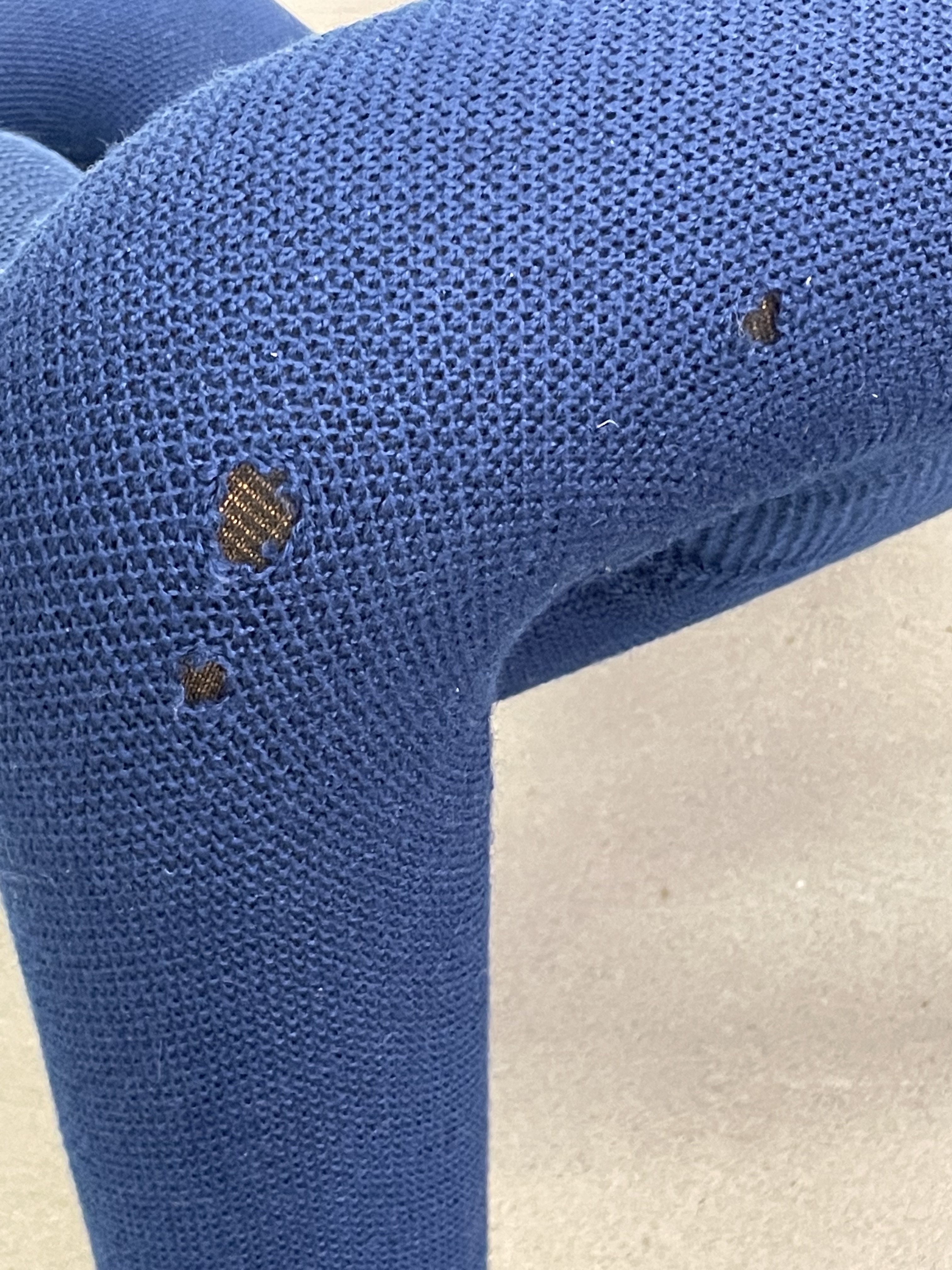 Les photos prises de loin sont flatteuses; les photos prises de près sont cruelles… On distingue sur ces dernières les principaux défauts: quelques trous dans le tissu, surtout au niveau des pieds, mais pas uniquement. Ils pourraient être relativement facilement recousus… Hauteur d’assise: environ 38 cm.