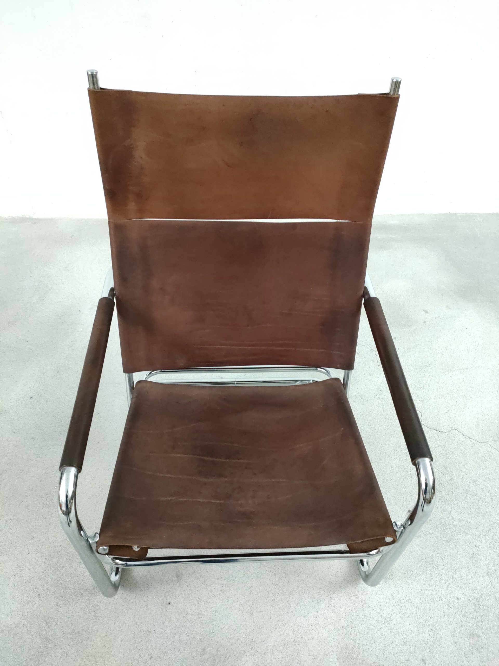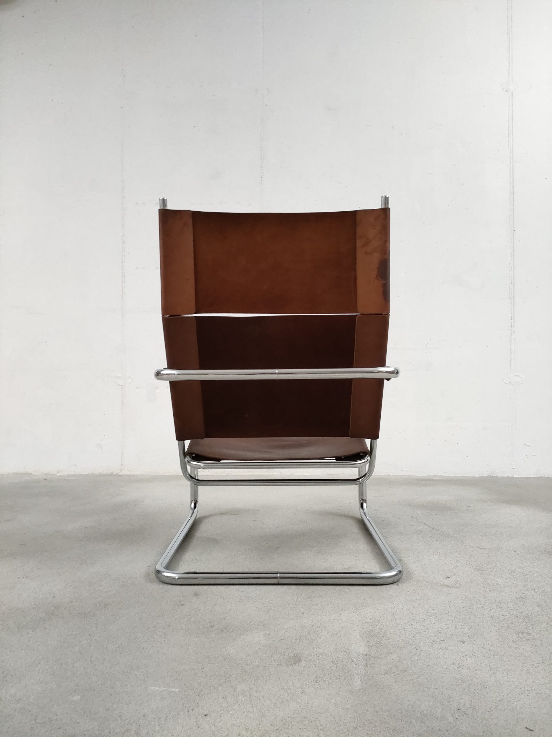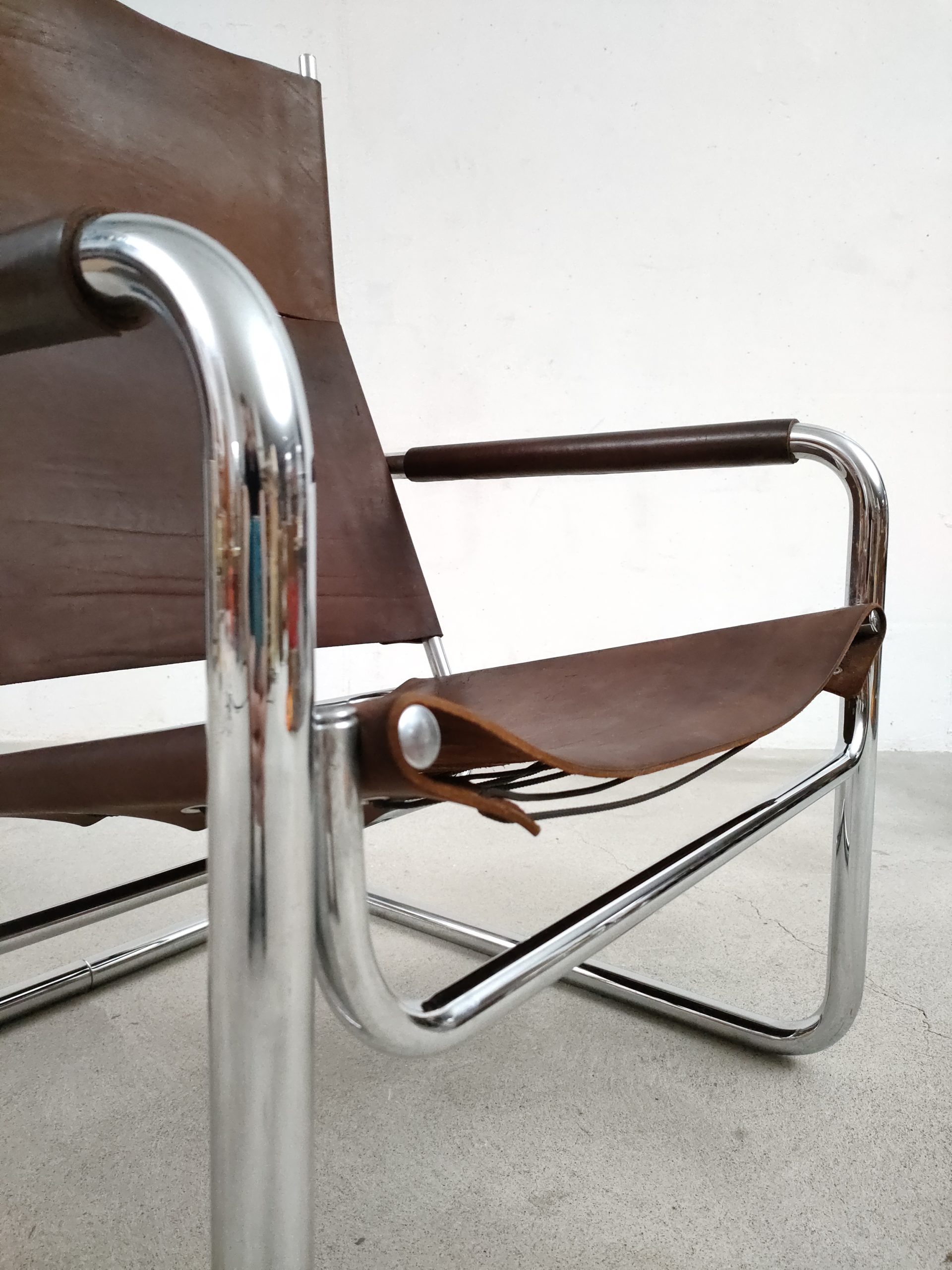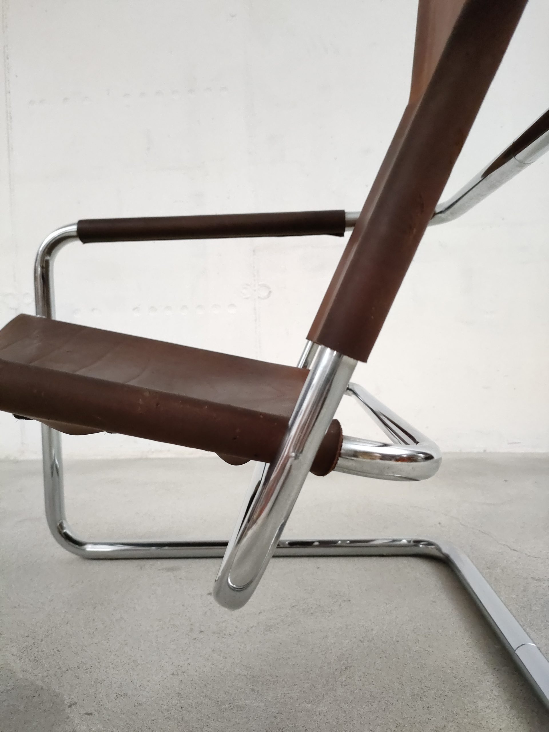 Produit venduFauteuil vintage avec structure en métal tubulaire et assise et dossier en cuir. La structure ainsi que le cuir sont en bon état et de bonne qualité. Des traces d’usure et des marques du temps sont présentes sur le cuir et lui conférènt une très belle patine vintage. Elegant et confortable, le fauteuil est parfaitement fonctionnel. Hauter de l’assise: 28-35 cm.