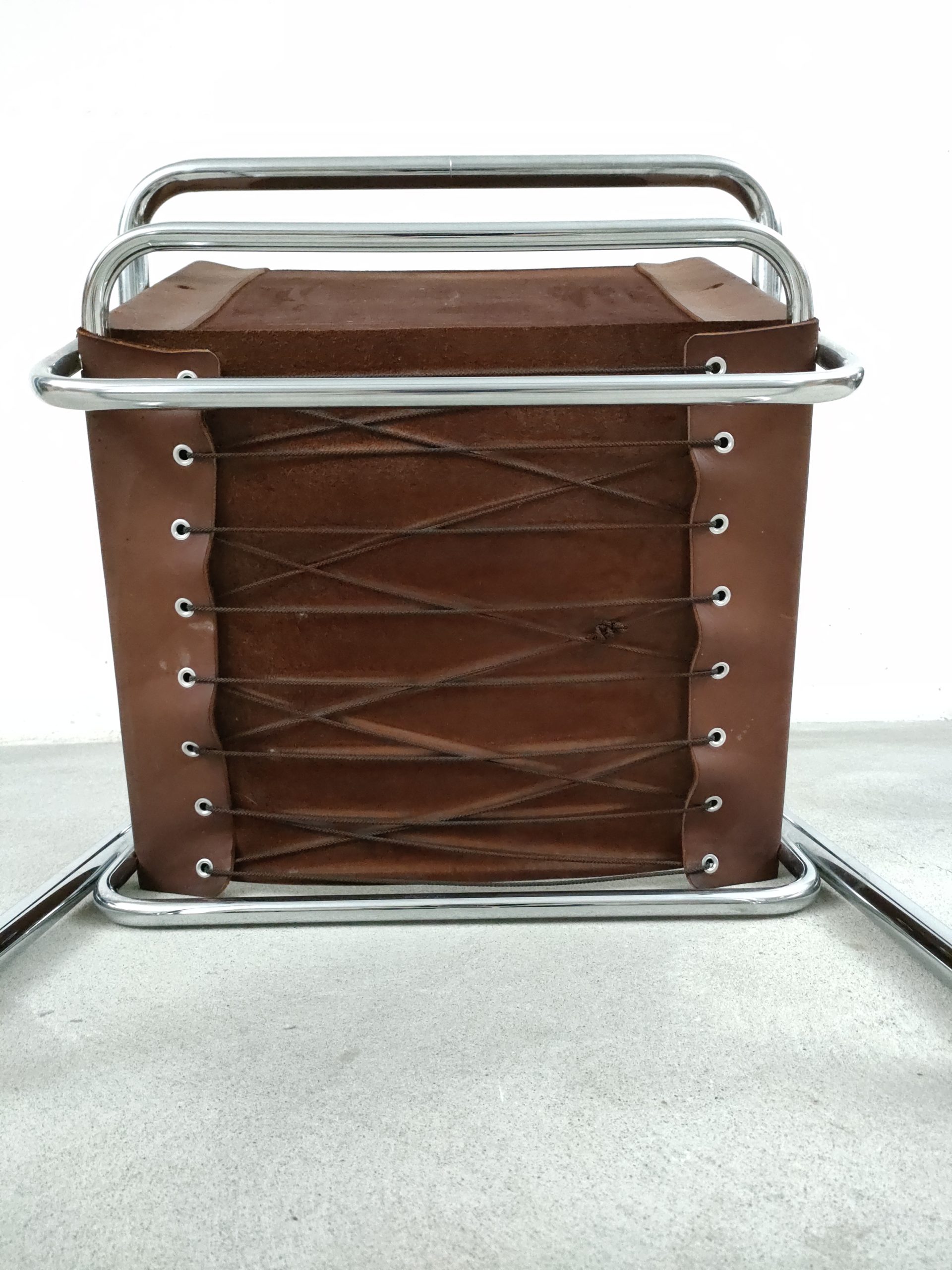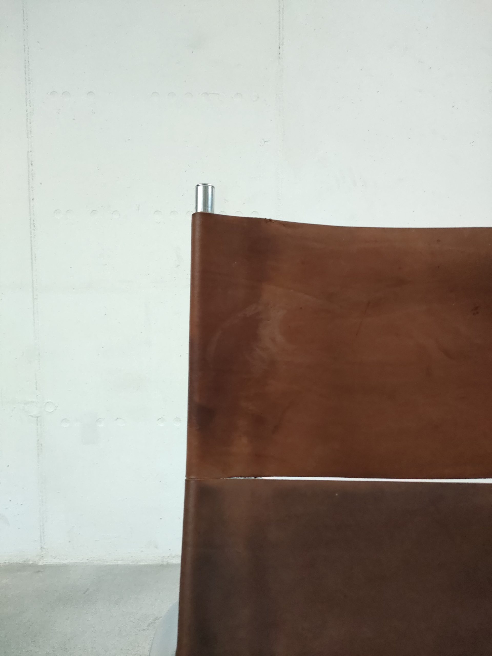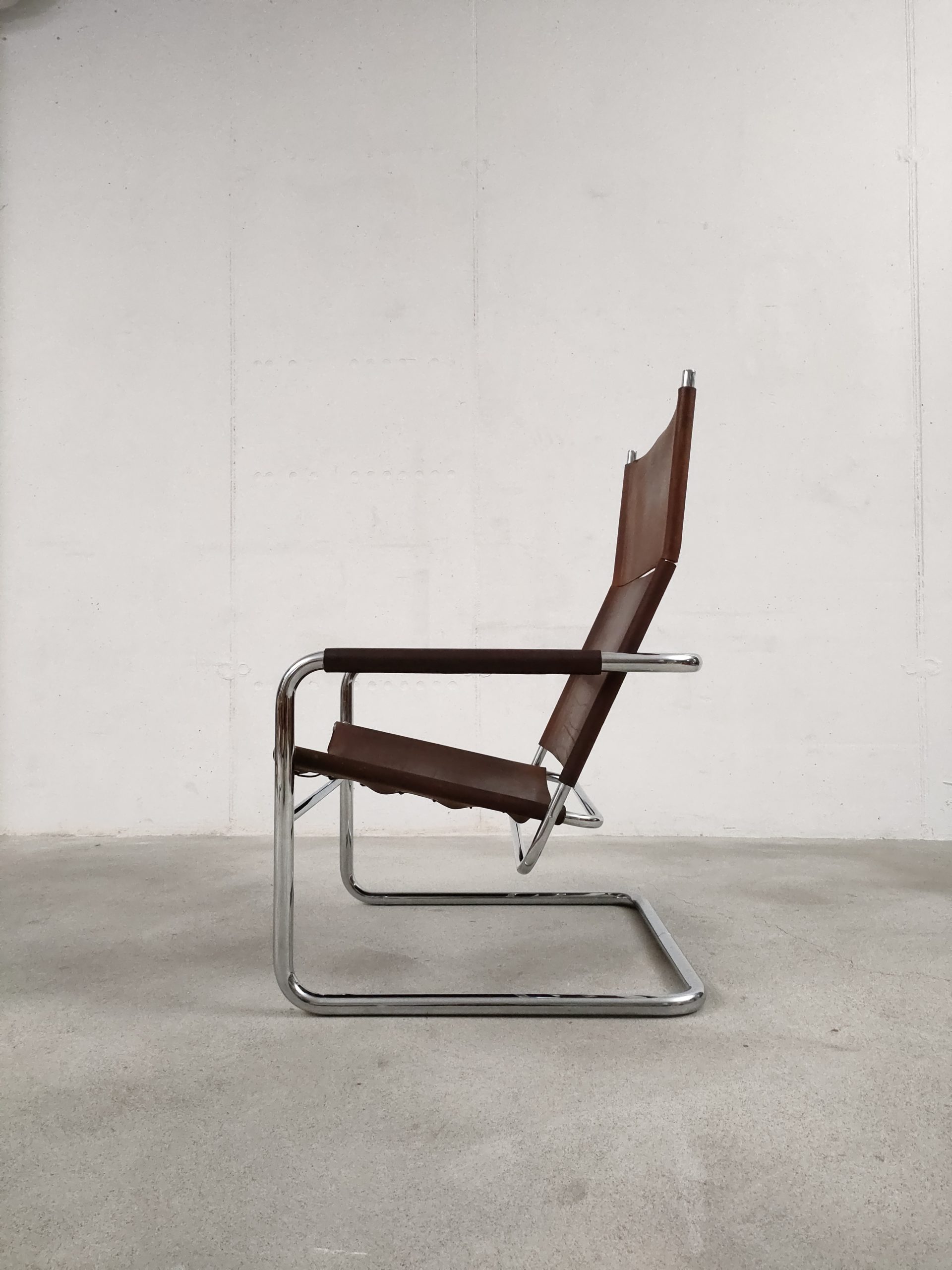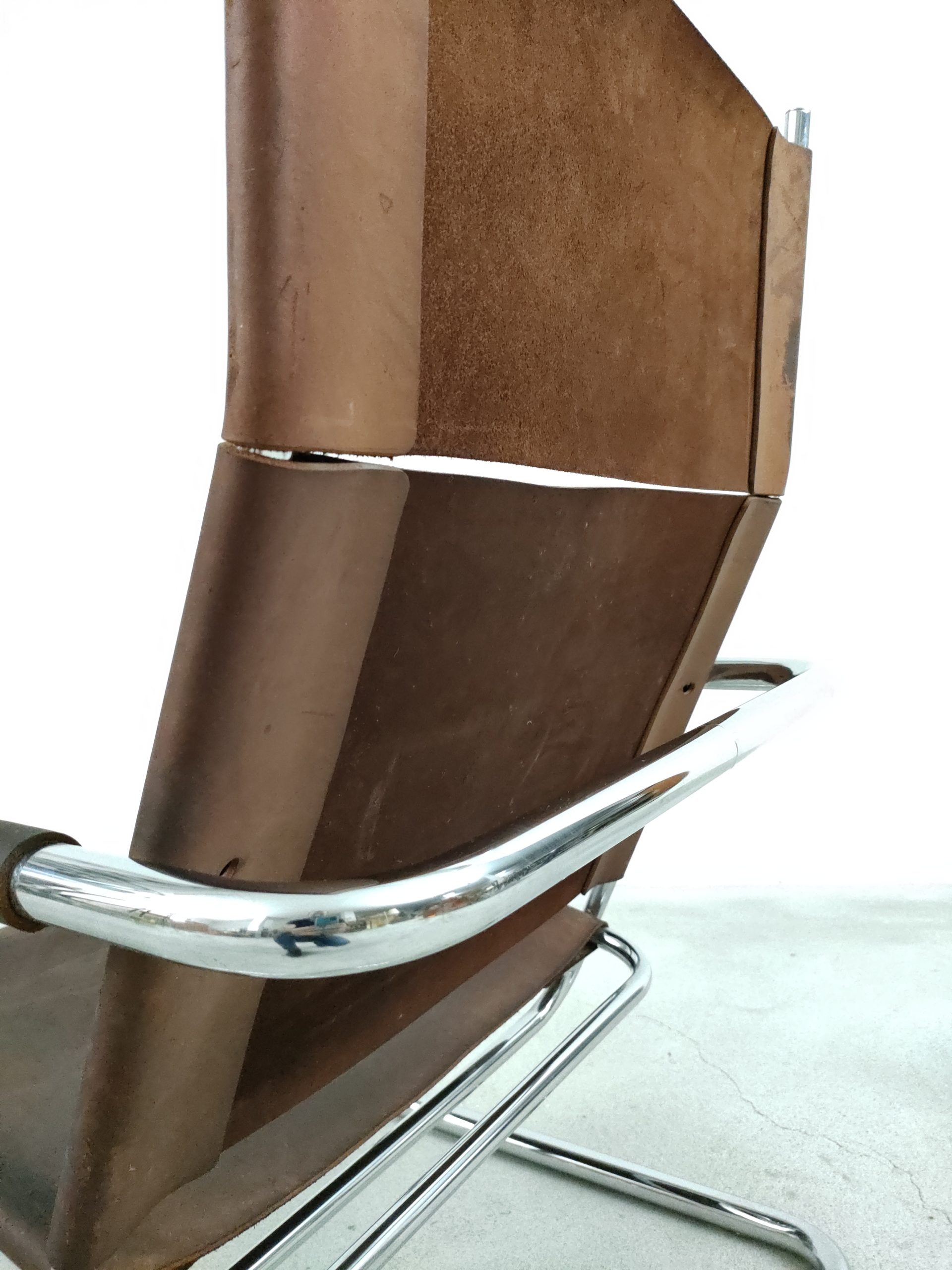 Produit venduFauteuil vintage avec structure en métal tubulaire et assise et dossier en cuir. La structure ainsi que le cuir sont en bon état et de bonne qualité. Des traces d’usure et des marques du temps sont présentes sur le cuir et lui conférènt une très belle patine vintage. Elegant et confortable, le fauteuil est parfaitement fonctionnel. Hauter de l’assise: 28-35 cm.