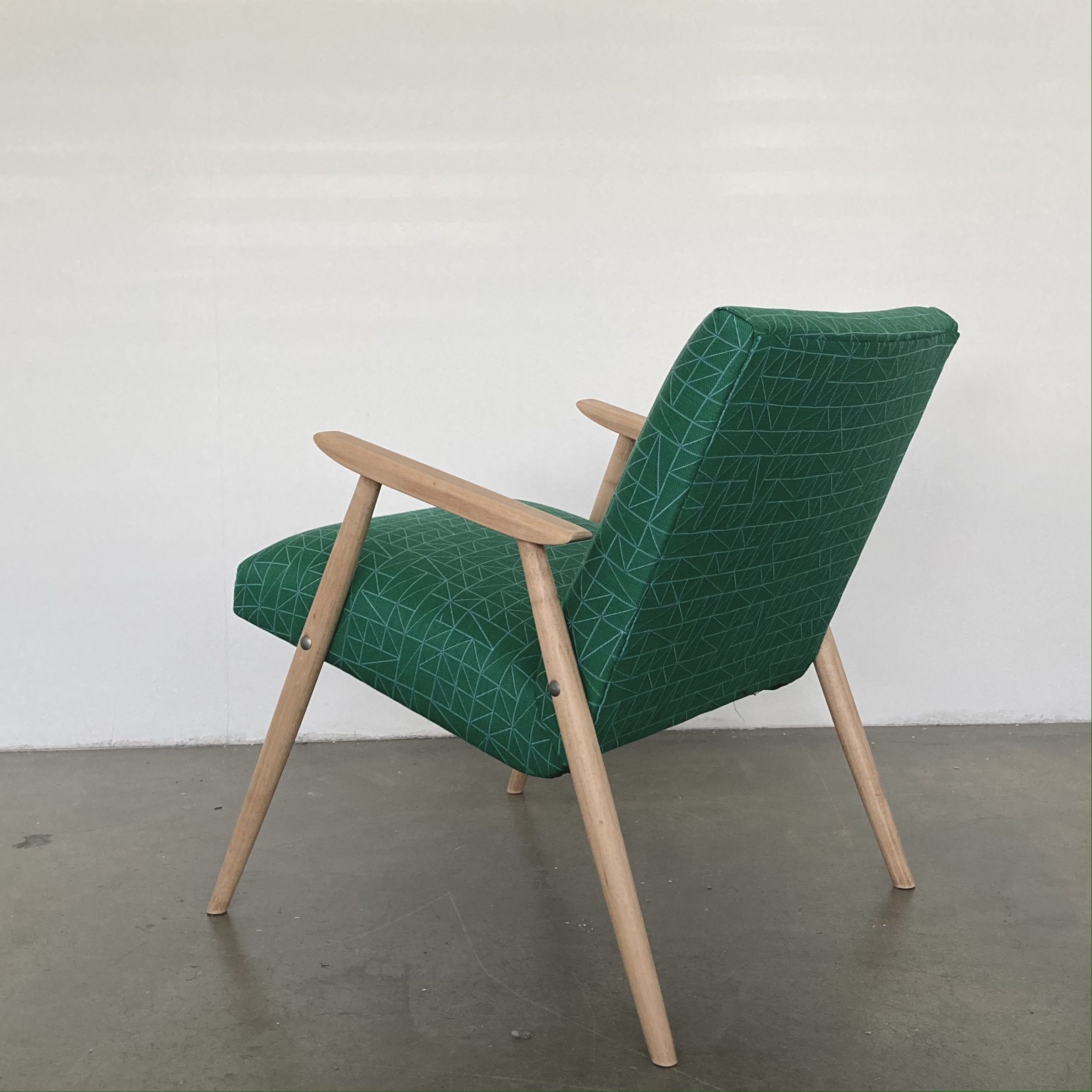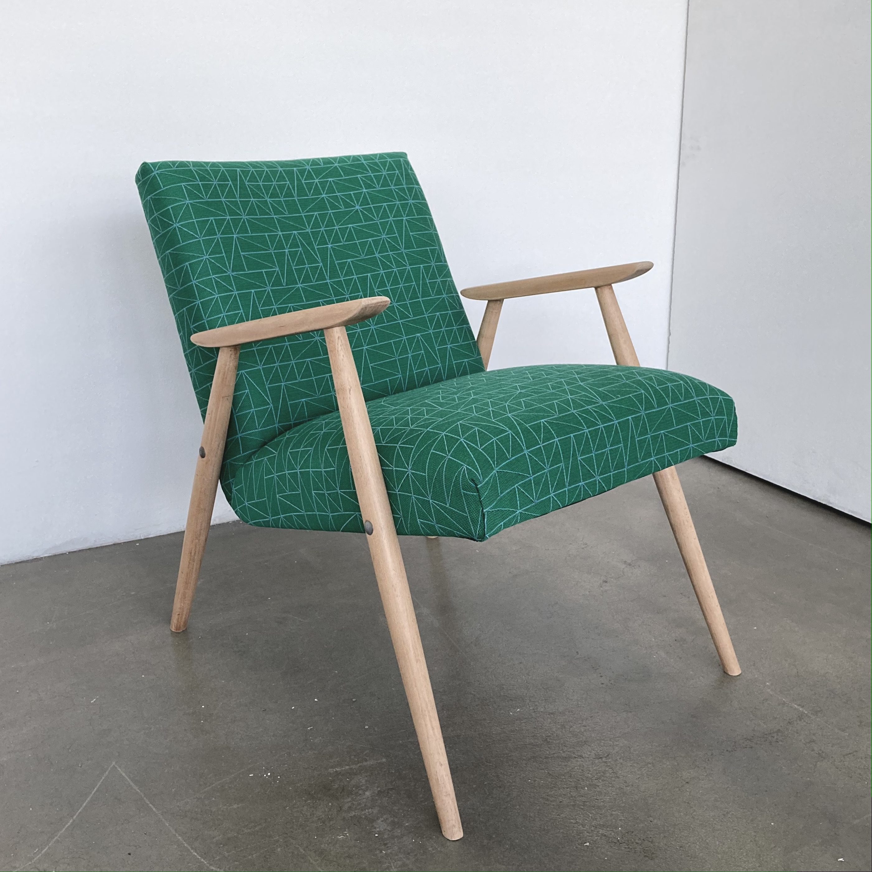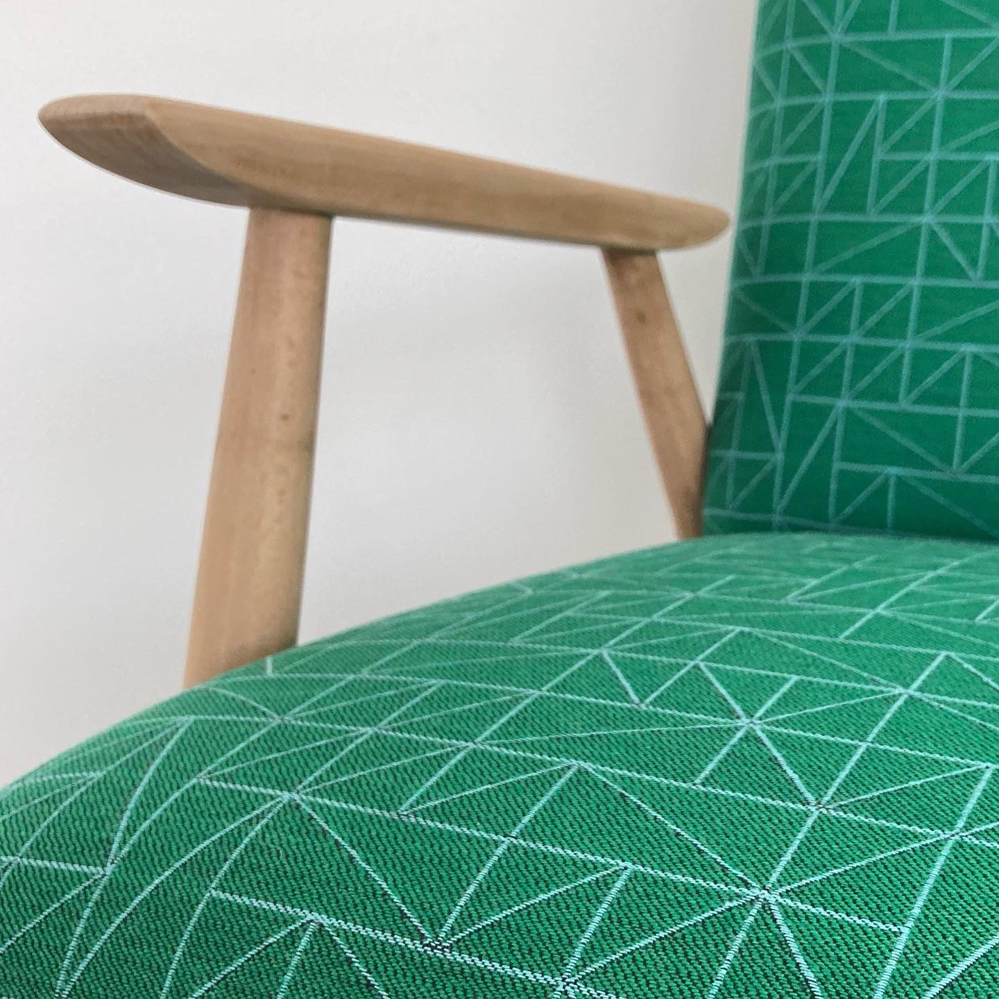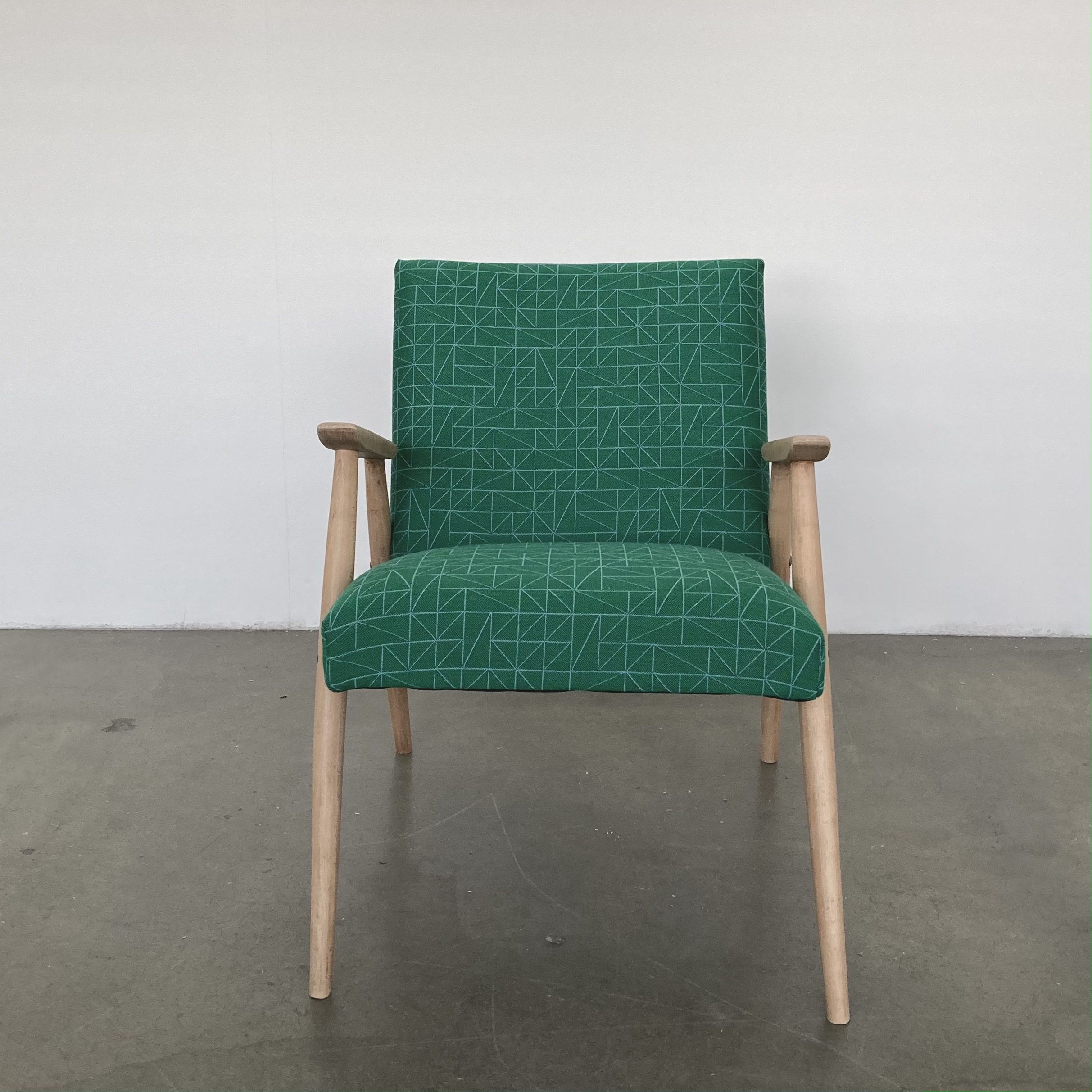 Produit venduFauteuil vintage, rembourrage entièrement refait à neuf, tissu d’éditeur style graphique vert et bleu clair. Accoudoirs en bois restaurés, mais ils gardent leur patine du temps.