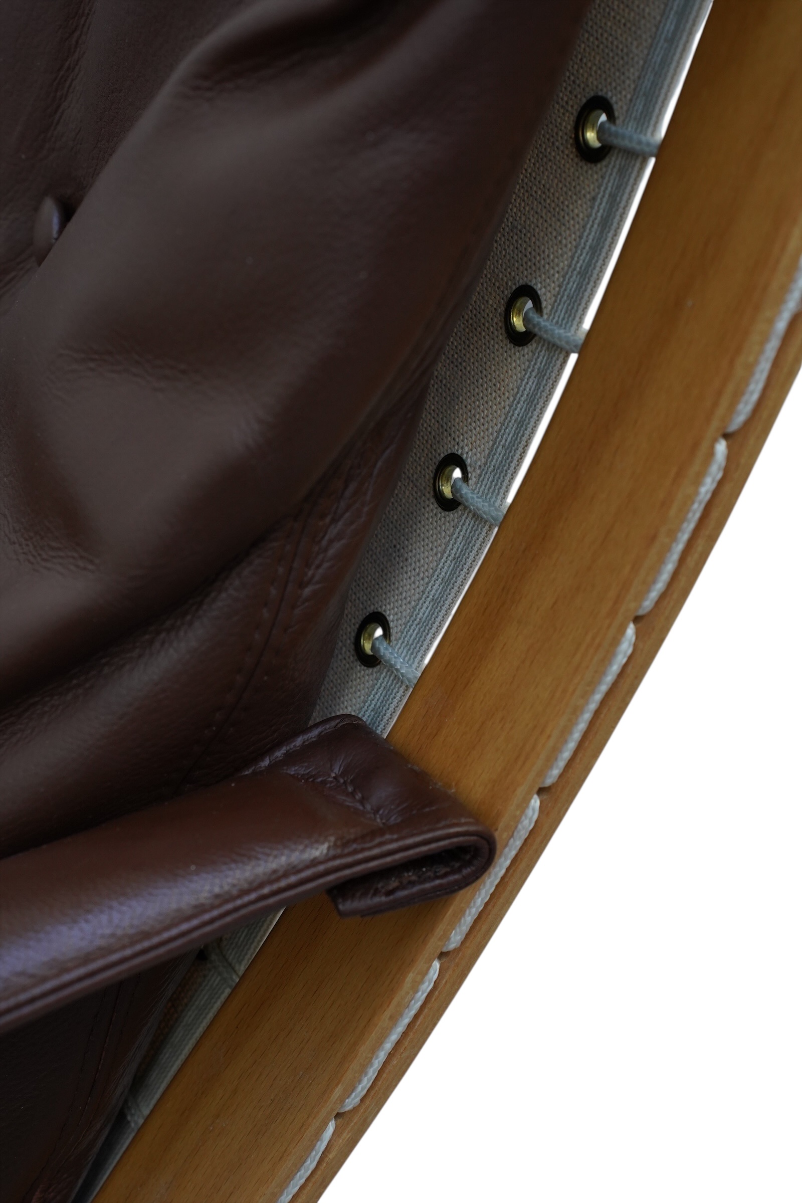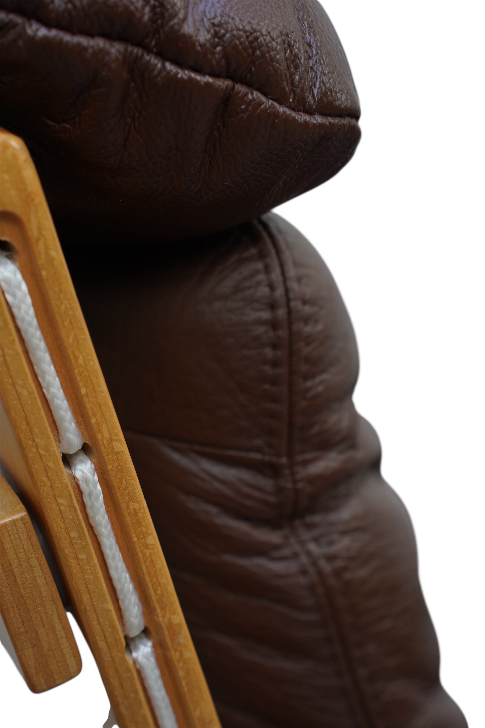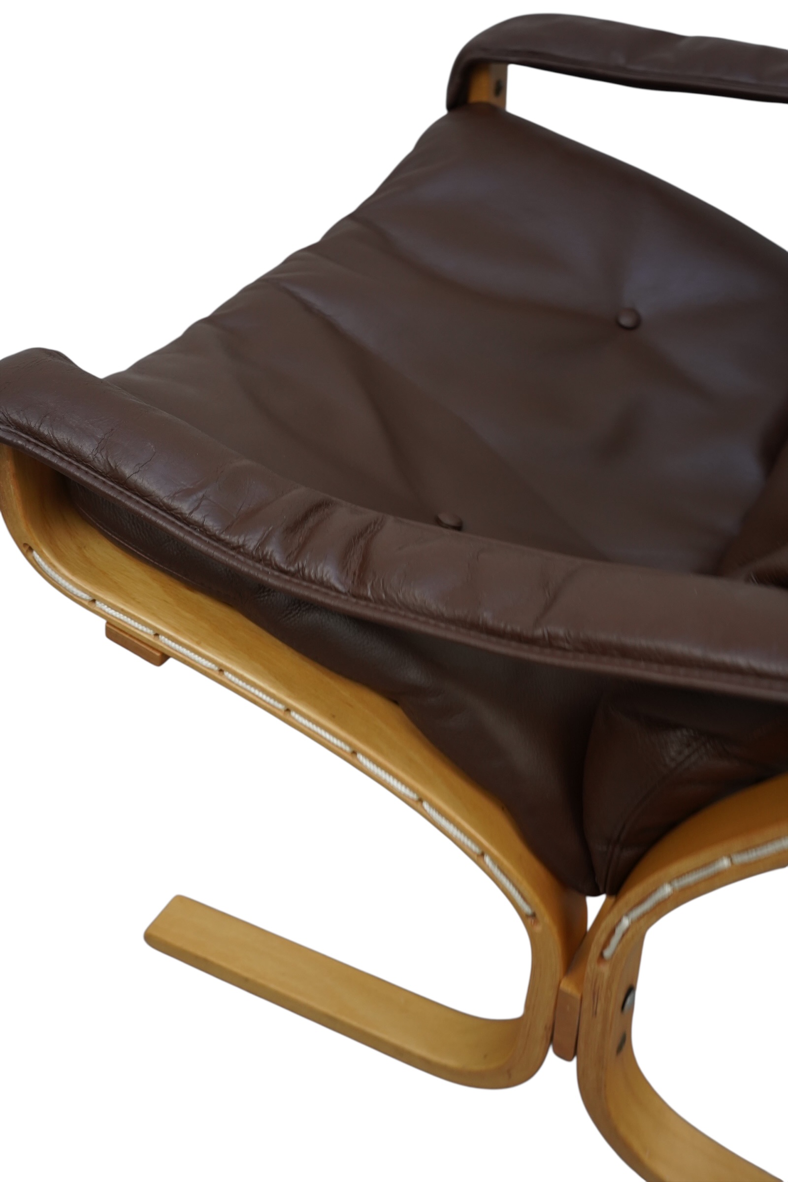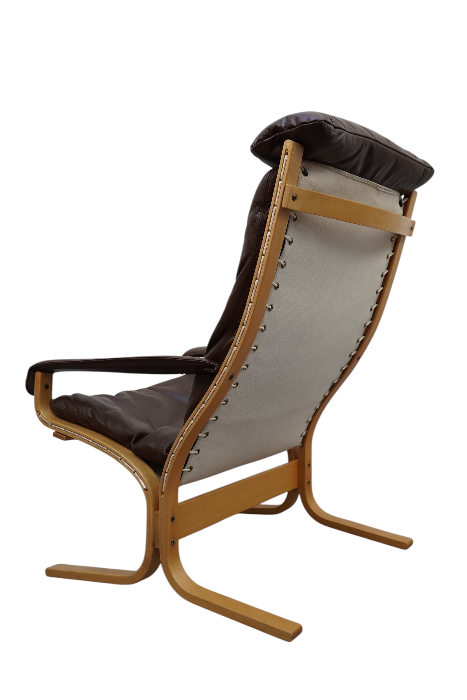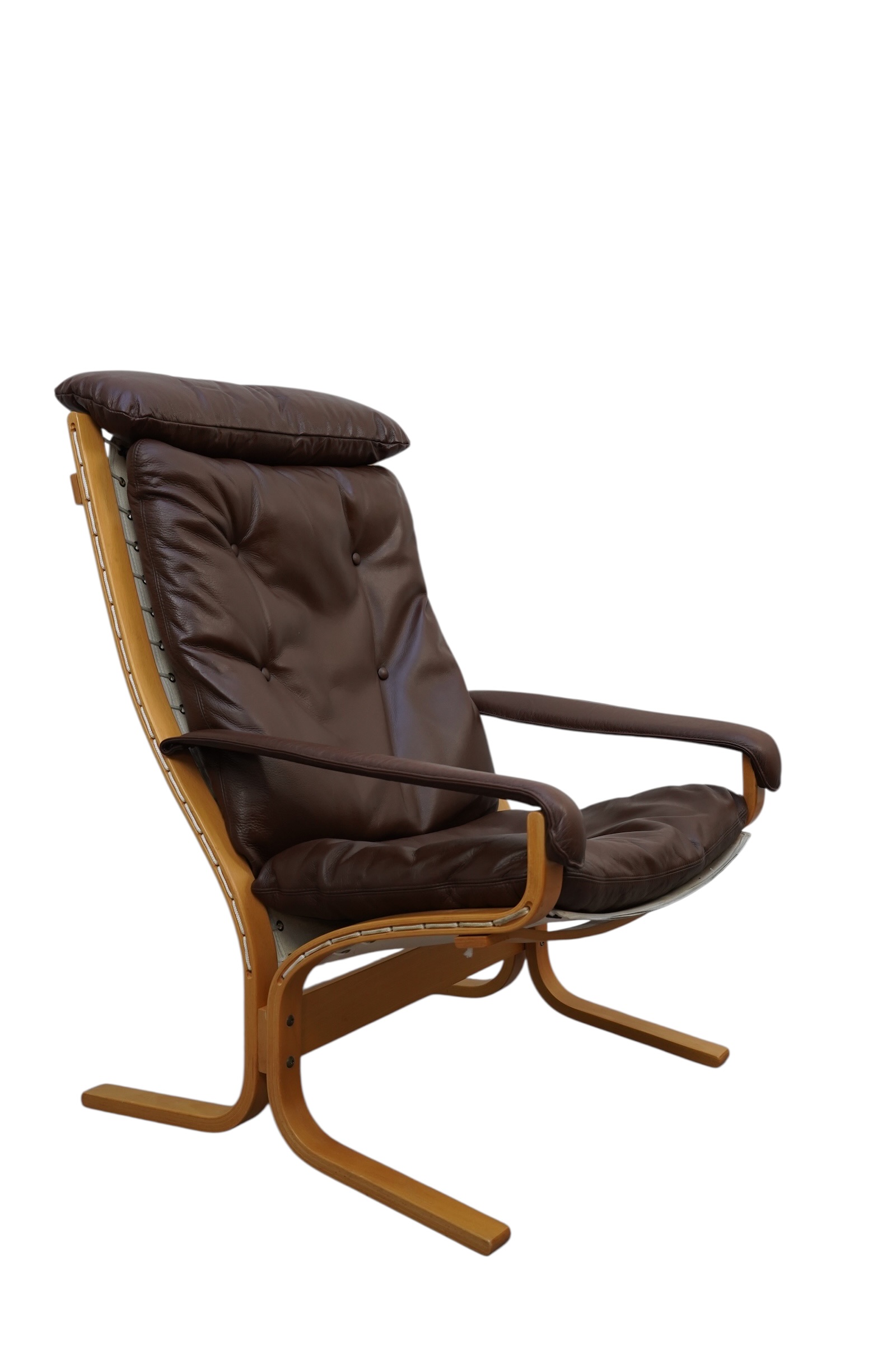 Ces fauteuils sont des pièces emblématique du design scandinave appelées la chaise Siesta, conçue par le designer norvégien Ingmar Relling (1920-2002) en 1965. Principalement éditée par Westnofa, sa structure légère est en bois de hêtre multiplis cintré à la vapeur, munie d’une assise suspendue par de la toile et cordages, habillés de coussin en cuir de couleur marron. Version haute et basse avec accoudoirs. Considérée comme un classique du modernisme scandinave.