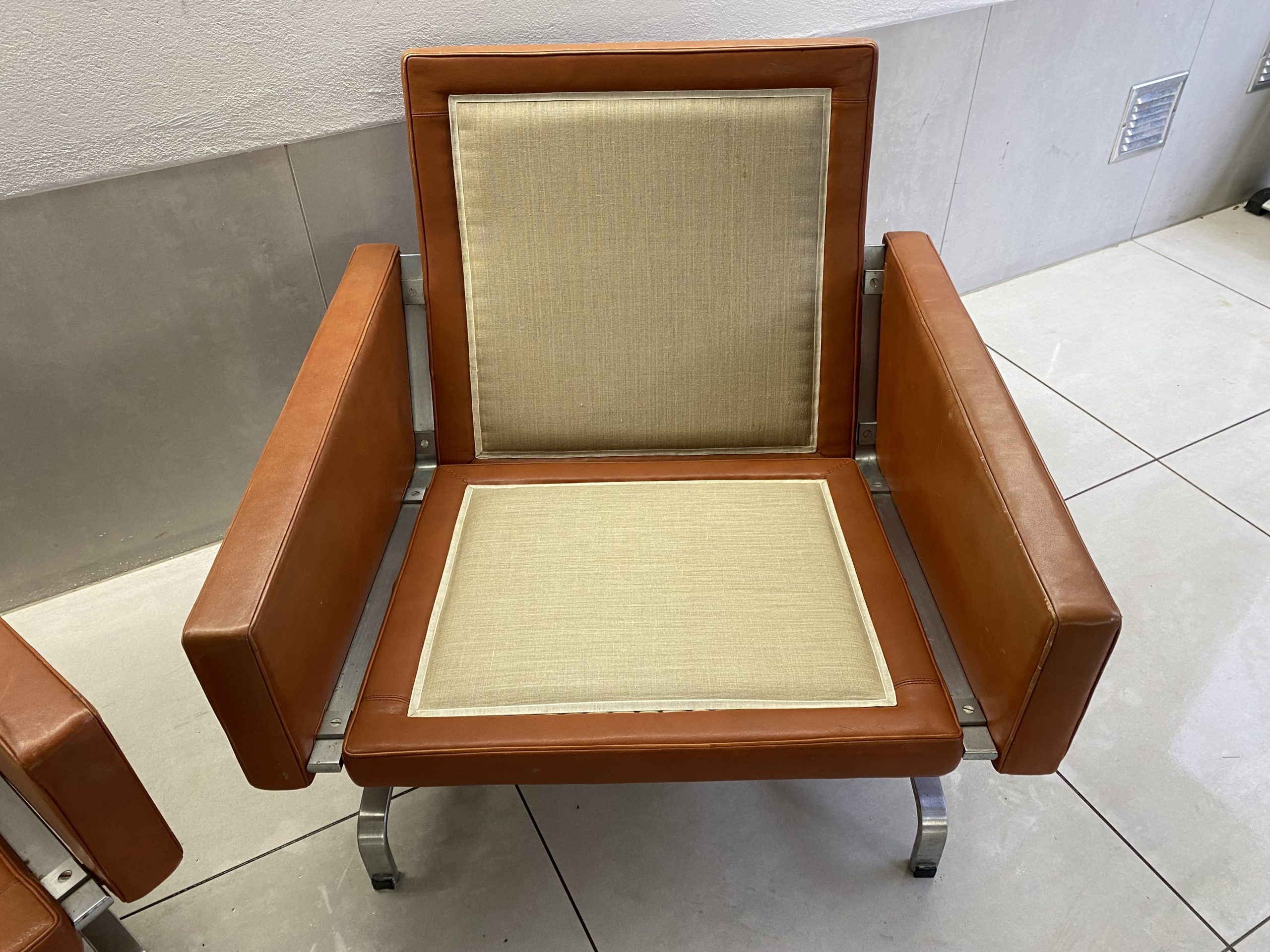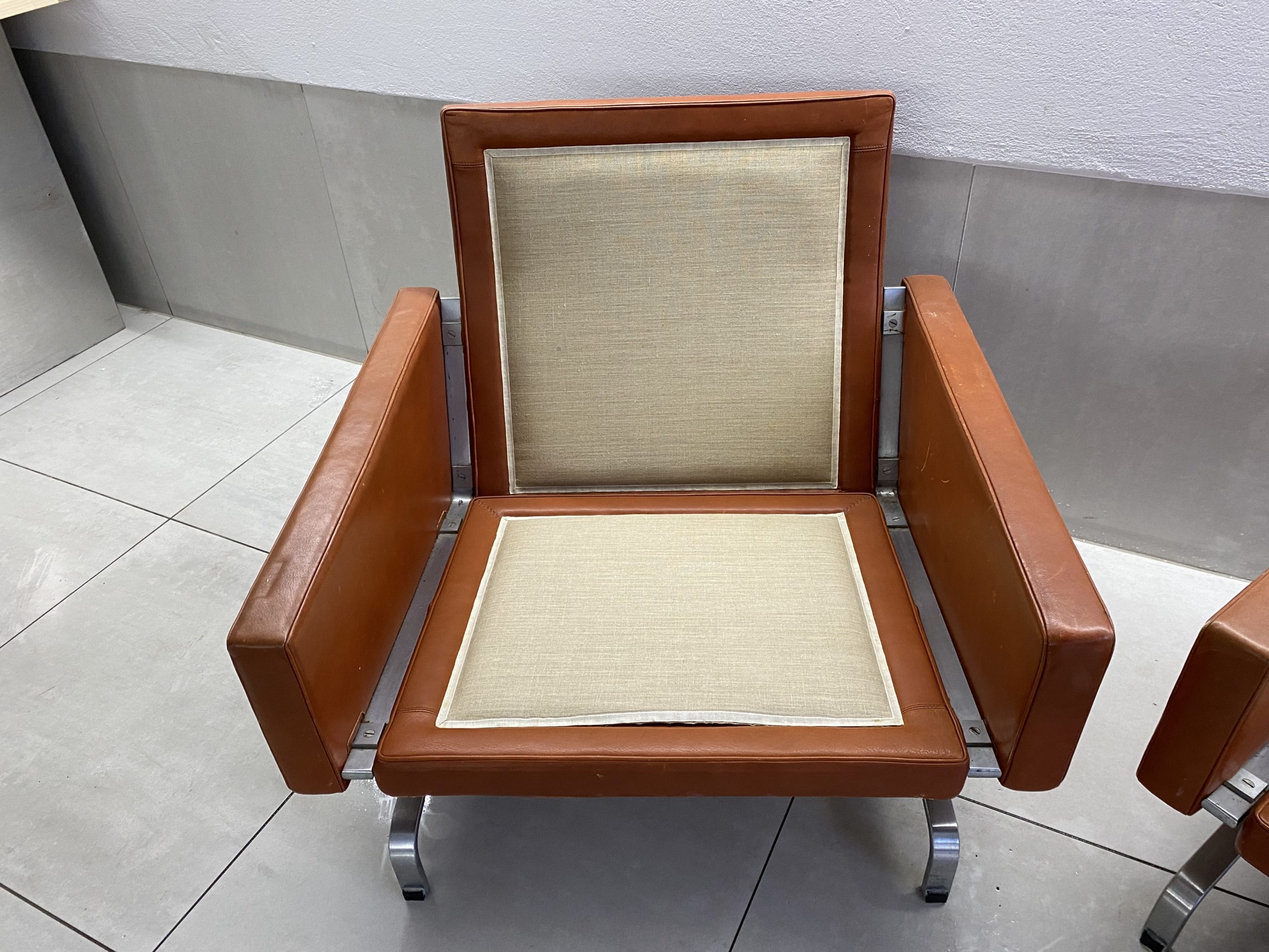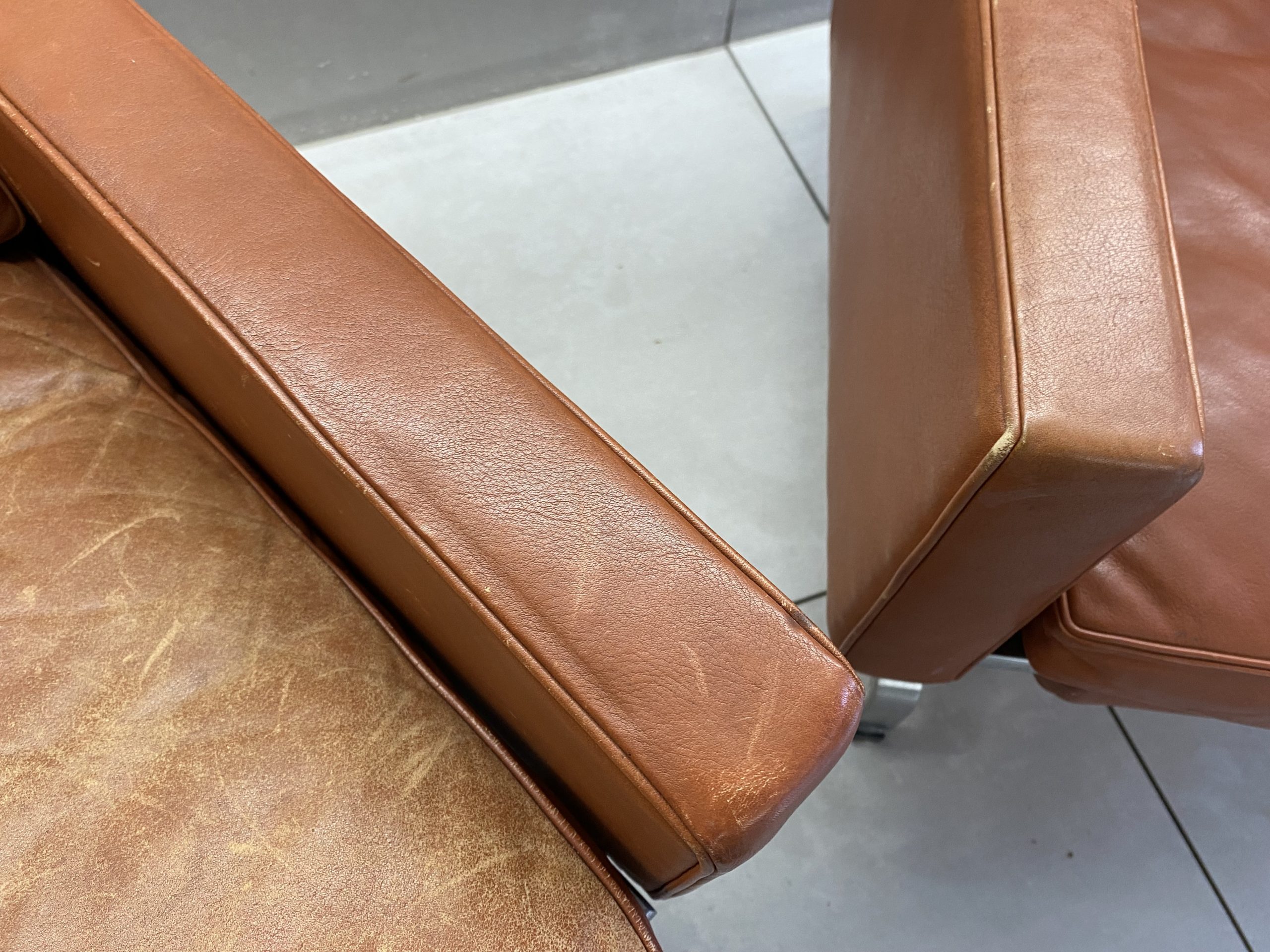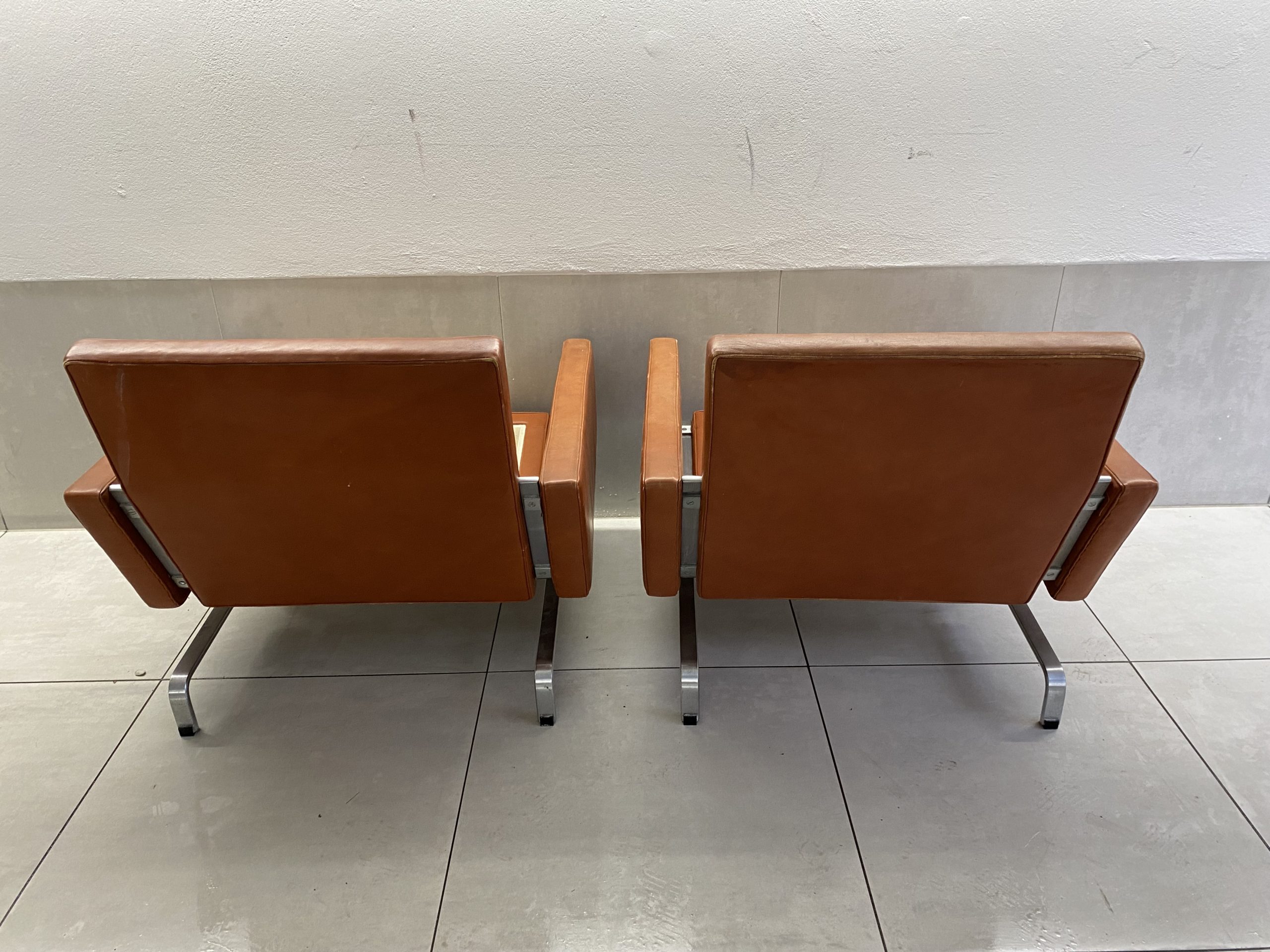Paire de fauteuils PK31 Poul Kjaerholm. Très belles pièces, cuir dans son jus, métal en bon état avec gravé Denmark sous chaque fauteuil. Vente en paire uniquement.