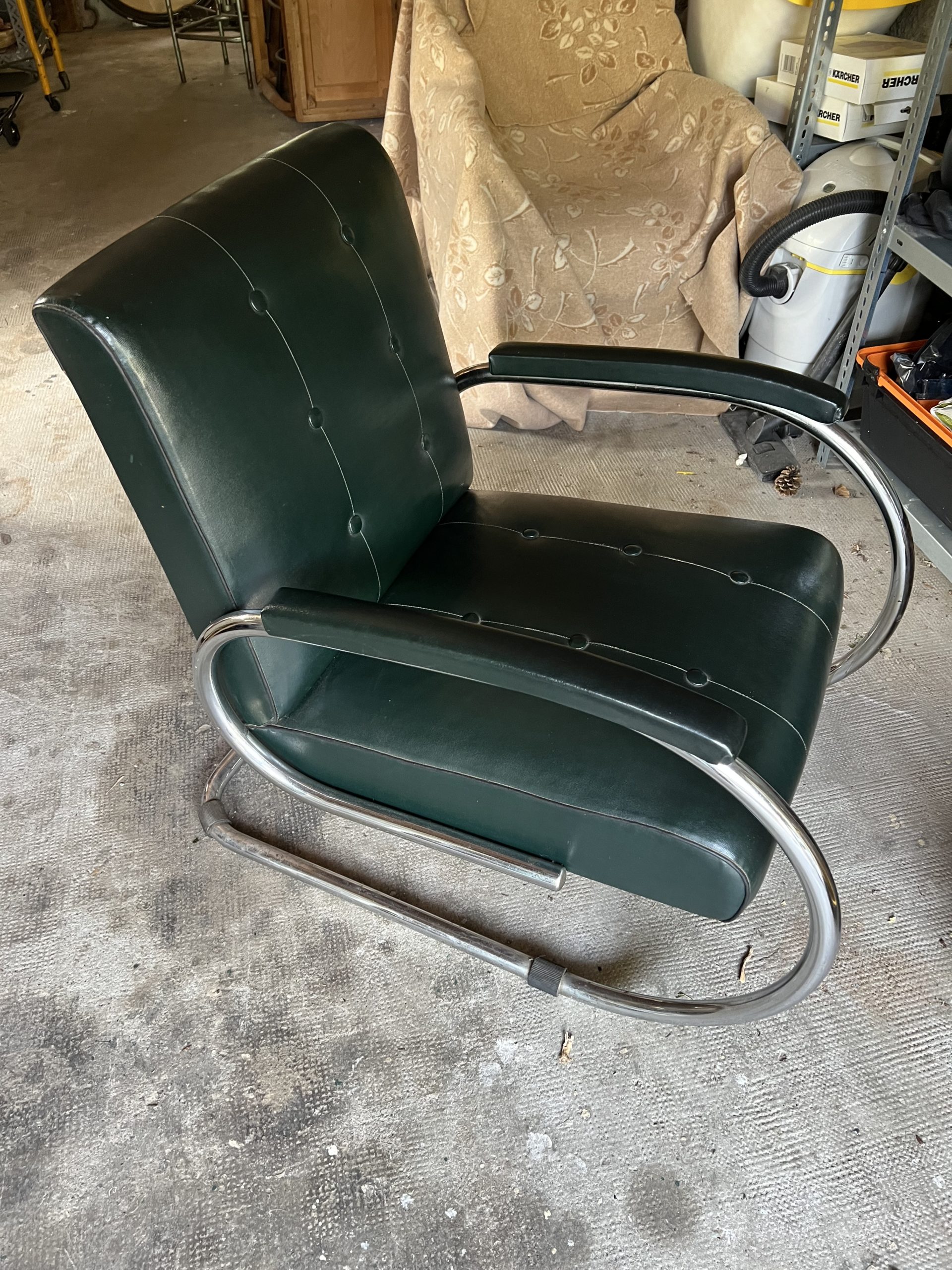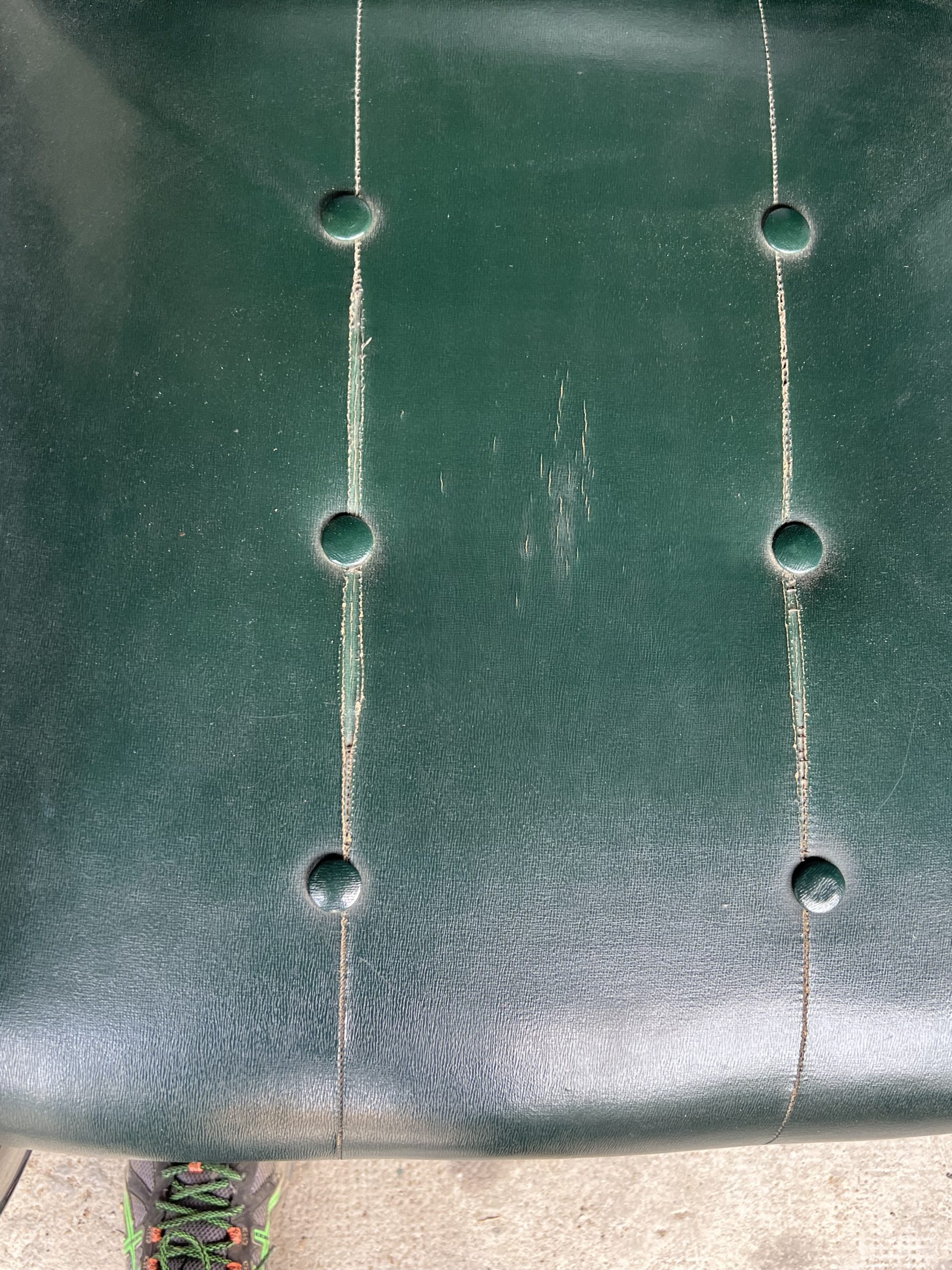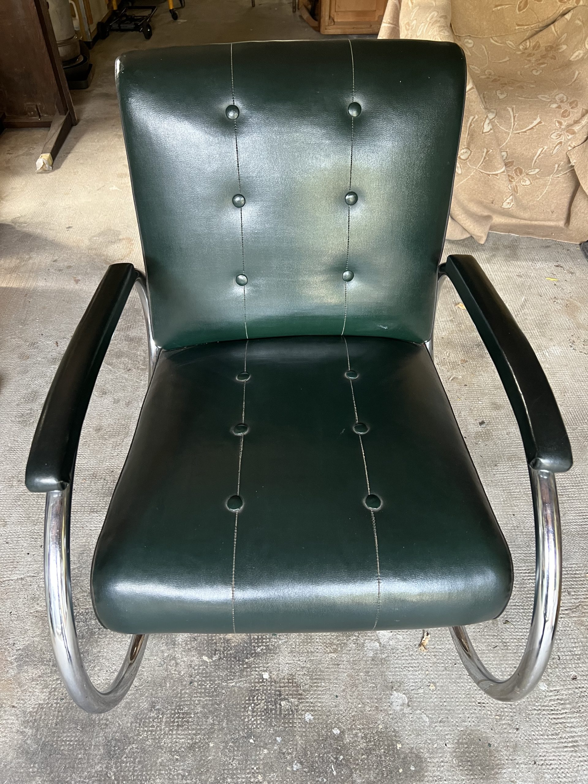 Les coussins sont recouverts d’un similicuir vert sombre typique de l’époque.