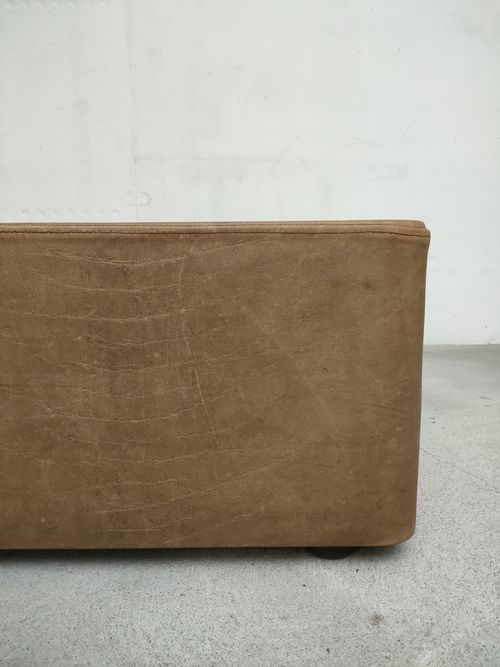 Produit venduPouf vintage en cuir avec structure en bois et pieds en plastique. Le pouf peut être utilisé aussi comme petit banc pour s’asseoir ou comme table d’appoint. Quelques traces d’usure sont présentes sur le cuir et lui donnent une très belle patine vintage.